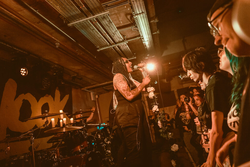 DEFENCES take the night in a heavier direction, bruising metalcore riffs and guttural roars backdropping haunting melodies. The vocal interplay is a highlight, as is their clear glee at being onstage in front of the capacity crowd as they dole out thunderous riffs. Where EVILLE got the crowd dancing and pitting, the former is absent but the latter stay just as energetic with bodies whirling round the pit. The biggest reception is saved for tracks from latest album Shadowlight, which the band emphatically call “our favourite thing we’ve ever done”. Their performance reflects it, as they try making the most of the limited stage space. They’ve got a magnetic vocalist in Cherry Duesbury, as she implores the crowd to maintain hope in the face of loss as well as delivering a powerful performance throughout their set.