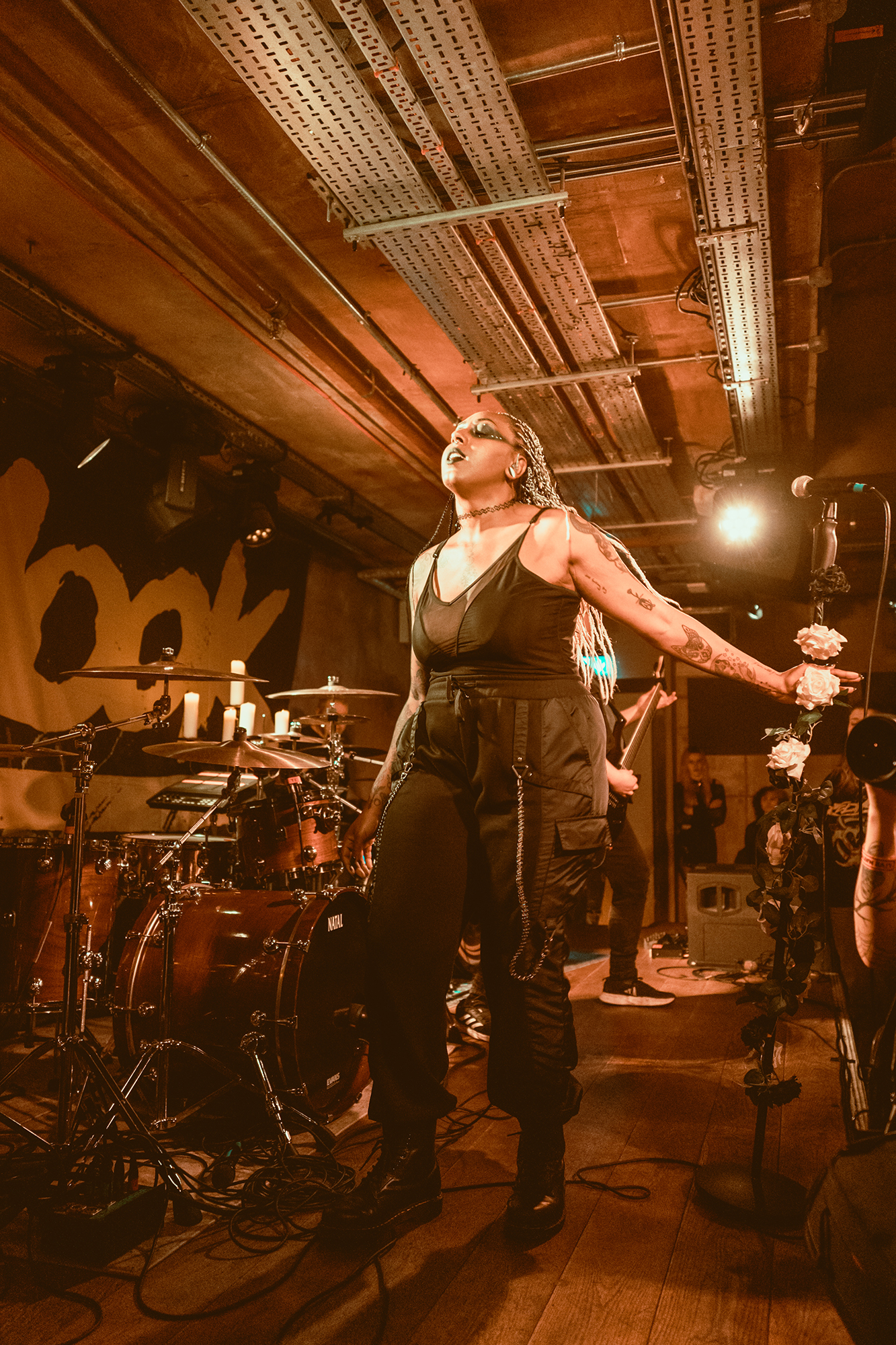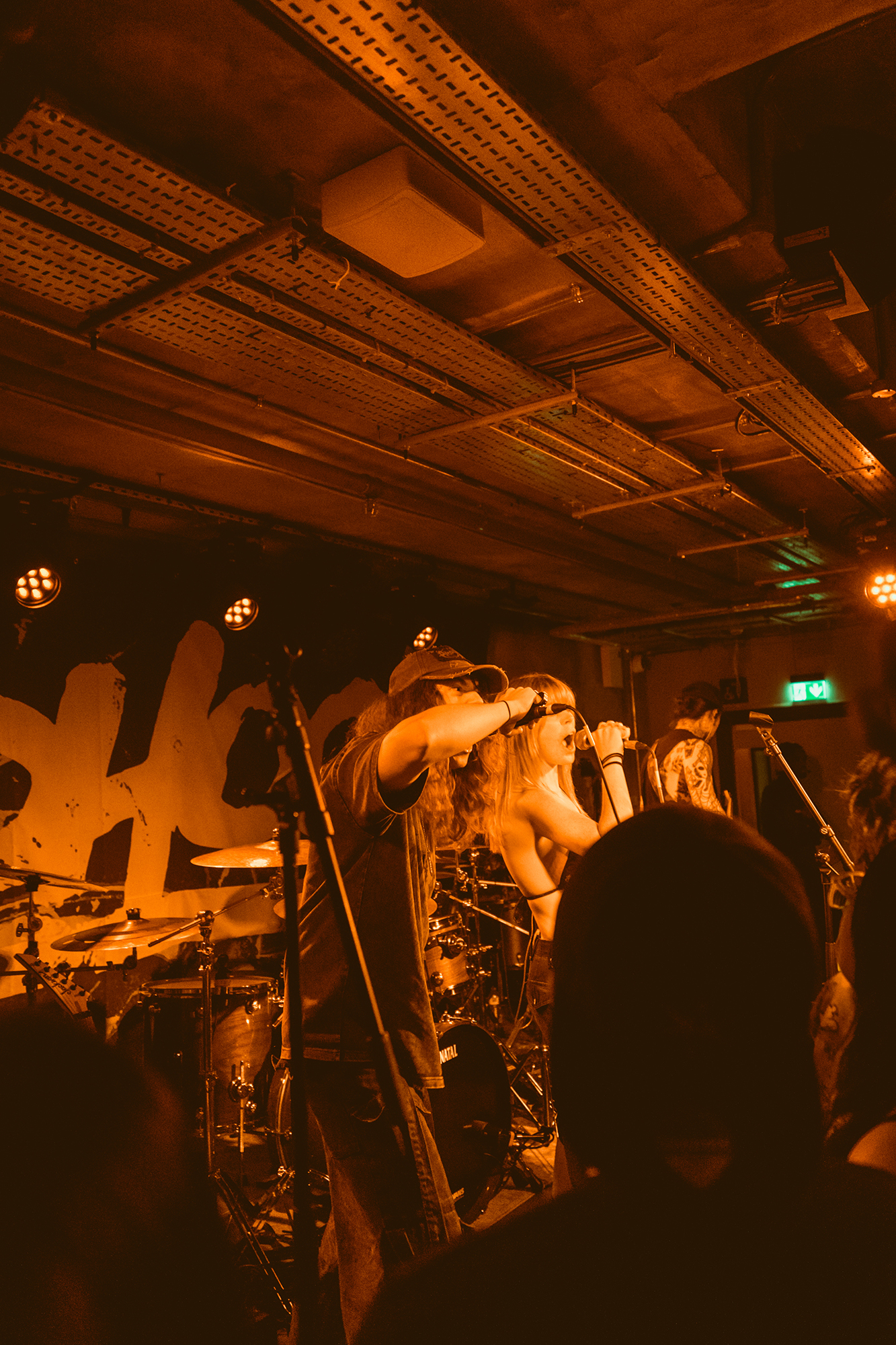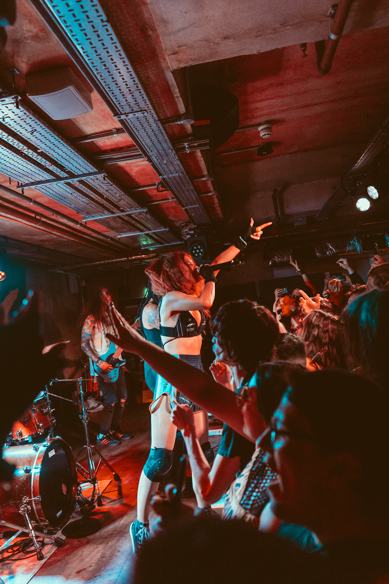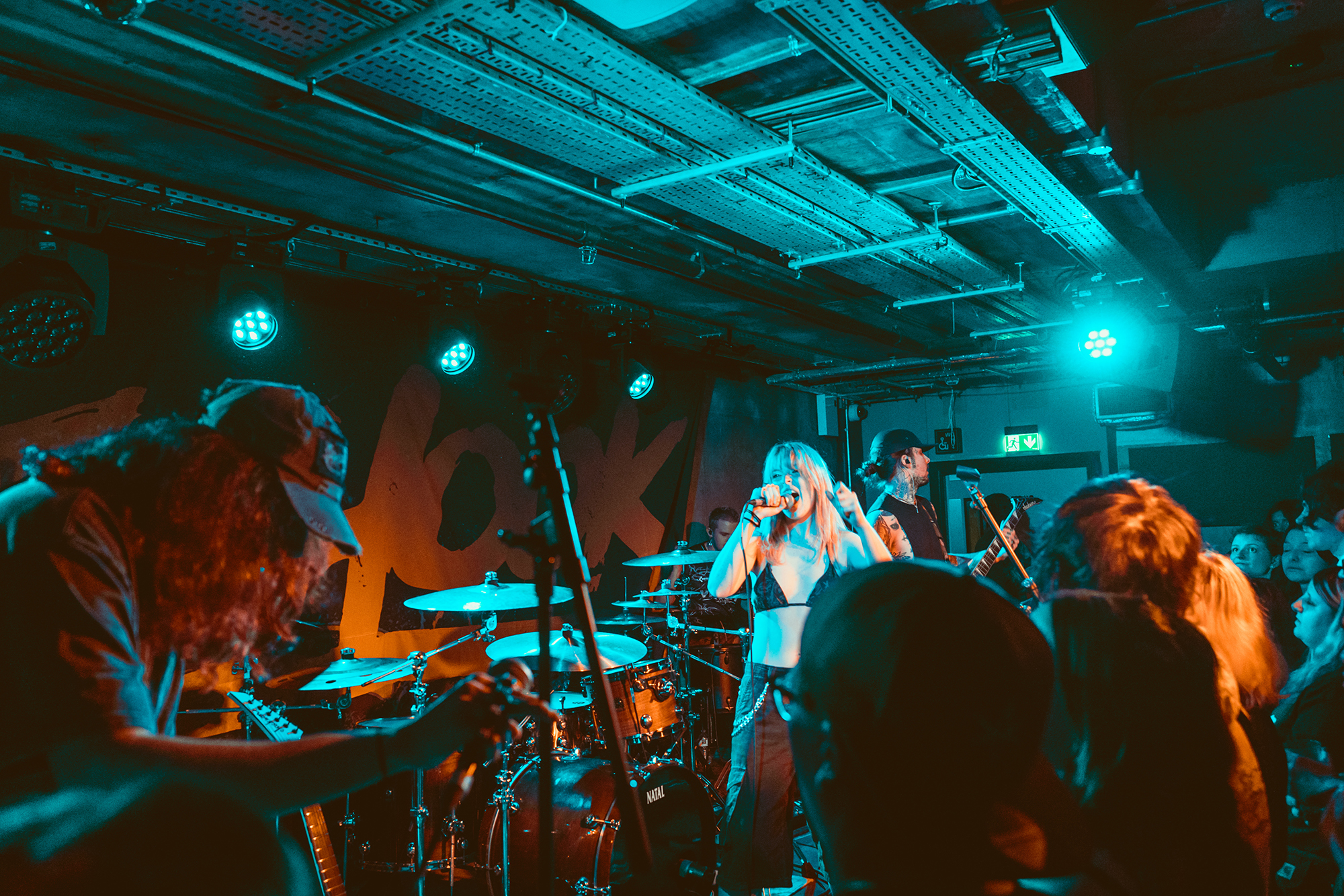 DEFENCES take the night in a heavier direction, bruising metalcore riffs and guttural roars backdropping haunting melodies. The vocal interplay is a highlight, as is their clear glee at being onstage in front of the capacity crowd as they dole out thunderous riffs. Where EVILLE got the crowd dancing and pitting, the former is absent but the latter stay just as energetic with bodies whirling round the pit. The biggest reception is saved for tracks from latest album Shadowlight, which the band emphatically call “our favourite thing we’ve ever done”. Their performance reflects it, as they try making the most of the limited stage space. They’ve got a magnetic vocalist in Cherry Duesbury, as she implores the crowd to maintain hope in the face of loss as well as delivering a powerful performance throughout their set.