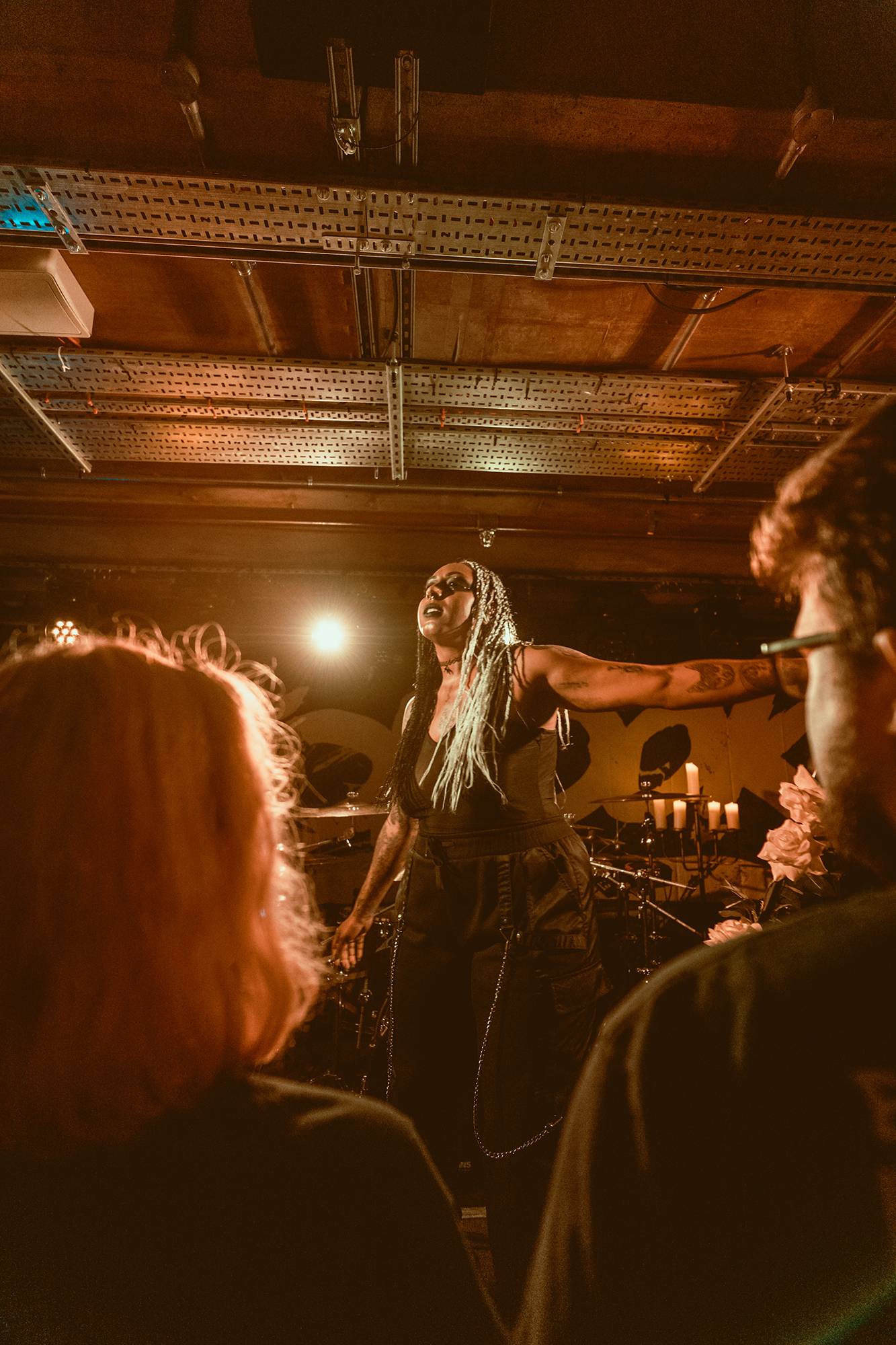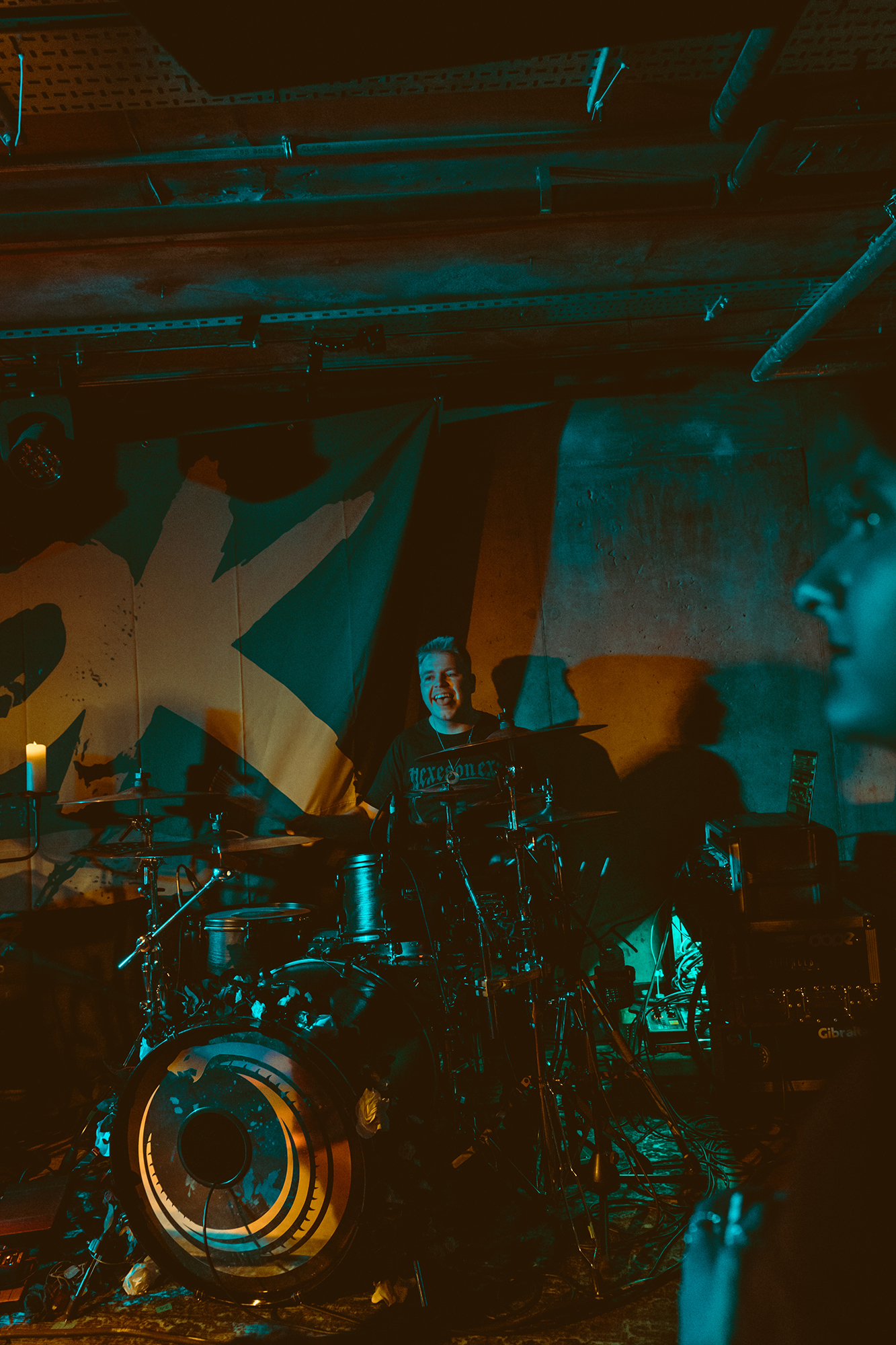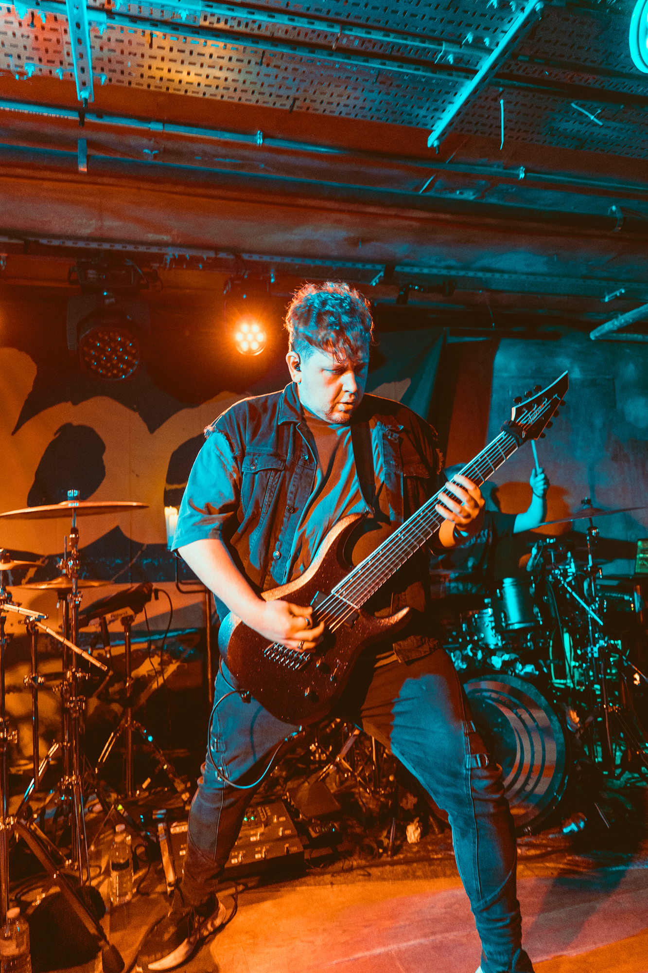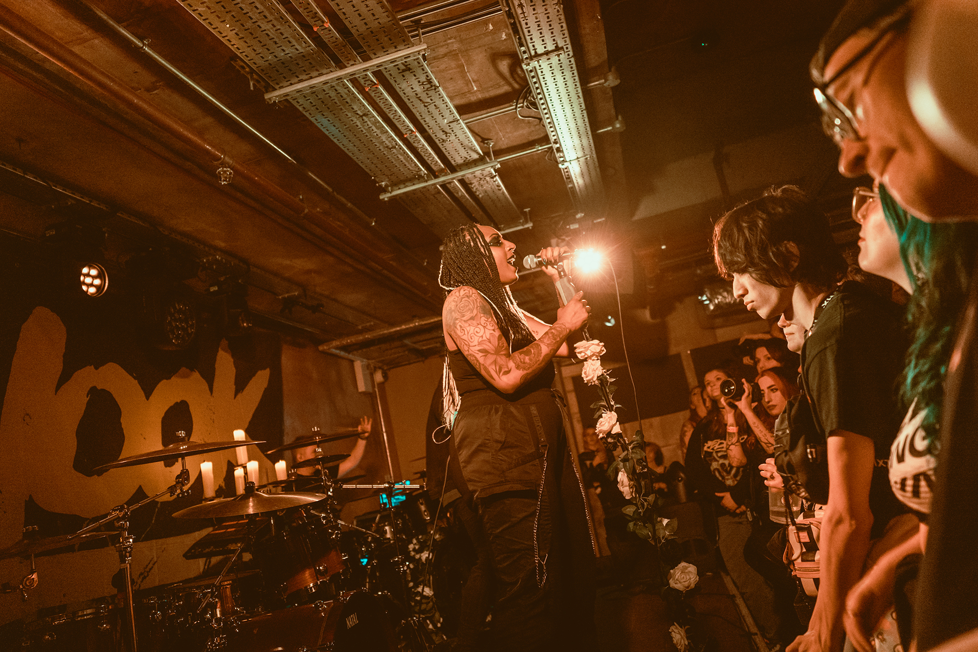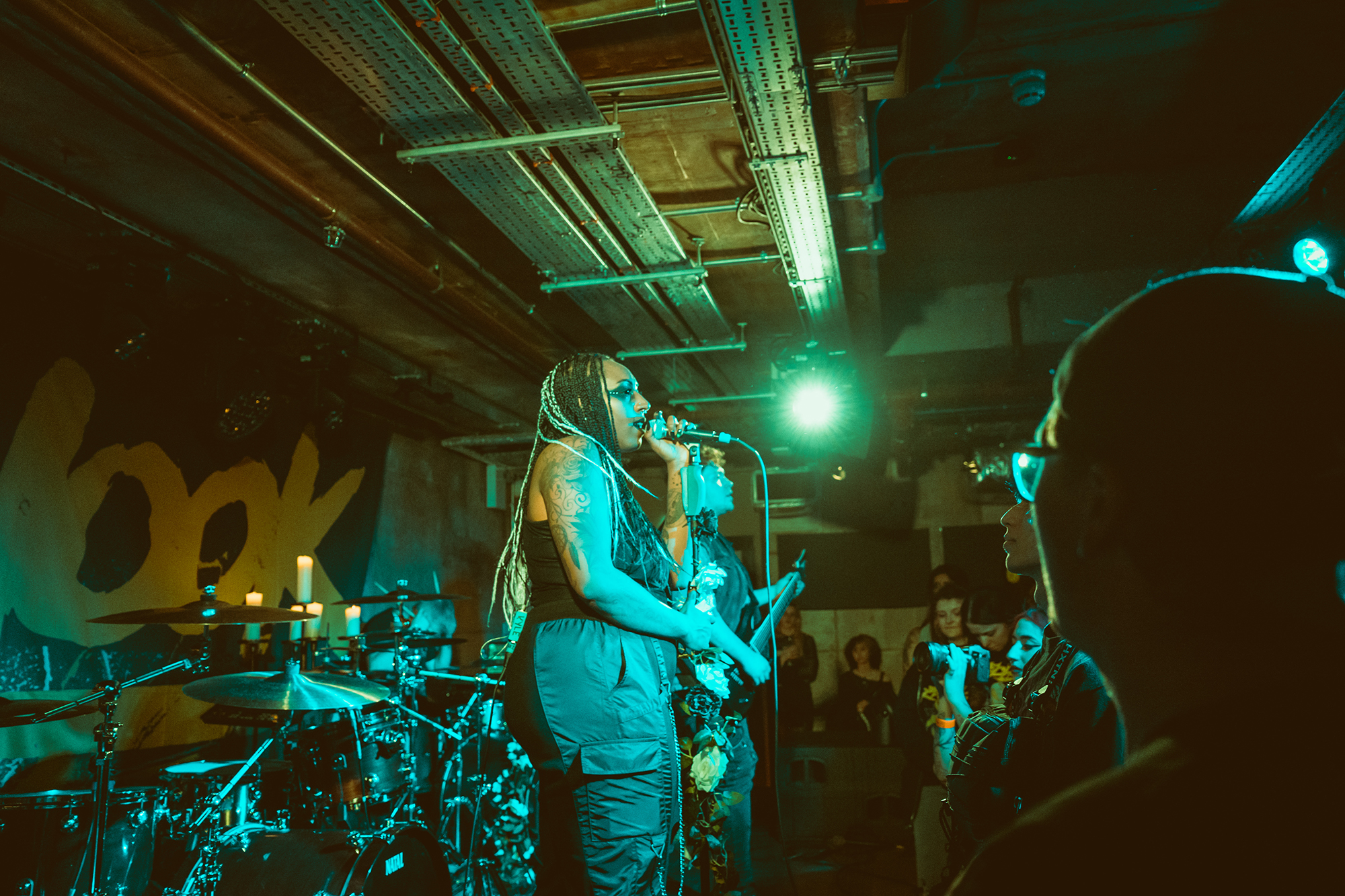 DEFENCES take the night in a heavier direction, bruising metalcore riffs and guttural roars backdropping haunting melodies. The vocal interplay is a highlight, as is their clear glee at being onstage in front of the capacity crowd as they dole out thunderous riffs. Where EVILLE got the crowd dancing and pitting, the former is absent but the latter stay just as energetic with bodies whirling round the pit. The biggest reception is saved for tracks from latest album Shadowlight, which the band emphatically call “our favourite thing we’ve ever done”. Their performance reflects it, as they try making the most of the limited stage space. They’ve got a magnetic vocalist in Cherry Duesbury, as she implores the crowd to maintain hope in the face of loss as well as delivering a powerful performance throughout their set.