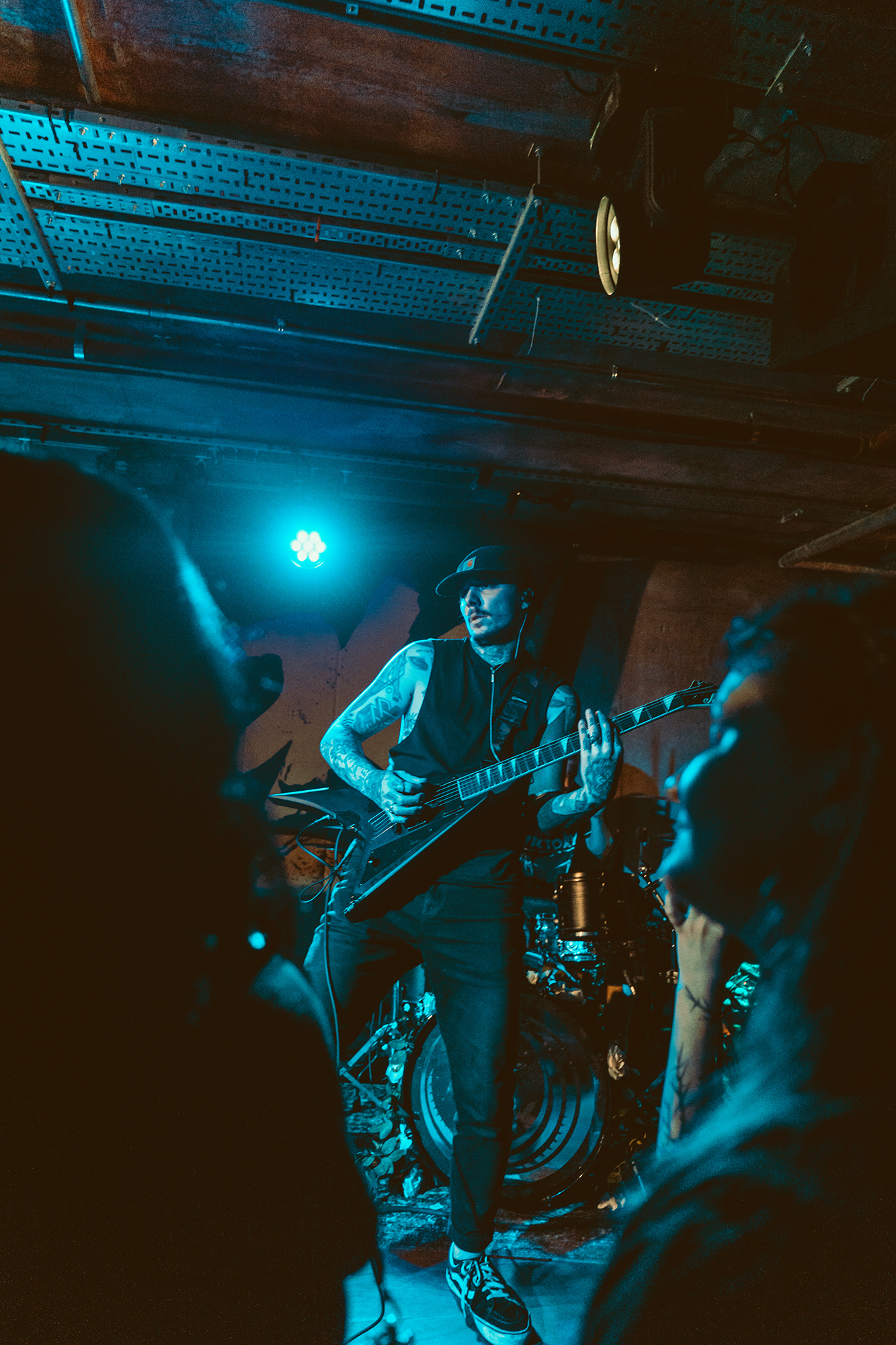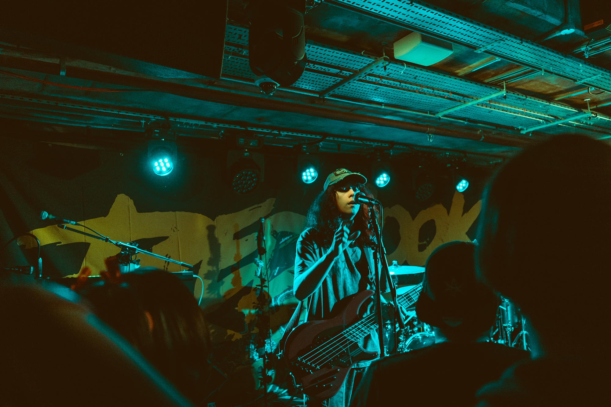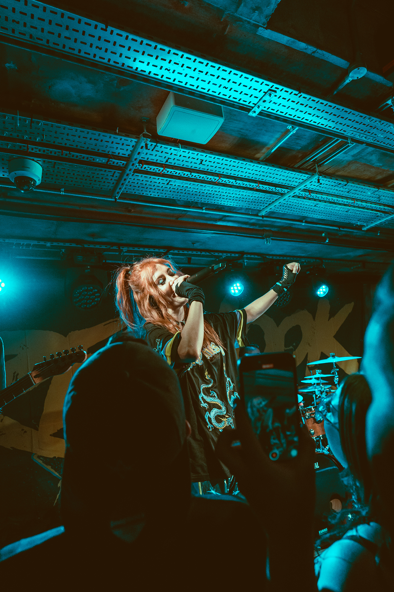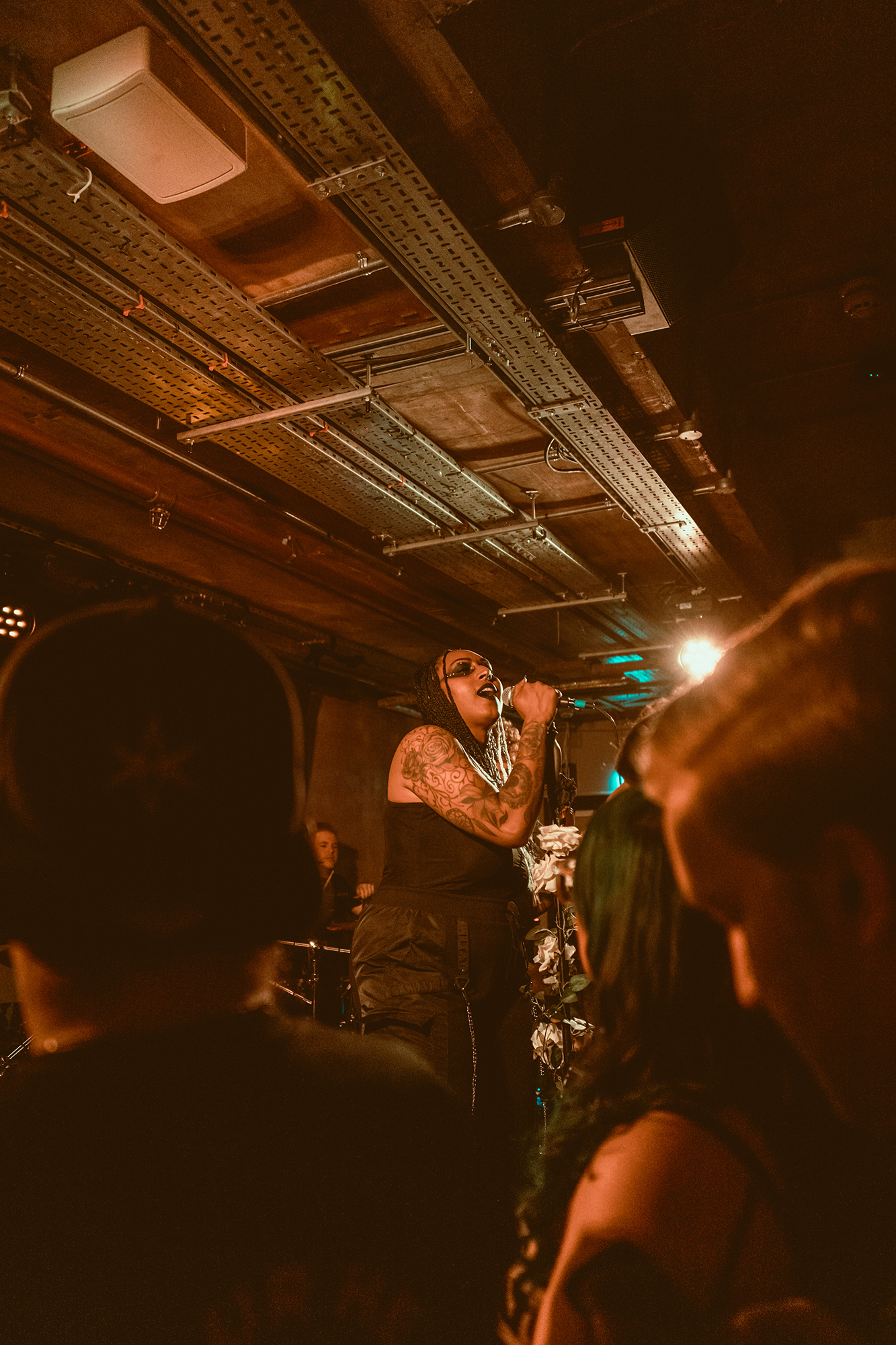 DEFENCES take the night in a heavier direction, bruising metalcore riffs and guttural roars backdropping haunting melodies. The vocal interplay is a highlight, as is their clear glee at being onstage in front of the capacity crowd as they dole out thunderous riffs. Where EVILLE got the crowd dancing and pitting, the former is absent but the latter stay just as energetic with bodies whirling round the pit. The biggest reception is saved for tracks from latest album Shadowlight, which the band emphatically call “our favourite thing we’ve ever done”. Their performance reflects it, as they try making the most of the limited stage space. They’ve got a magnetic vocalist in Cherry Duesbury, as she implores the crowd to maintain hope in the face of loss as well as delivering a powerful performance throughout their set.