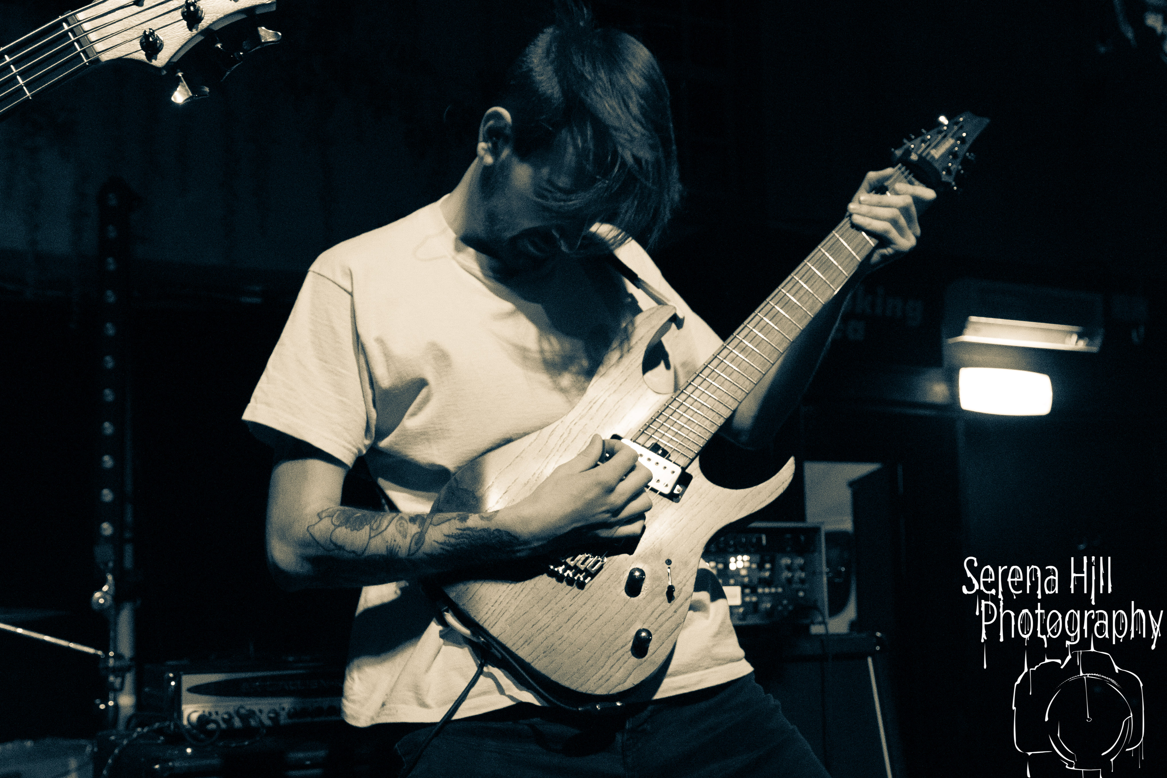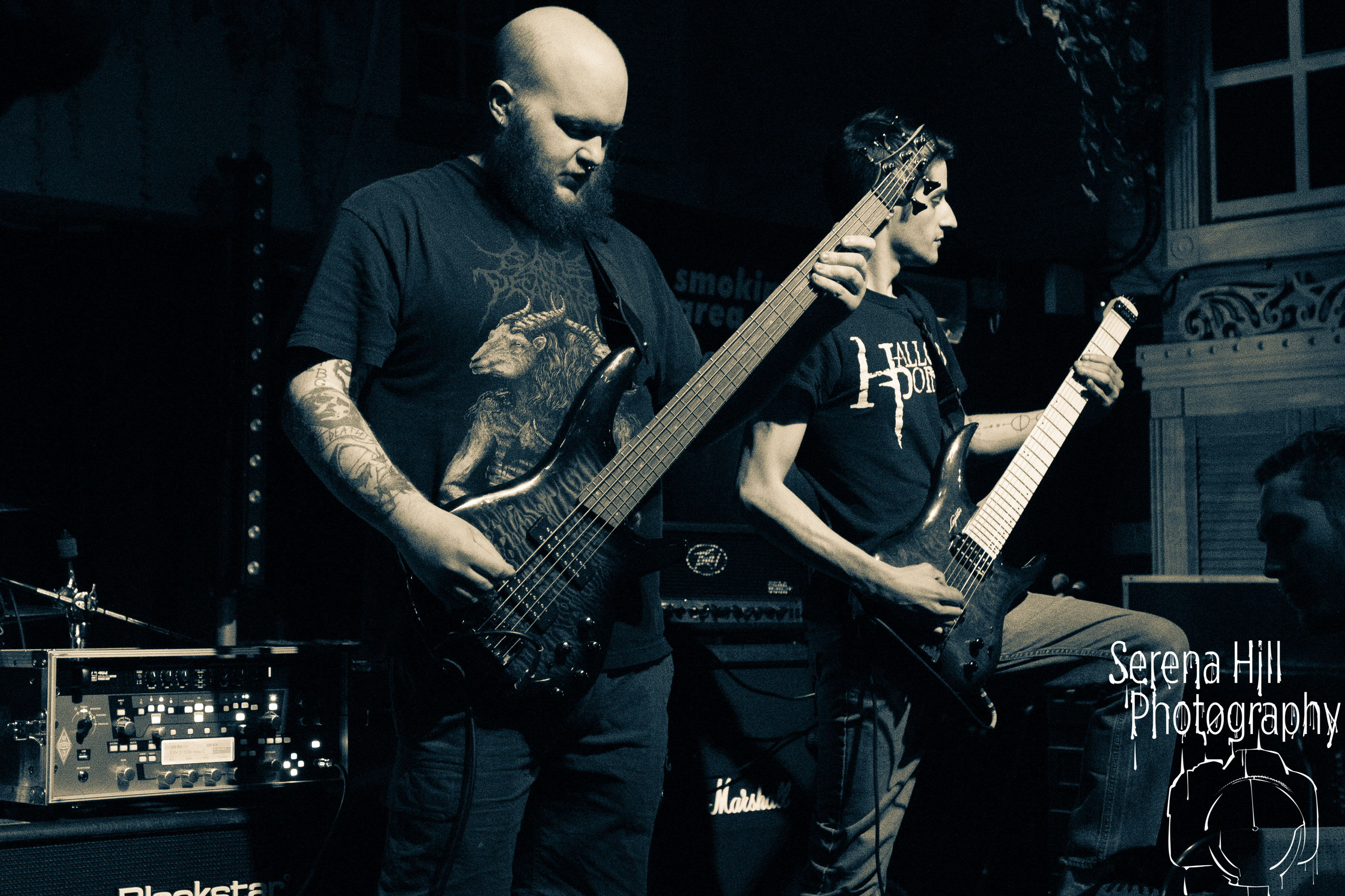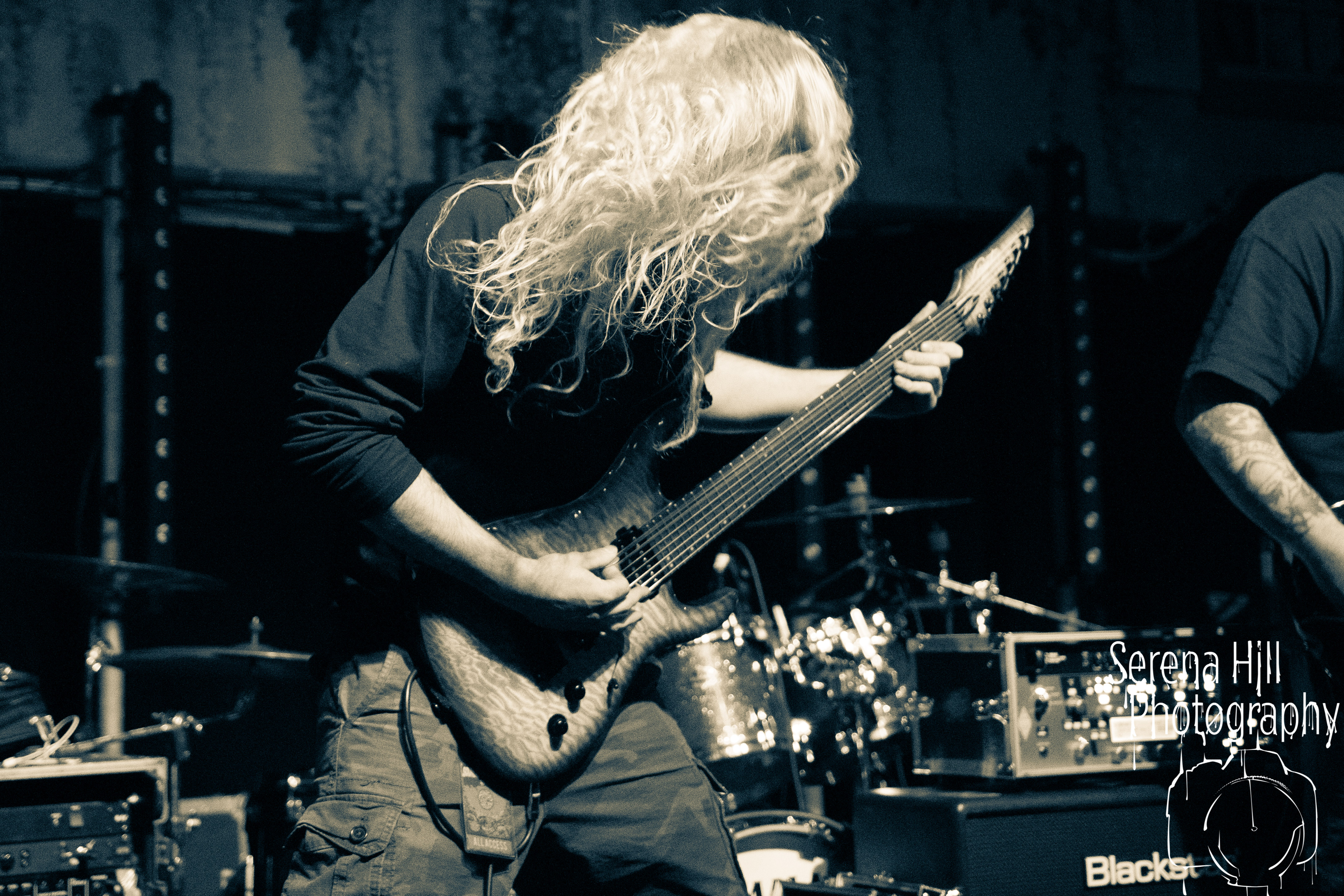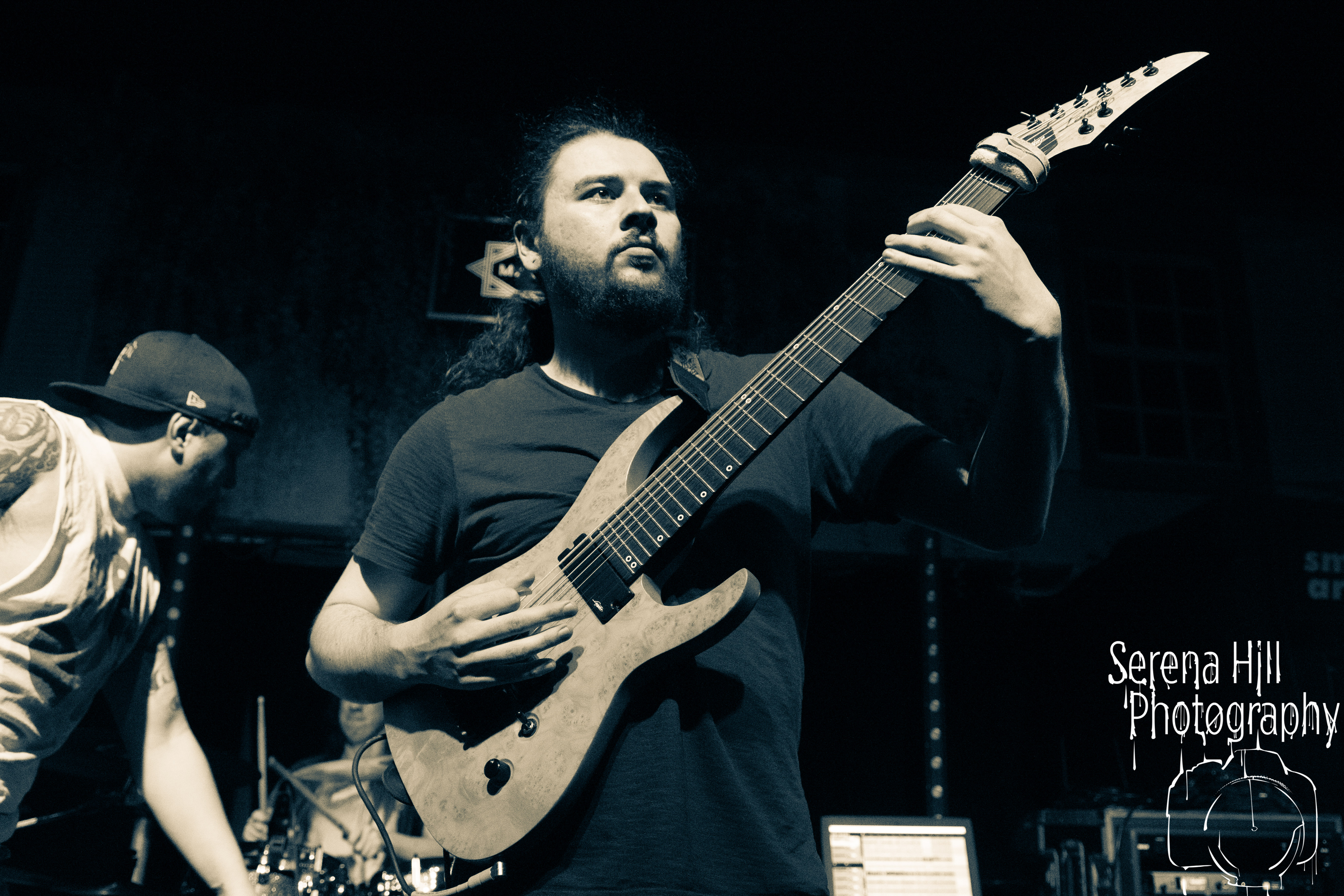 If past appearances suggested they were poised to morph from a promising underground act into titans of the flourishing UK tech-metal scene, then HARBINGER’s performance tonight confirms it. The turnout is modest – the curse of early doors – but Thom Gardener’s impassioned cry of “bang your fucking heads Birmingham!” is obeyed by every single punter gathered around the rumbling stage. The mercury shoots as this London five-piece proceed to roll out a blistering arsenal of riff-drenched maelstrom combining intricate technicality and ferocious rhythms punctuated by sporadic bursts of enticing melodies. Darkest Days’ throat-ripping proclivities see the band talisman practically turn himself inside out due to the sheer blunt force trauma, but there’s an unmistakable sense of refinement bursting forth from the five brand-new tracks being showcased from debut full-length Compelled To Suffer. Both The Dance of Species and Descendants employ the kind of reverberating riffs plucked straight from the depths of hell, but The Awakening bleeds with atmospheric depth whilst the vitriolic squall of The Fear of Sorrow is tempered by accessible choruses and intricate guitar layers. The skill and execution exhibited tonight is astonishing and the set’s sonic heft is monstrous – if HARBINGER continue down this bludgeoning path they might just barge past the competition on their way to the upper echelons of modern metal.