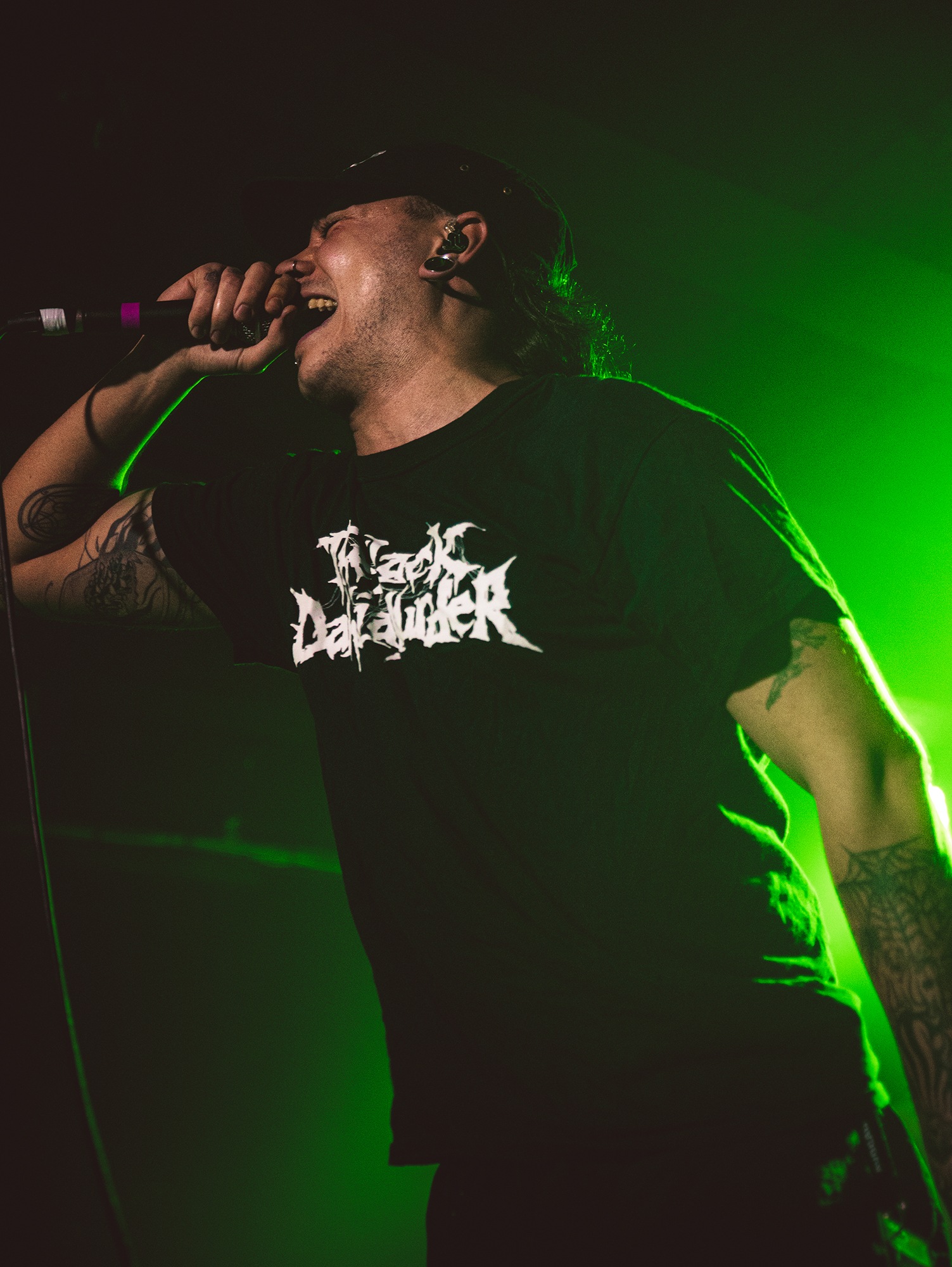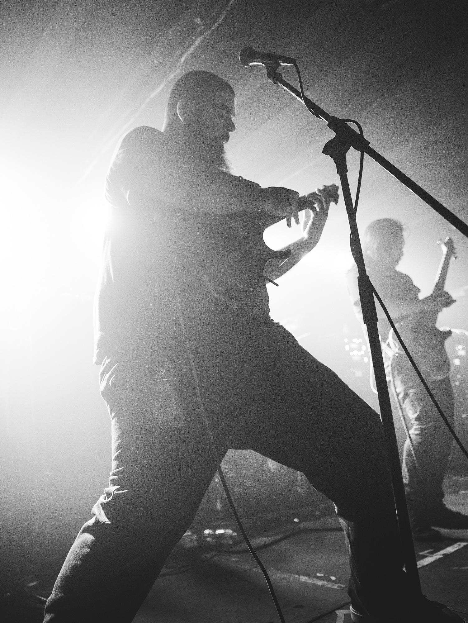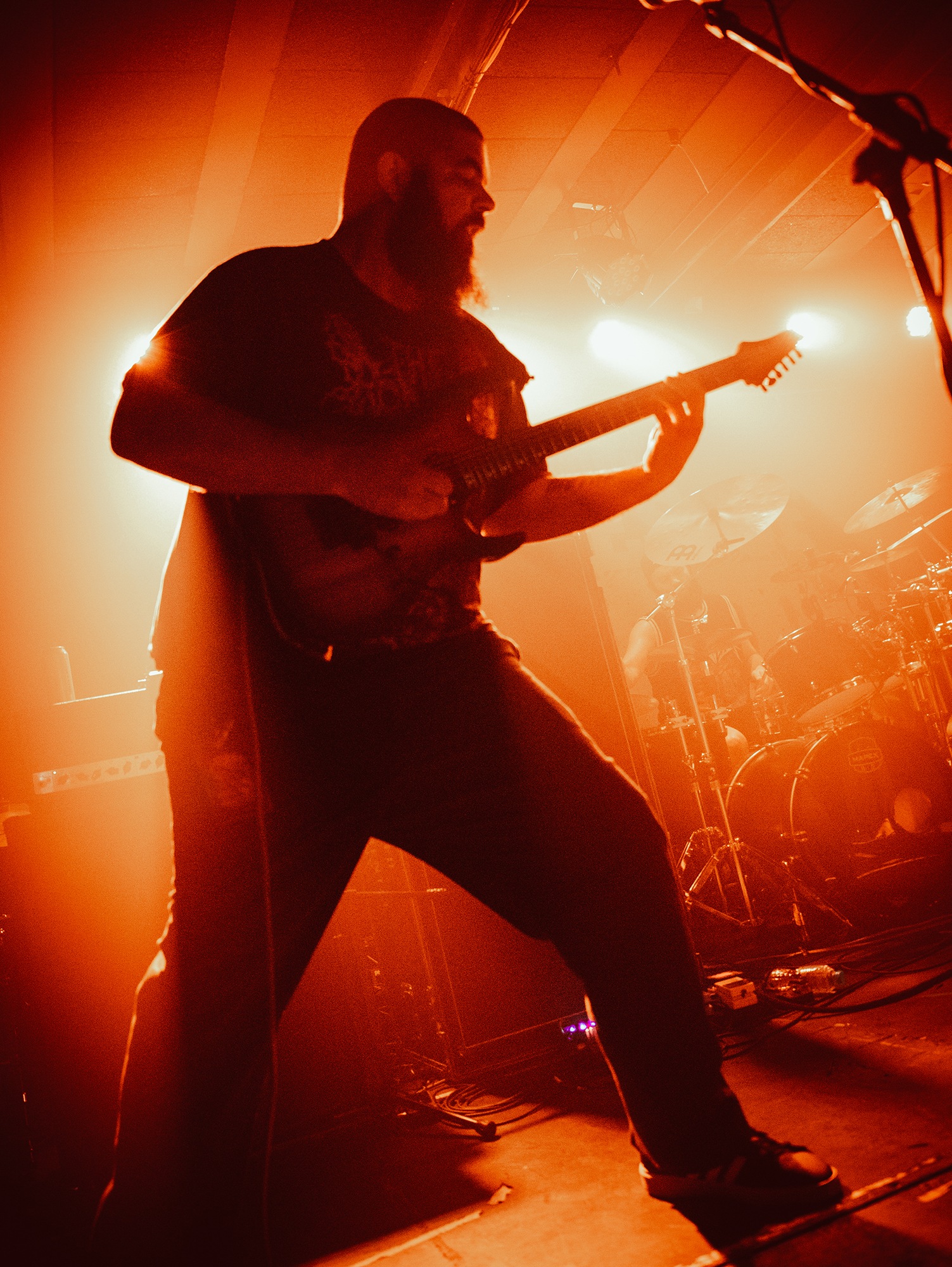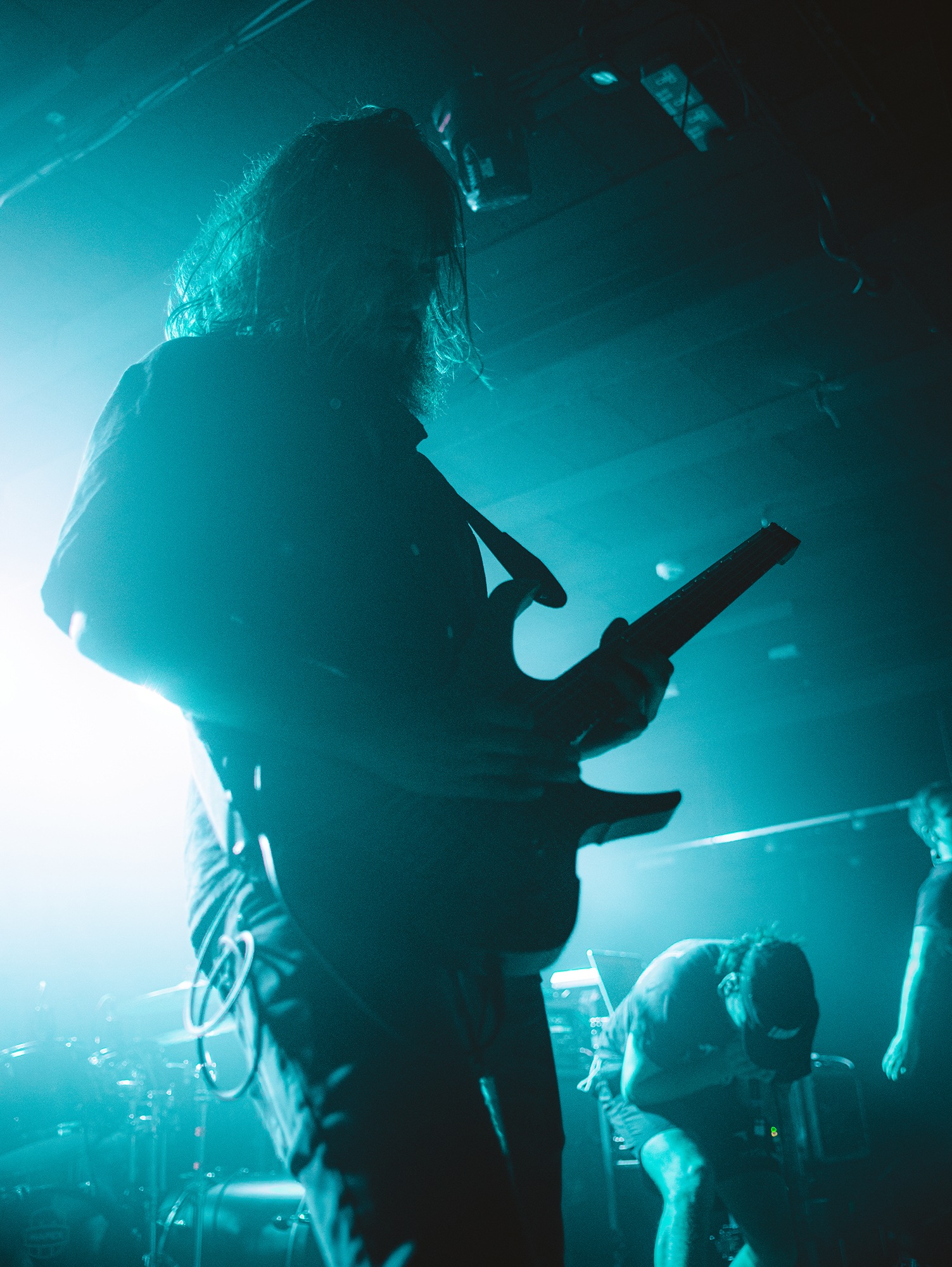 Lineup changes seems to be in the drinking water of this tour’s billing as HARBINGER, ALLEGAEON and FALLUJAH all testify. Headliners RIVERS OF NIHIL didn’t dodge this either, with the sudden departure of long-standing vocalist Jake Dieffenbach coming prior to the tour kicking off. As such, bassist Adam Biggs has stepped up to the role of frontman and largely, he successfully navigates the challenge. Granted, the absence of Dieffenbach is noticeable as Biggs remains rooted to his position on stage in order to dispatch both bass and vocals, rather than prowl and command the stage as his former bandmate did oh so well, but Biggs‘ effectively leads the line and his range of screams and growls sound just fine: especially in a thundering rendition of The Silent Life.