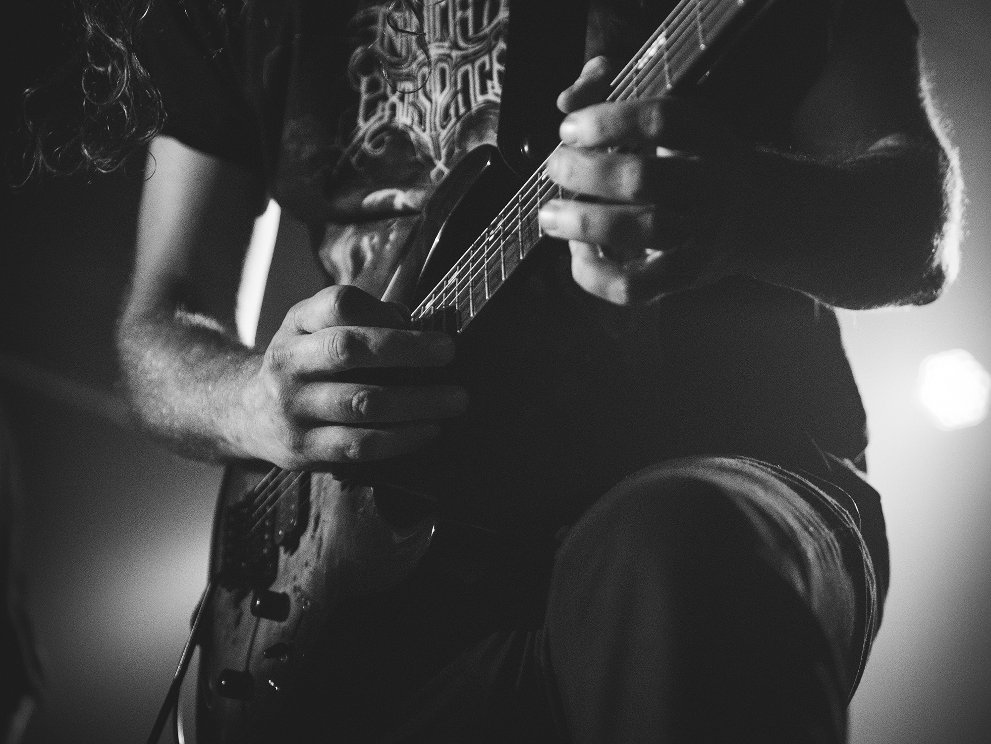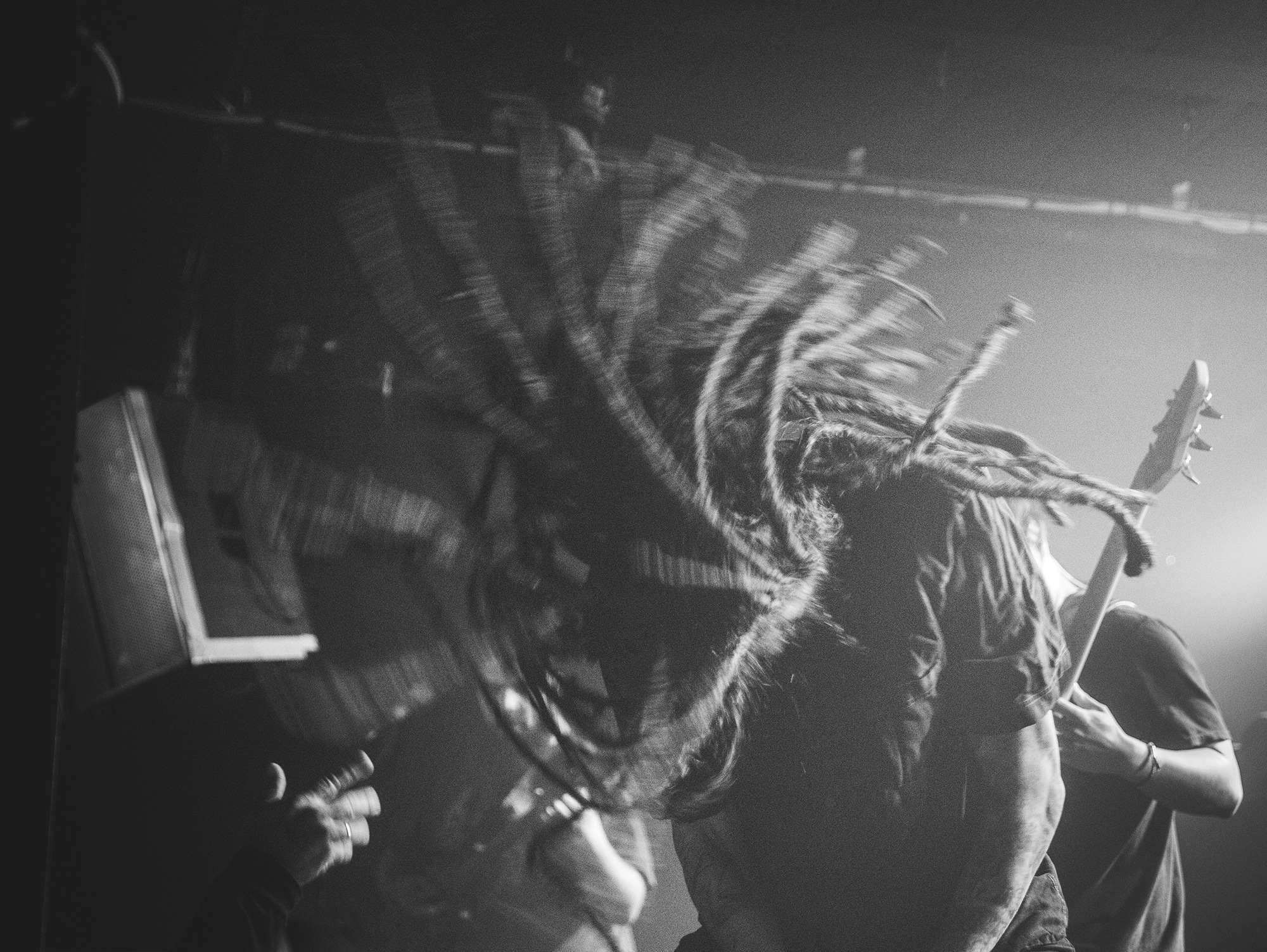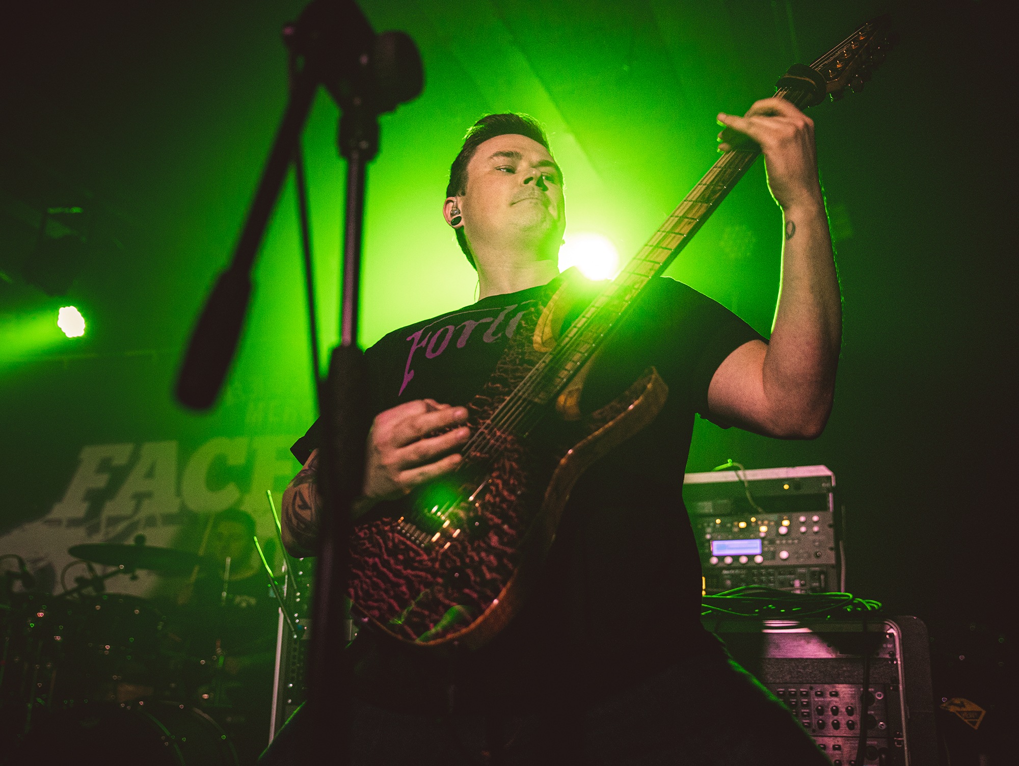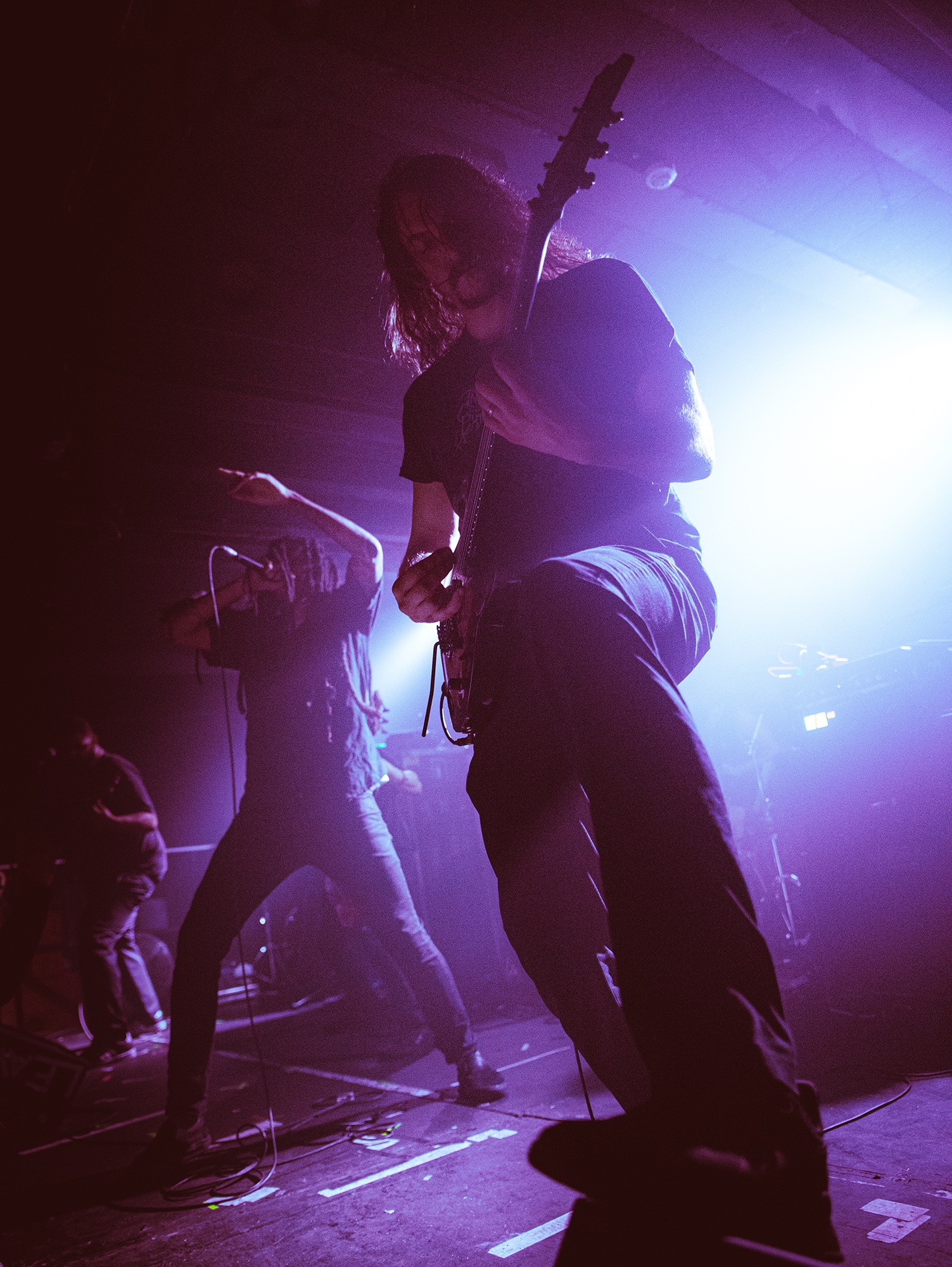 Lineup changes seems to be in the drinking water of this tour’s billing as HARBINGER, ALLEGAEON and FALLUJAH all testify. Headliners RIVERS OF NIHIL didn’t dodge this either, with the sudden departure of long-standing vocalist Jake Dieffenbach coming prior to the tour kicking off. As such, bassist Adam Biggs has stepped up to the role of frontman and largely, he successfully navigates the challenge. Granted, the absence of Dieffenbach is noticeable as Biggs remains rooted to his position on stage in order to dispatch both bass and vocals, rather than prowl and command the stage as his former bandmate did oh so well, but Biggs‘ effectively leads the line and his range of screams and growls sound just fine: especially in a thundering rendition of The Silent Life.