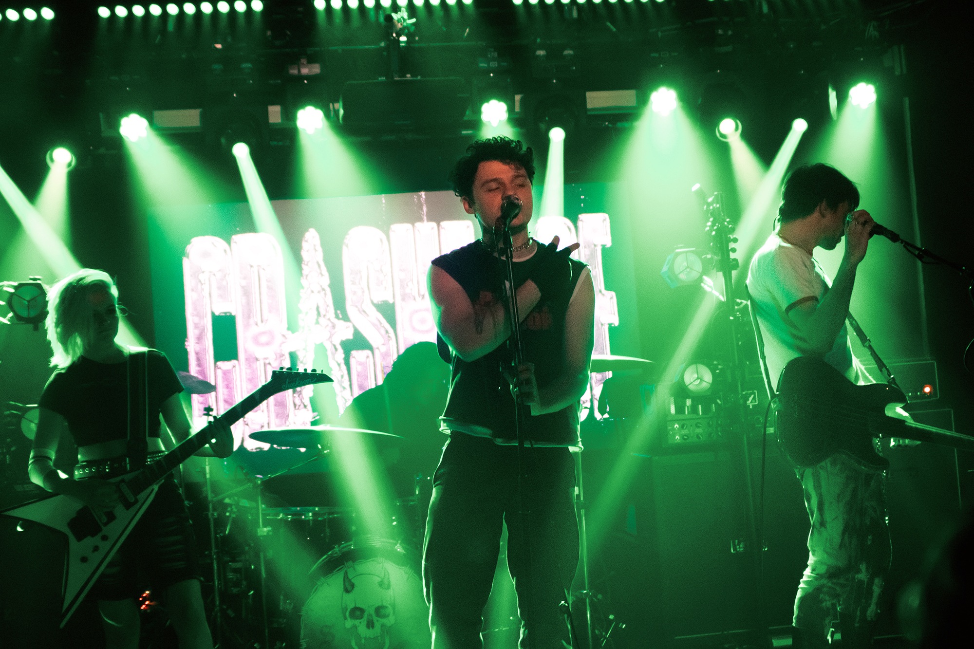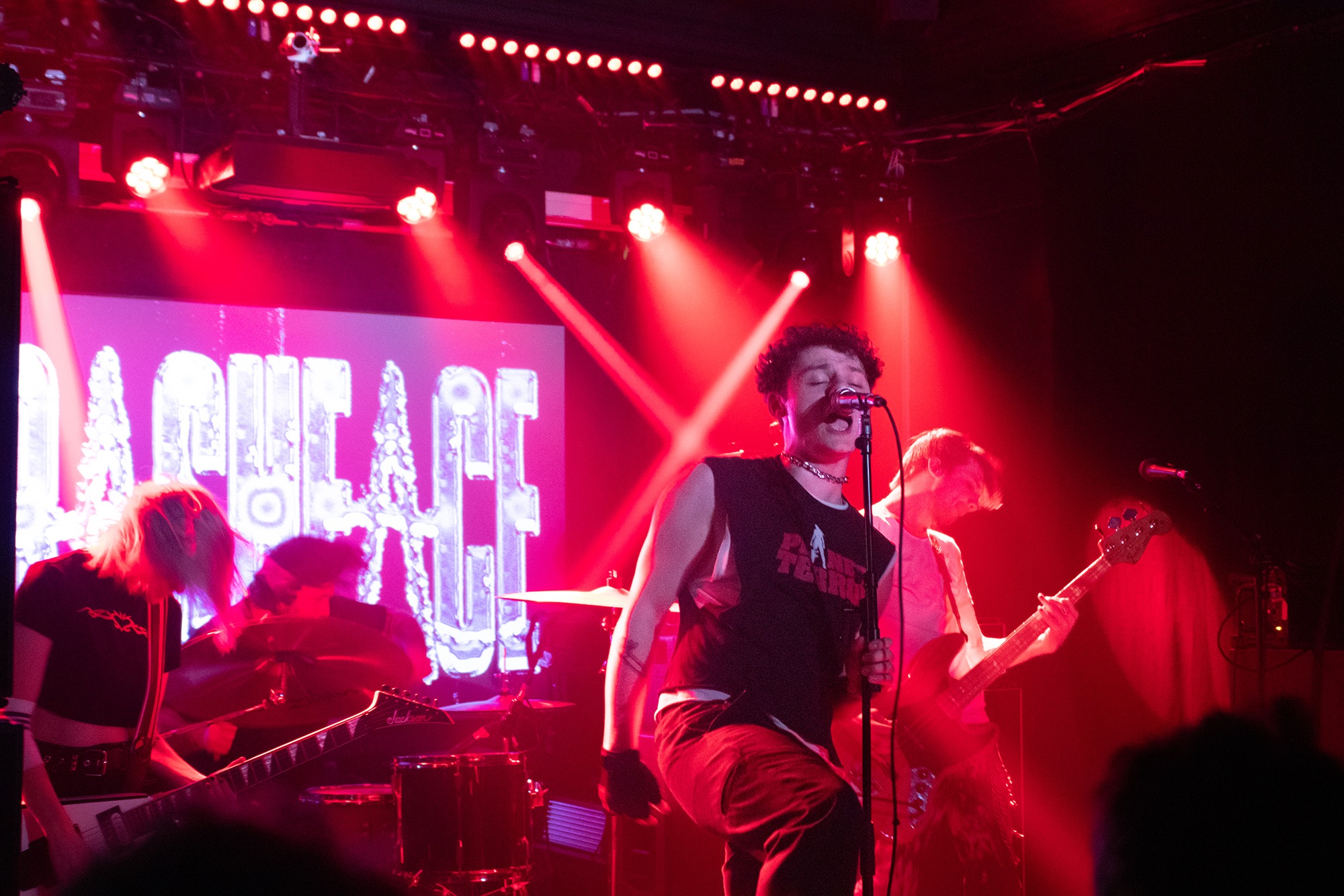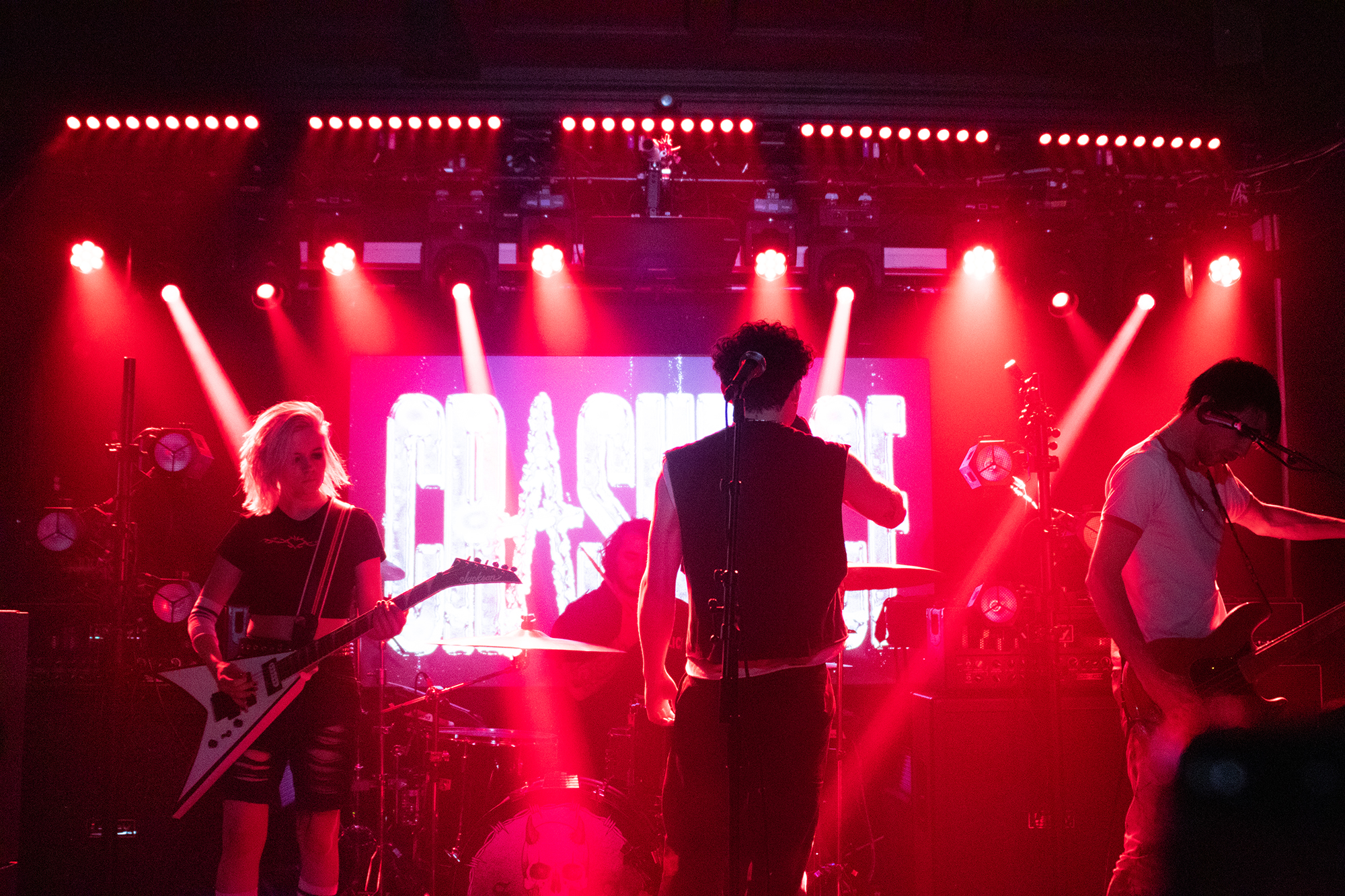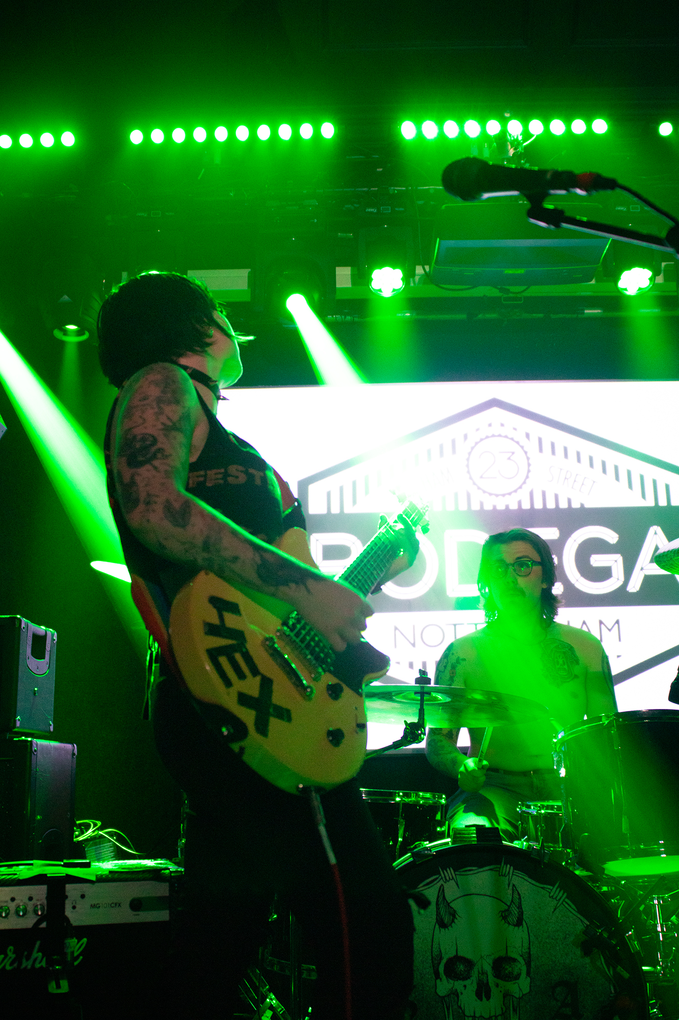 One could argue that the limited stage space at The Bodega is a factor in limited movement from bands, but CRASHFACE buck that trend from the off. The London duo – vocalist Charlie Hinton and bassist Otto Balfour – are ably backed up by a touring guitarist and drummer for this run and are making the best use of what they can in front of them. Rattling through songs like Loading Screen Infinity and Ultraplasticplanetkiller at a rate of knots, they seem quite rough at the beginning but really grow into their set and new song, the nu-metal tinged C.H.A.I.N.S.A.W is going to become a cornerstone of their live show for years to come. Once they’ve learned how to maintain the momentum they have by the end of their set throughout the time they have onstage, they’ll be even more of a force to be reckoned with, but they’re young and that will come in time.