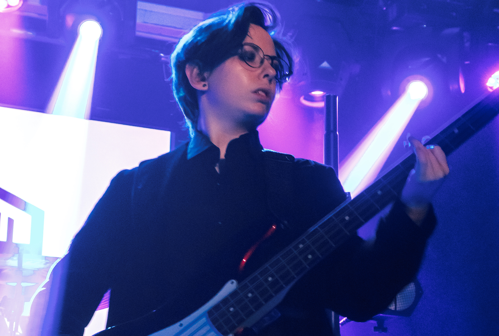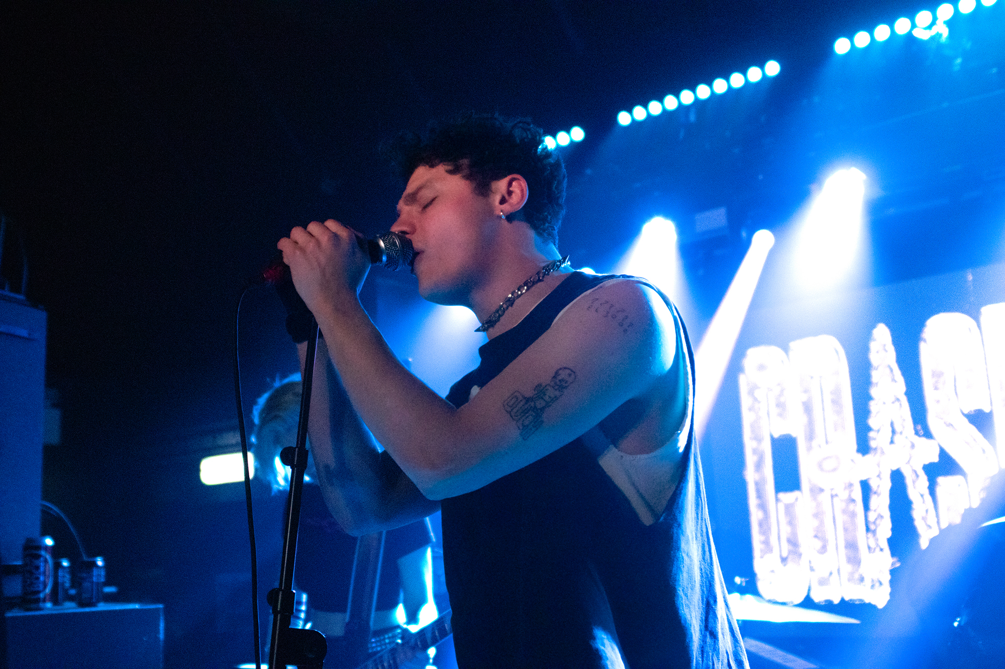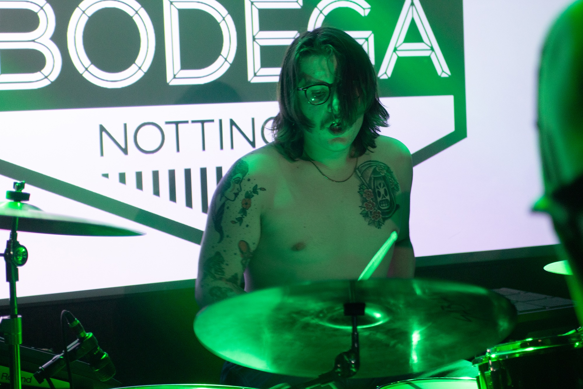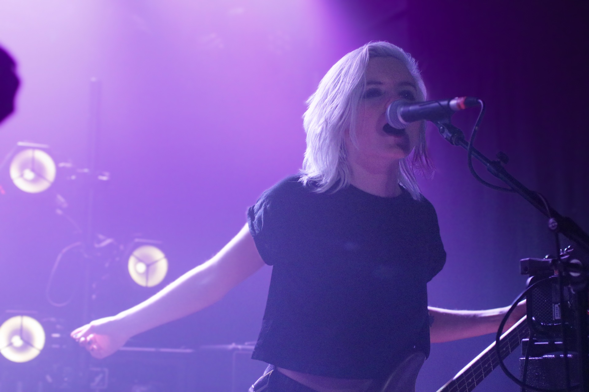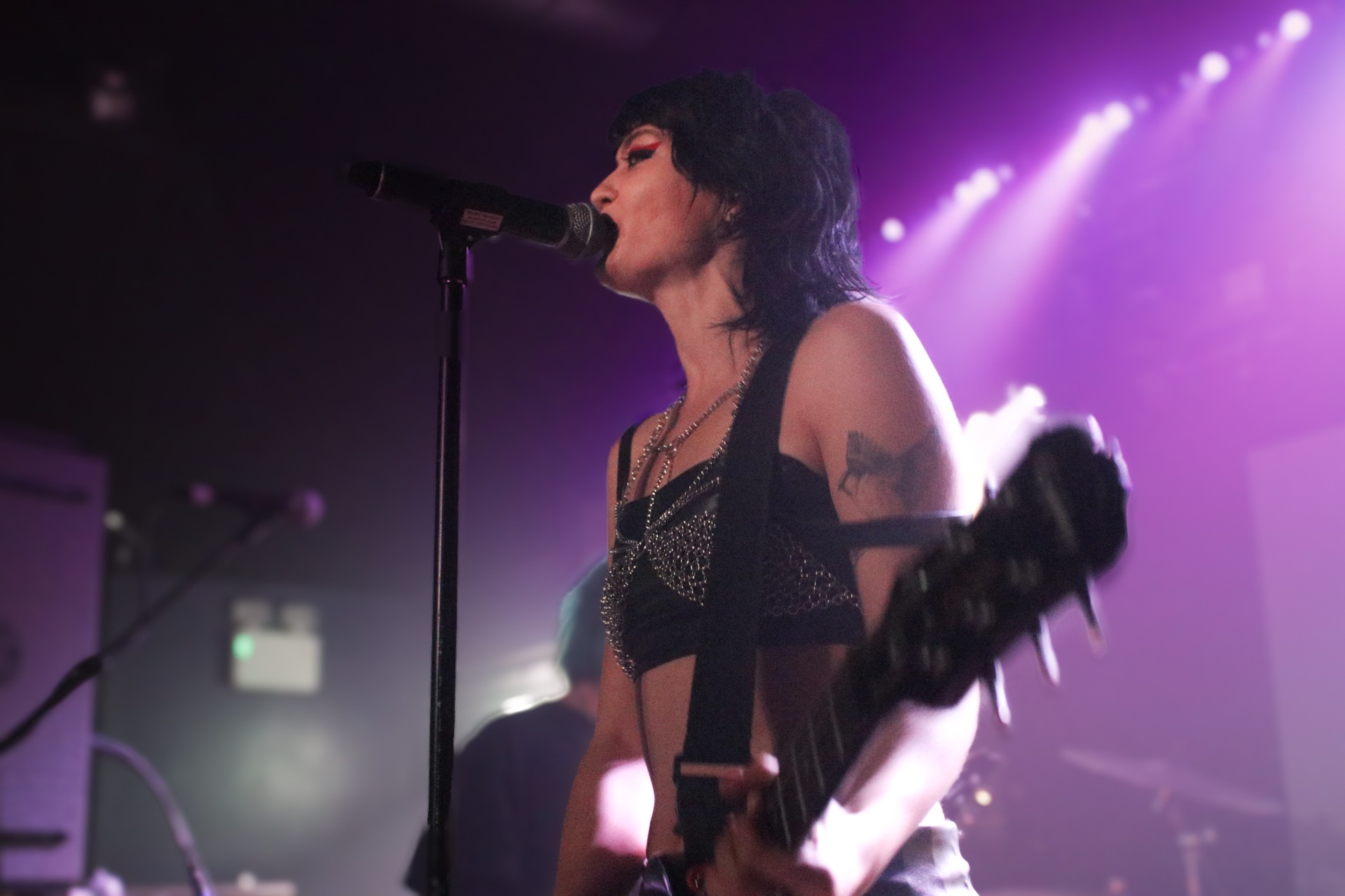One could argue that the limited stage space at The Bodega is a factor in limited movement from bands, but CRASHFACE buck that trend from the off. The London duo – vocalist Charlie Hinton and bassist Otto Balfour – are ably backed up by a touring guitarist and drummer for this run and are making the best use of what they can in front of them. Rattling through songs like Loading Screen Infinity and Ultraplasticplanetkiller at a rate of knots, they seem quite rough at the beginning but really grow into their set and new song, the nu-metal tinged C.H.A.I.N.S.A.W is going to become a cornerstone of their live show for years to come. Once they’ve learned how to maintain the momentum they have by the end of their set throughout the time they have onstage, they’ll be even more of a force to be reckoned with, but they’re young and that will come in time.