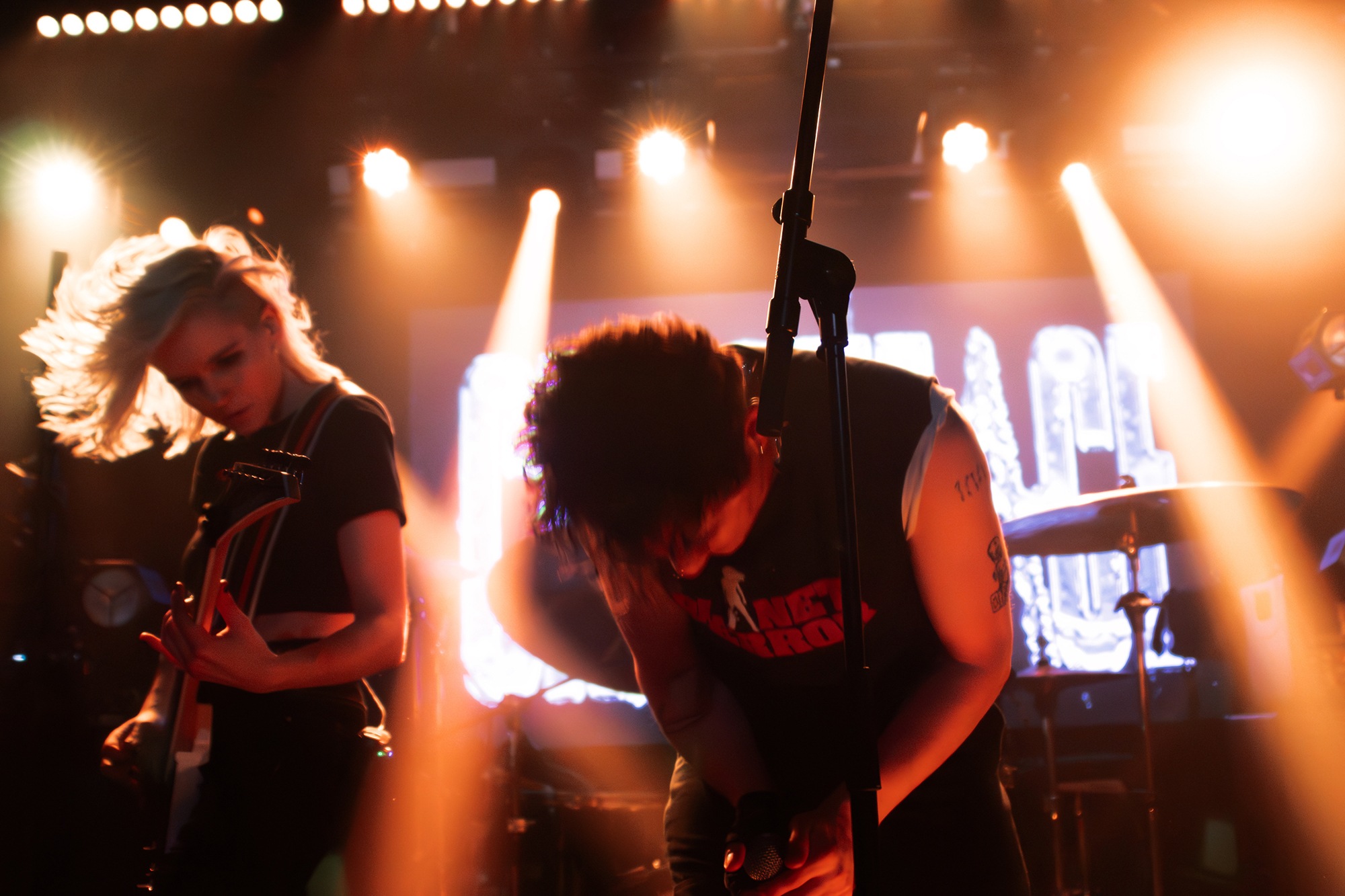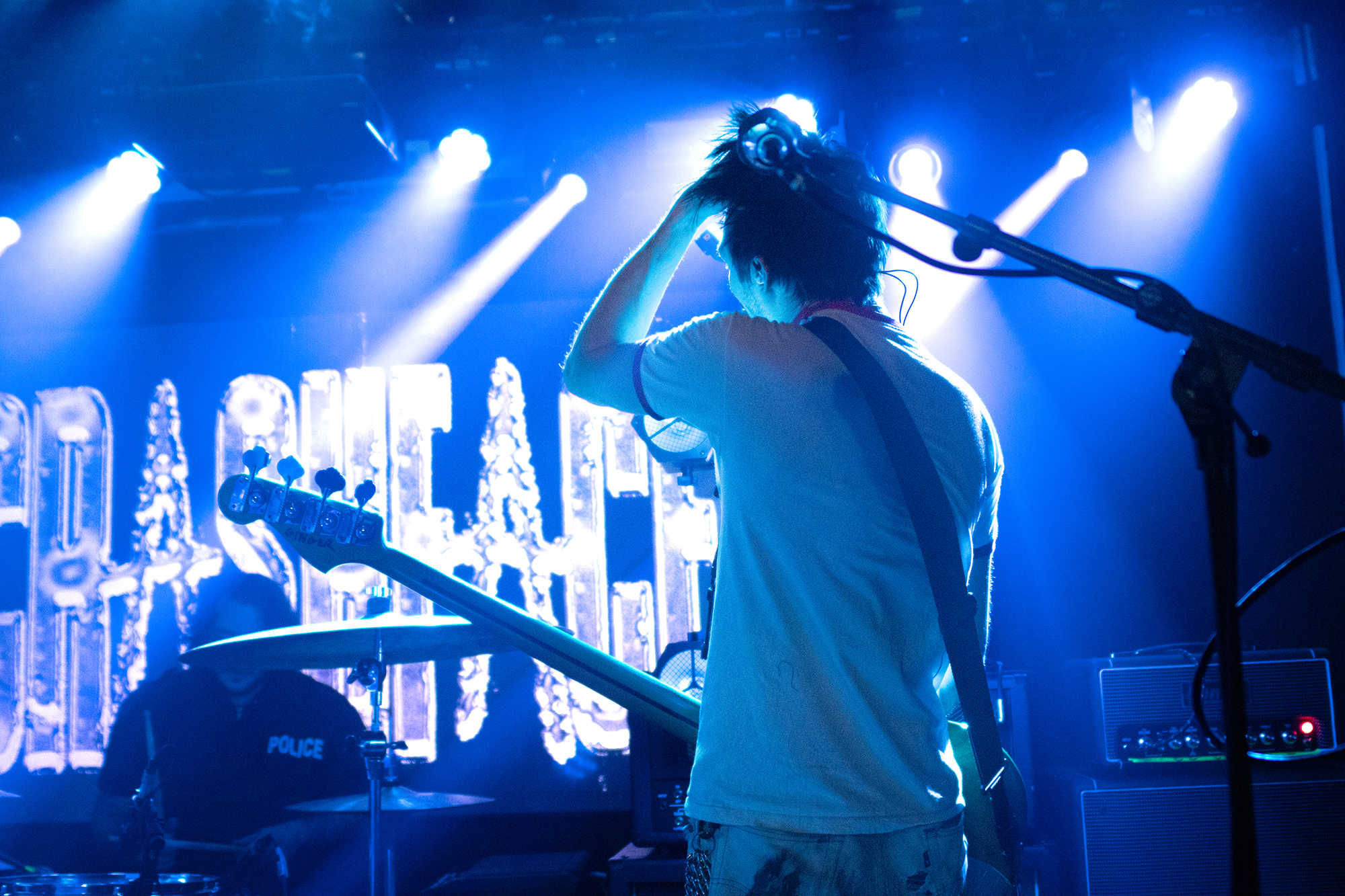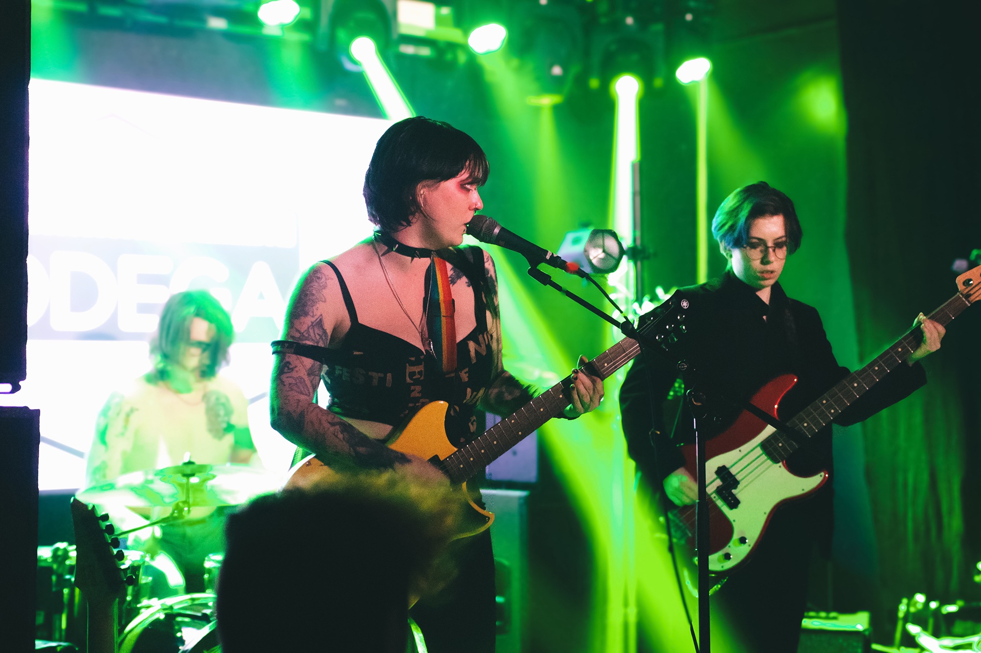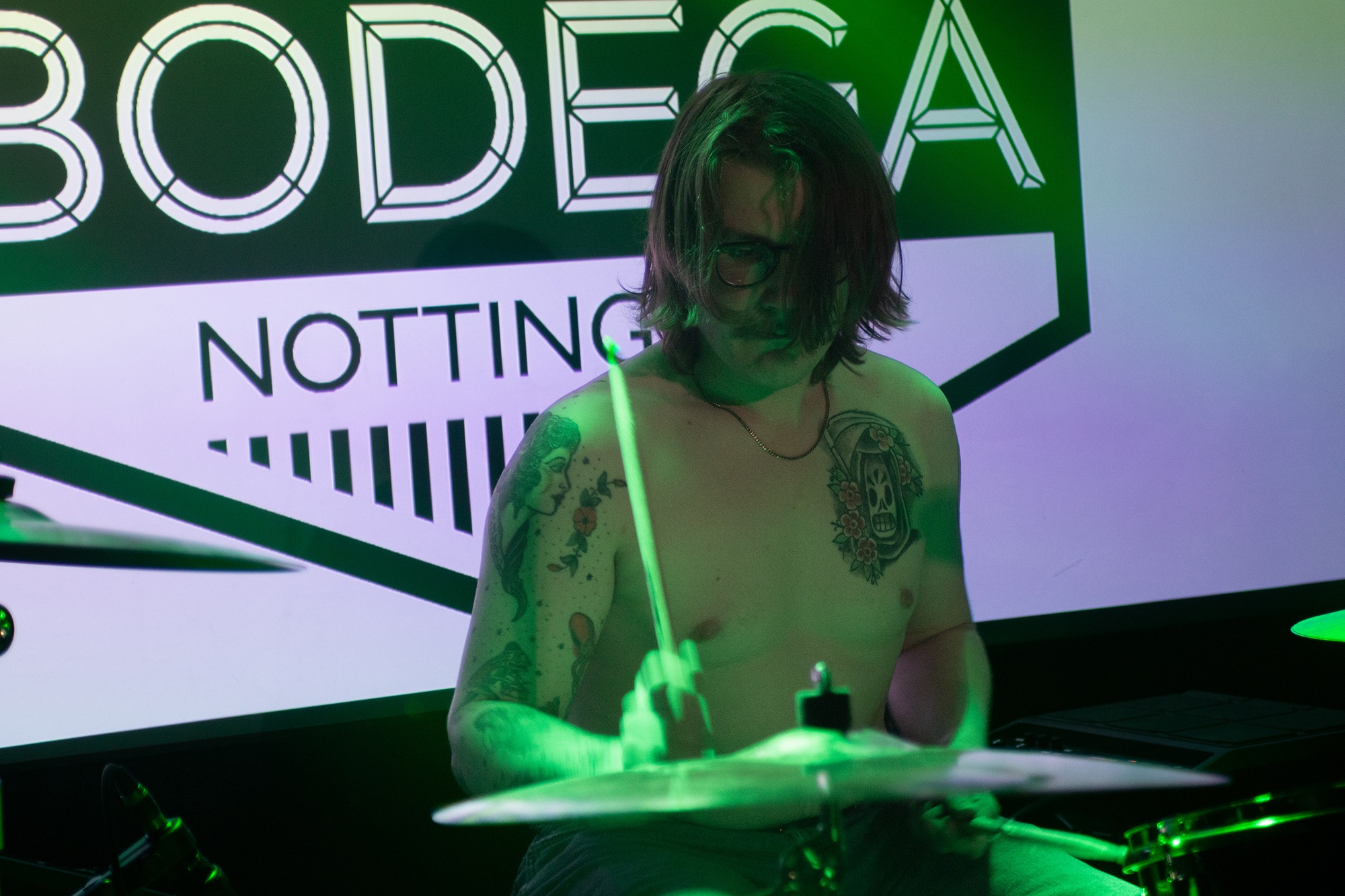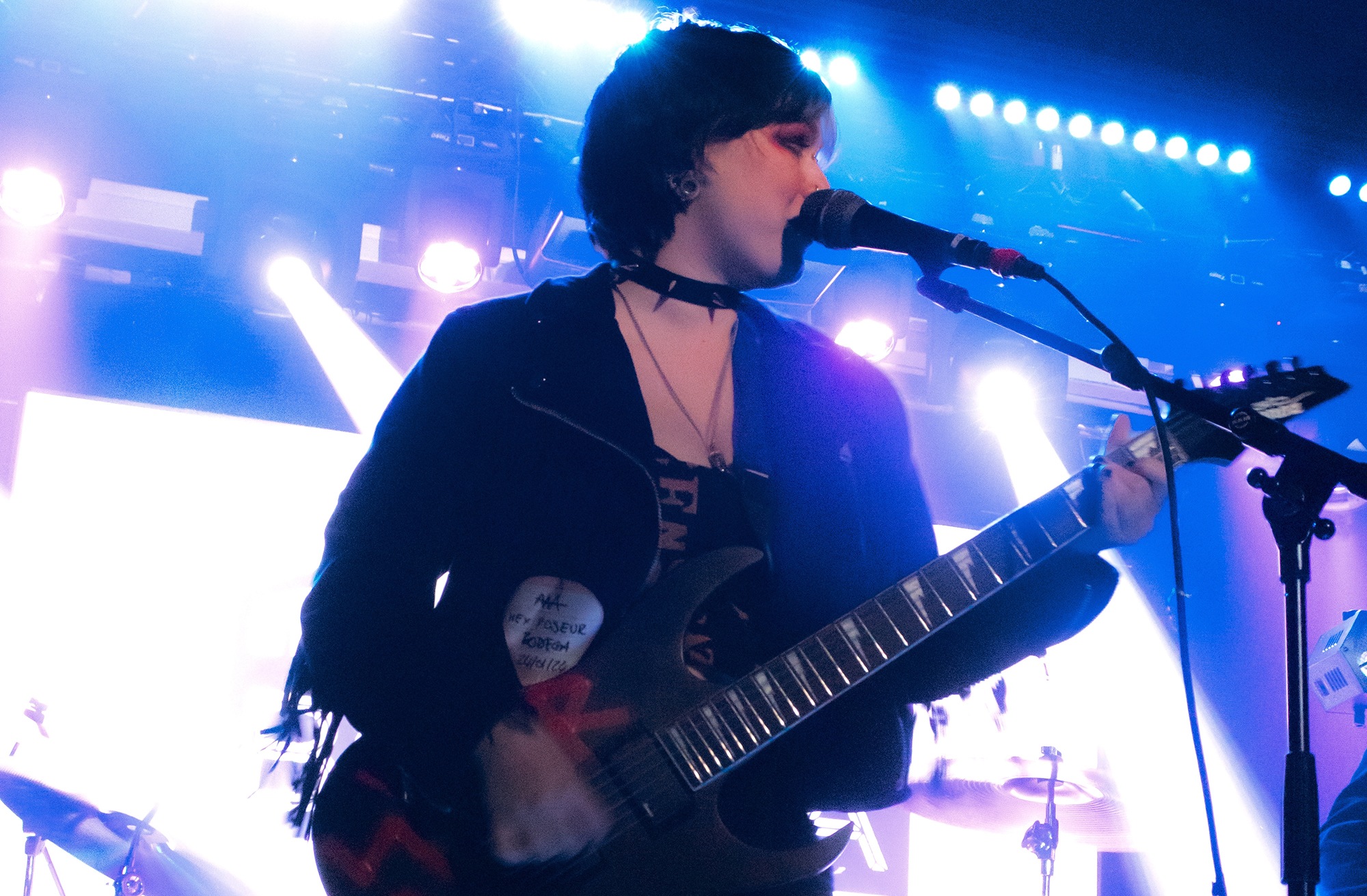 One could argue that the limited stage space at The Bodega is a factor in limited movement from bands, but CRASHFACE buck that trend from the off. The London duo – vocalist Charlie Hinton and bassist Otto Balfour – are ably backed up by a touring guitarist and drummer for this run and are making the best use of what they can in front of them. Rattling through songs like Loading Screen Infinity and Ultraplasticplanetkiller at a rate of knots, they seem quite rough at the beginning but really grow into their set and new song, the nu-metal tinged C.H.A.I.N.S.A.W is going to become a cornerstone of their live show for years to come. Once they’ve learned how to maintain the momentum they have by the end of their set throughout the time they have onstage, they’ll be even more of a force to be reckoned with, but they’re young and that will come in time.