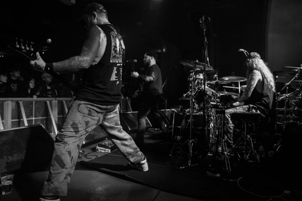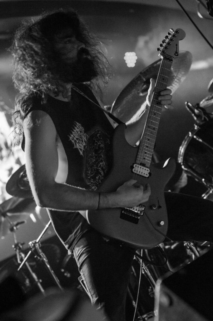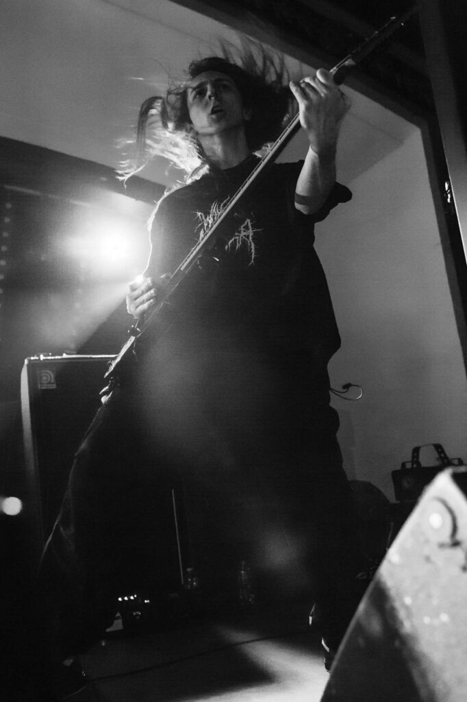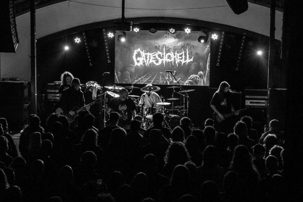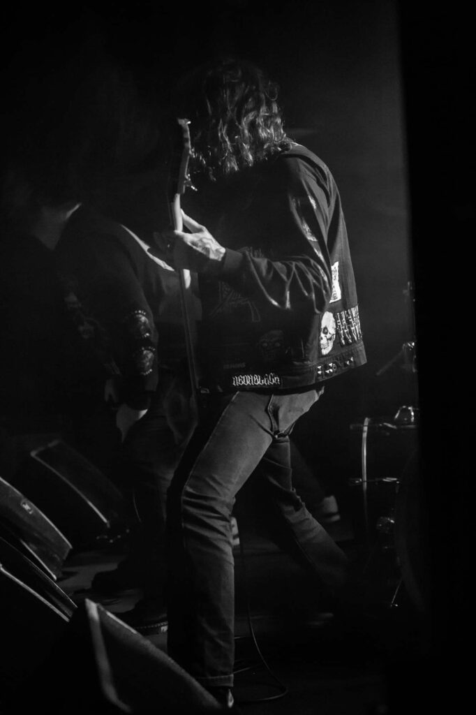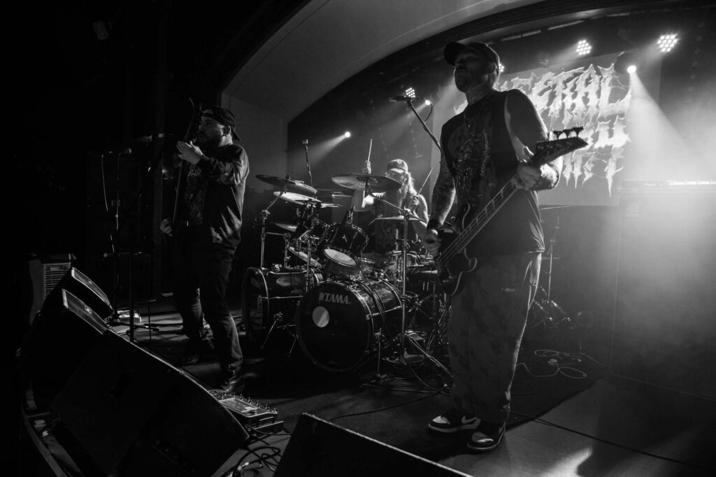 Armed with endless cinematic nostalgia are Italian death metallersĀ FULCI. Last seen in Glasgow in 2024, they’ve continued to amass their cult following, and this show demonstrates why. They’re backed by a projector screen showing compilations from the films of their namesake, Italian horror directorĀ Lucio Fulci. At the beginning, a disclaimer warns that the performance features scenes of misogyny, gore, cultural exploitation, porn and much more sordidness – what a tasty start! The band’s eardrum-puncturing brutal death metal is emphasised beautifully byĀ Fulci‘s trademark stringy latex gore, women and child-killing, maggot-infested zombies, and, of course, an eye-gouging (but just one) on screen. Films include Zombie Flesh Eaters most prominently, as well as New York Ripper, A Blade from the Dark and Voices from Beyond.Ā Human Scalp CollectionĀ features the lyrics on the projector, so the opportunity for death metal karaoke is there for the taking.