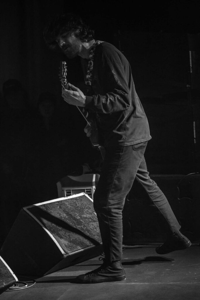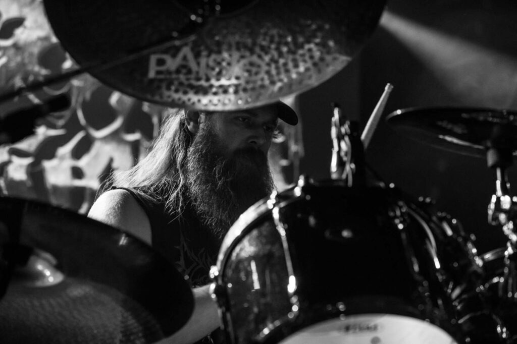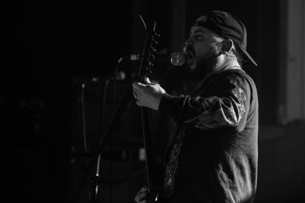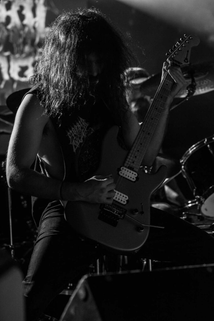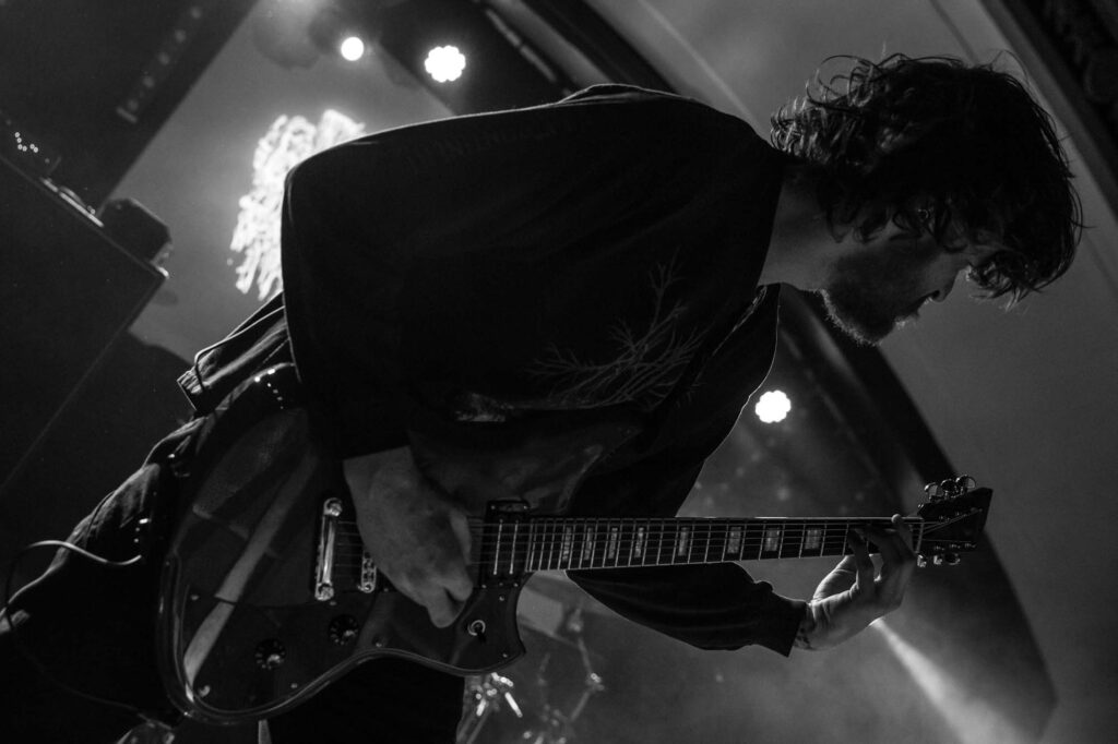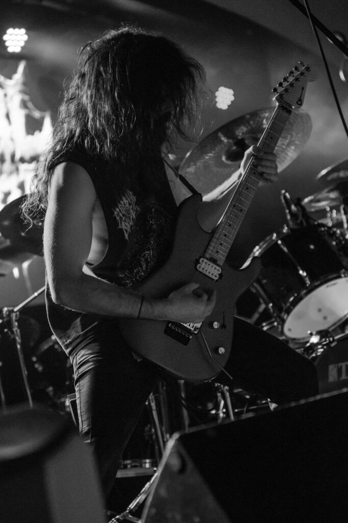 Armed with endless cinematic nostalgia are Italian death metallersĀ FULCI. Last seen in Glasgow in 2024, they’ve continued to amass their cult following, and this show demonstrates why. They’re backed by a projector screen showing compilations from the films of their namesake, Italian horror directorĀ Lucio Fulci. At the beginning, a disclaimer warns that the performance features scenes of misogyny, gore, cultural exploitation, porn and much more sordidness – what a tasty start! The band’s eardrum-puncturing brutal death metal is emphasised beautifully byĀ Fulci‘s trademark stringy latex gore, women and child-killing, maggot-infested zombies, and, of course, an eye-gouging (but just one) on screen. Films include Zombie Flesh Eaters most prominently, as well as New York Ripper, A Blade from the Dark and Voices from Beyond.Ā Human Scalp CollectionĀ features the lyrics on the projector, so the opportunity for death metal karaoke is there for the taking.