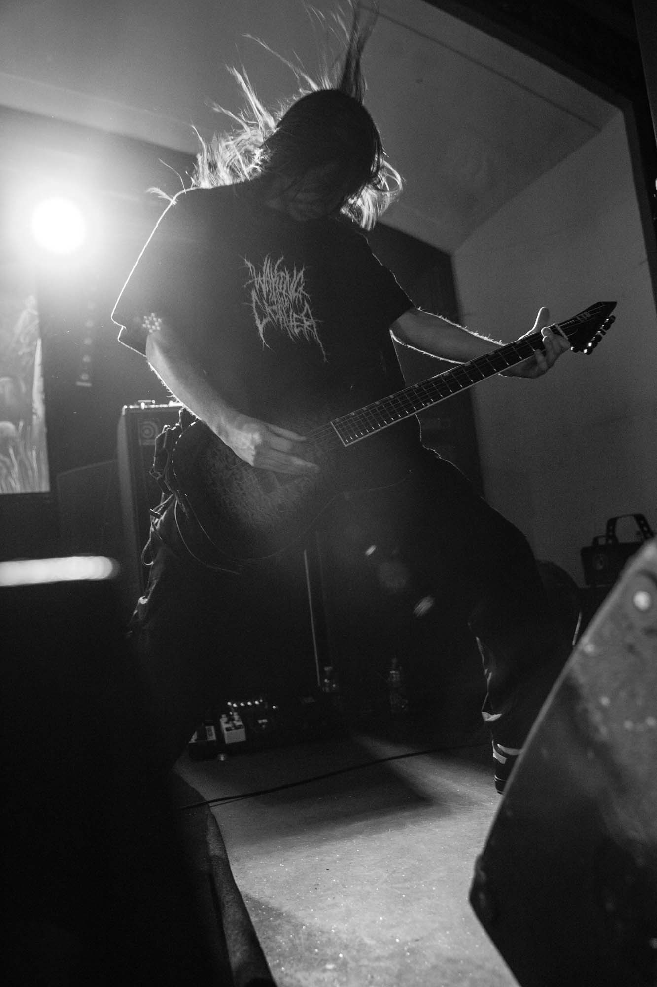 Armed with endless cinematic nostalgia are Italian death metallersĀ FULCI. Last seen in Glasgow in 2024, they’ve continued to amass their cult following, and this show demonstrates why. They’re backed by a projector screen showing compilations from the films of their namesake, Italian horror directorĀ Lucio Fulci. At the beginning, a disclaimer warns that the performance features scenes of misogyny, gore, cultural exploitation, porn and much more sordidness – what a tasty start! The band’s eardrum-puncturing brutal death metal is emphasised beautifully byĀ Fulci‘s trademark stringy latex gore, women and child-killing, maggot-infested zombies, and, of course, an eye-gouging (but just one) on screen. Films include Zombie Flesh Eaters most prominently, as well as New York Ripper, A Blade from the Dark and Voices from Beyond.Ā Human Scalp CollectionĀ features the lyrics on the projector, so the opportunity for death metal karaoke is there for the taking.