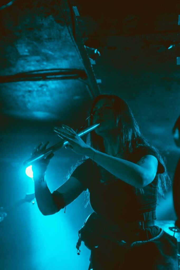 From there, we’re treated to an hour of folk-laden black metal at its absolute best. Echoes Of The Ancient Land is a white-knuckled, adrenaline-pumping experience as the band erupt into a flurry of duelling riffs and thundering percussion, before rolling into gorgeous folk-laden instrumentation and enchanting vocals from Ella Zlotos, whose contributions act such a unique and immersive linchpin to the SAOR live sound. The Sylvan Embrace is clear evidence of this and its rendition in London sends shivers down the spine. A deep and evocative sombre passage, the way in which Zlotos‘ woodwind instrumentation and vocals, particularly when she harmonises with Marshall, is one of the highlights in a set that rarely breaks the immersion.