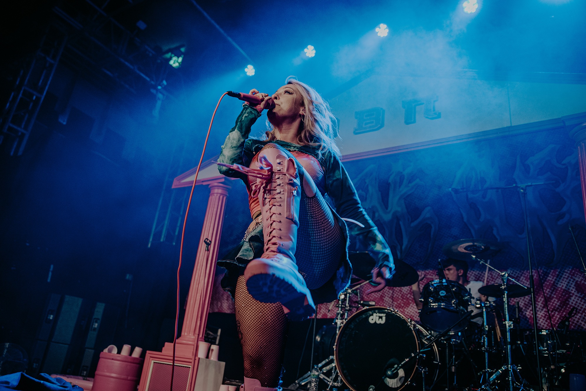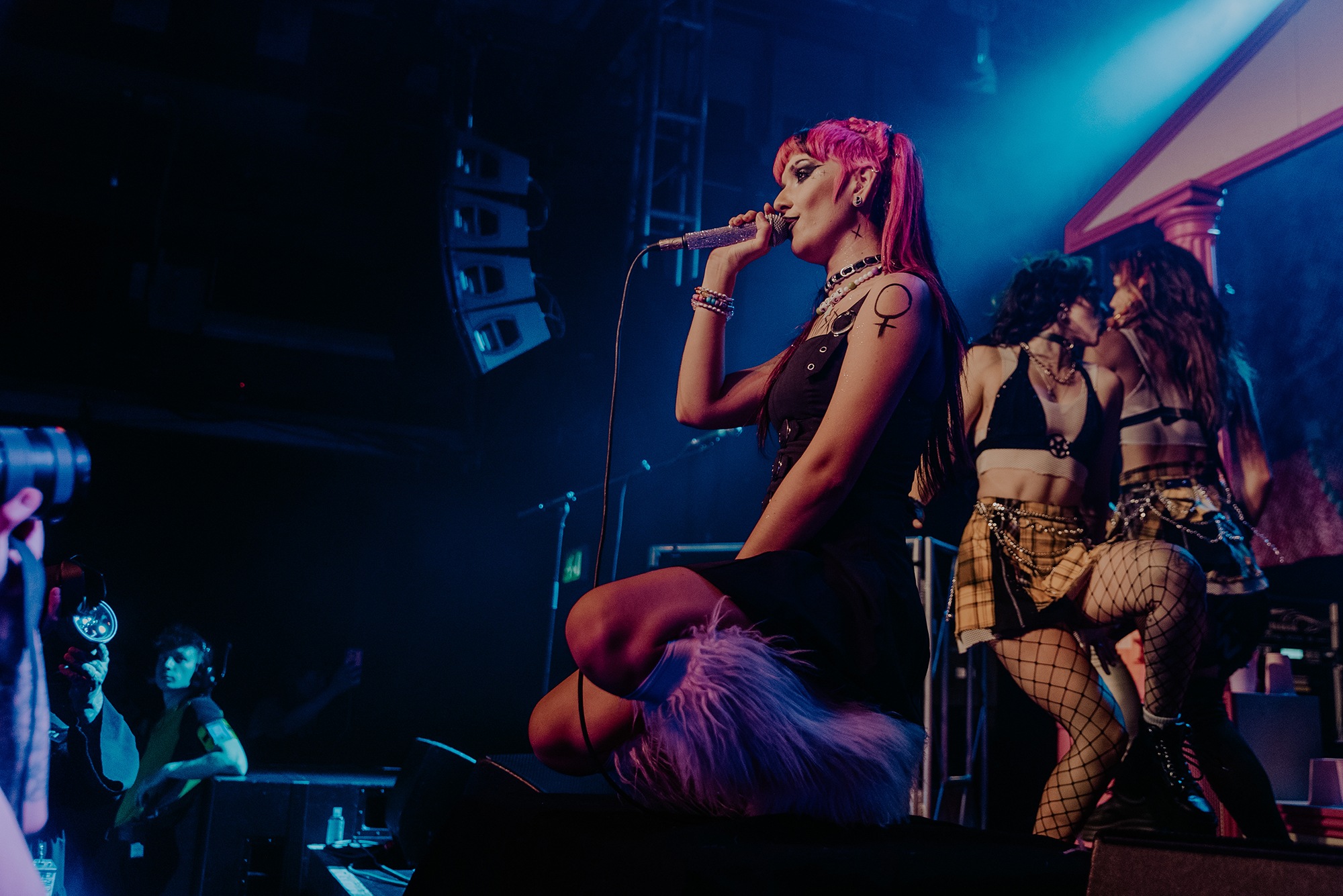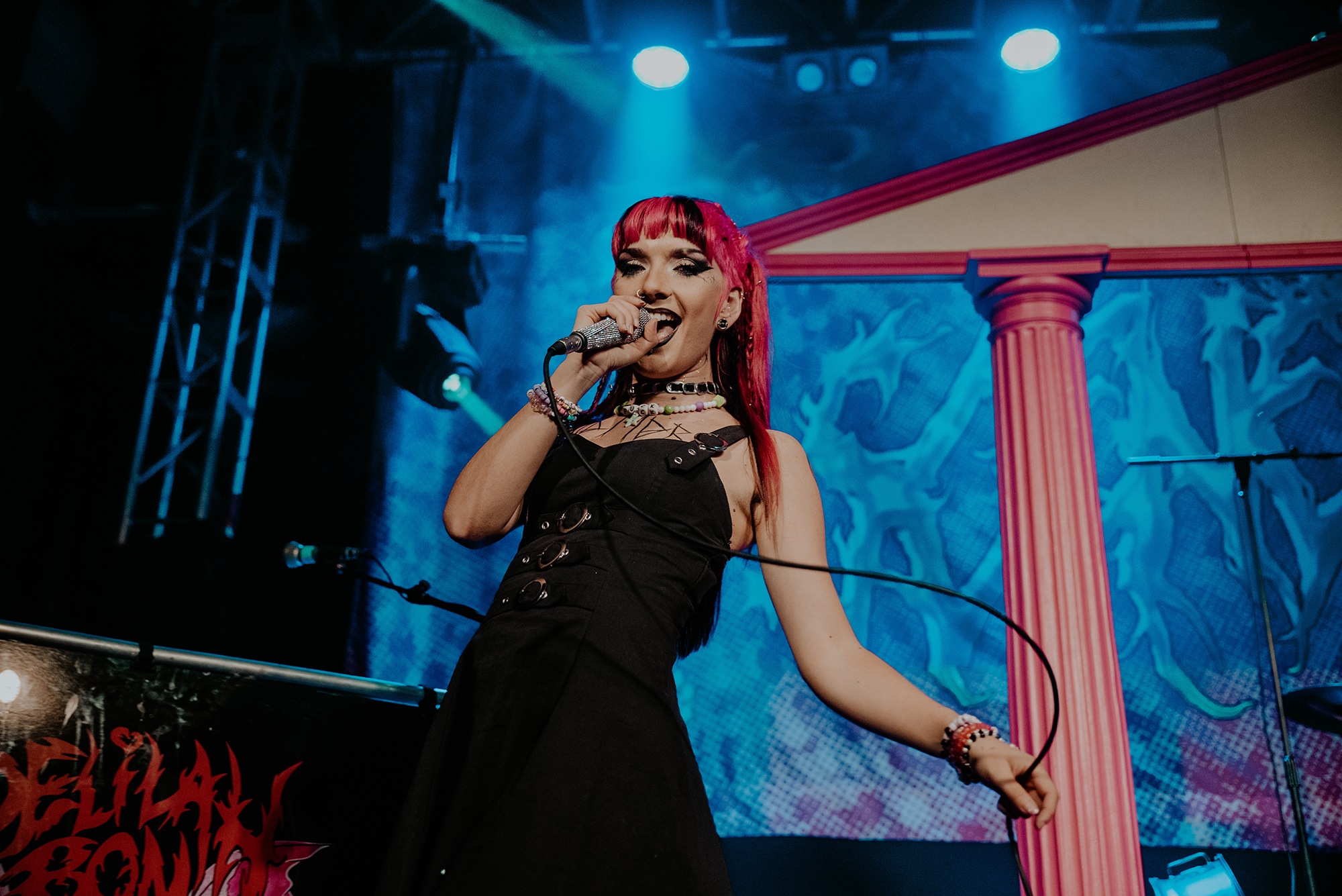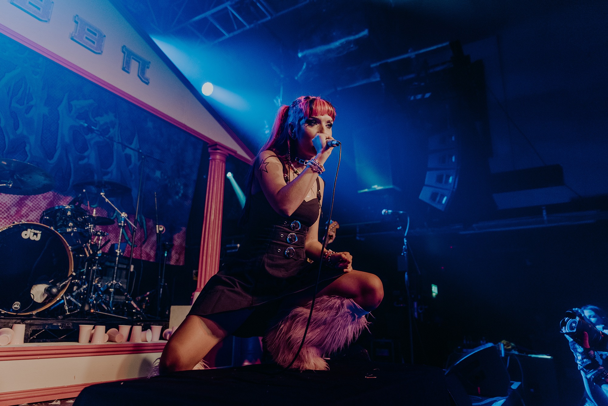 By the time SCENE QUEEN comes onto the stage, the audience are hot with anticipation. They scream the lyrics of Pink Whitney from SCENE QUEEN‘s second EP, Bimbocore Volume 2, and don’t stop moving throughout the hour set. Despite only releasing two EPs so far in her career, there are a lot of songs for SCENE QUEEN to play, from the empowering new single Pink Push-Up Bra, unreleased song MILF and many fan-favourites, including Pink Paper, Pink G-String and Barbie & Ken, which Joey Fleming comes out for. In between the songs, there are two audience members who are picked out to become members of her sorority. As well as getting necklaces, the audience members also look out for others in the crowd.