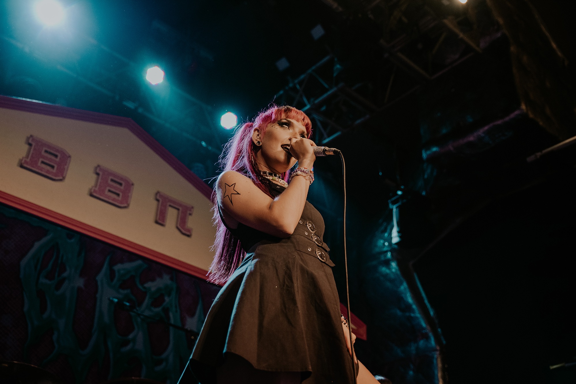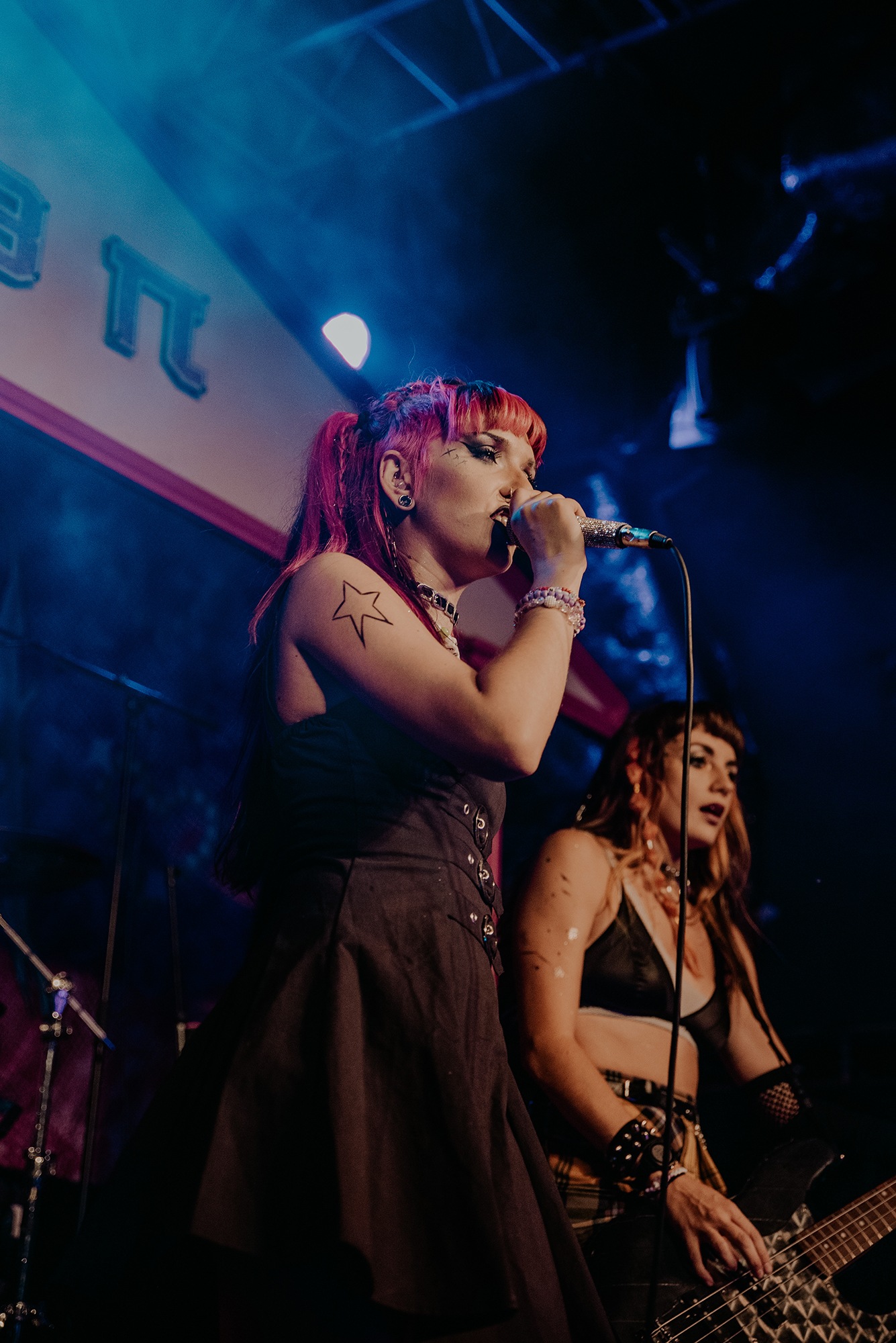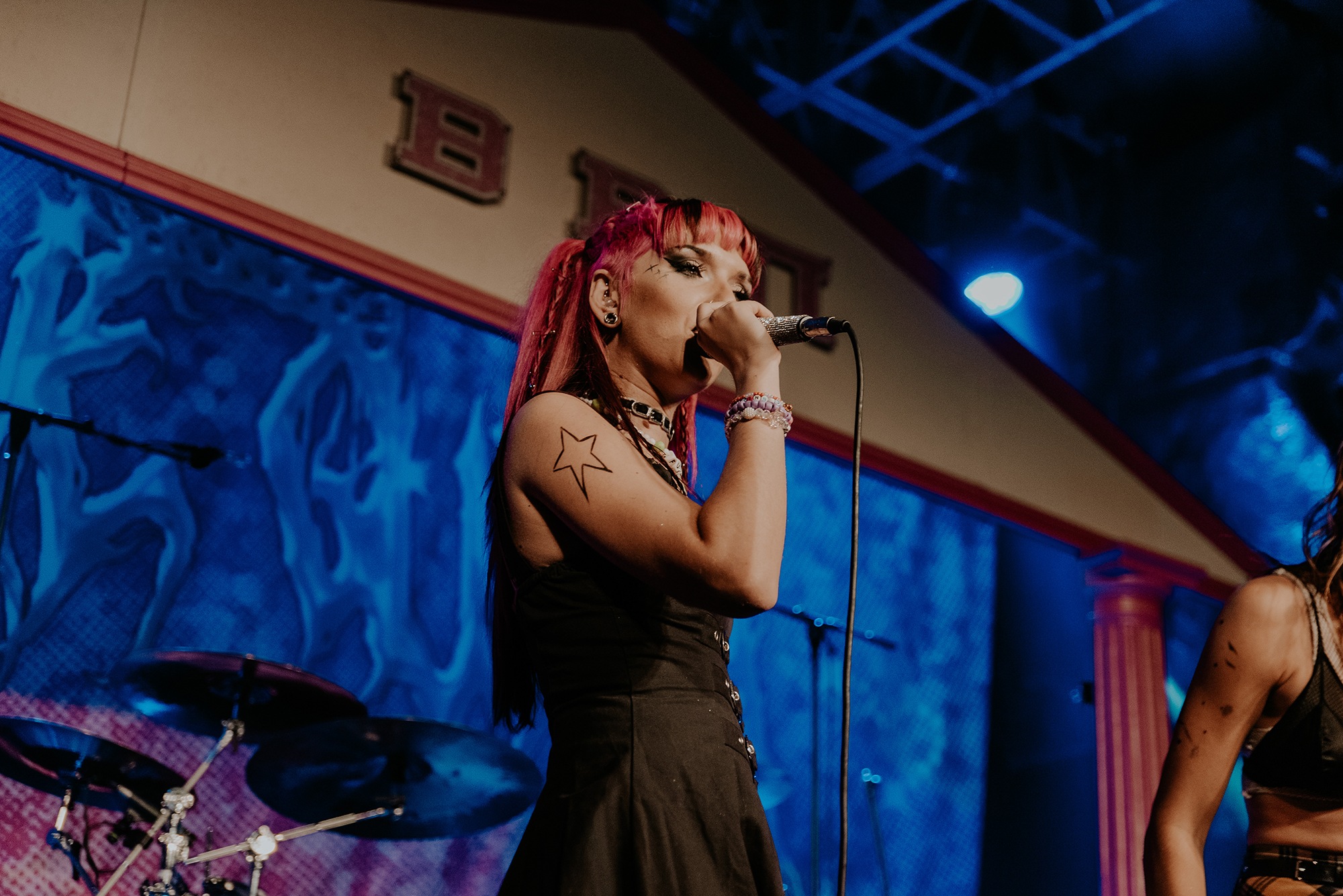 By the time SCENE QUEEN comes onto the stage, the audience are hot with anticipation. They scream the lyrics of Pink Whitney from SCENE QUEEN‘s second EP, Bimbocore Volume 2, and don’t stop moving throughout the hour set. Despite only releasing two EPs so far in her career, there are a lot of songs for SCENE QUEEN to play, from the empowering new single Pink Push-Up Bra, unreleased song MILF and many fan-favourites, including Pink Paper, Pink G-String and Barbie & Ken, which Joey Fleming comes out for. In between the songs, there are two audience members who are picked out to become members of her sorority. As well as getting necklaces, the audience members also look out for others in the crowd.
