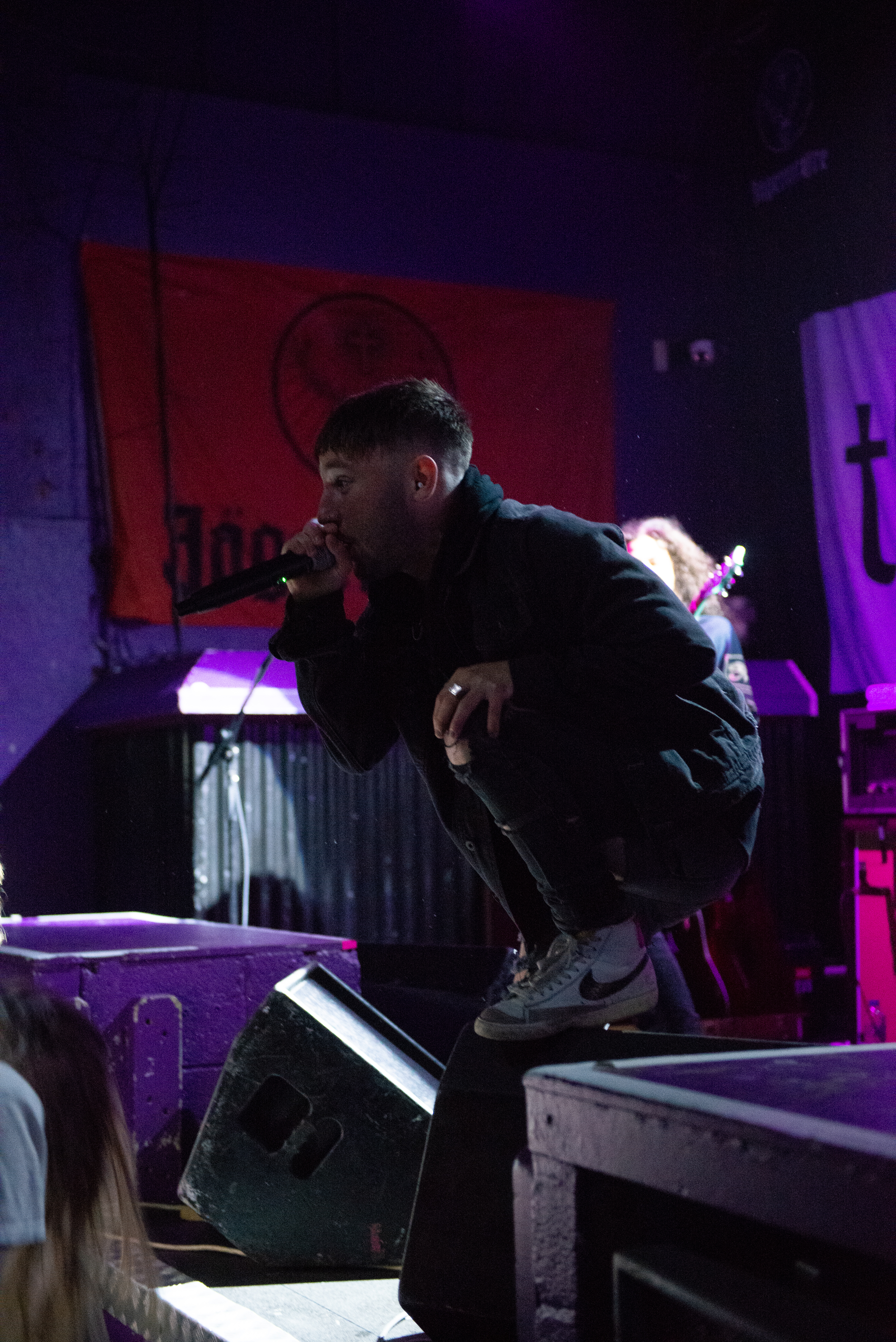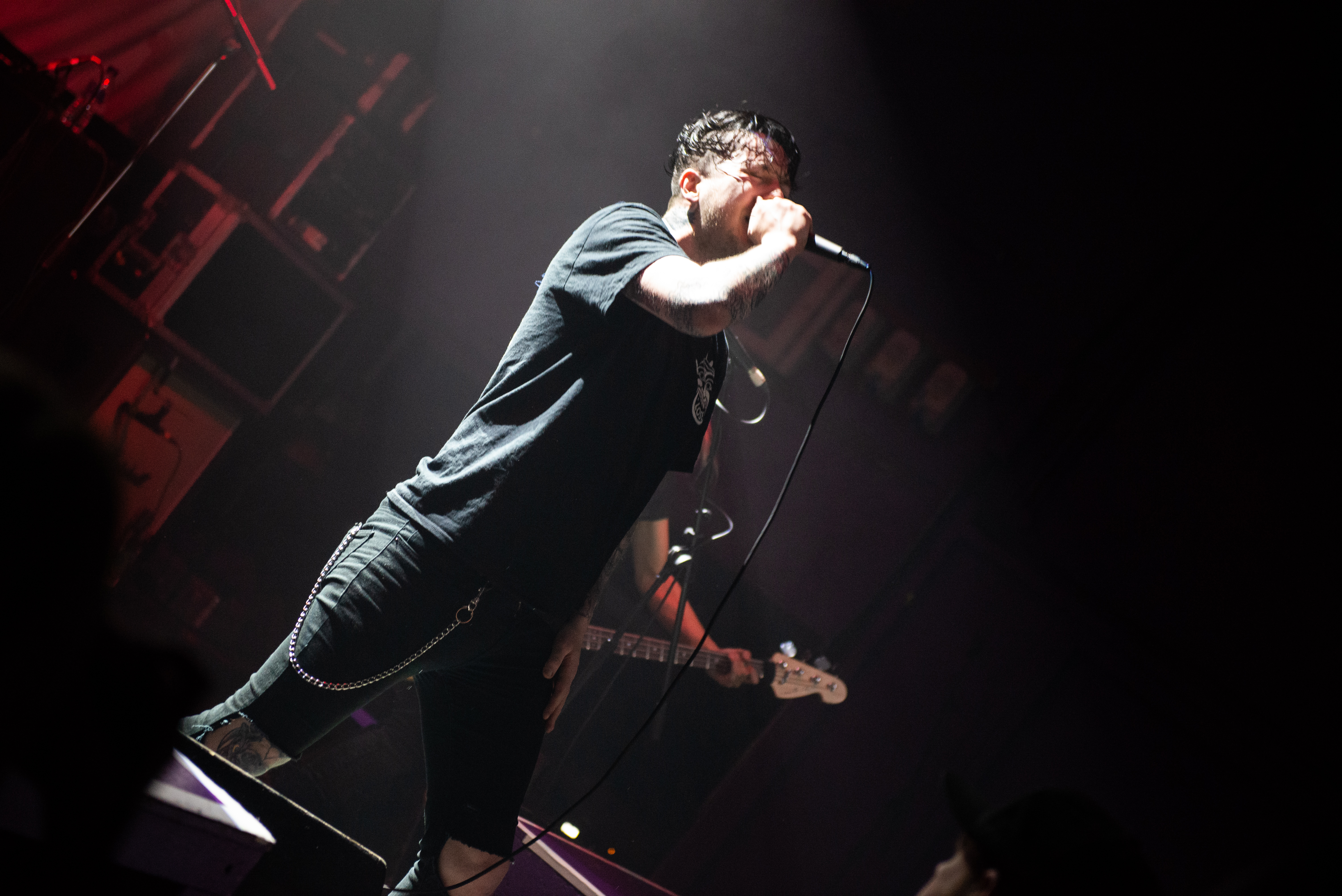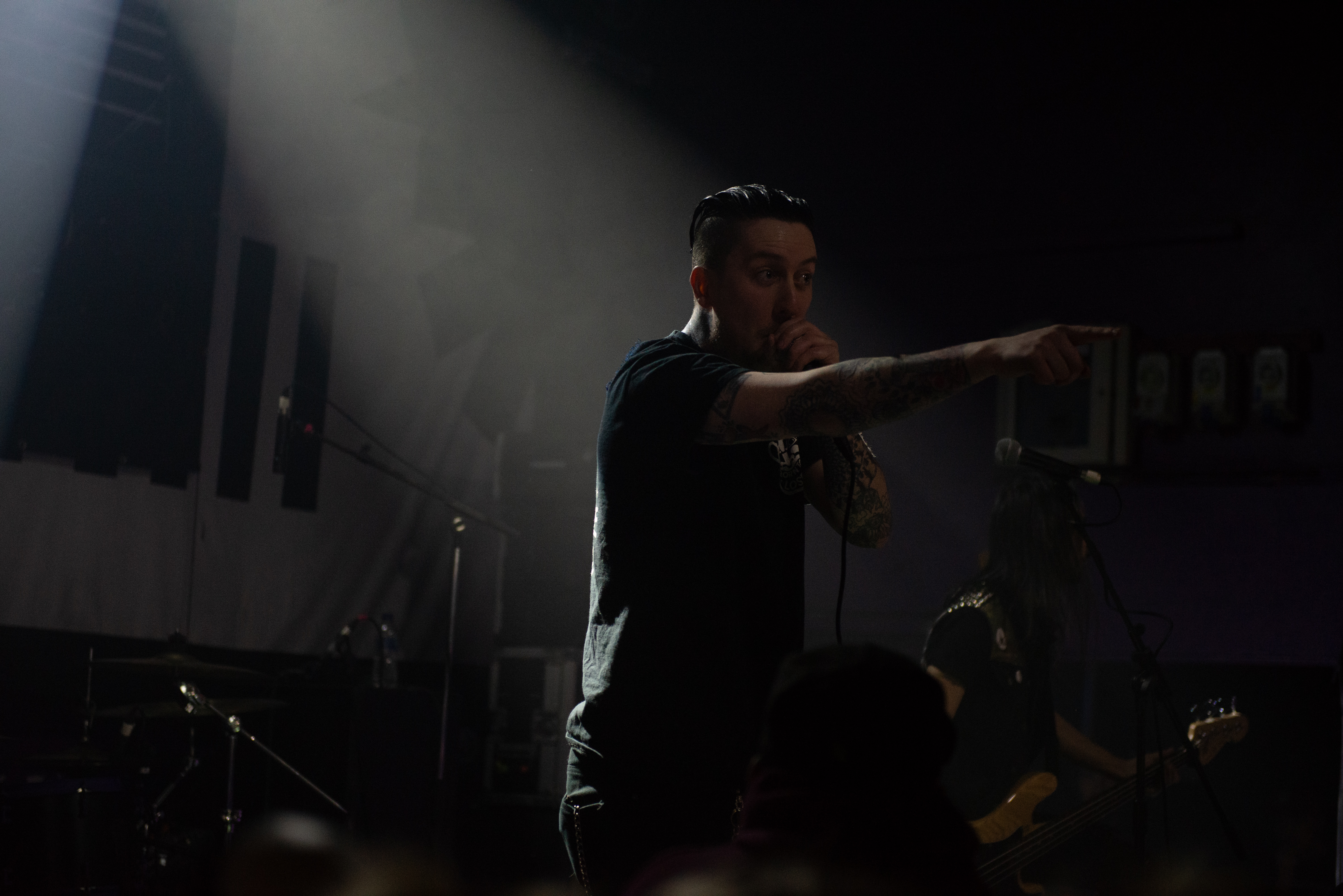 First up were local hardcore lads BLACK COAST, who put on an animated set full of loud, pulsating tunes, and a performance which contained much aggression, and only became more menacing as things proceeded, with frontman Charlie Hewitt frequently standing on the edge of the stage during the instrumentals glaring at everybody, and regularly jumping off into what was, at this point in the evening, a rather sparse audience, stomping around and shouting and screaming, at times directly into their faces.