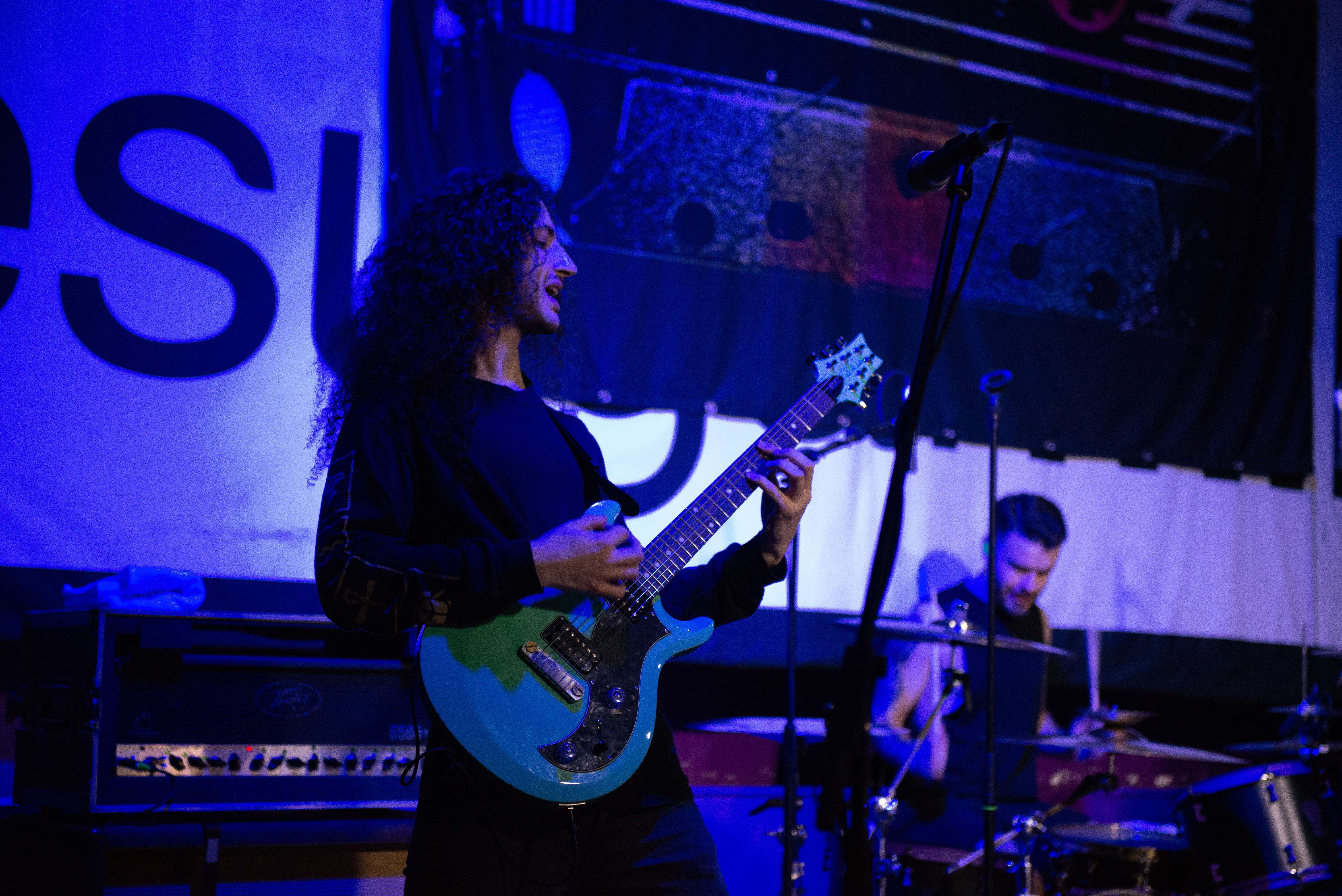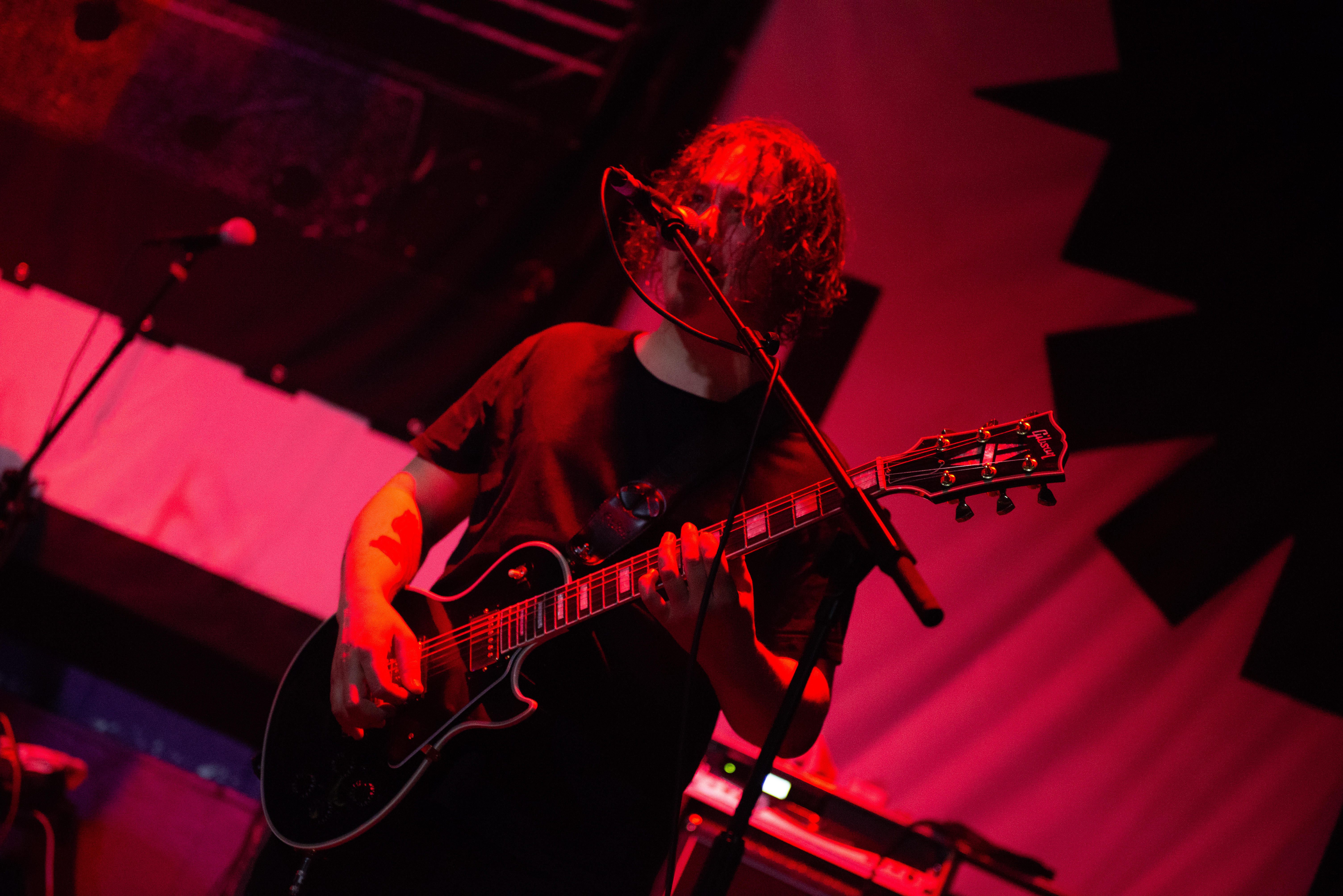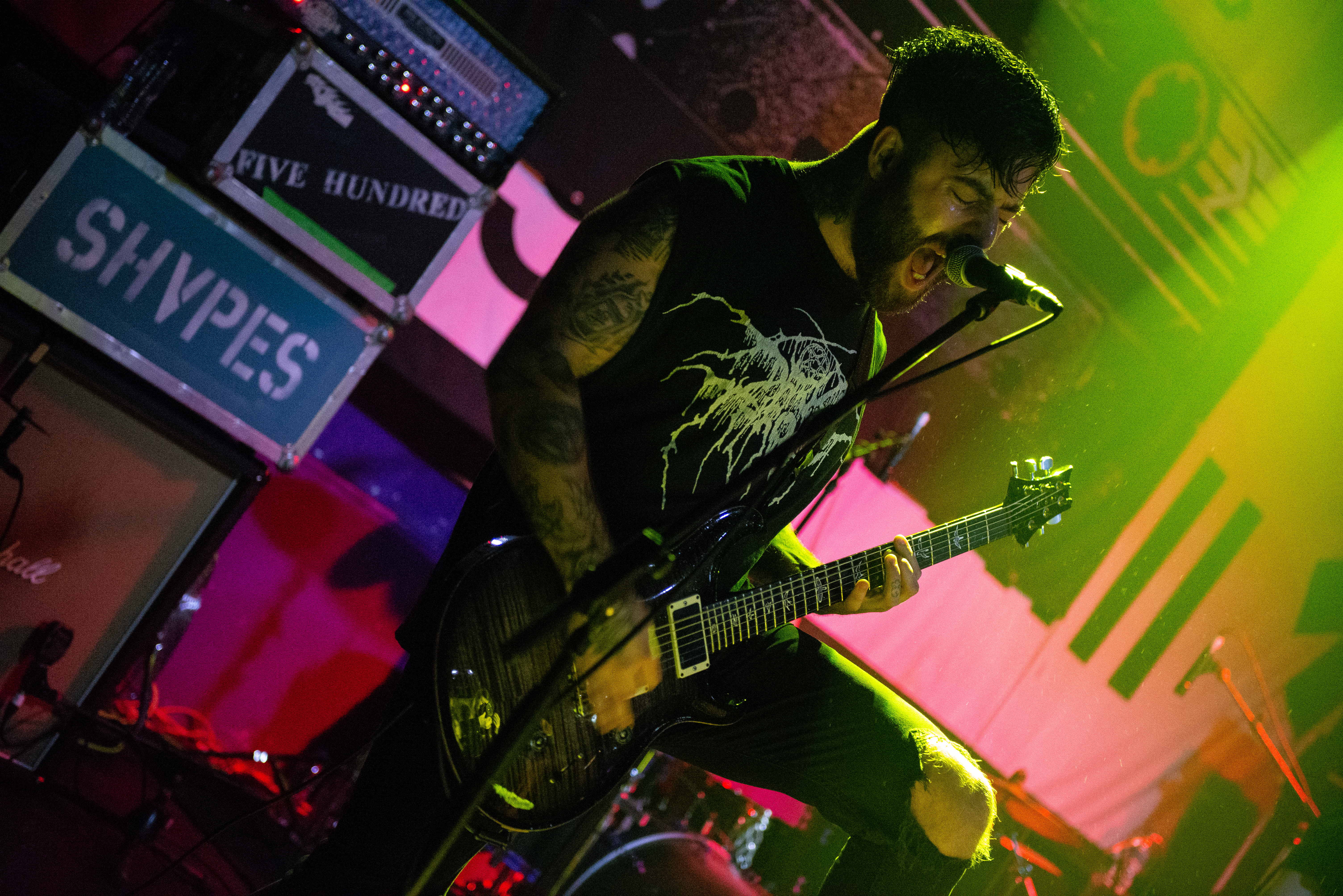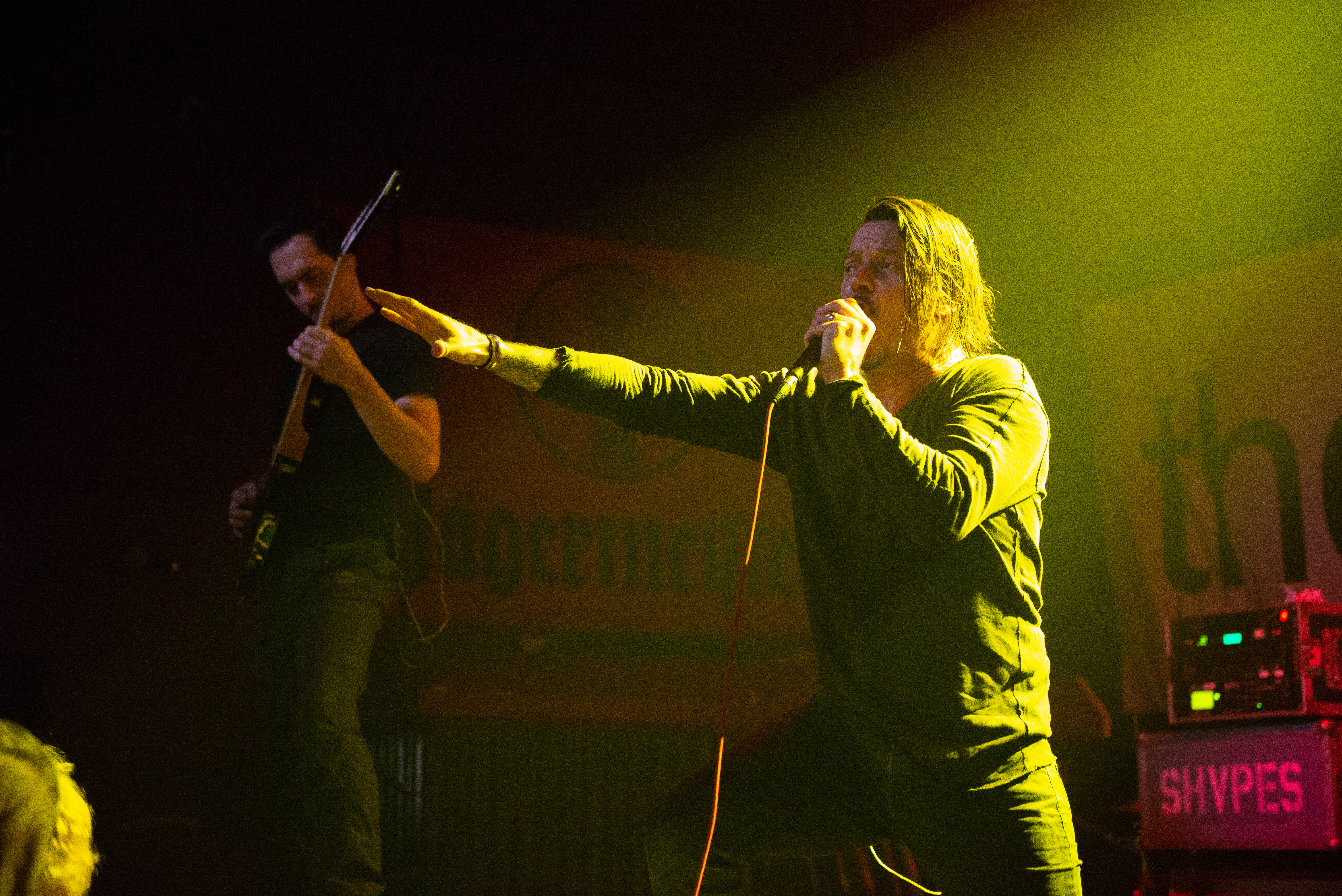 Going back to the question that was asked earlier, and the answer to that became pretty clear from the moment SHVPES began playing their set. With the stage shrouded in darkness, one by one, the band walked quietly towards their instruments, until vocalist Griffin Dickinson came in from the entrance to the venue, charged forwards, leapt on, and lit everything up, with vocal tones that were more in the vein of Zack De La Rocha than of his father, a certain IRON MAIDEN legend.