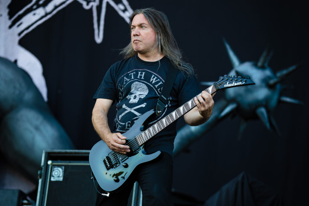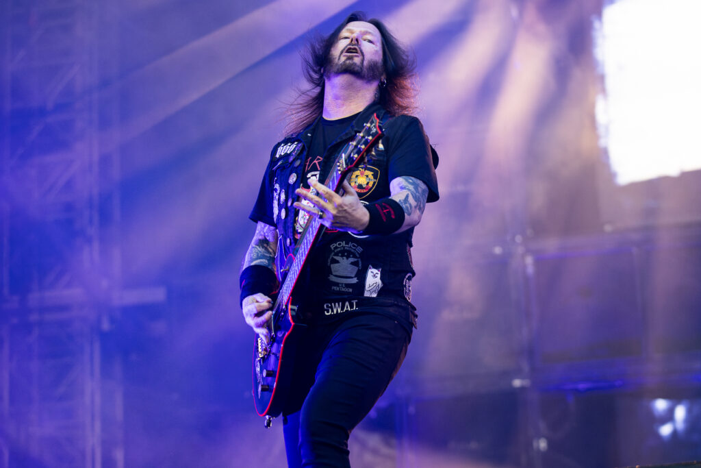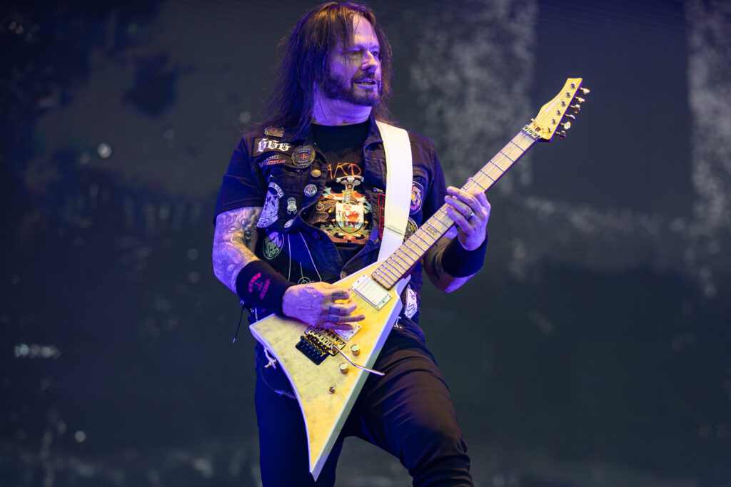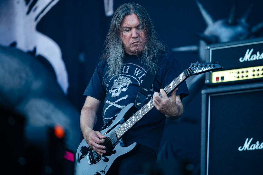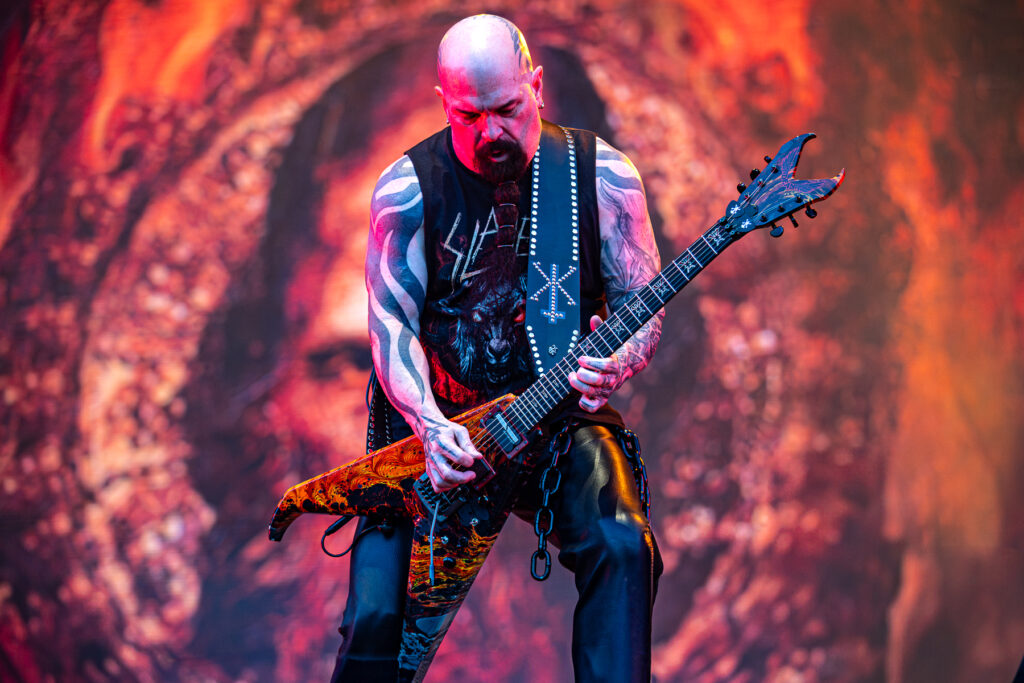 Gary Holt, Kerry King, and Paul Bostaph are machines in their own right. Holt spends his times performing his guitar solos with his eyes closed, flicking picks at the audience and giving himself whiplash. When not stamping on his guitar pedals to make his guitar squeal in anguish, King prowls the stage covers in his signature chains while Bostaph keeps the pace while trying to survive in the scorching heat of the flames.Â