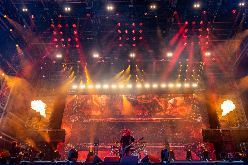 That familiar sight? A huge curtain in front of the stage drops sporting ‘SLAYER’ in huge white letters. After waiting long enough we’re treating to a five-minute recap video package of SLAYER‘s career. As that ends, the curtain falls as Delusions Of Savior echoes through the speakers. Until it’s cut and we get the start to the set. South Of Heaven. It’s a spinetingling feeling seeing SLAYER back up on a stage in the UK again. Repentless hammers home the point that they haven’t lost any momentum from being away as it’s a tight and heavy continuation. Disciple creates more circle pits than you can count on three pairs of hands. God Hates Us All sports two elevated inverted Marshall stacks above the stage which are then set on fire to really hammer the point that God, in fact, does hate us all. It’s utterly relentless.Â