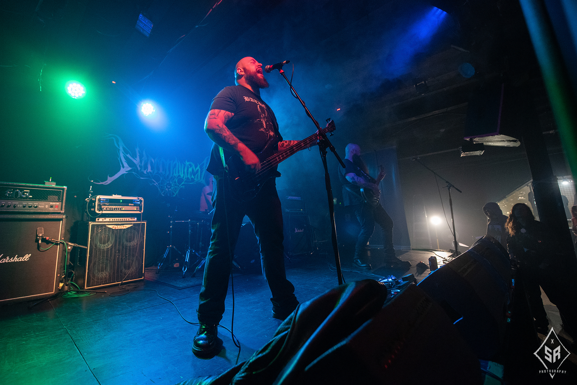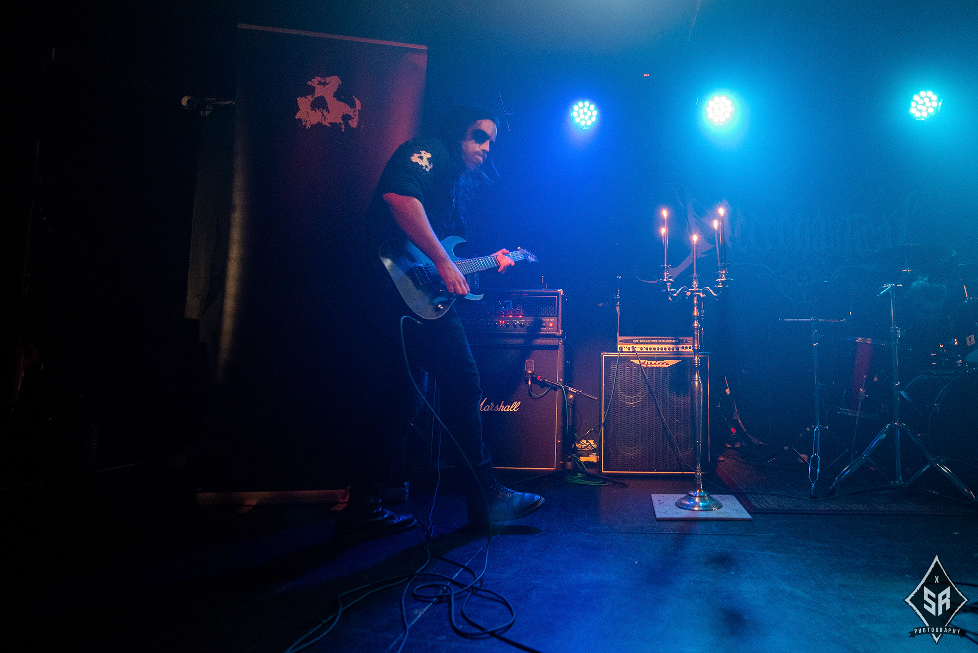Whilst tonight’s co-headliners atmospheric and melodic approach to black metal may not be the most aggressive and ear-piercing noise the genre has to offer, as the first band on the bill, and easily the heaviest of the four bands playing tonight, local outfit BURIAL are in razor-sharp form as their opening set injects bouts of adrenaline from the first note to the last. Quick with blunt, northern banter in between songs, the band let their music do the talking and the result is audibly explosive. Hefty riffs flowing in top gear are the order of the day here and Derek Carley‘s vicious snarls are laced with venom, adding a sense of gritty rawness to their blackened death metal aural assault. The only sombre moment of the set comes as Carley dedicates Satanic Immolation to Mike Woods, the former EXXXEKUTIONER and HEAVY SENTENCE guitarist whose tragic passing surfaced in the week of the show. It’s a fitting tribute to a figure that lit up the Mancunian metal scene and demonstrates the impact Woods had on this community as fists, pints and devil horns are raised in tribute. A fitting reflection on the community-driven local scene, something which BURIAL are very much cemented in.