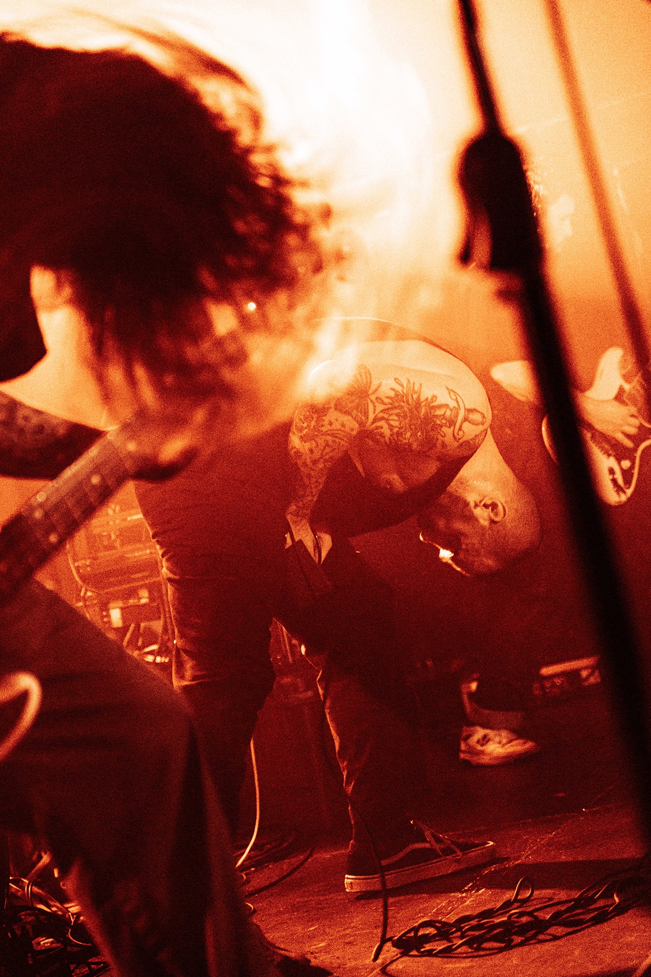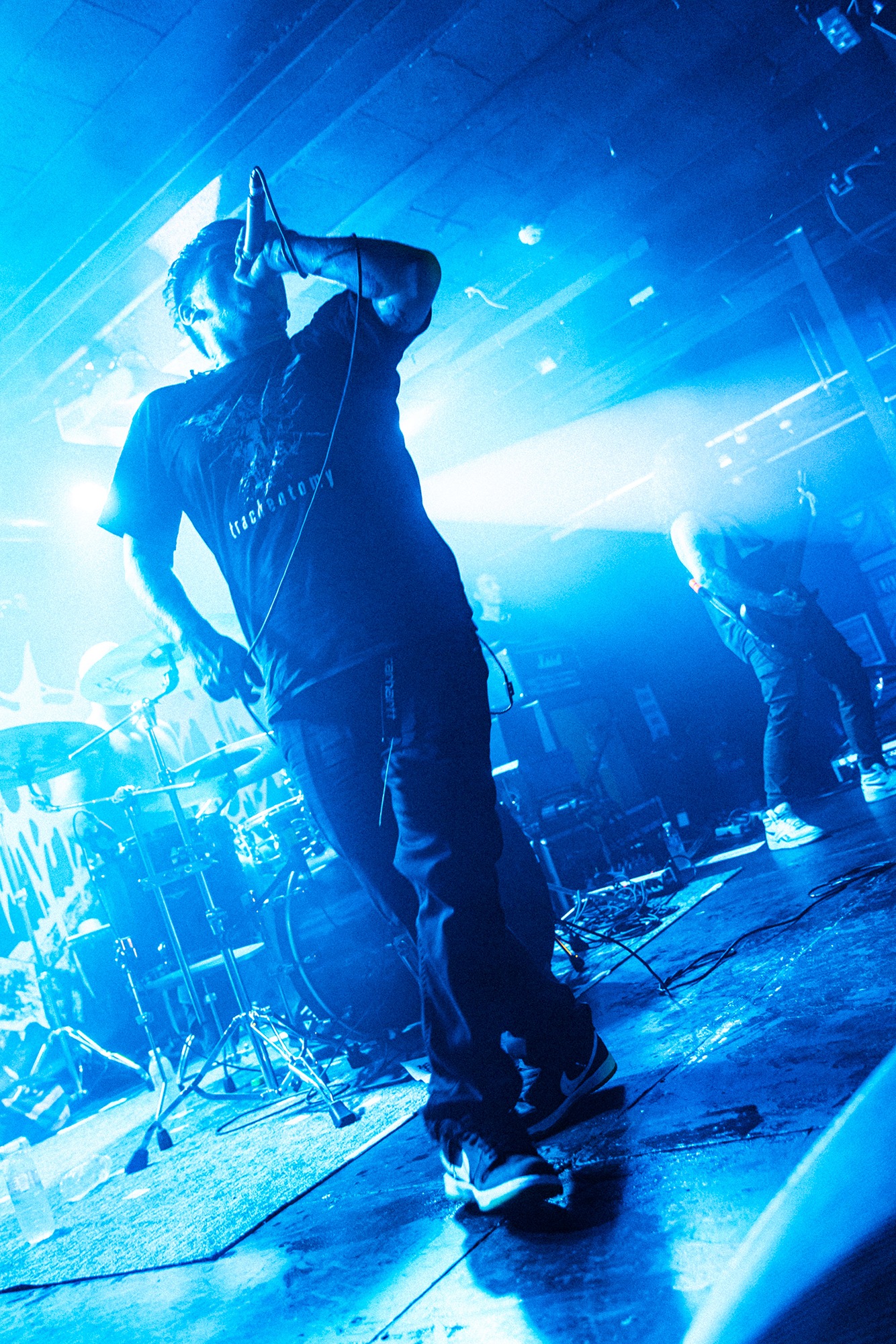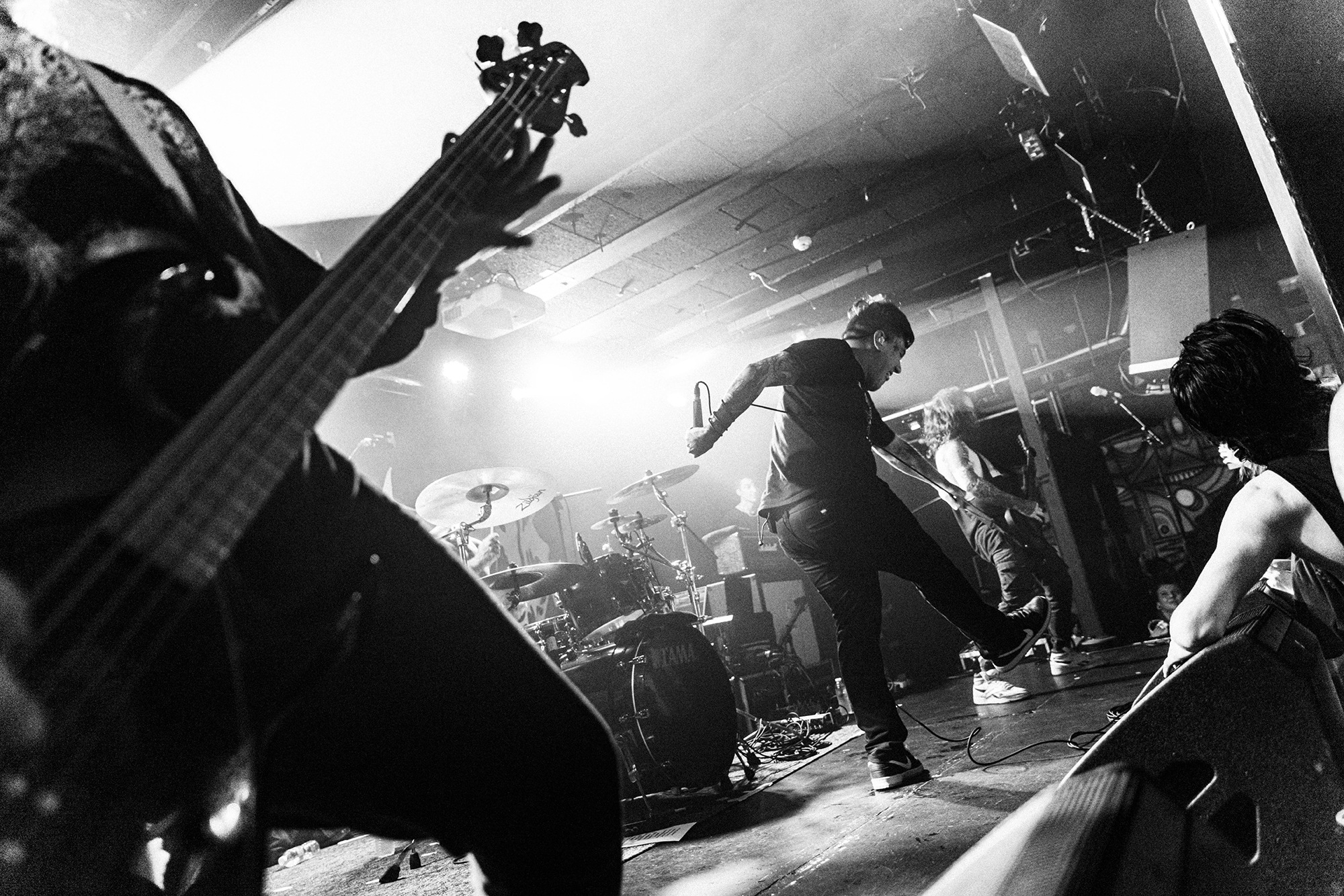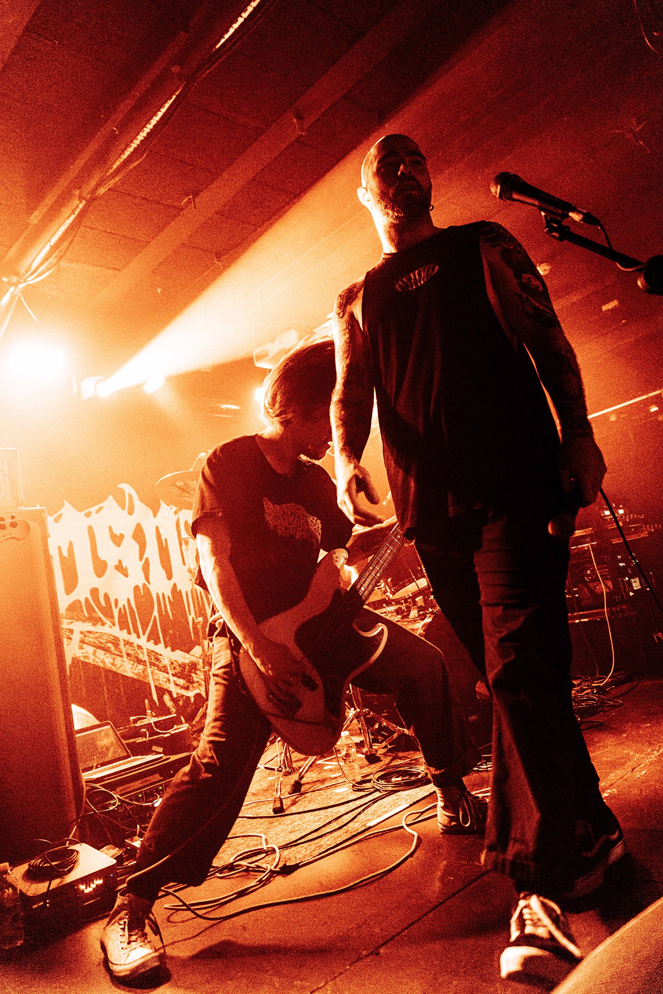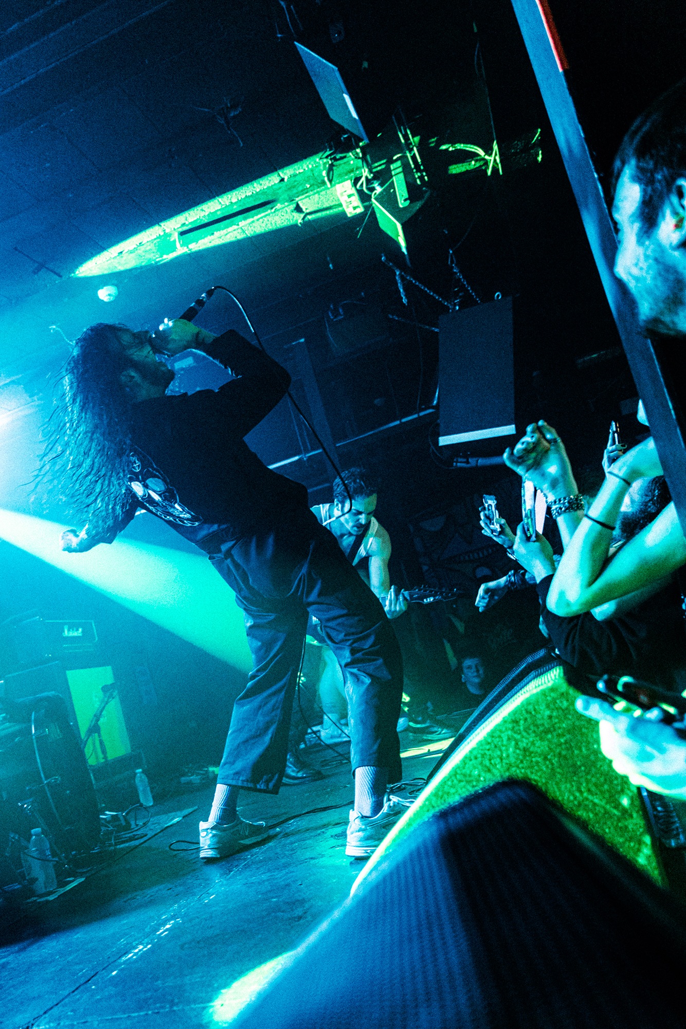 With there having simply not been a weak link in the chain tonight, the pressure is on California monsters SPITE to raise the game further, and they donāt disappoint with fast pummelling riffs and drums that squeeze the whole room like an industrial crusher, and choking screams that leave you short of breath. They are a demolition crew with everyone in the room as their target, all pushed by drummer Travis Regnier who blasts the kit like a behemoth on Adderall, swinging his arms at a blistering pace. Not to be outdone, vocalist Darius Tehrani is a true performer, launching himself left to right in a rage, swinging his arms and hair in a fit to incite the room. Although the room is somewhat slow to start, they quickly latch on to the California brutes, launching from the stage and flooding pits in a caustic mess of wet bodies.