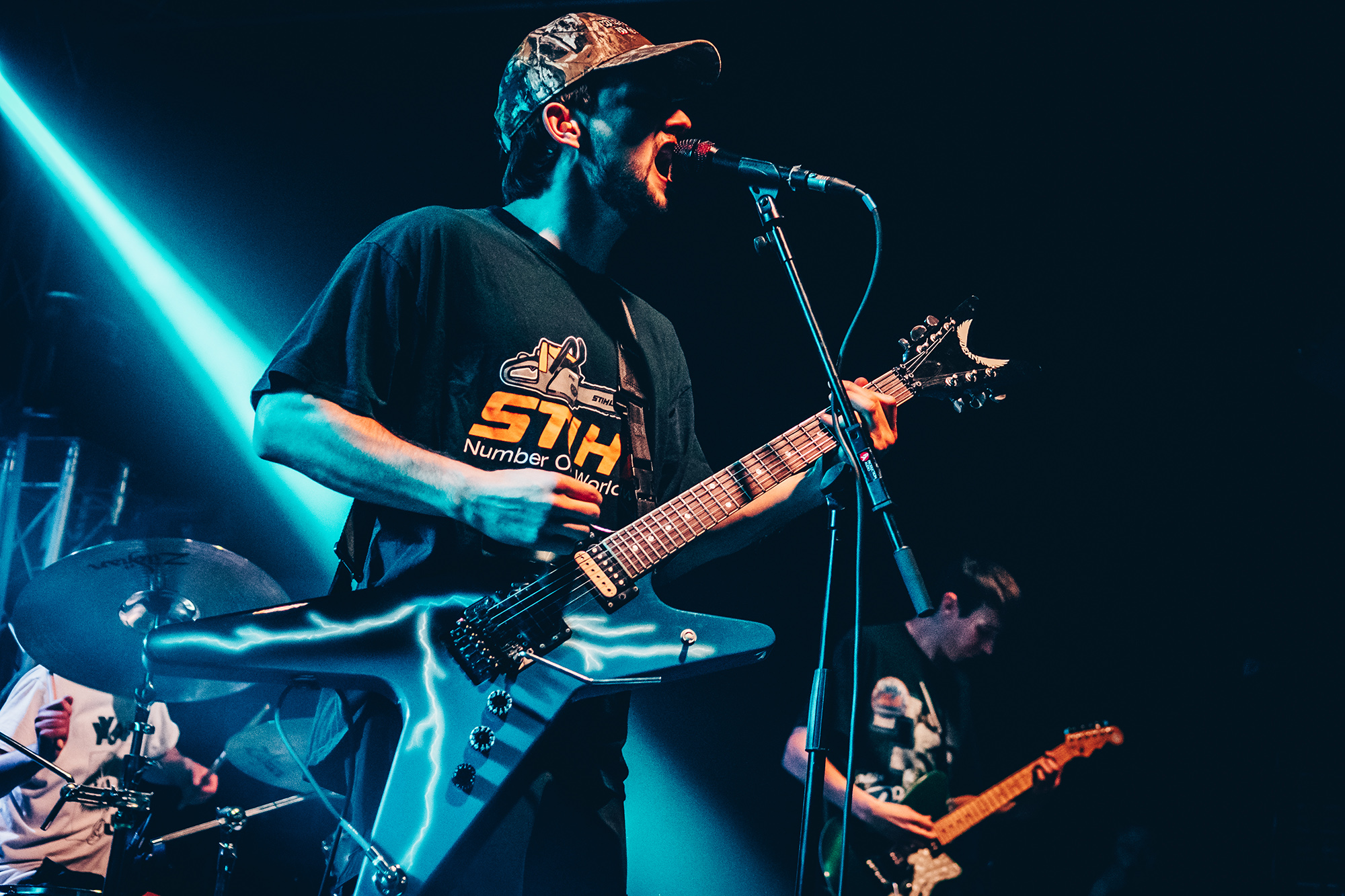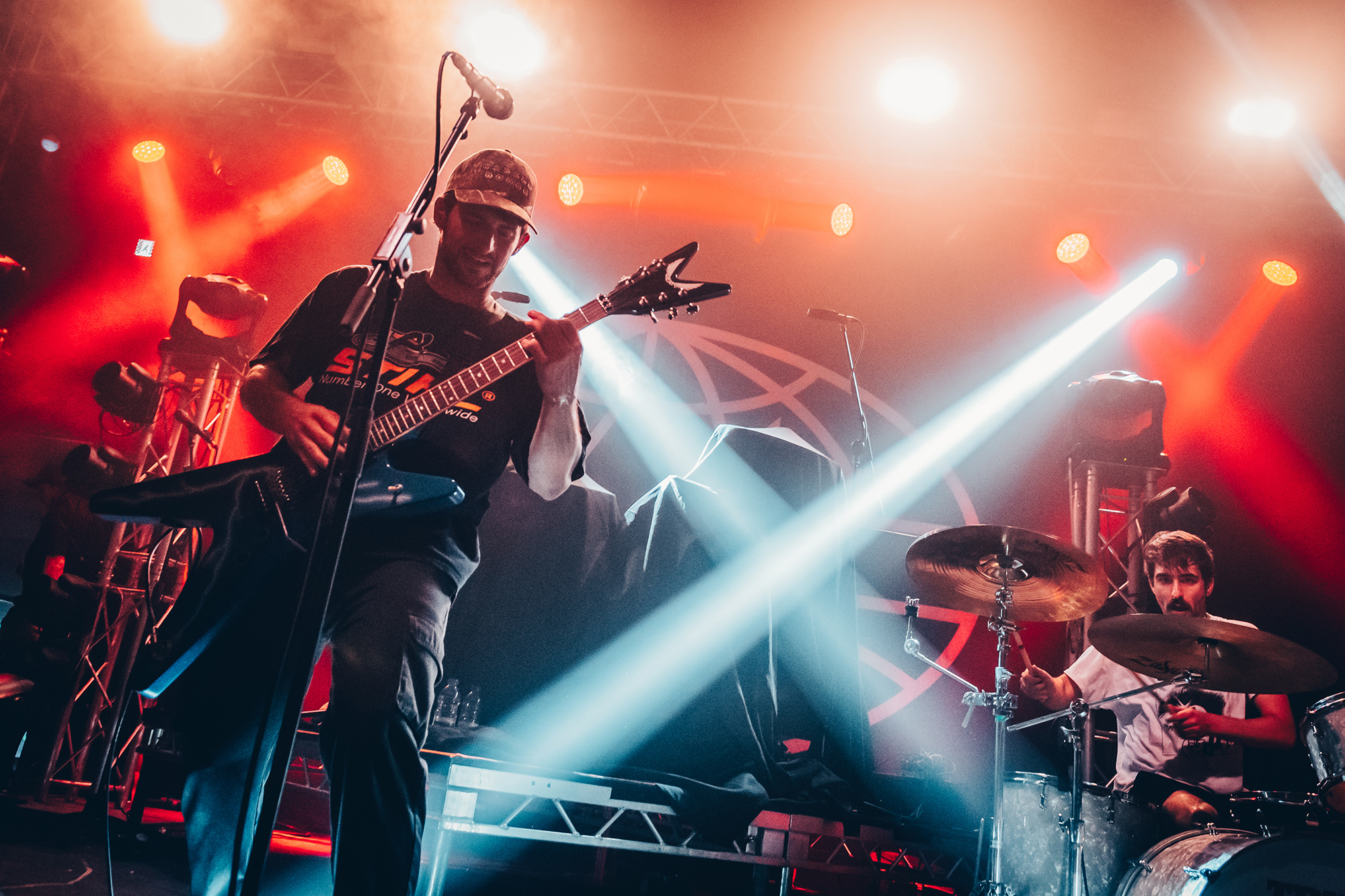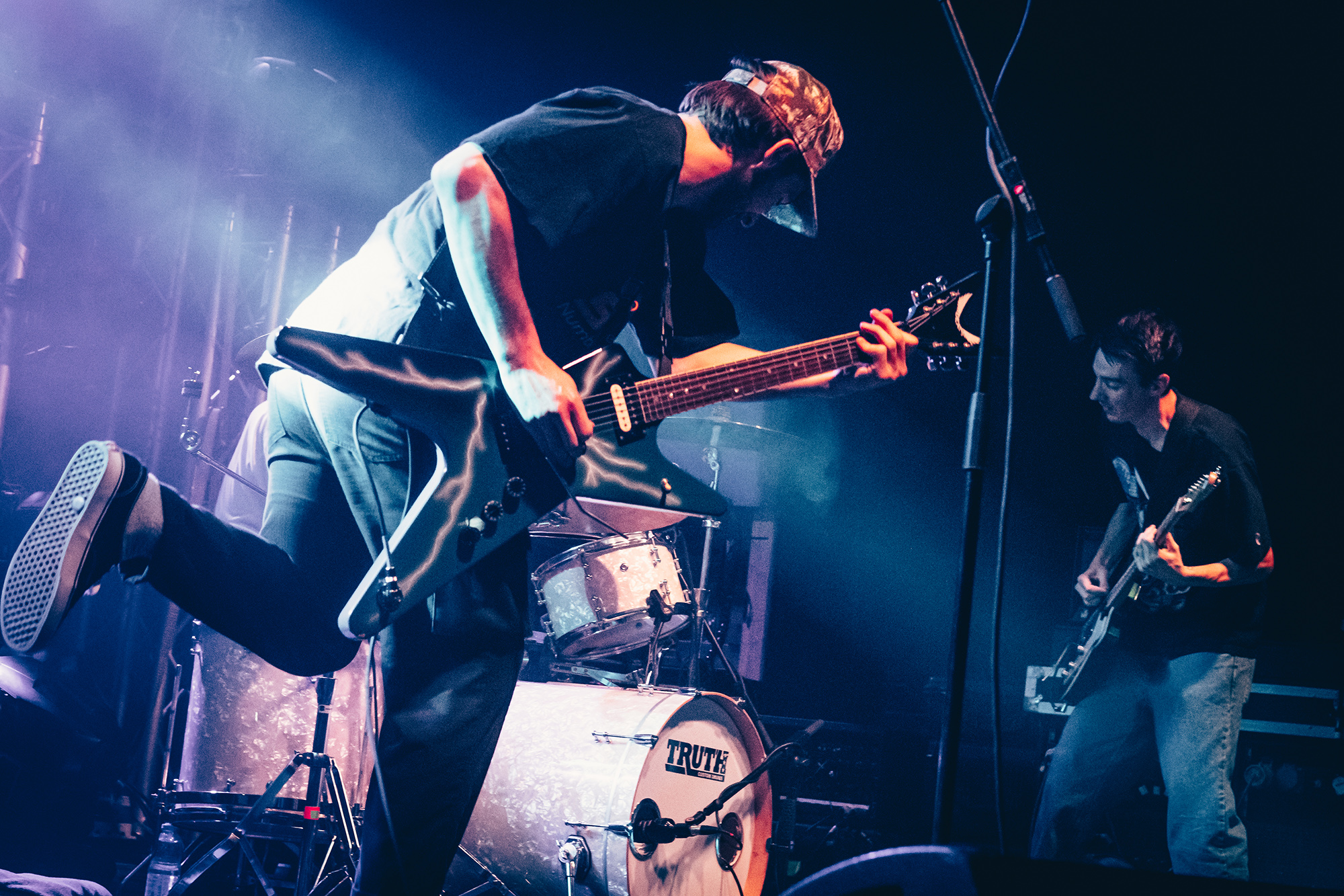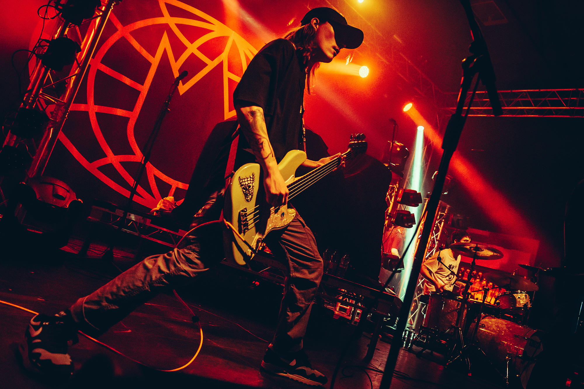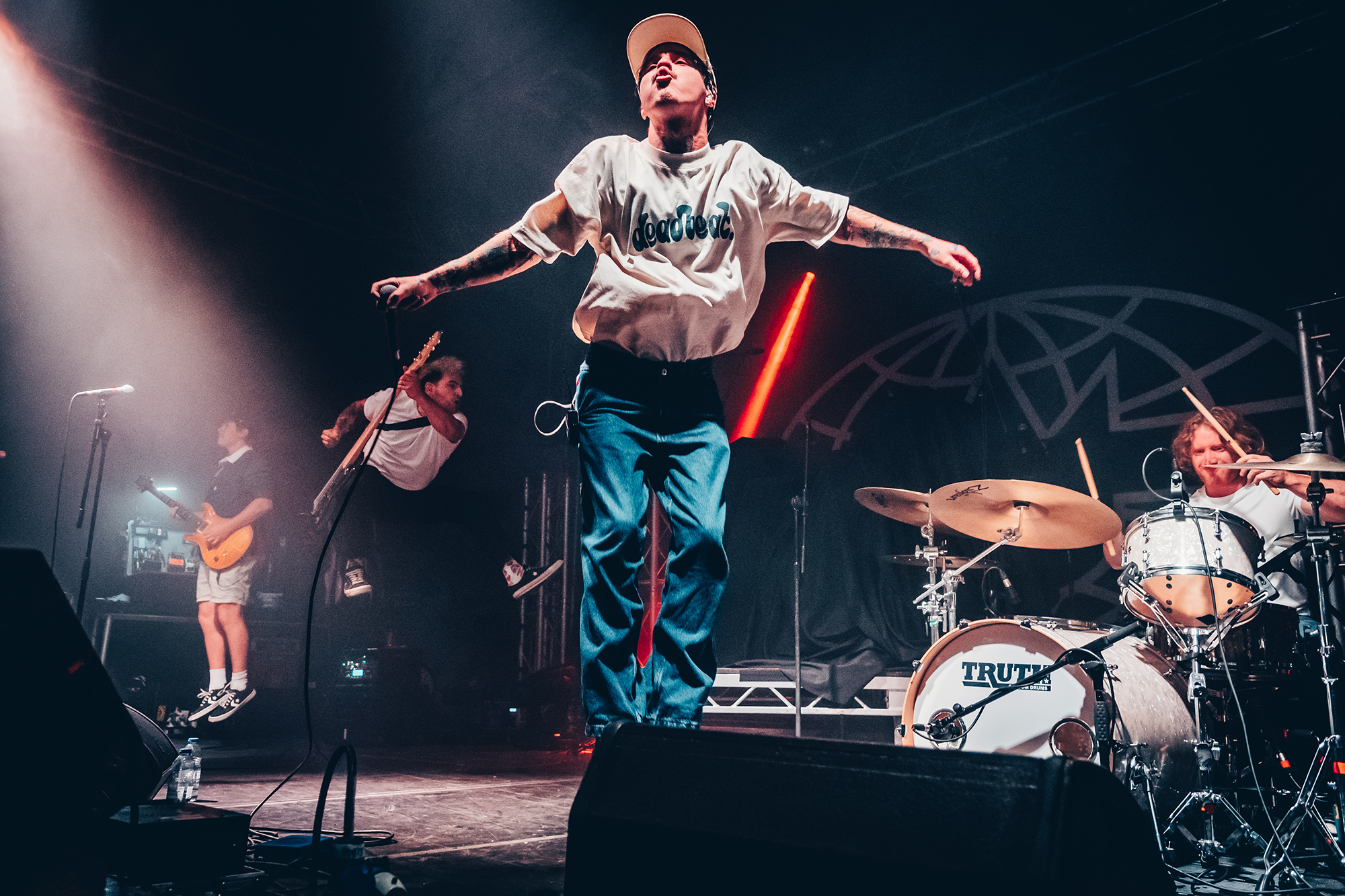 Luckily, Cleveland punks HEART ATTACK MAN bound onto the stage with nervous energy to spare for their first-ever show outside of North America. Rocking a Dimebag Darrel guitar complete with lightning bolt livery, Eric Egan is the perfect frontman for the band’s irreverent brand of pop-punk. The band waste no time, kicking into their furious anthem Puke off their 2021 EP Thoughts & Prayerz, which culminates in the huge chant of “you make me want to fucking puke!” – it might seem juvenile but the crowd laps it up.
