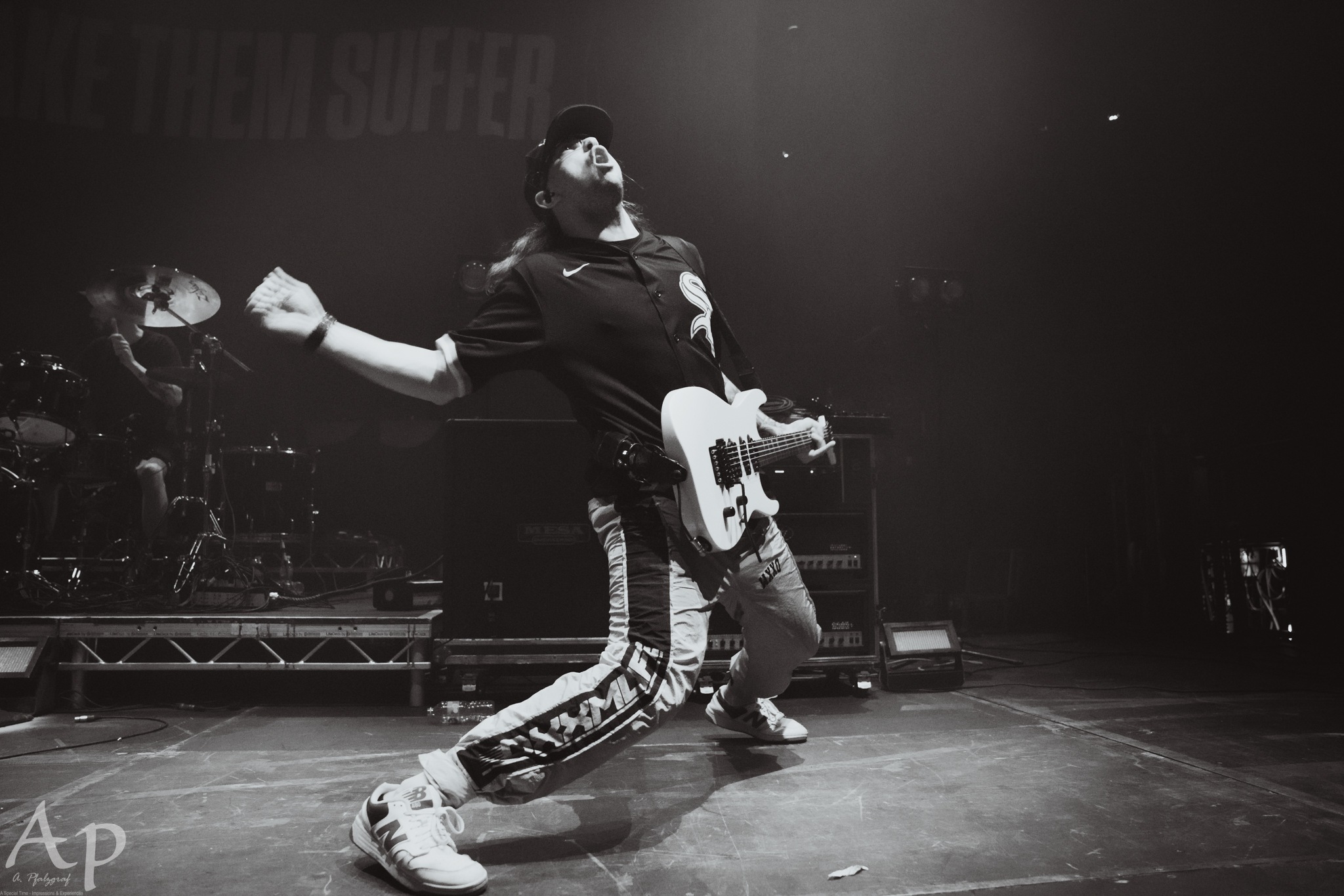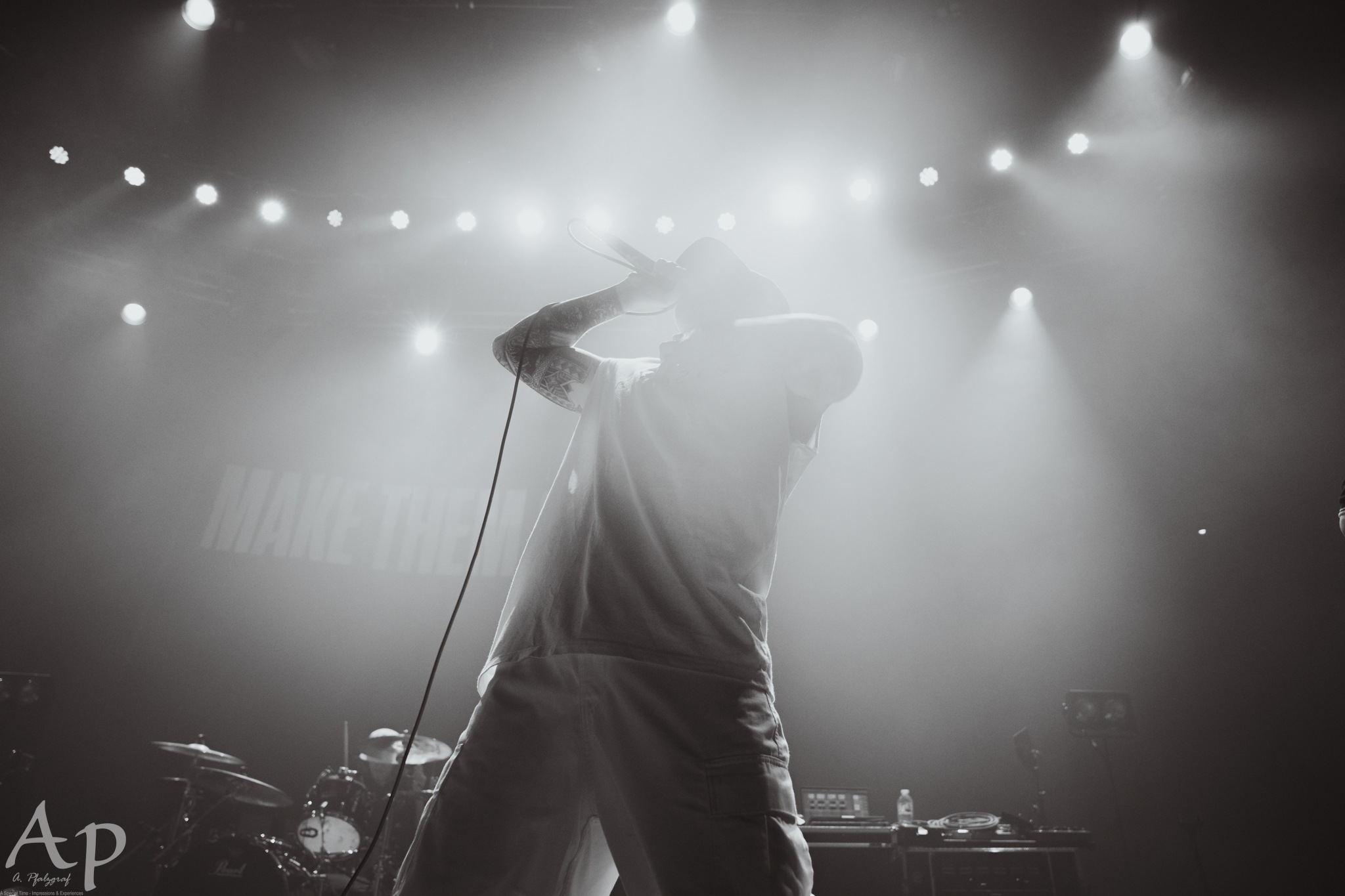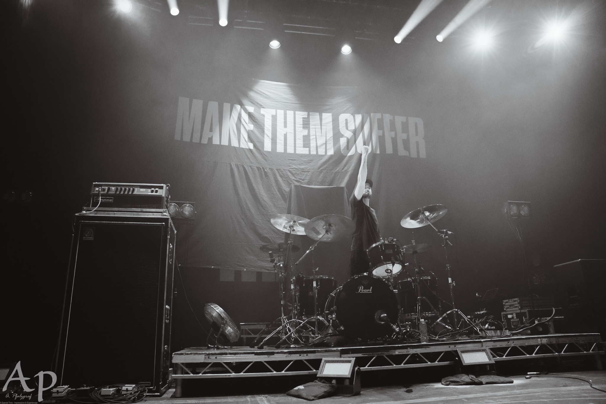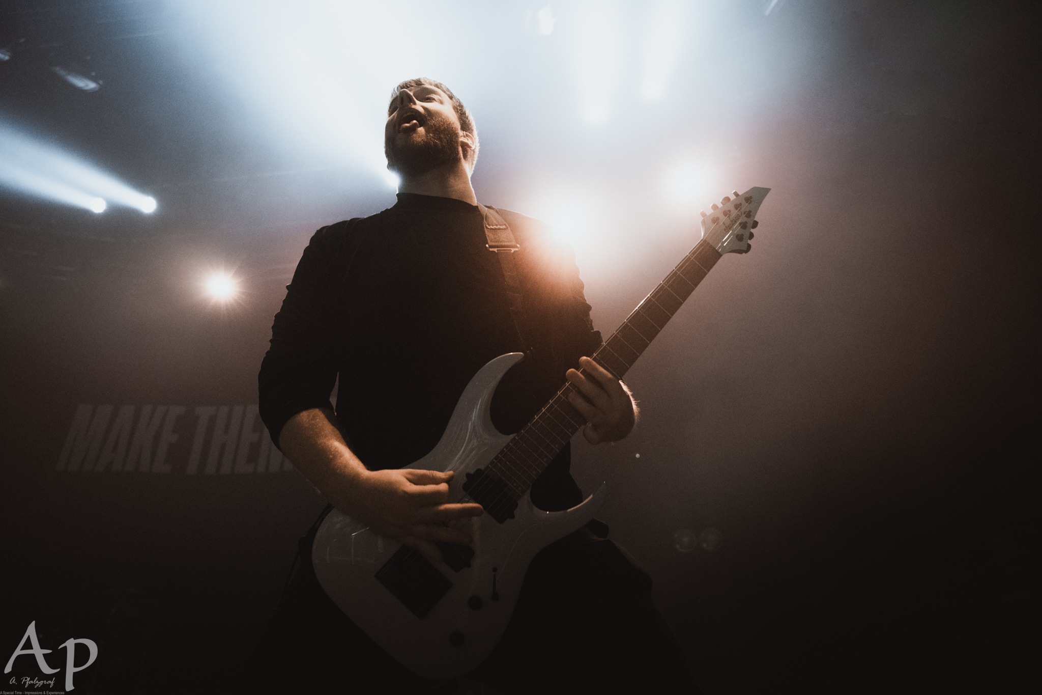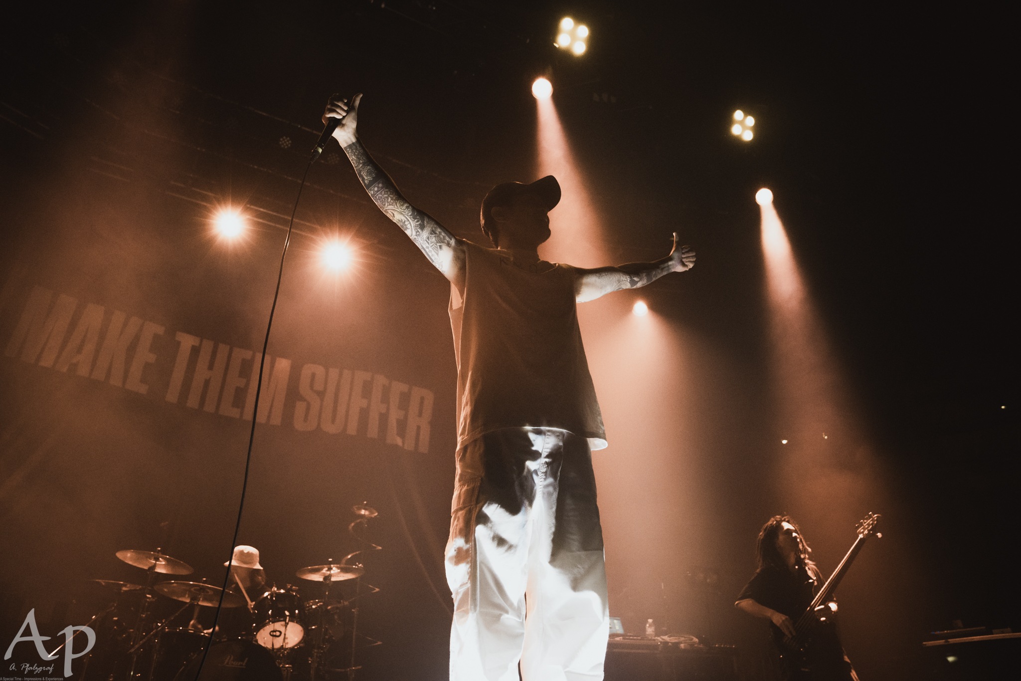 Main support MAKE THEM SUFFER aim to prove to The Roundhouse why the Aussie scene is regarded by many as a hotbed of modern metalcore. Opening with a searing Ghost Of Me, its barrage of drums is over loud, though new crooner Alex Reade‘s chorus takes flight and redeems a rough start. The crowd go even harder for them, crowd surfers a near constant sight during Bones and a cataclysmic Hollowed Heart. Regular drummer Jordan Mather isn’t with them today, as they admit he’d just got off a 20-hour flight and felt he wouldn’t be up for it, which vocalist Sean Harmanis shows solidarity with by getting the crowd to boo him roundly in a moment of light-heartedness amidst the bludgeoning. The biggest issue isn’t one unique to them; there’s been a less than stellar mix all night so far, the drums for MAKE THEM SUFFER in particular being a sticking point as they often overpower the others, especially when there’s heavy double kick or rapid snare passages. It’s frustrating to see a band that are this tight as a unit not reach their potential through no fault of their own, but it doesn’t stop the crowd adoring every minute.Â