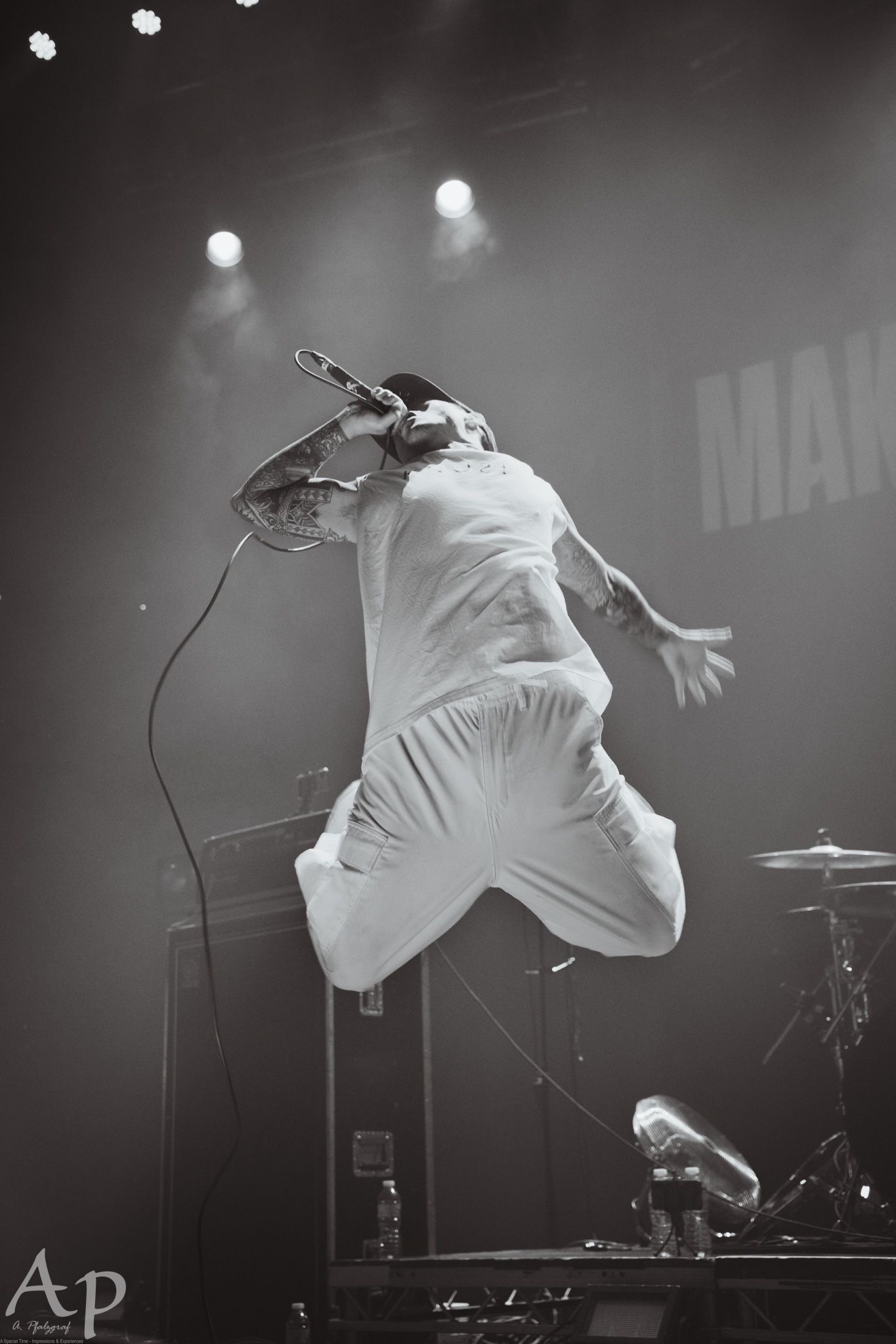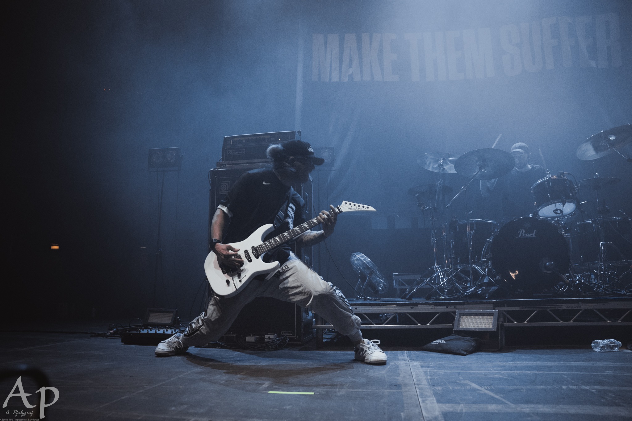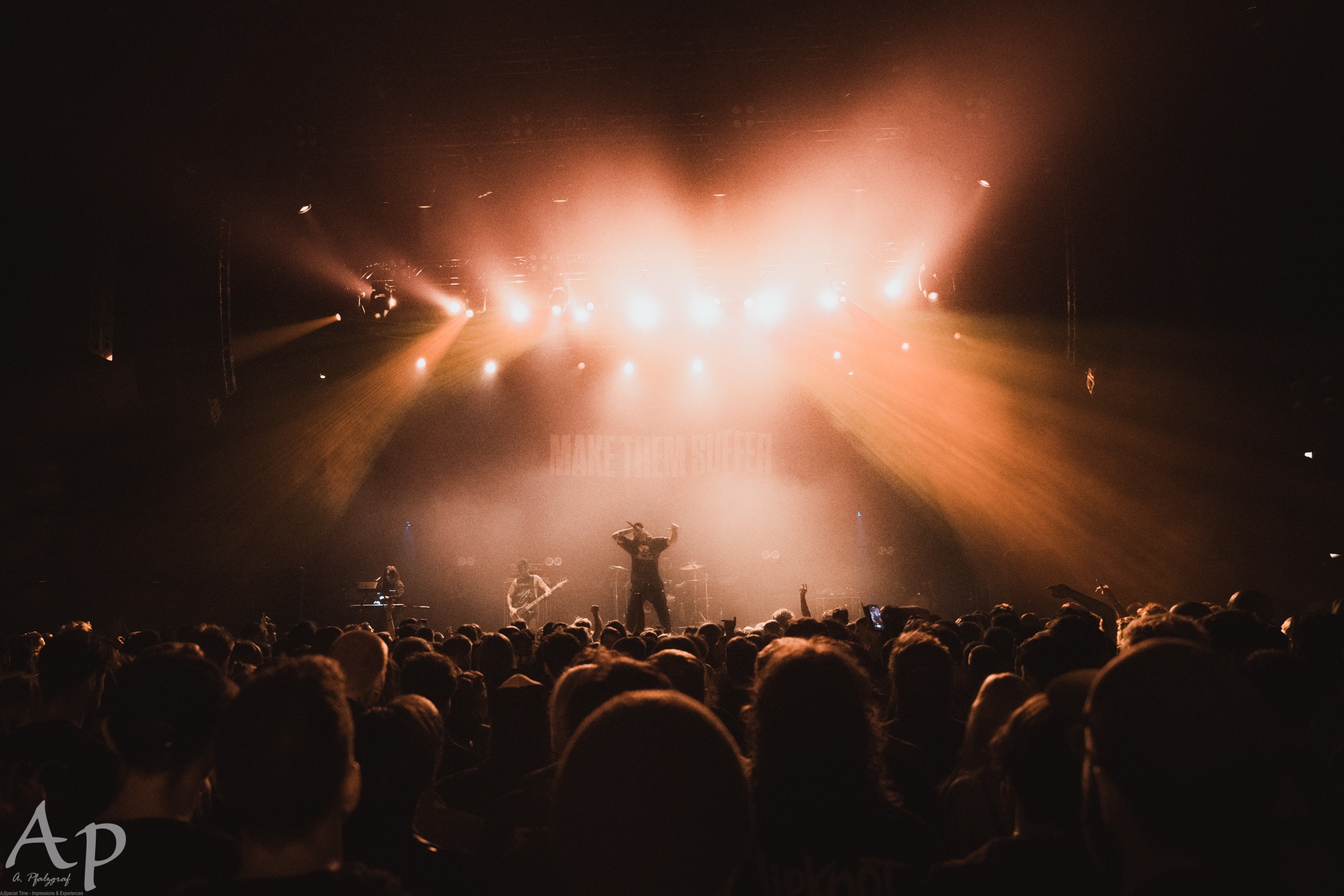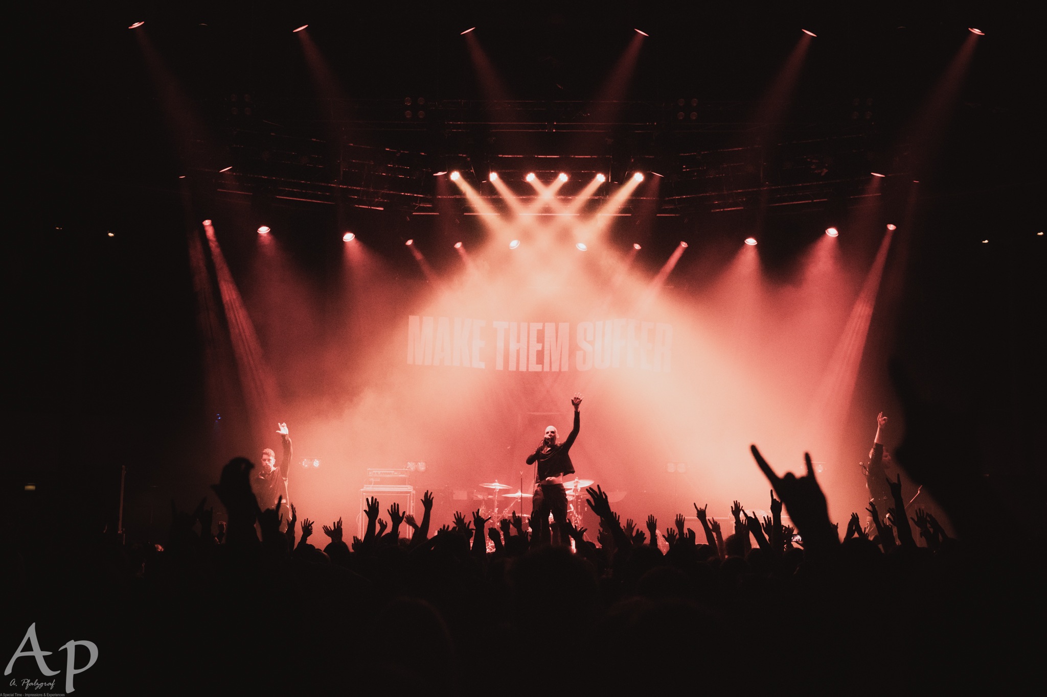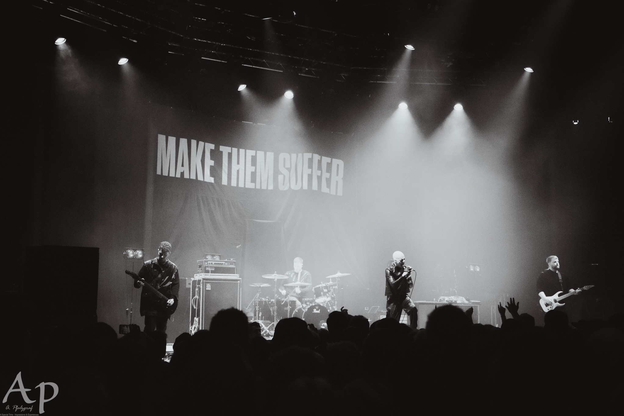 Main support MAKE THEM SUFFER aim to prove to The Roundhouse why the Aussie scene is regarded by many as a hotbed of modern metalcore. Opening with a searing Ghost Of Me, its barrage of drums is over loud, though new crooner Alex Reade‘s chorus takes flight and redeems a rough start. The crowd go even harder for them, crowd surfers a near constant sight during Bones and a cataclysmic Hollowed Heart. Regular drummer Jordan Mather isn’t with them today, as they admit he’d just got off a 20-hour flight and felt he wouldn’t be up for it, which vocalist Sean Harmanis shows solidarity with by getting the crowd to boo him roundly in a moment of light-heartedness amidst the bludgeoning. The biggest issue isn’t one unique to them; there’s been a less than stellar mix all night so far, the drums for MAKE THEM SUFFER in particular being a sticking point as they often overpower the others, especially when there’s heavy double kick or rapid snare passages. It’s frustrating to see a band that are this tight as a unit not reach their potential through no fault of their own, but it doesn’t stop the crowd adoring every minute.Â