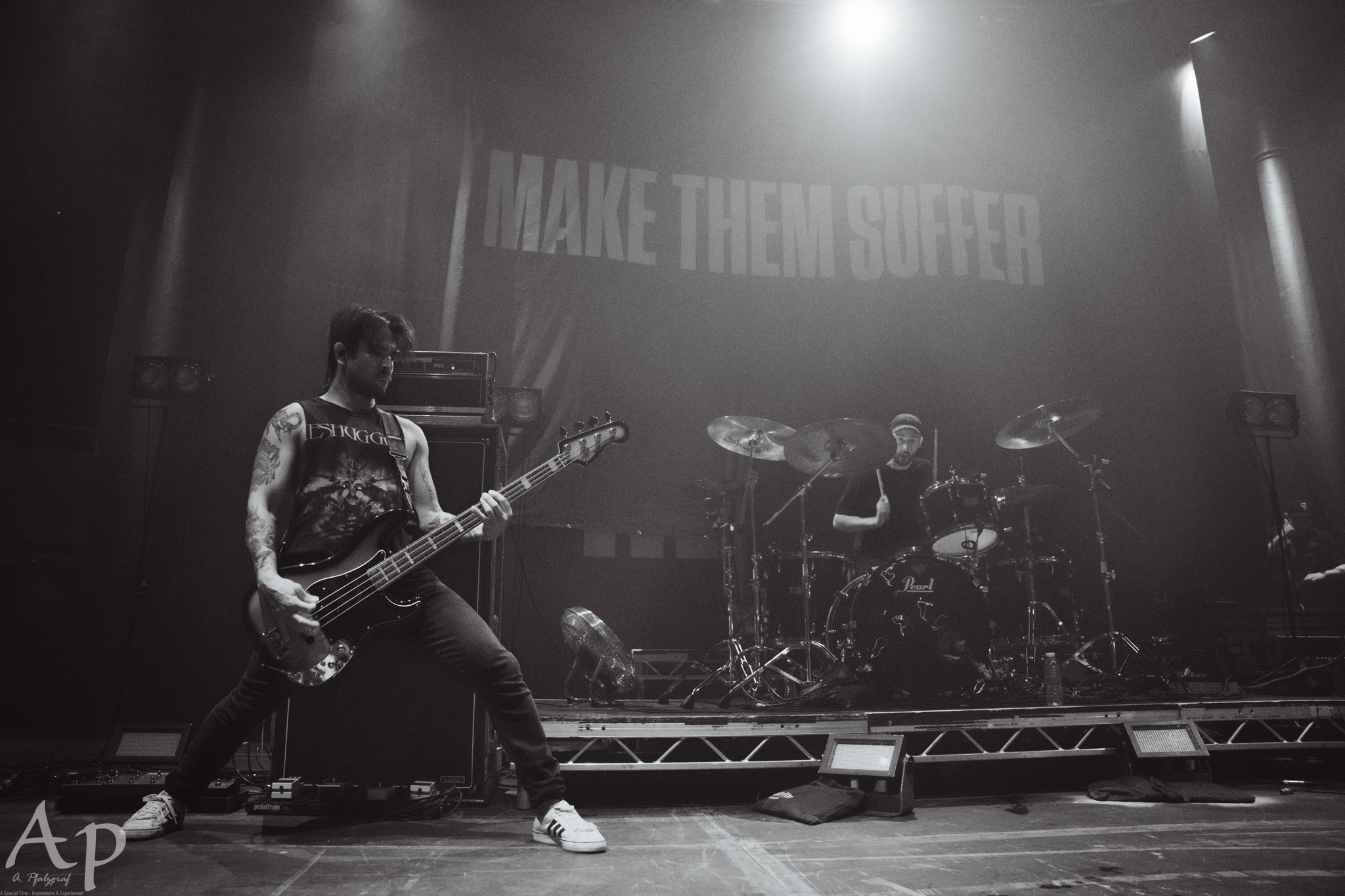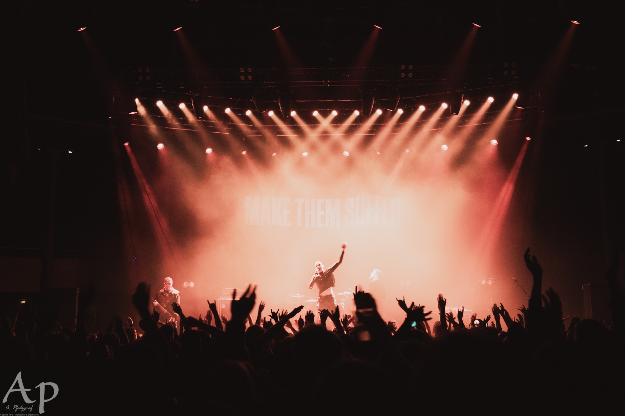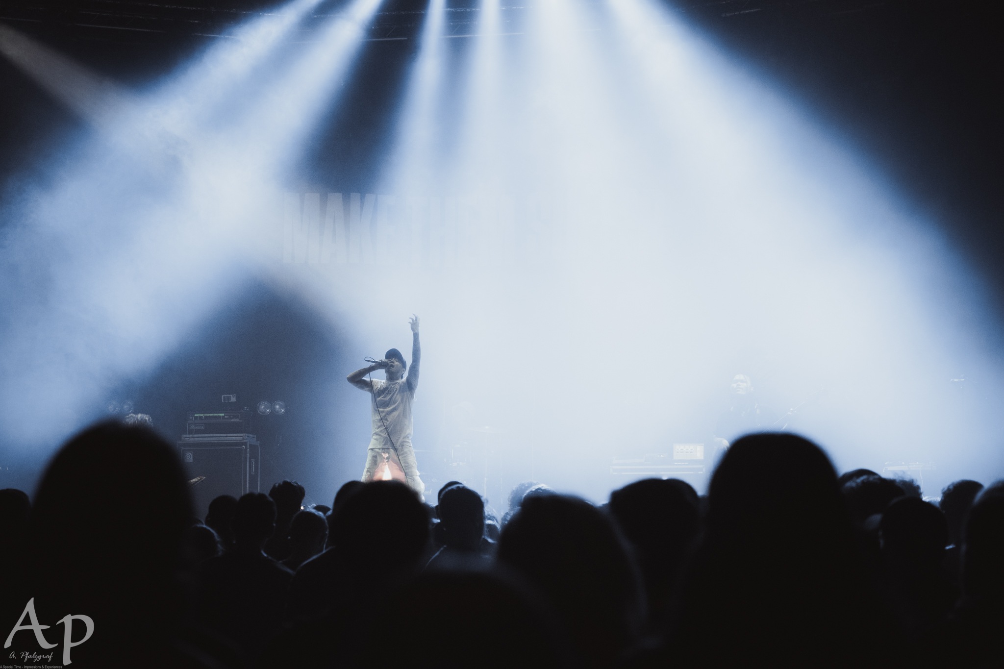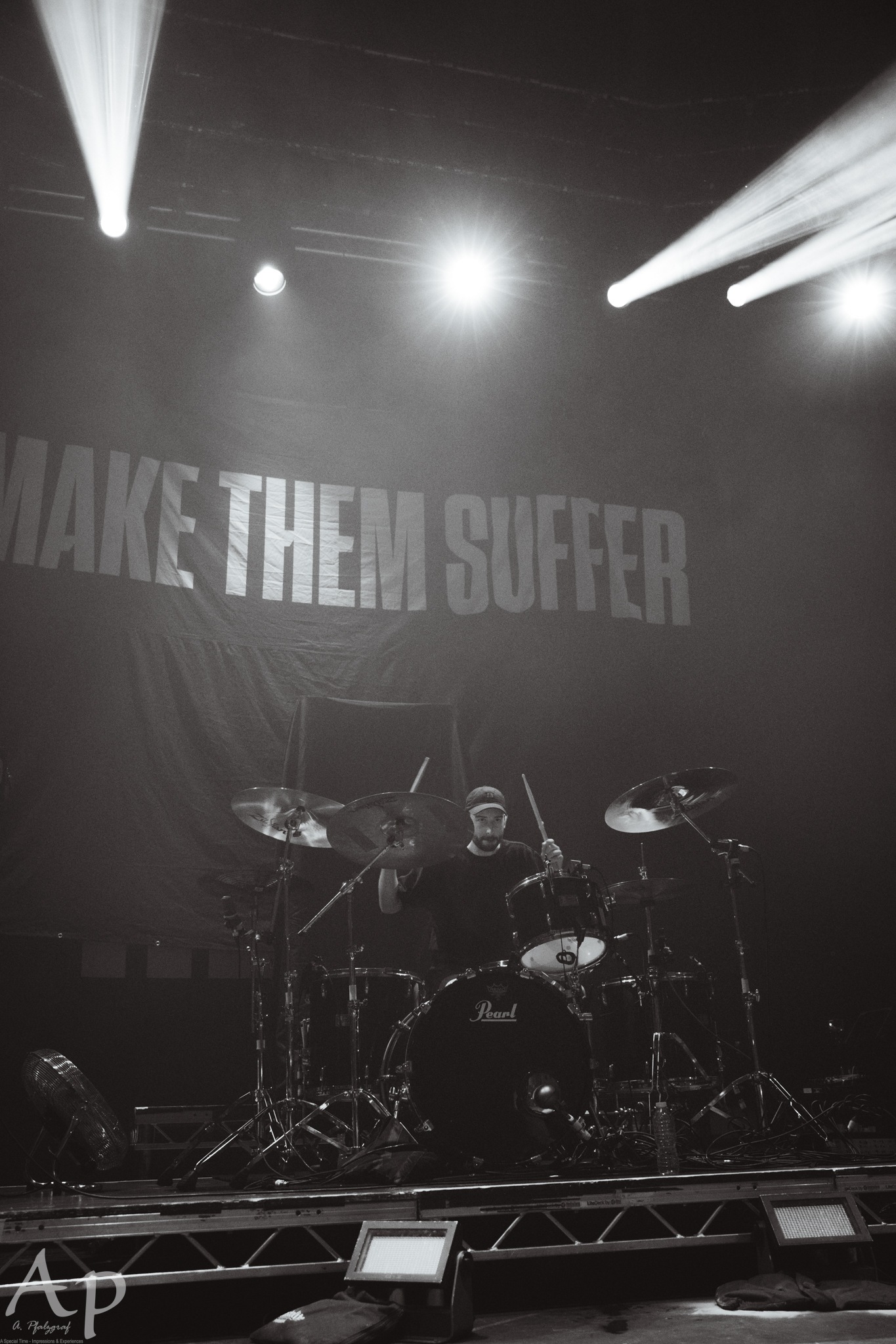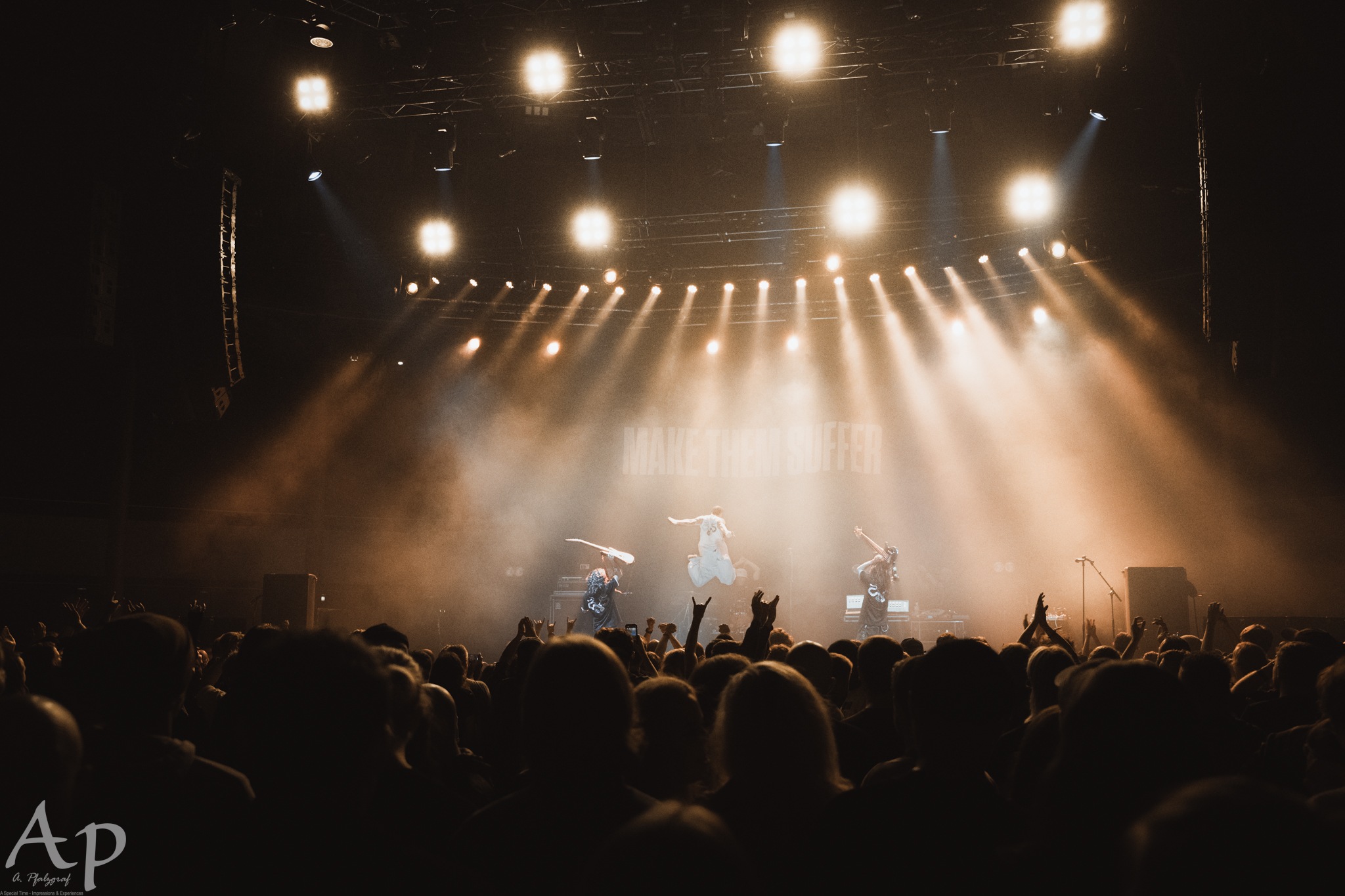 Main support MAKE THEM SUFFER aim to prove to The Roundhouse why the Aussie scene is regarded by many as a hotbed of modern metalcore. Opening with a searing Ghost Of Me, its barrage of drums is over loud, though new crooner Alex Reade‘s chorus takes flight and redeems a rough start. The crowd go even harder for them, crowd surfers a near constant sight during Bones and a cataclysmic Hollowed Heart. Regular drummer Jordan Mather isn’t with them today, as they admit he’d just got off a 20-hour flight and felt he wouldn’t be up for it, which vocalist Sean Harmanis shows solidarity with by getting the crowd to boo him roundly in a moment of light-heartedness amidst the bludgeoning. The biggest issue isn’t one unique to them; there’s been a less than stellar mix all night so far, the drums for MAKE THEM SUFFER in particular being a sticking point as they often overpower the others, especially when there’s heavy double kick or rapid snare passages. It’s frustrating to see a band that are this tight as a unit not reach their potential through no fault of their own, but it doesn’t stop the crowd adoring every minute.Â