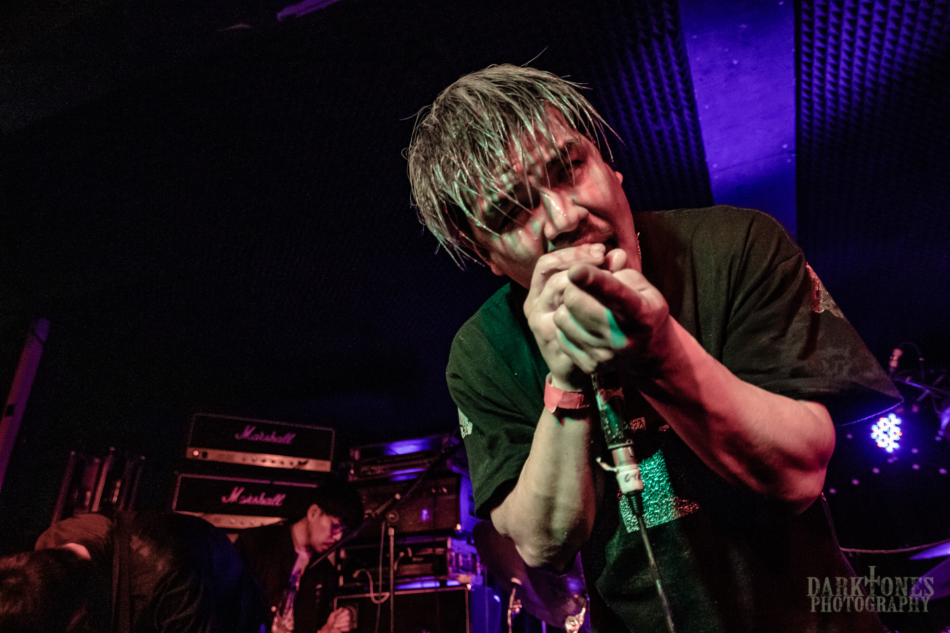 By contrast, Canadian crust-punks BAPTISTS are a little more straightforward, although in the context of their overall sound that’s used very loosely. They also suffer tech issues, bassist Shawn Hawryluk commenting that “what can go wrong has gone wrong”, but their rabid set is akin to several quick jabs by Anthony Joshua, each one packed with furious savagery. They are a perfect example of DIY punk done brilliantly, emitting a real sense that they want to plough as much as they can into their stage time before defiantly walking off with two middle fingers high in the air. There’s a lot of crowd appreciation too – this isn’t the night for moshing, but from the front to the back there are heads banging, bodies moving and a rousing appreciation for every song that passes. Vocalist Andrew Drury is on fine form, at times making the vein in his neck bulge so much you get genuinely concerned it might break through and shower everyone with blood. Forty minutes on stage gives time for a good dozen songs or so, and whilst BAPTISTS are very much the rebellious child of the three on tour, they’ve gone and killed it without question.