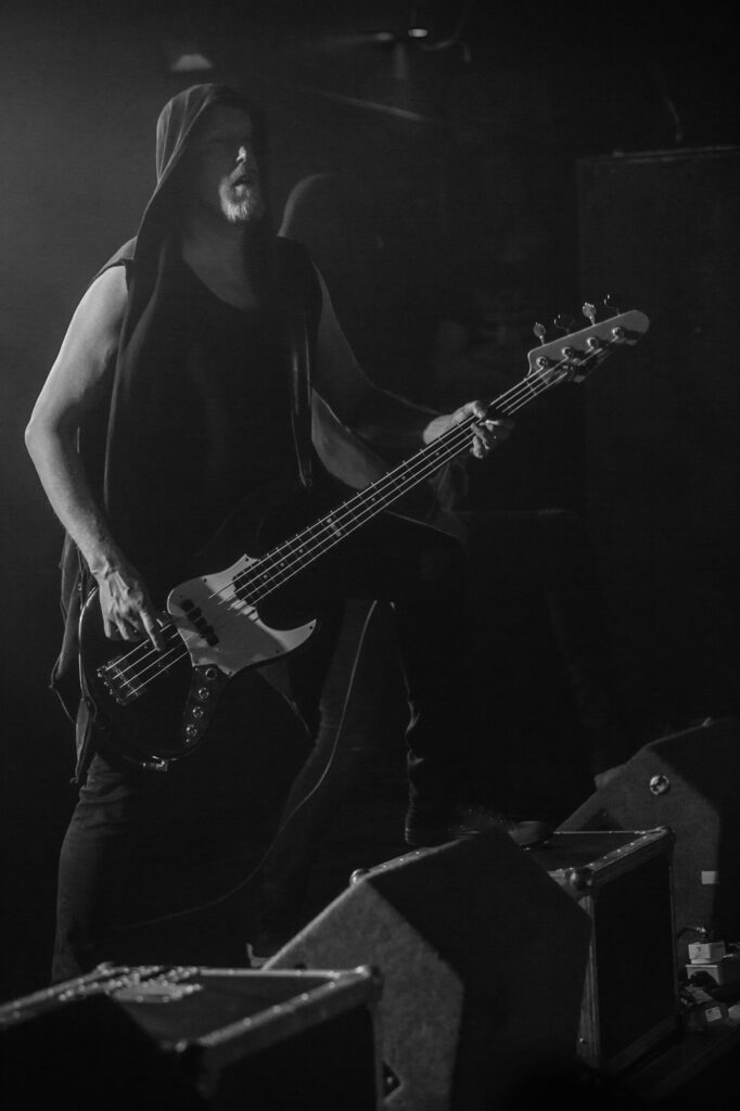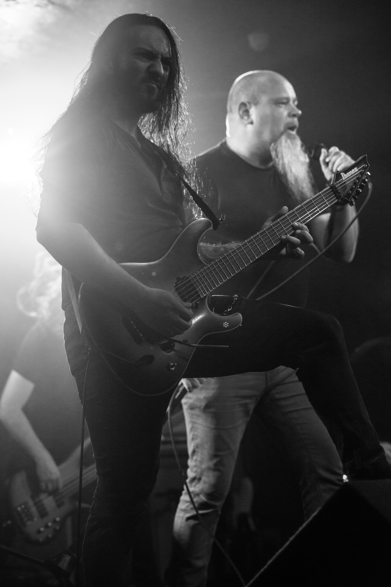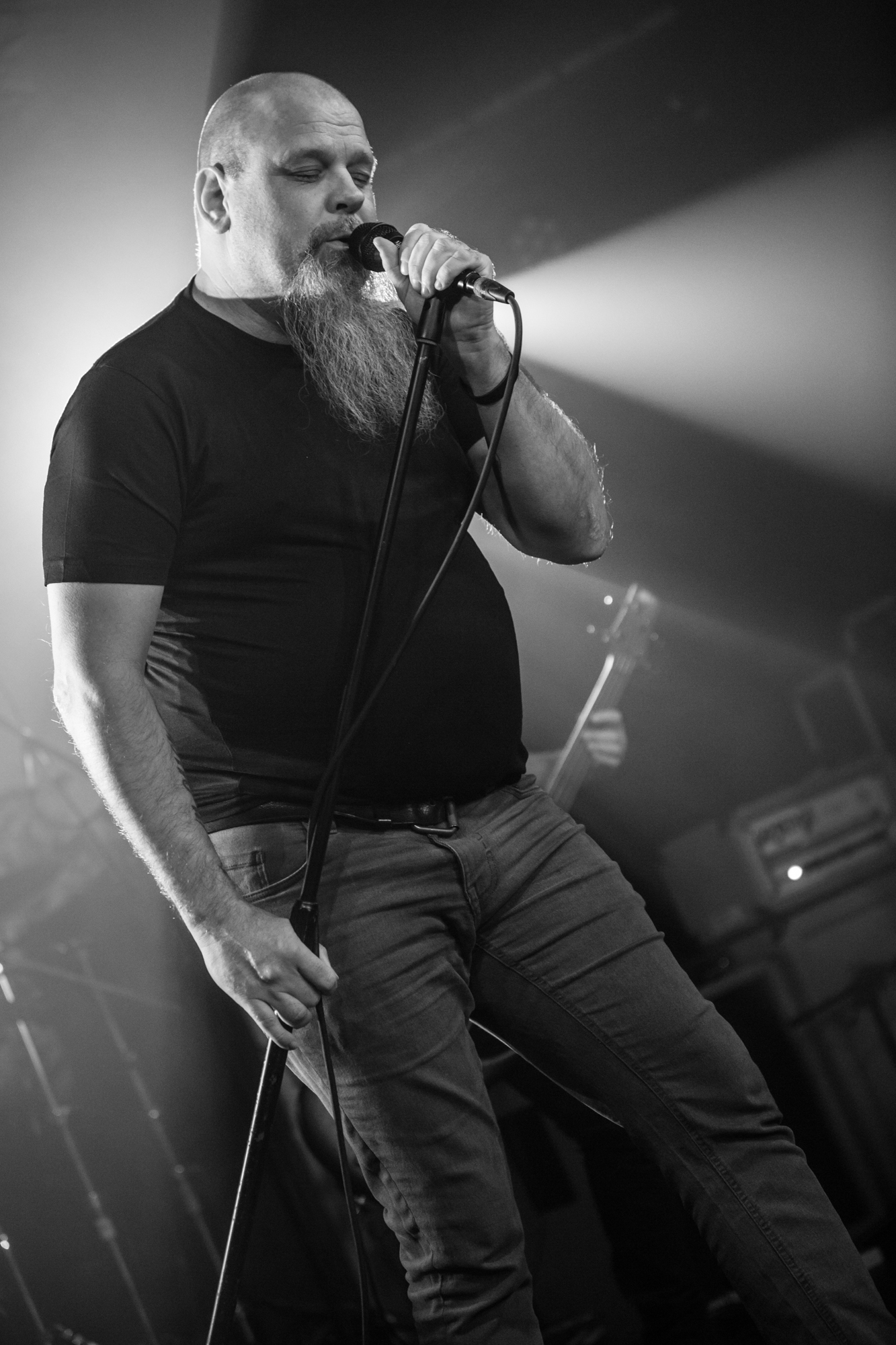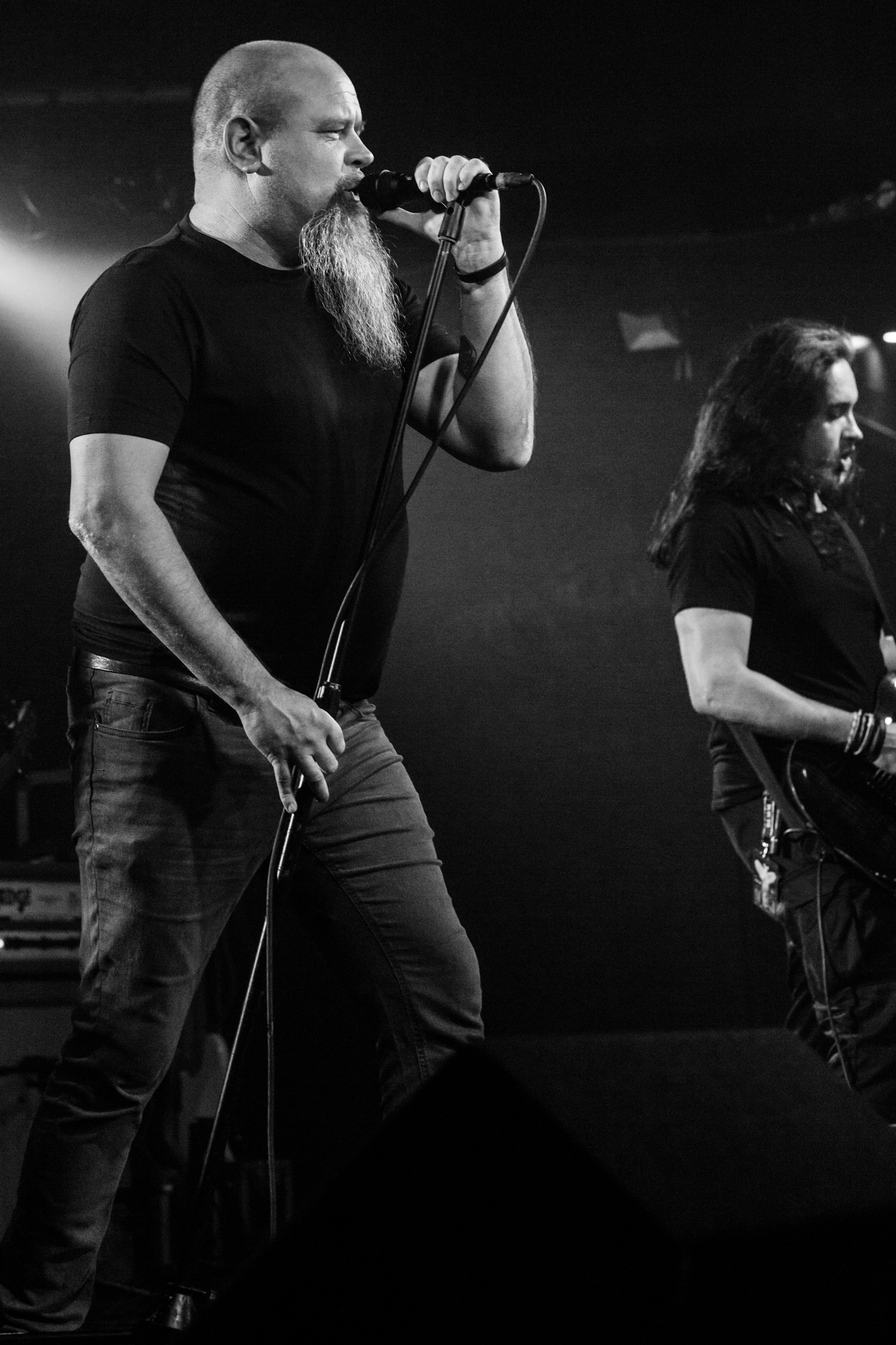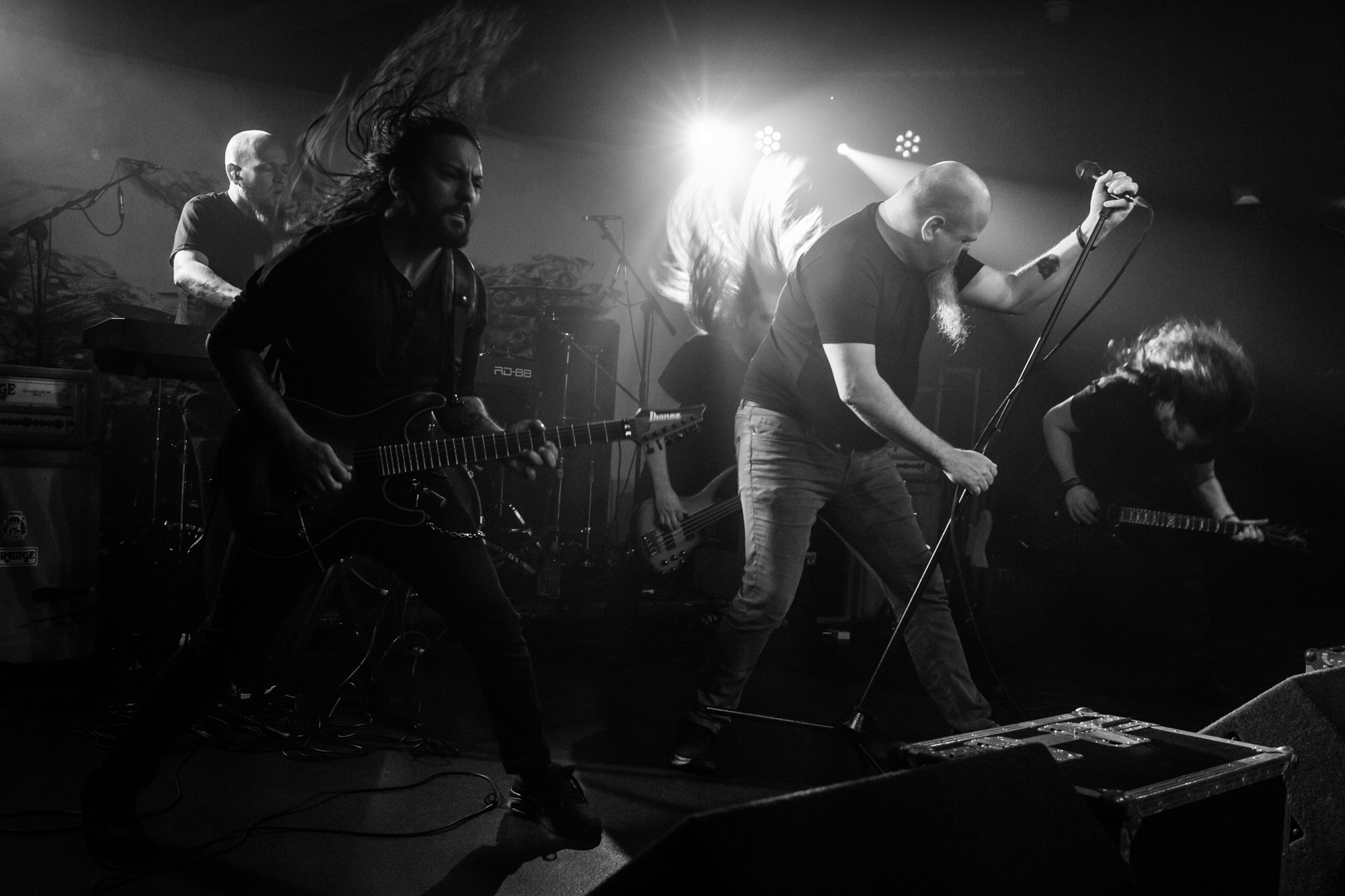 Veteran death/doom acolytes SATURNUS are perfectly matched for this lineup. In their 35-year history, this is the Danes’ debut voyage to Scotland. Understandably, a lot of the congregation present bought their ticket on SATURNUS alone, and the venue is as full as it gets tonight when they arrive on stage. The sextet ignites proceedings with the title track from their long-awaited latest album, The Storm Within. Initially, the immense drum sound of Henrik Glass taints the keyboards and guitars, but this is mostly rectified as the set flows on. The song lurches between introspective, clean guitar leads, muscular bass and restrained drums to 2000s-inspired, death-tinged heavy doom. Vocalist Thomas Akim Grønbæk Jensen shifts between agonising doom growls and suitably apathetic low-range singing.