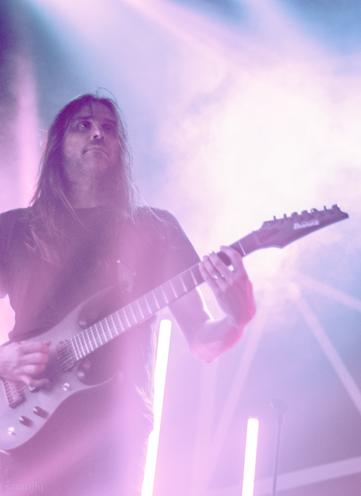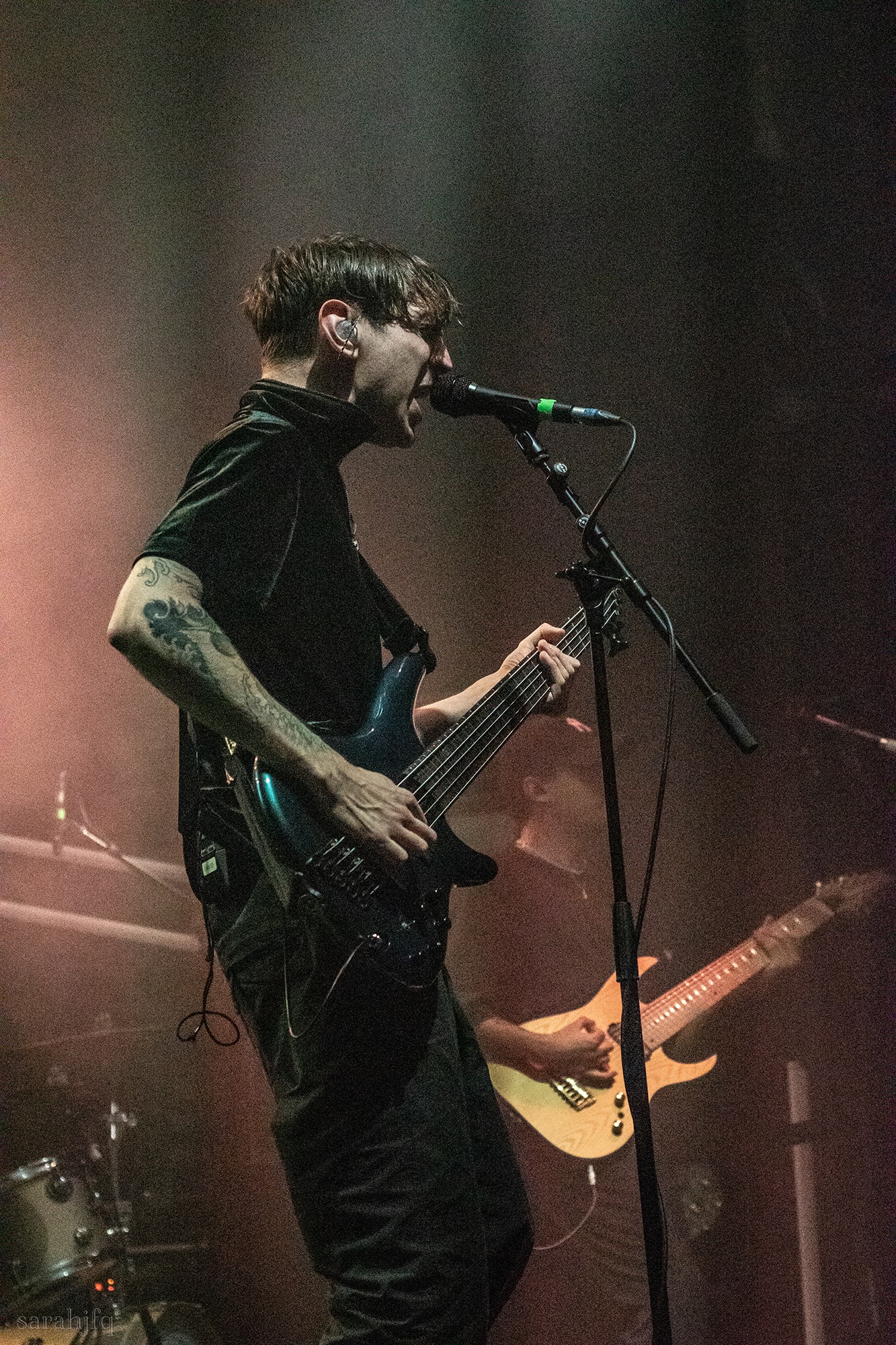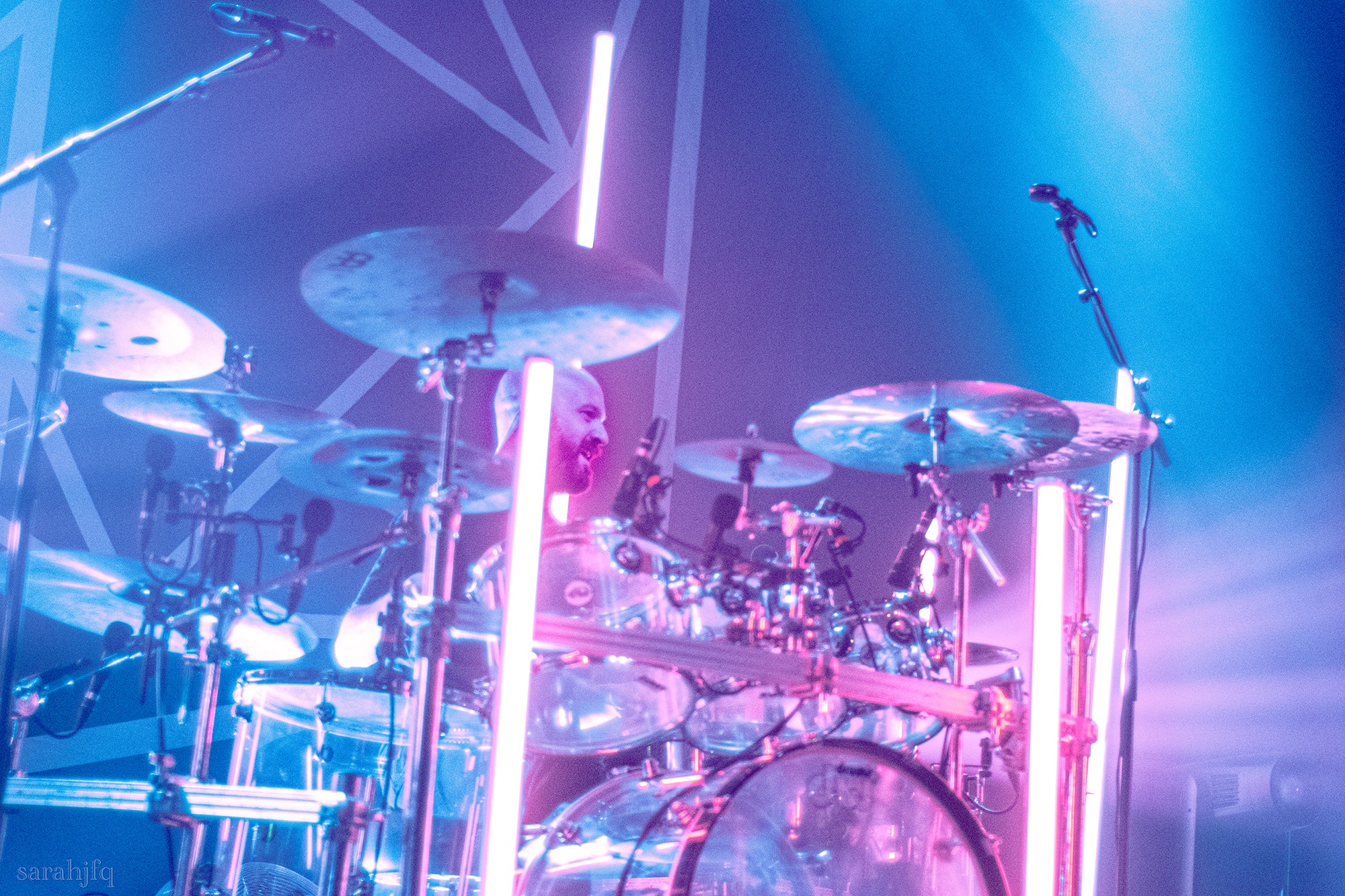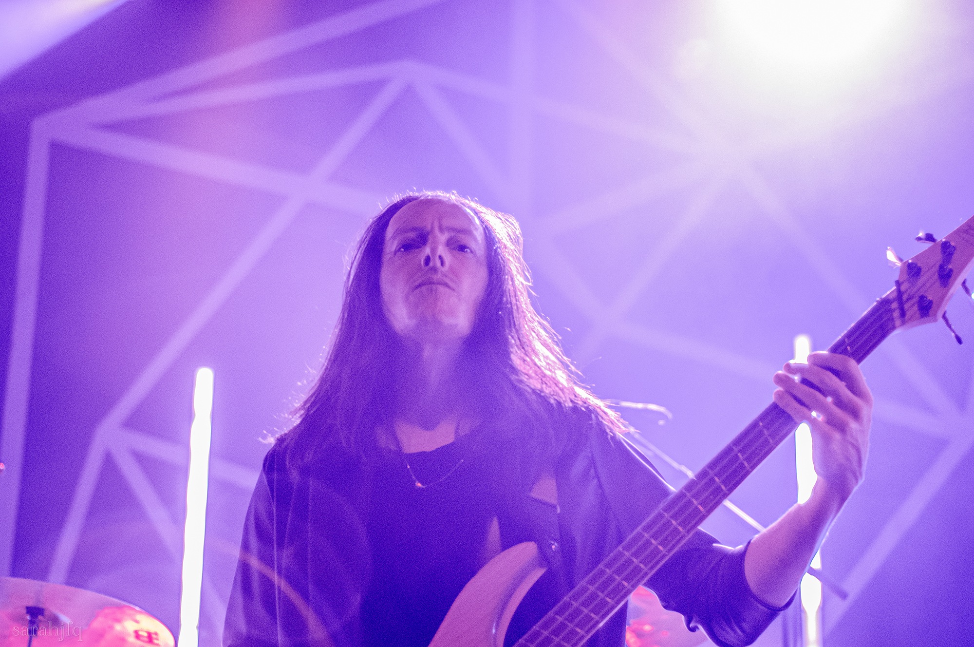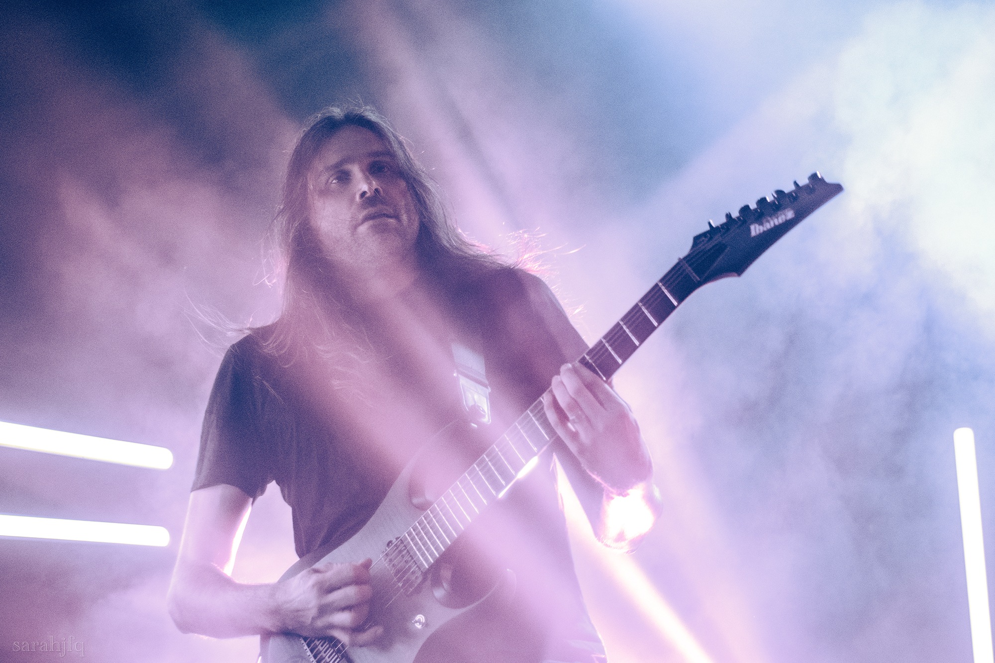 Tompkins movements feel clunky for a moment, almost TikTok dance corny, ever so slightly distracting from the eye catching performance that TESSERACT put on from the get go. Momentarily, angelic backing vocals pierce to the back of the room, and the anthemic chorus kicks in with pyro raining from above, showering the stage in glistening light. There’s moments during the sight that sink into a lull, whether it’s the multiple breaks of darkness that last just a little bit too long or that awkward dancing, but they never fail to grab back attention. Dystopia and Smile stand out when they do exactly that, submitting any wavering eyes of disinterest with their shocking auras.