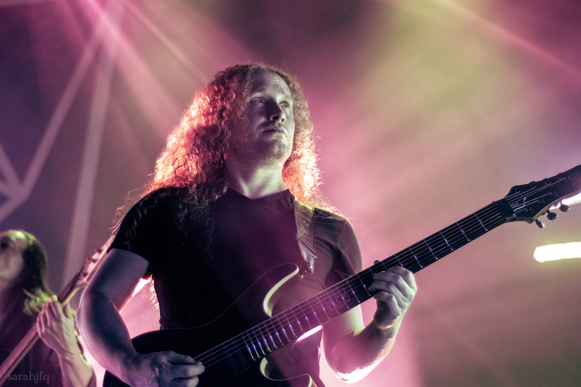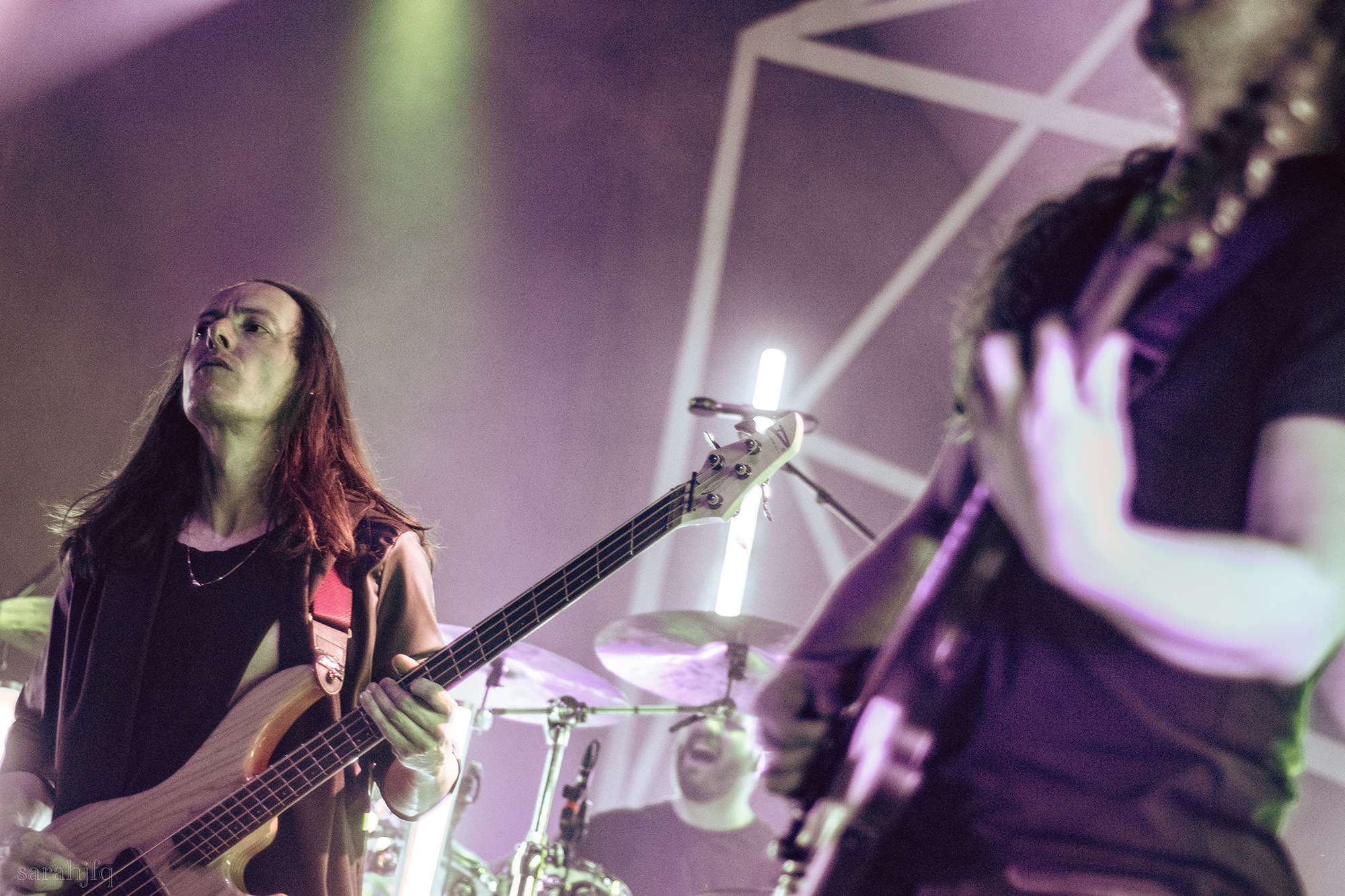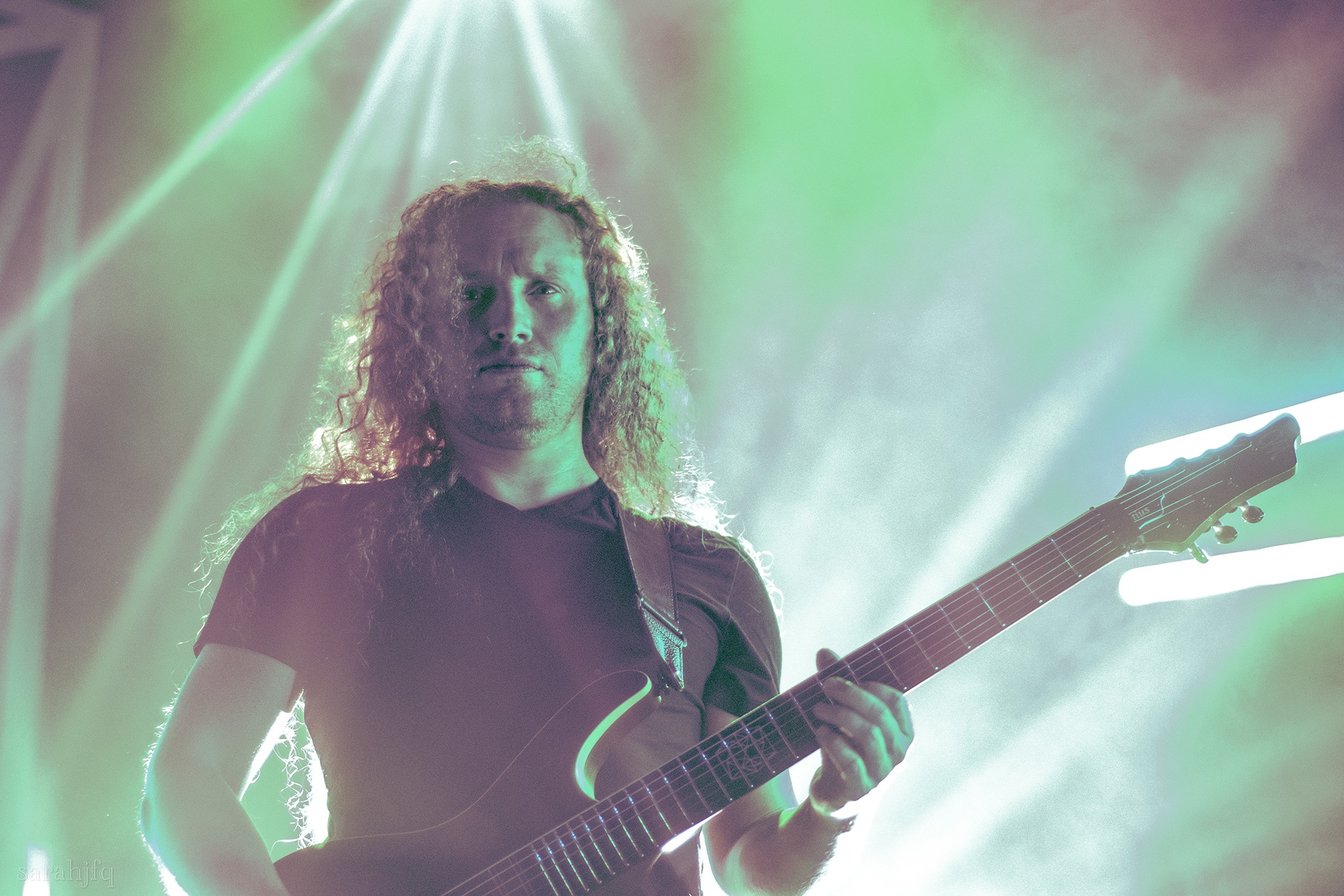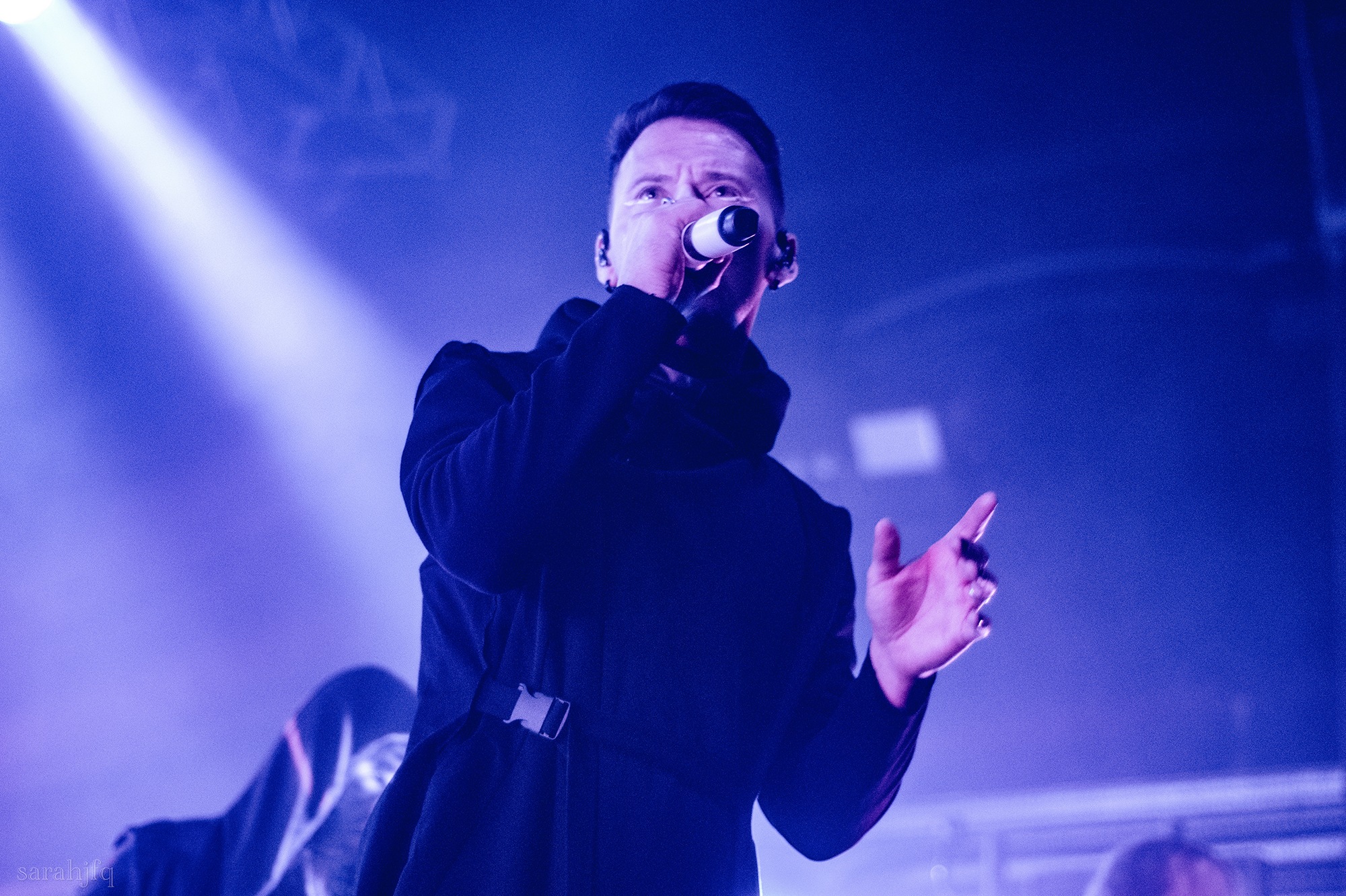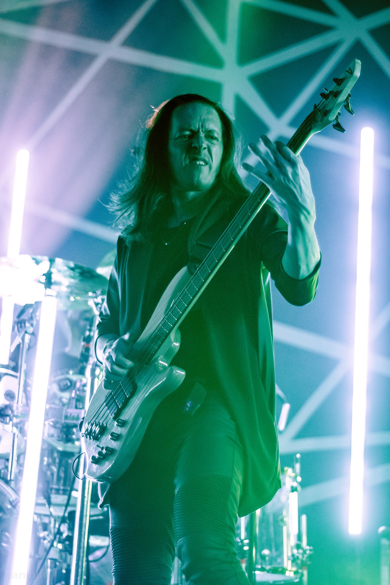 Tompkins movements feel clunky for a moment, almost TikTok dance corny, ever so slightly distracting from the eye catching performance that TESSERACT put on from the get go. Momentarily, angelic backing vocals pierce to the back of the room, and the anthemic chorus kicks in with pyro raining from above, showering the stage in glistening light. There’s moments during the sight that sink into a lull, whether it’s the multiple breaks of darkness that last just a little bit too long or that awkward dancing, but they never fail to grab back attention. Dystopia and Smile stand out when they do exactly that, submitting any wavering eyes of disinterest with their shocking auras.