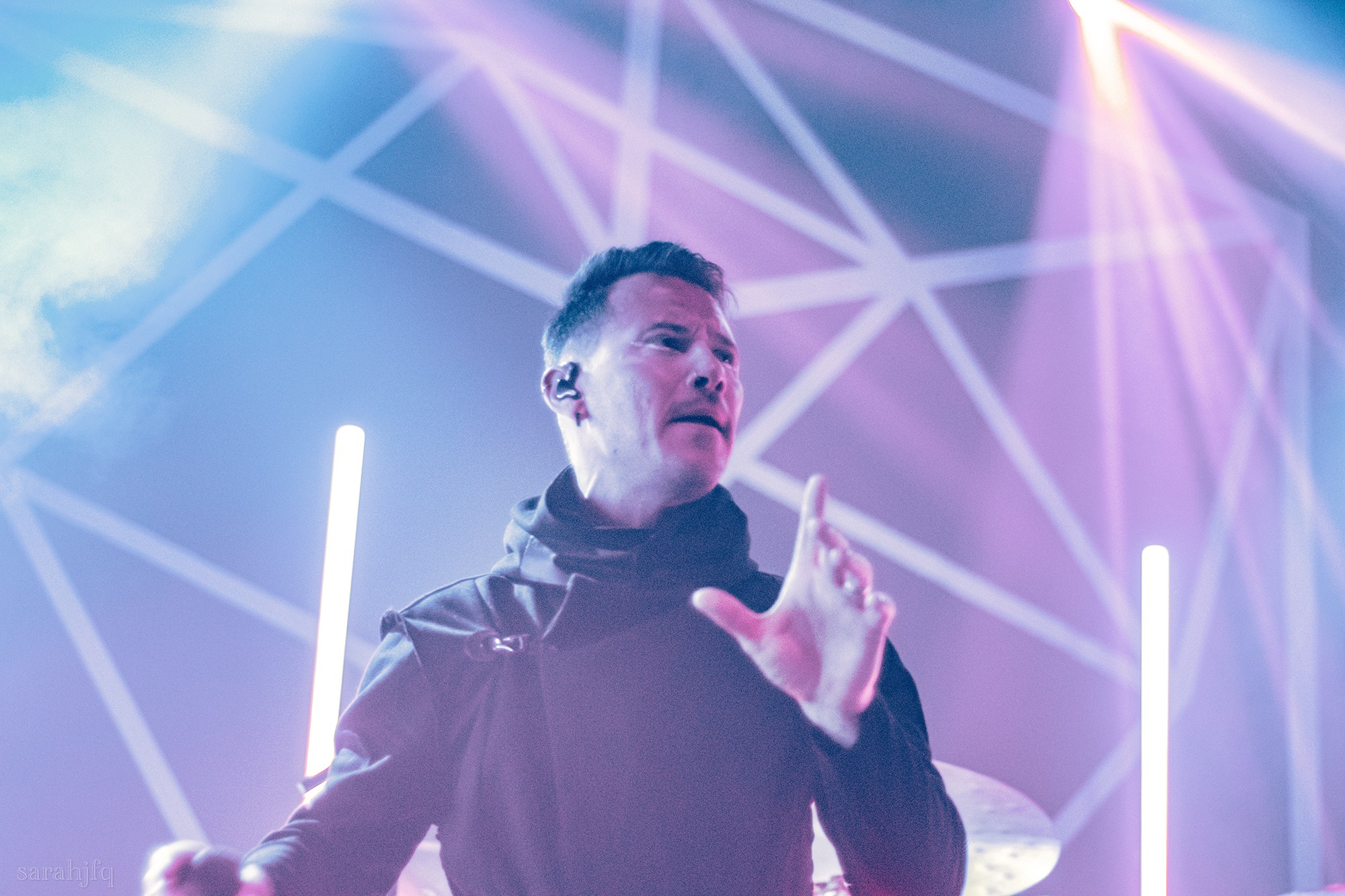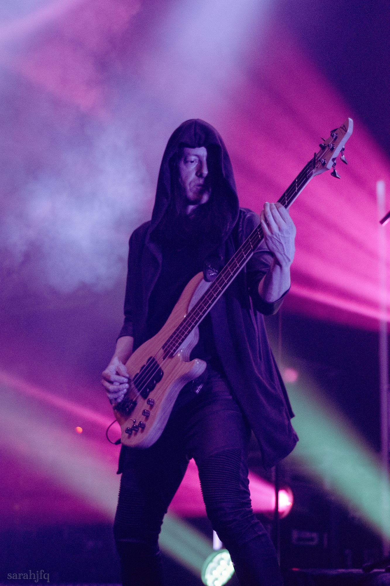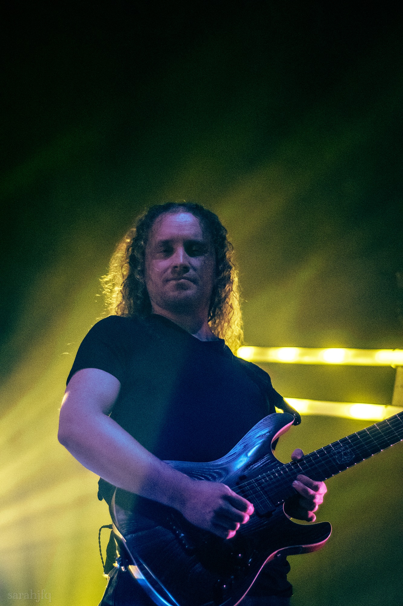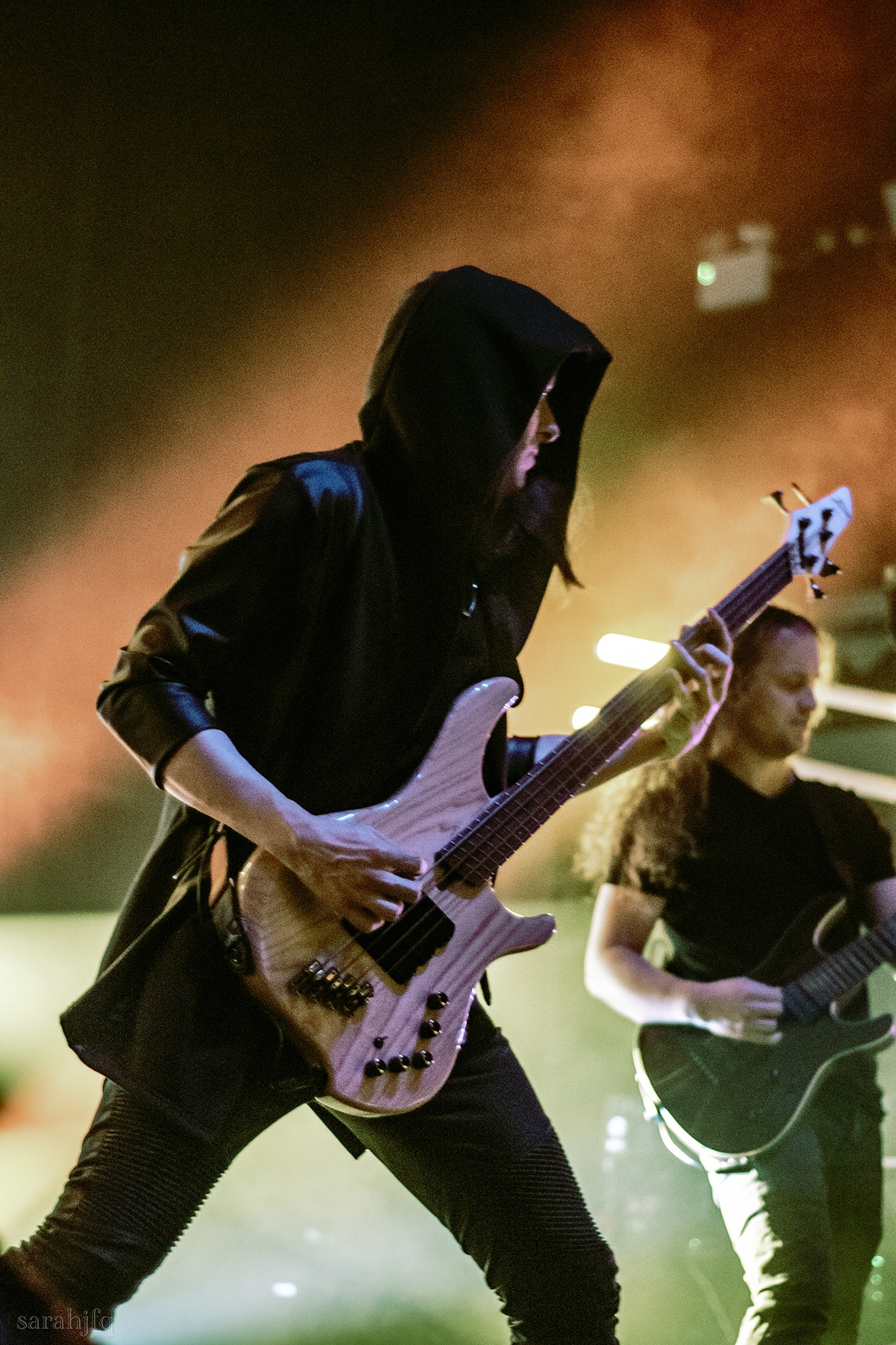 Tompkins movements feel clunky for a moment, almost TikTok dance corny, ever so slightly distracting from the eye catching performance that TESSERACT put on from the get go. Momentarily, angelic backing vocals pierce to the back of the room, and the anthemic chorus kicks in with pyro raining from above, showering the stage in glistening light. There’s moments during the sight that sink into a lull, whether it’s the multiple breaks of darkness that last just a little bit too long or that awkward dancing, but they never fail to grab back attention. Dystopia and Smile stand out when they do exactly that, submitting any wavering eyes of disinterest with their shocking auras.