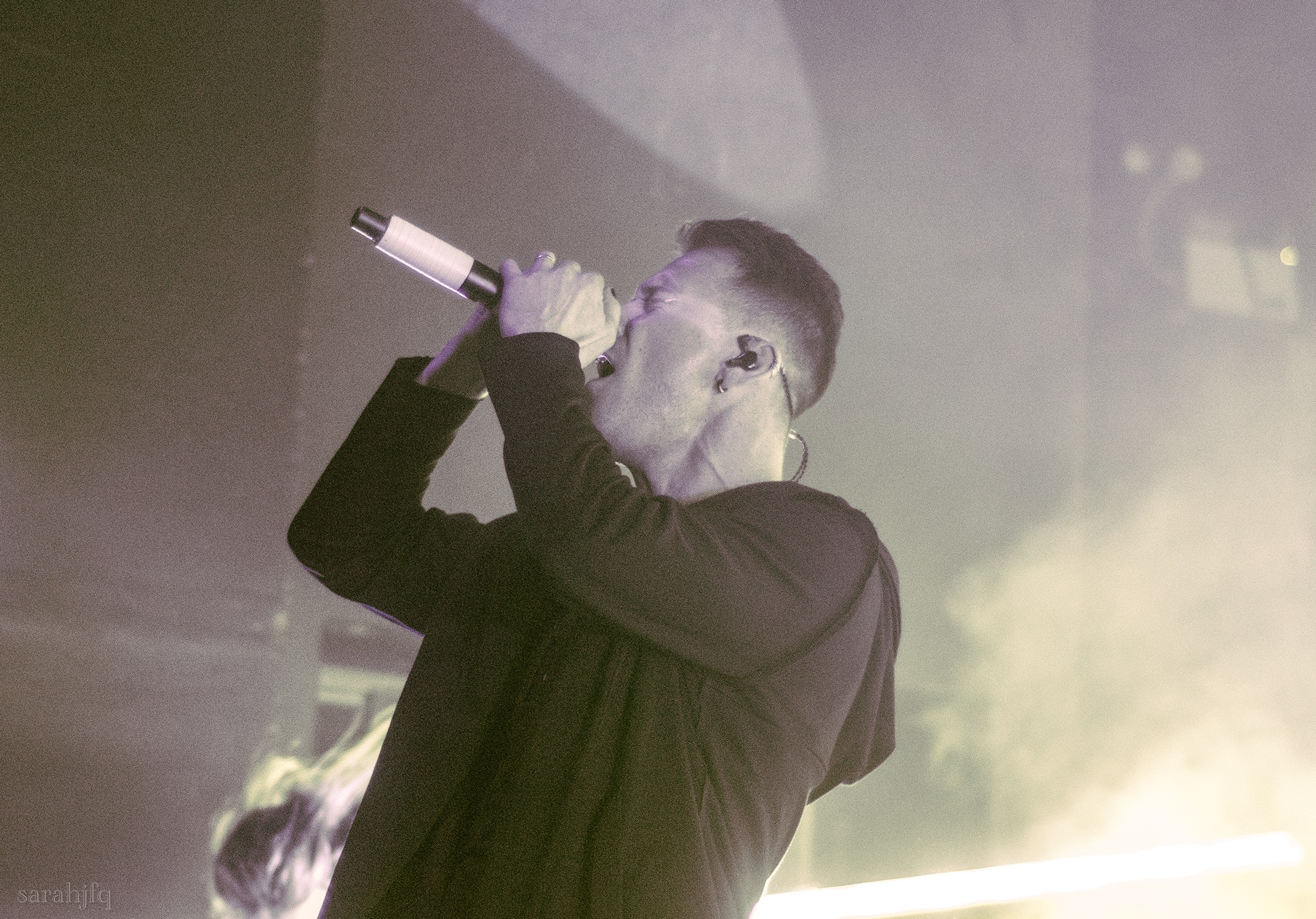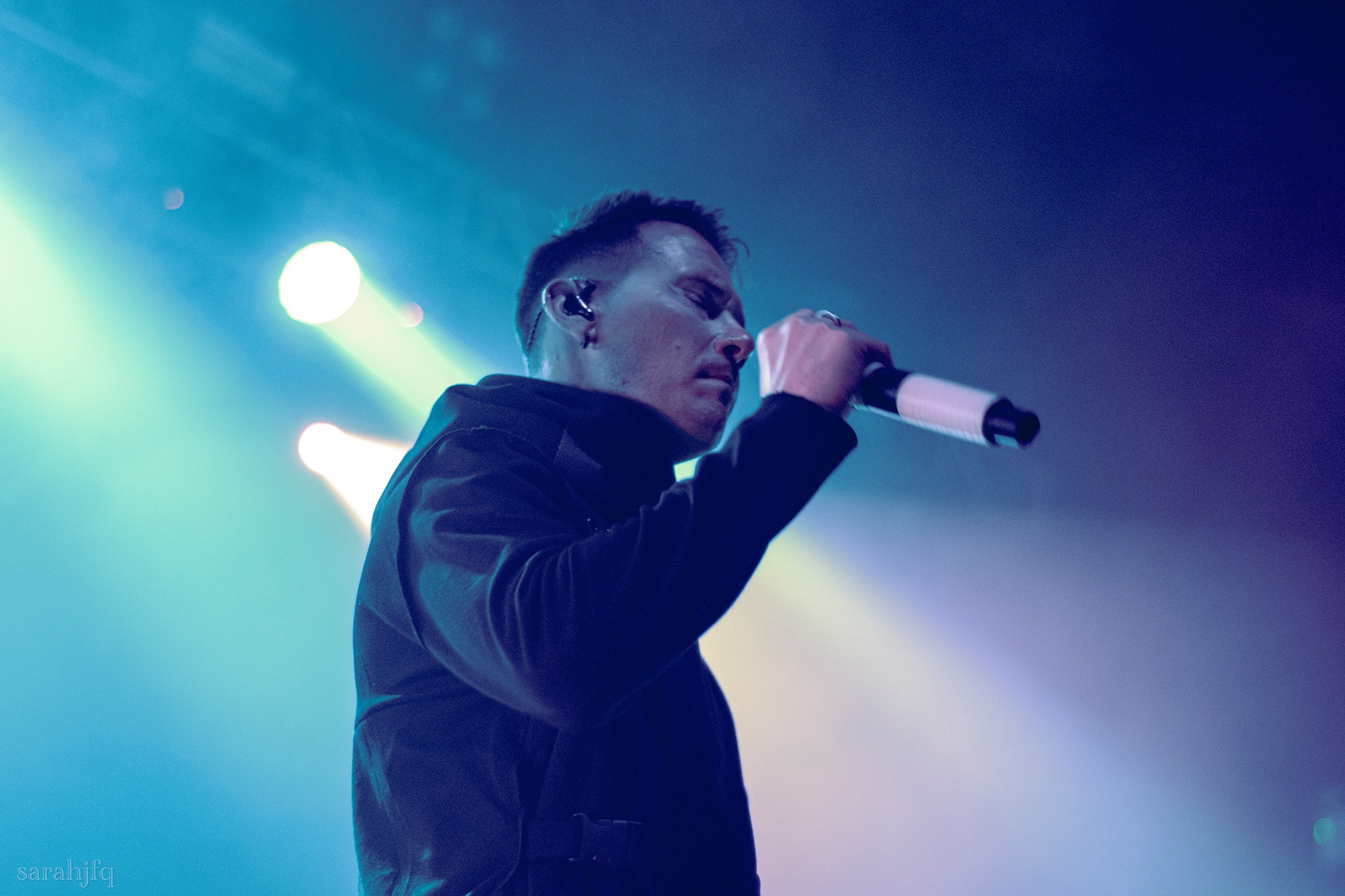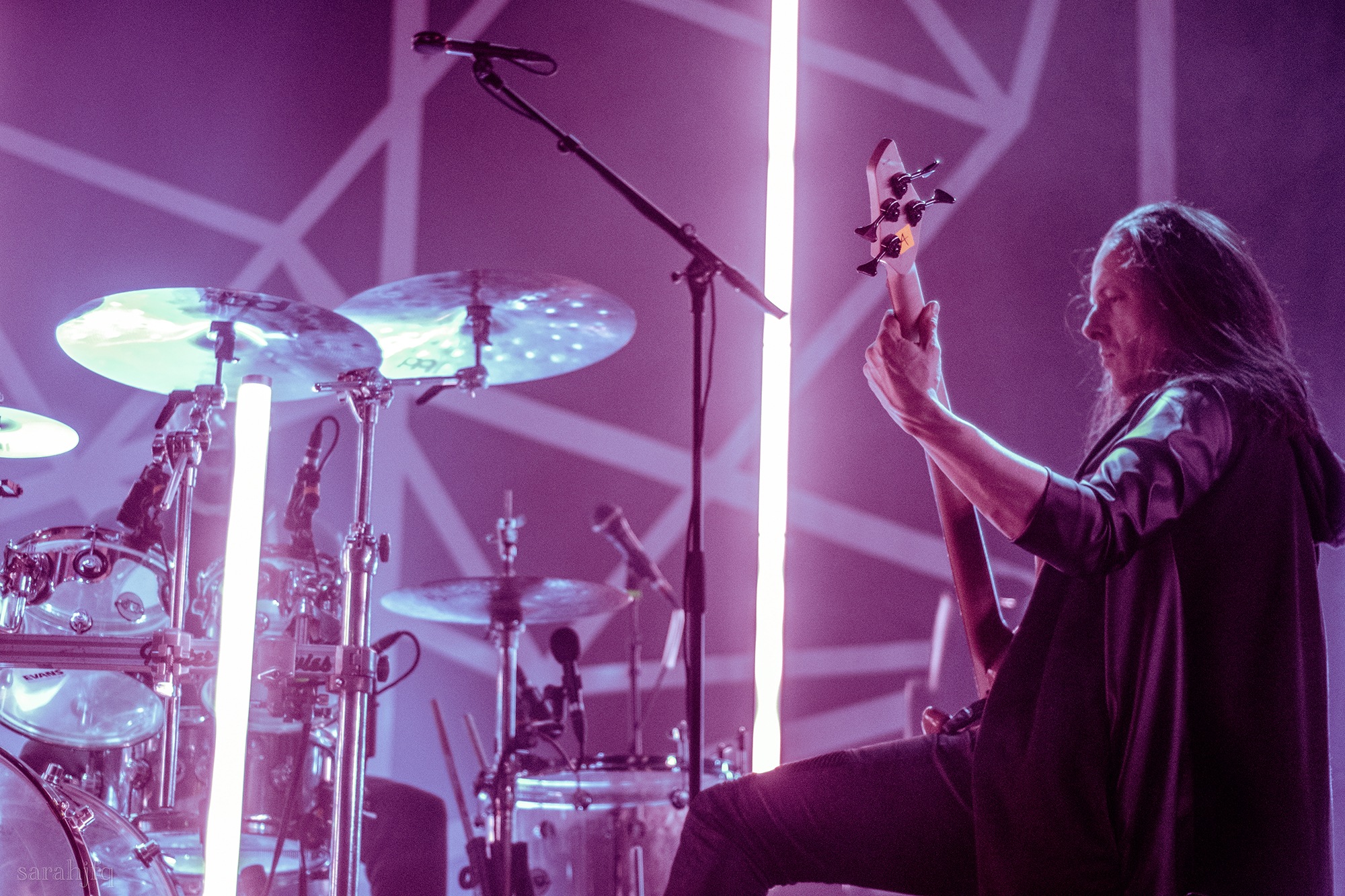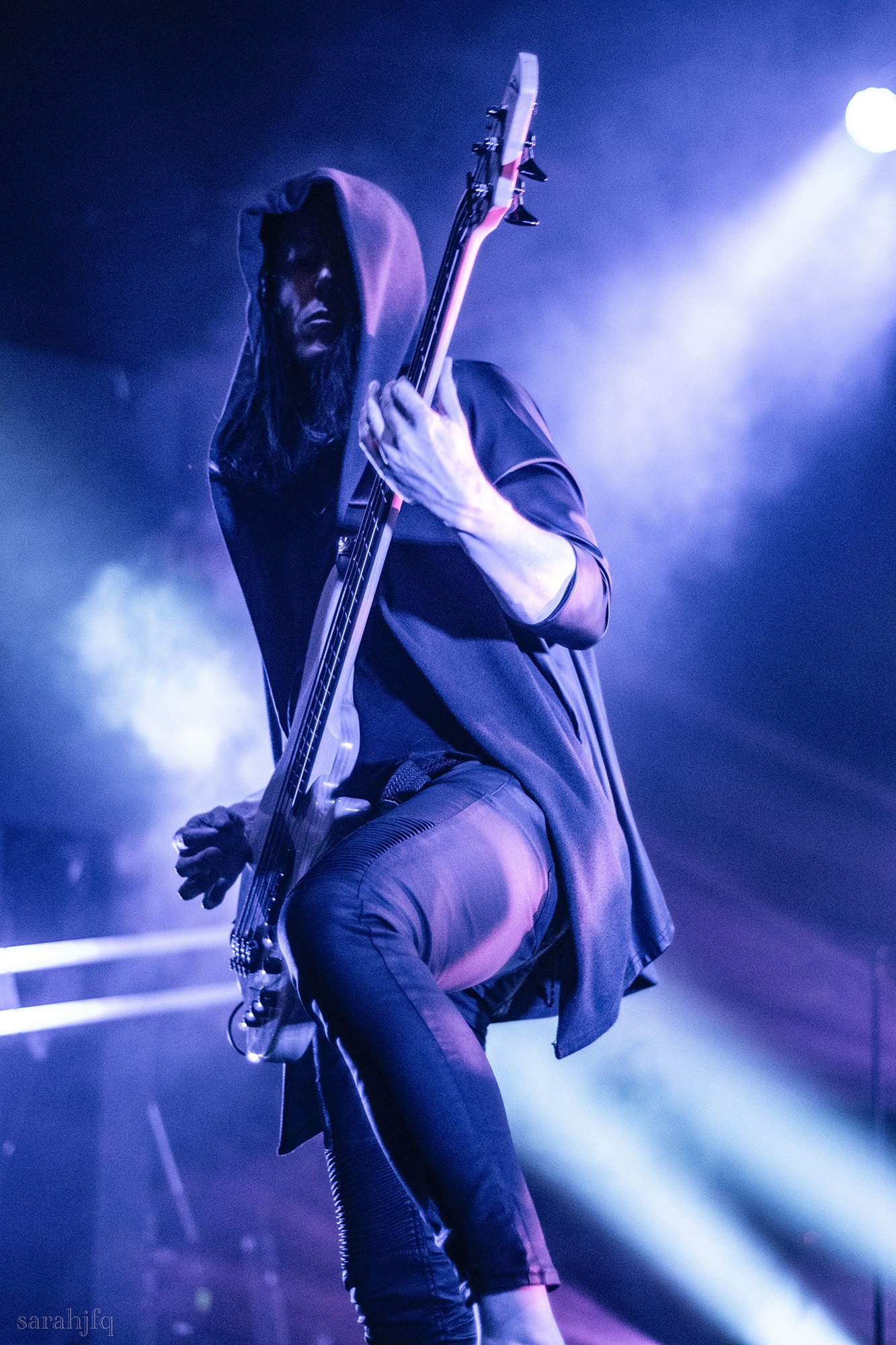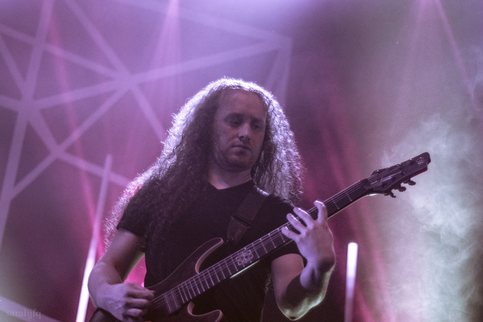 Tompkins movements feel clunky for a moment, almost TikTok dance corny, ever so slightly distracting from the eye catching performance that TESSERACT put on from the get go. Momentarily, angelic backing vocals pierce to the back of the room, and the anthemic chorus kicks in with pyro raining from above, showering the stage in glistening light. There’s moments during the sight that sink into a lull, whether it’s the multiple breaks of darkness that last just a little bit too long or that awkward dancing, but they never fail to grab back attention. Dystopia and Smile stand out when they do exactly that, submitting any wavering eyes of disinterest with their shocking auras.