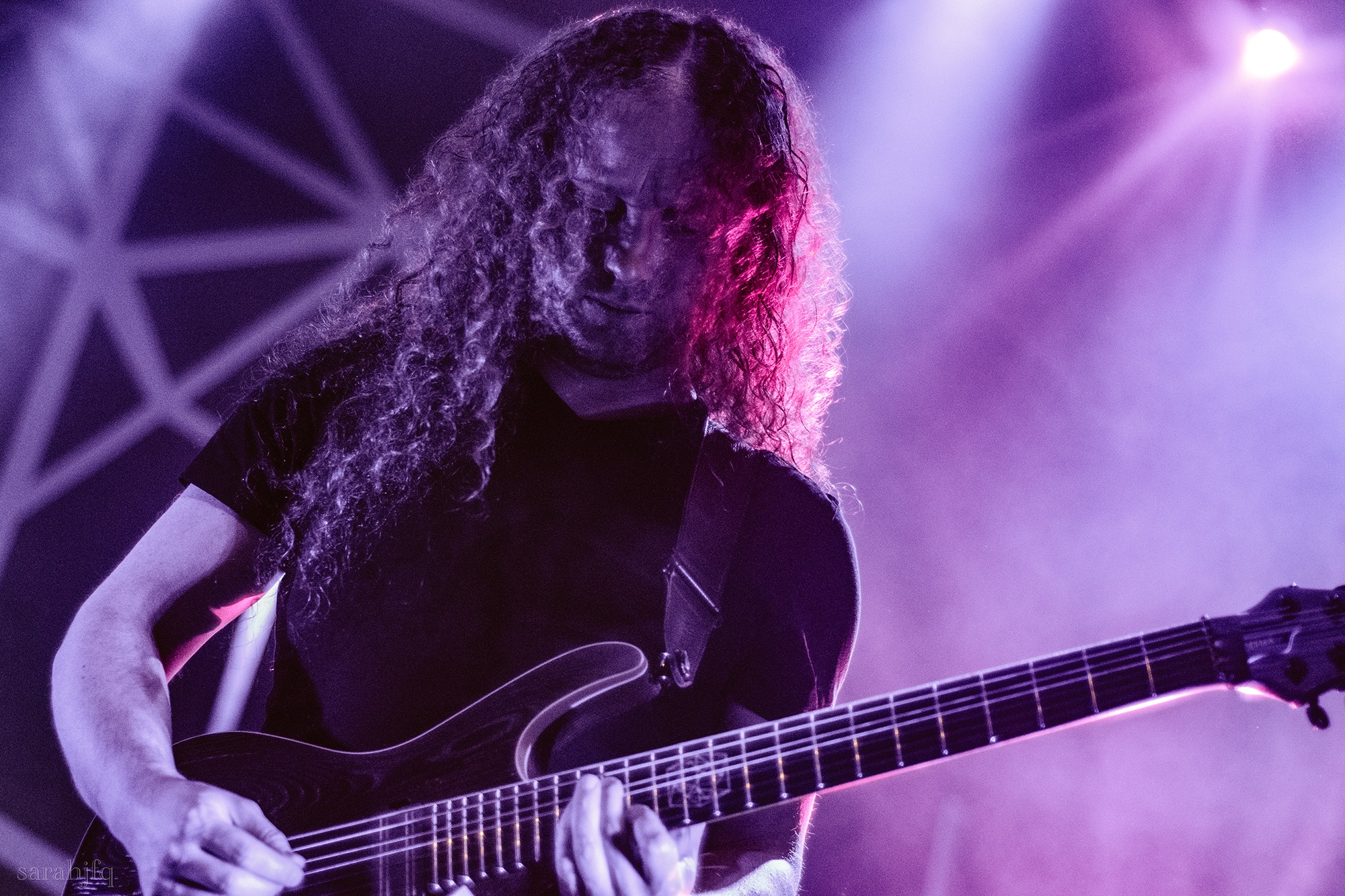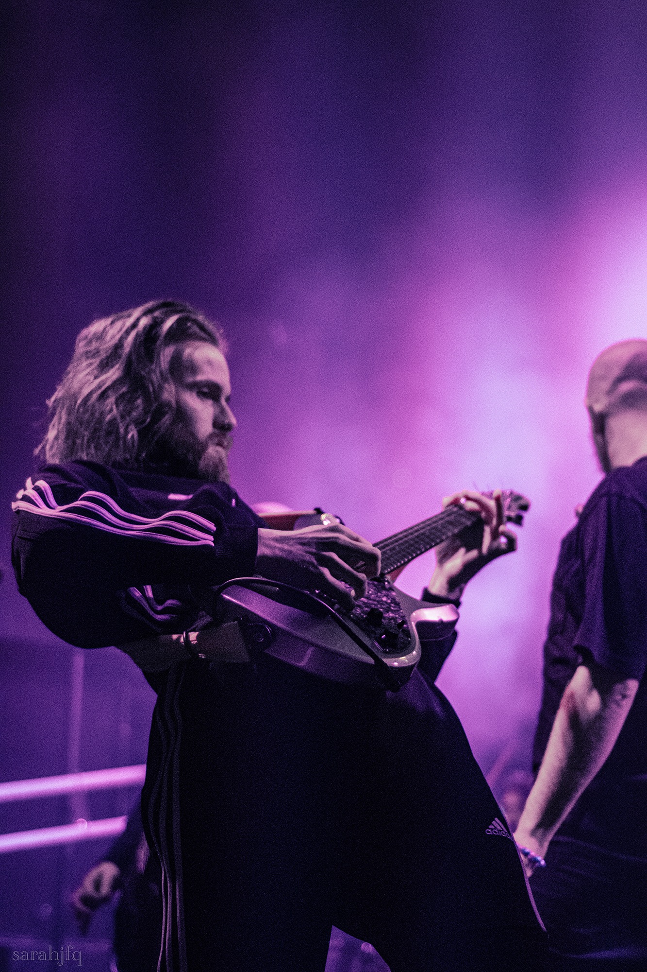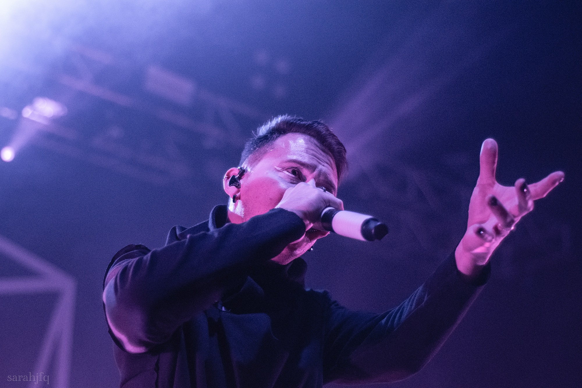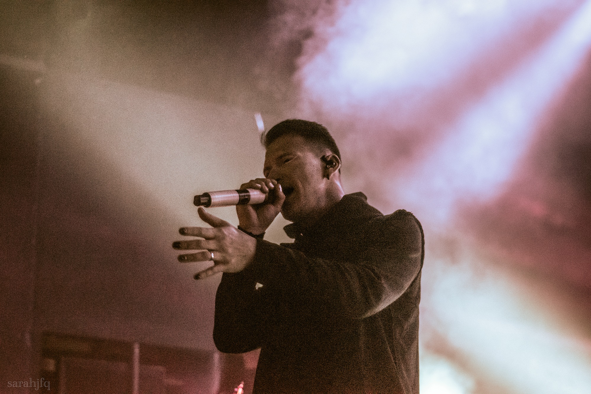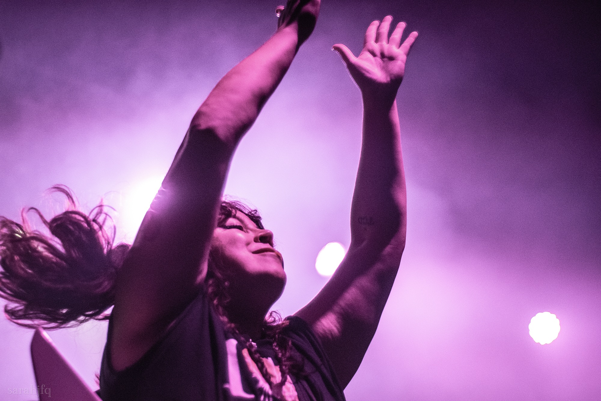 Tompkins movements feel clunky for a moment, almost TikTok dance corny, ever so slightly distracting from the eye catching performance that TESSERACT put on from the get go. Momentarily, angelic backing vocals pierce to the back of the room, and the anthemic chorus kicks in with pyro raining from above, showering the stage in glistening light. There’s moments during the sight that sink into a lull, whether it’s the multiple breaks of darkness that last just a little bit too long or that awkward dancing, but they never fail to grab back attention. Dystopia and Smile stand out when they do exactly that, submitting any wavering eyes of disinterest with their shocking auras.