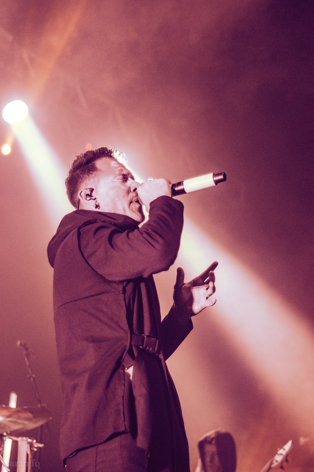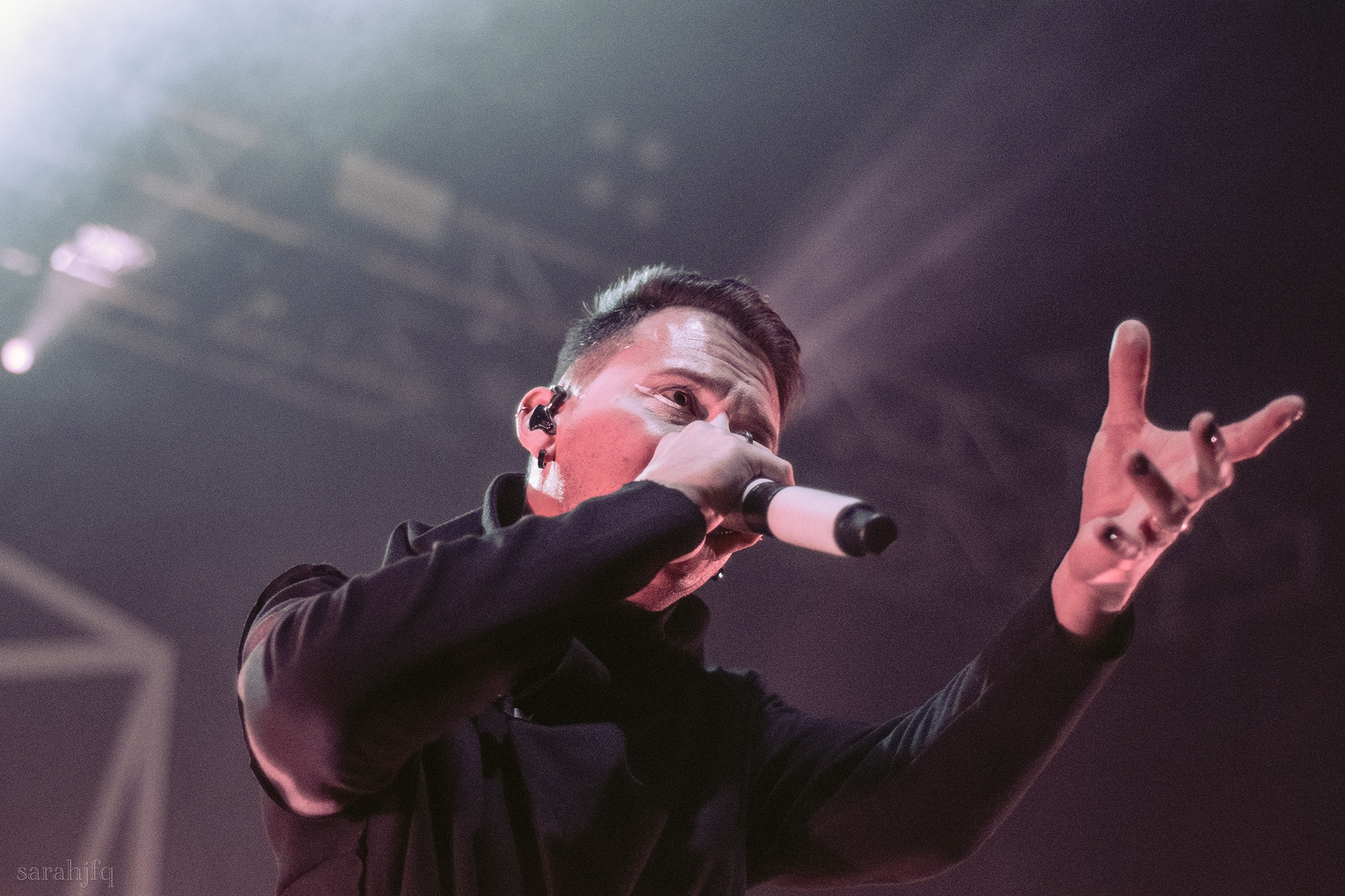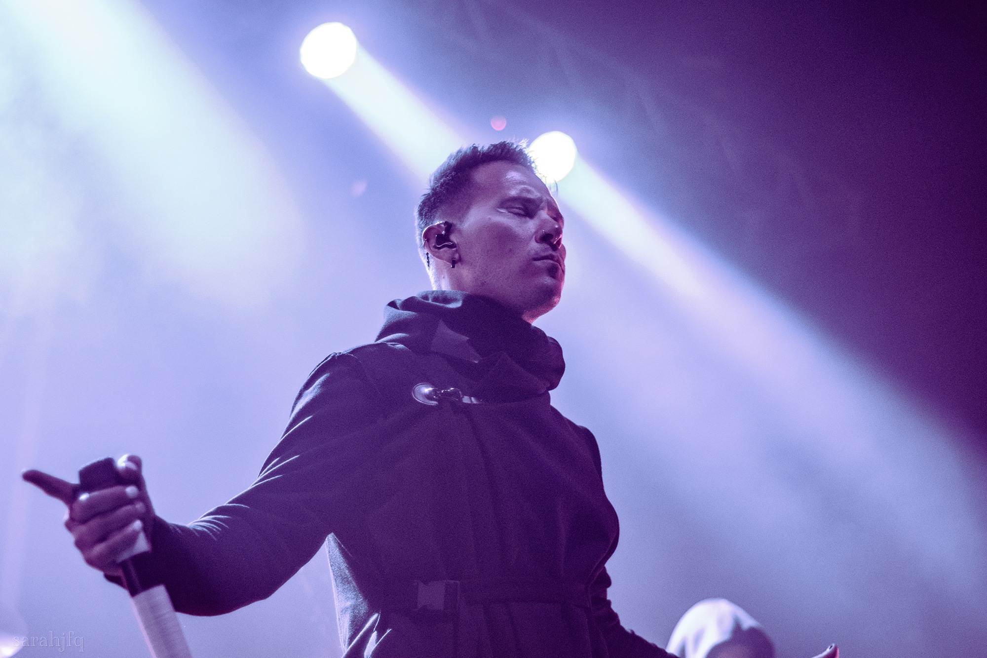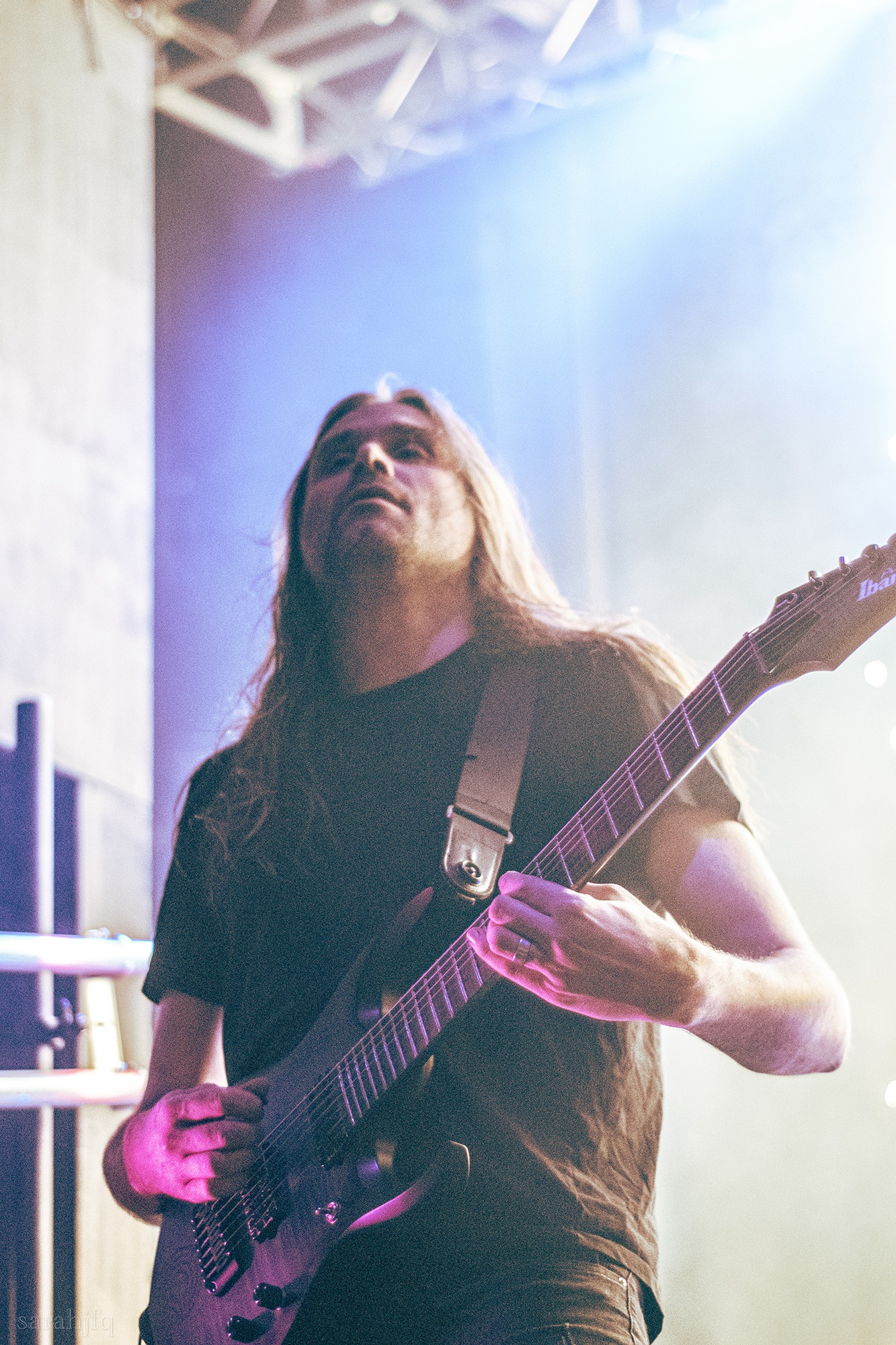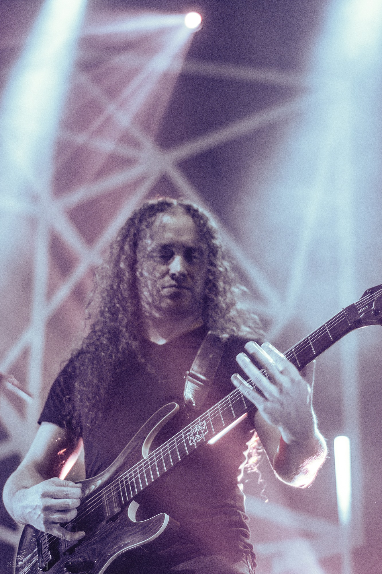 Tompkins movements feel clunky for a moment, almost TikTok dance corny, ever so slightly distracting from the eye catching performance that TESSERACT put on from the get go. Momentarily, angelic backing vocals pierce to the back of the room, and the anthemic chorus kicks in with pyro raining from above, showering the stage in glistening light. There’s moments during the sight that sink into a lull, whether it’s the multiple breaks of darkness that last just a little bit too long or that awkward dancing, but they never fail to grab back attention. Dystopia and Smile stand out when they do exactly that, submitting any wavering eyes of disinterest with their shocking auras.