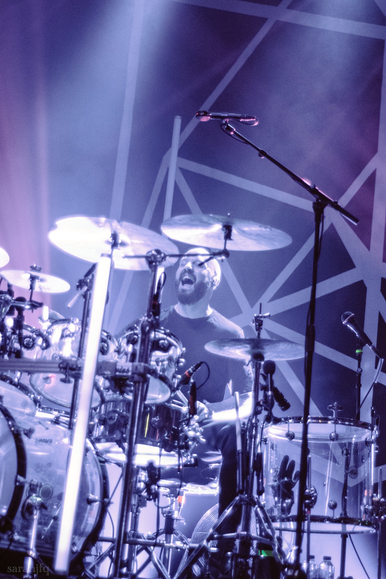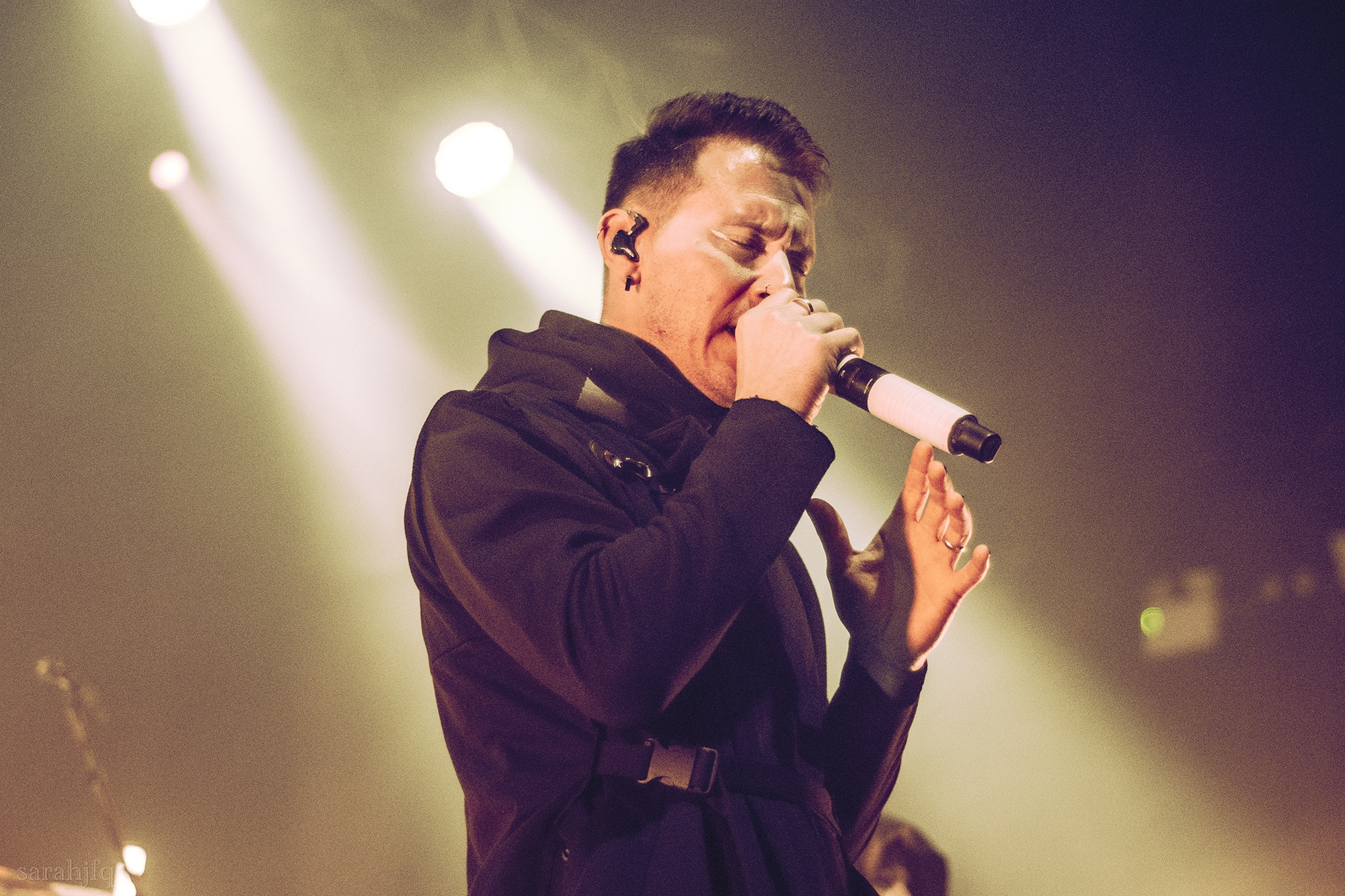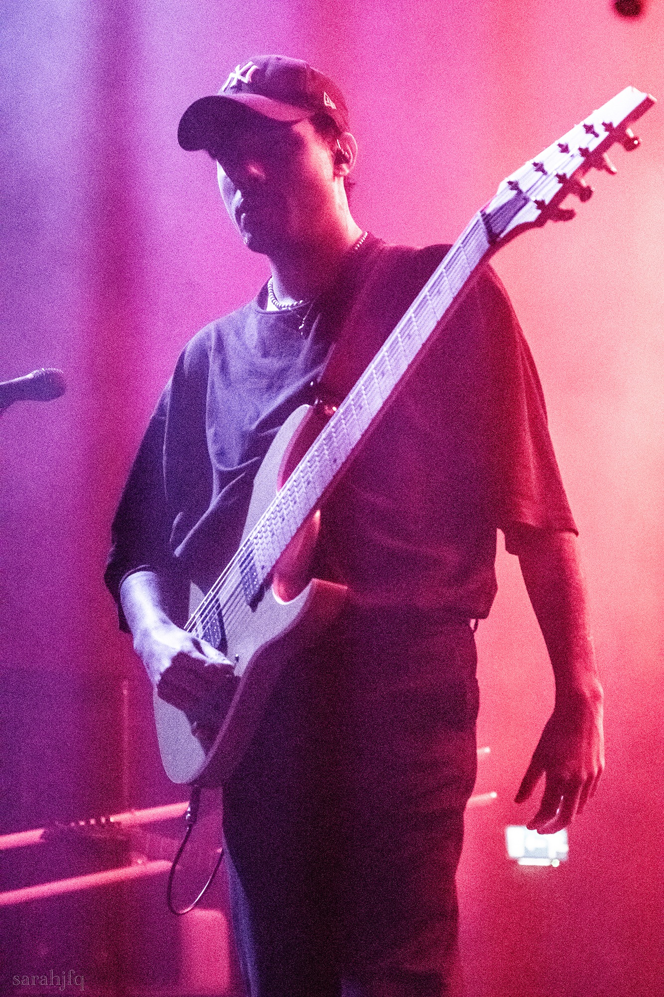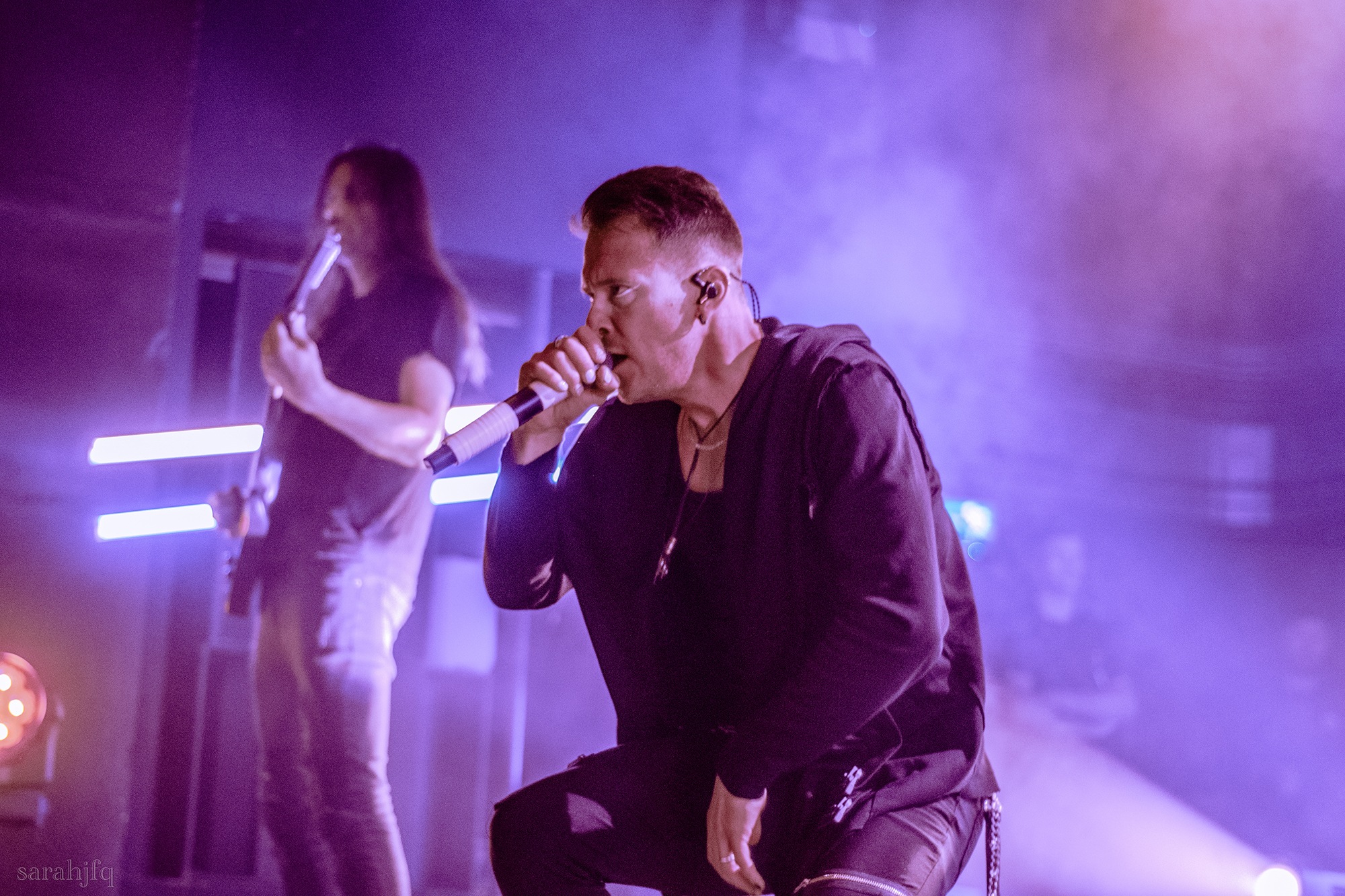 Tompkins movements feel clunky for a moment, almost TikTok dance corny, ever so slightly distracting from the eye catching performance that TESSERACT put on from the get go. Momentarily, angelic backing vocals pierce to the back of the room, and the anthemic chorus kicks in with pyro raining from above, showering the stage in glistening light. There’s moments during the sight that sink into a lull, whether it’s the multiple breaks of darkness that last just a little bit too long or that awkward dancing, but they never fail to grab back attention. Dystopia and Smile stand out when they do exactly that, submitting any wavering eyes of disinterest with their shocking auras.
