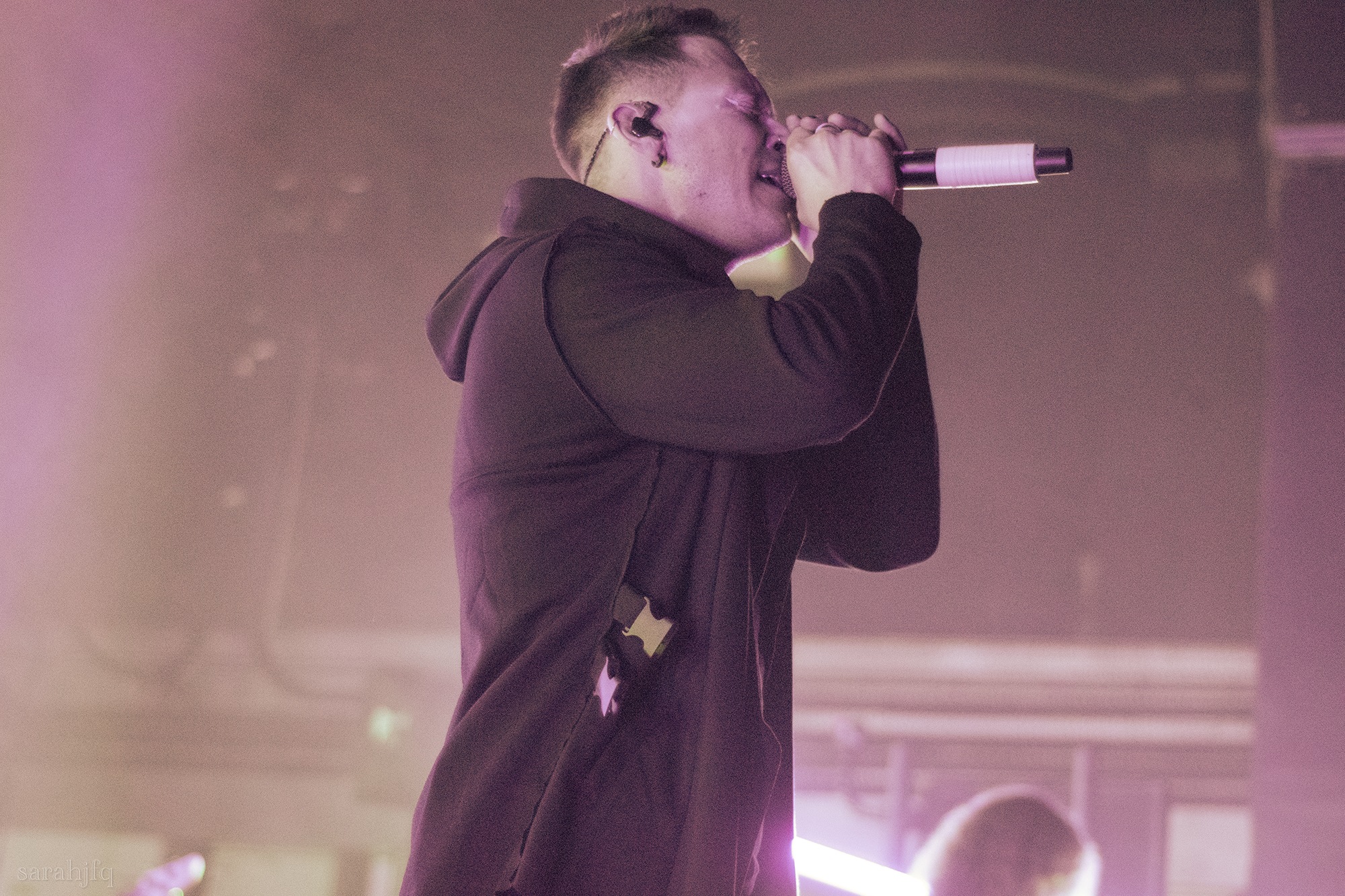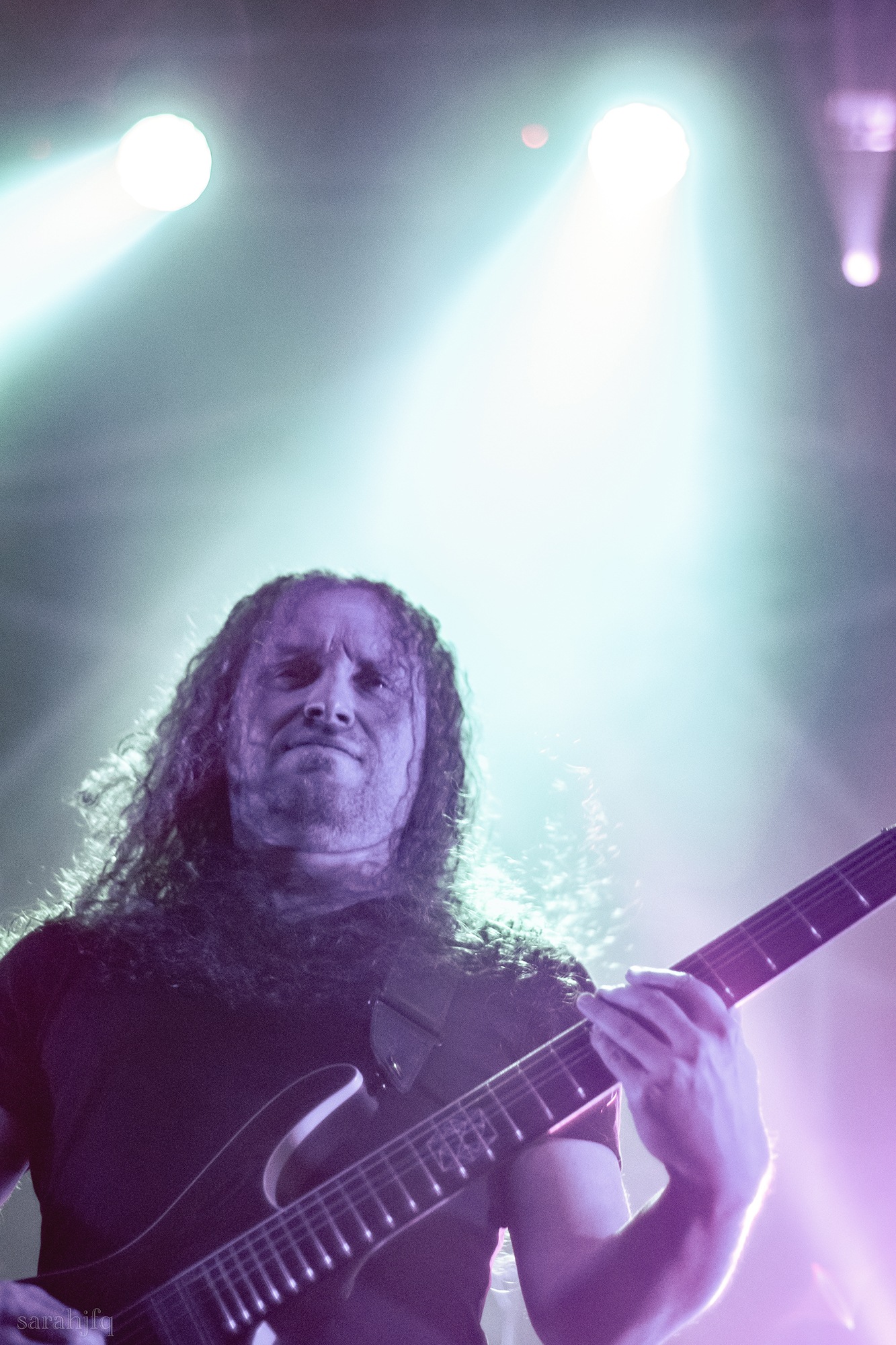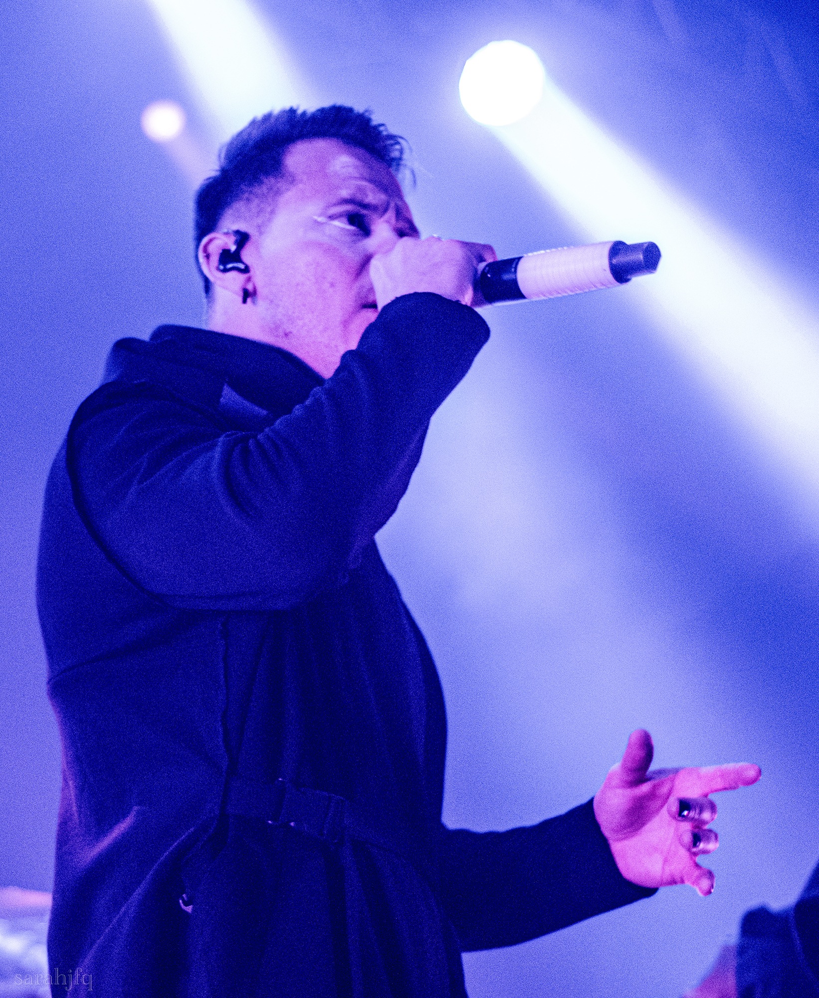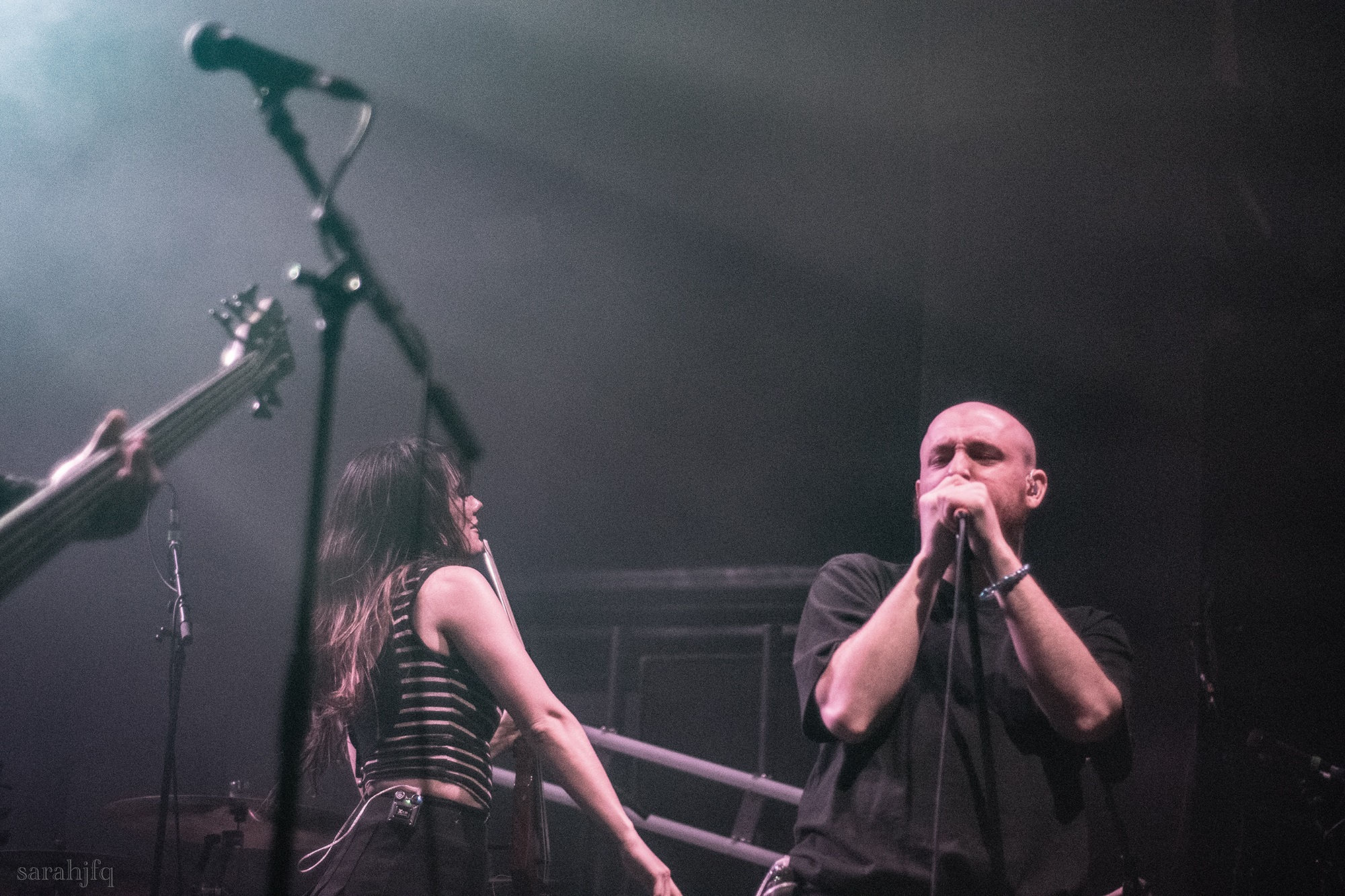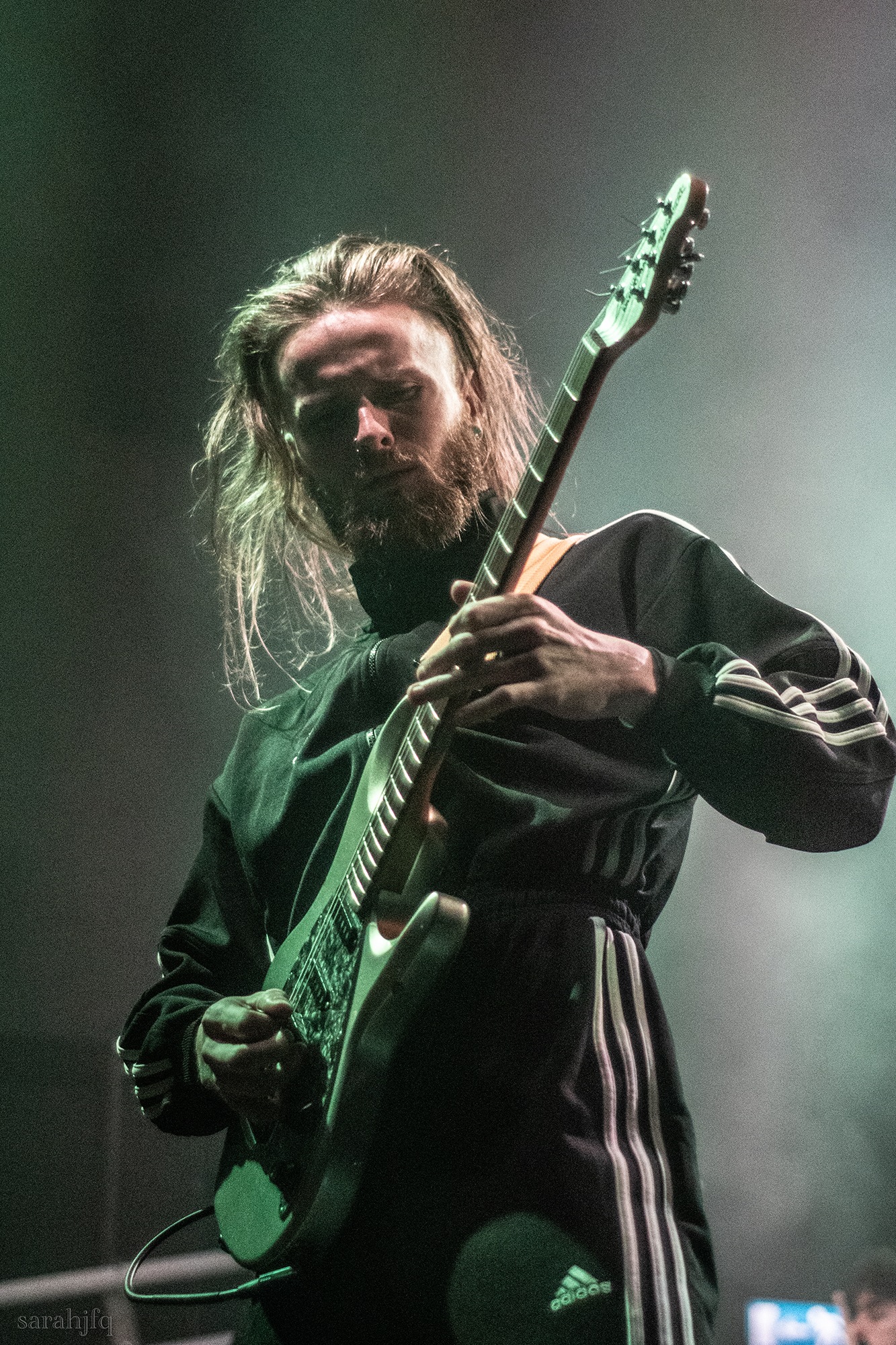 Tompkins movements feel clunky for a moment, almost TikTok dance corny, ever so slightly distracting from the eye catching performance that TESSERACT put on from the get go. Momentarily, angelic backing vocals pierce to the back of the room, and the anthemic chorus kicks in with pyro raining from above, showering the stage in glistening light. There’s moments during the sight that sink into a lull, whether it’s the multiple breaks of darkness that last just a little bit too long or that awkward dancing, but they never fail to grab back attention. Dystopia and Smile stand out when they do exactly that, submitting any wavering eyes of disinterest with their shocking auras.