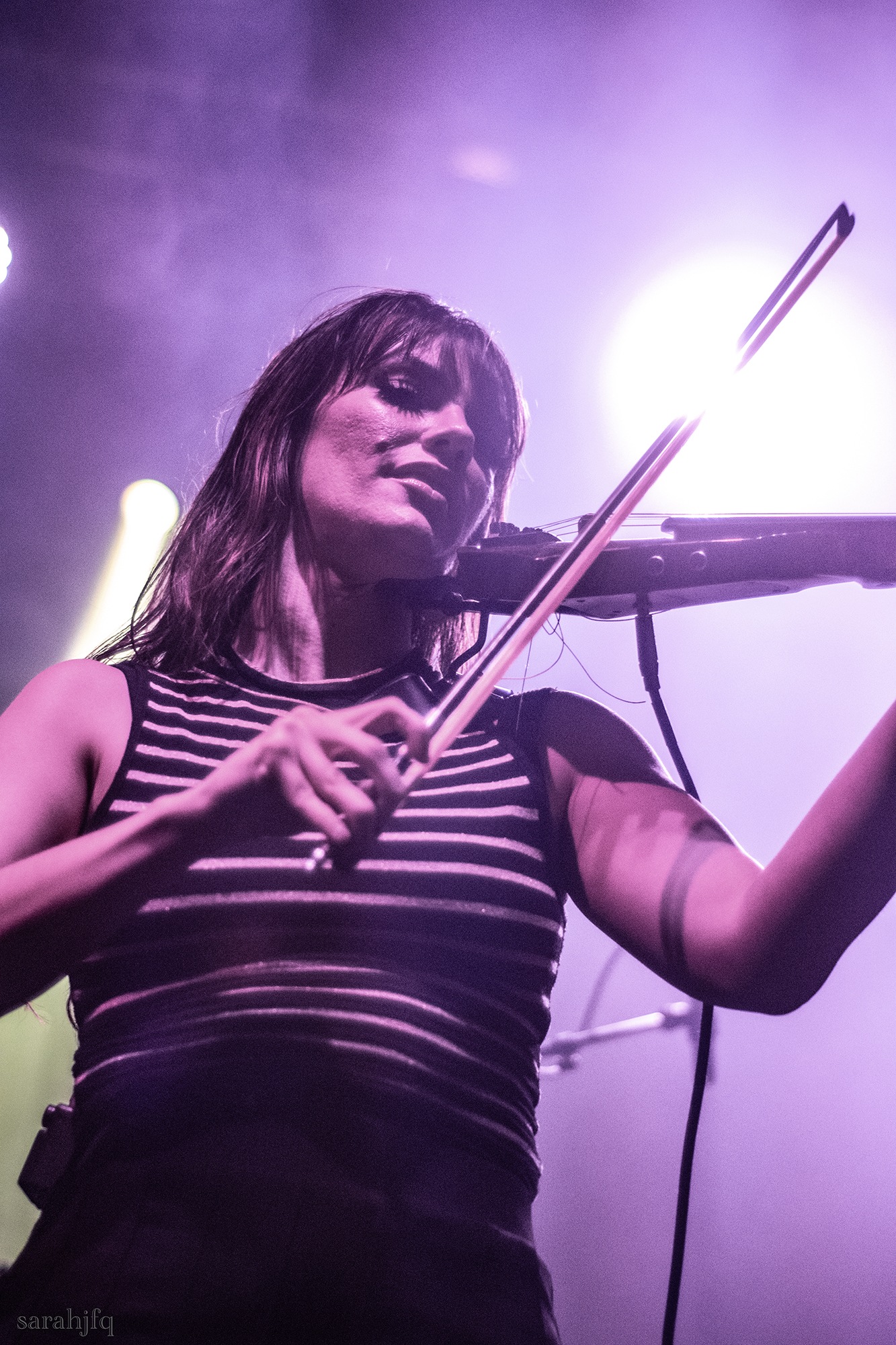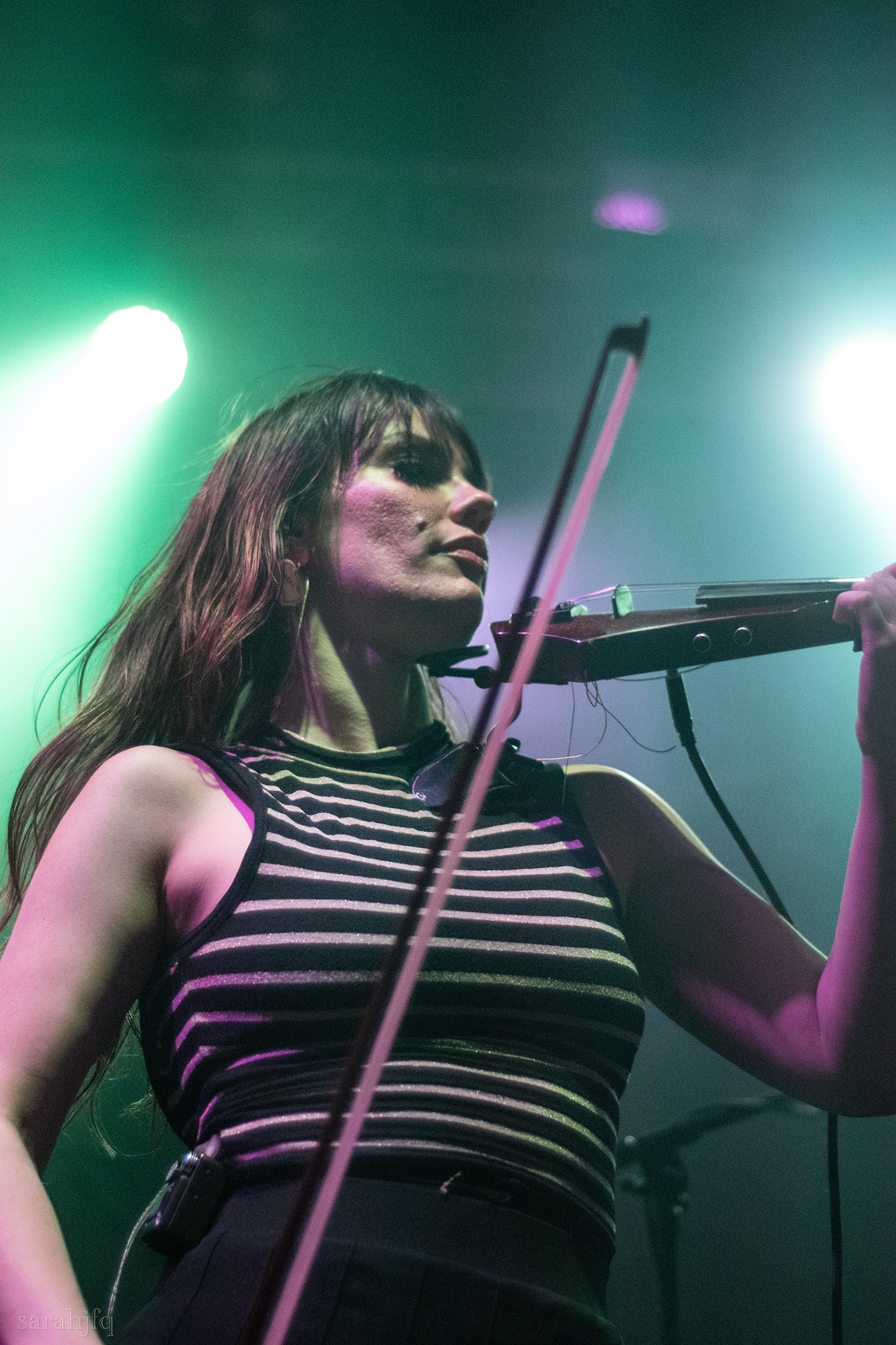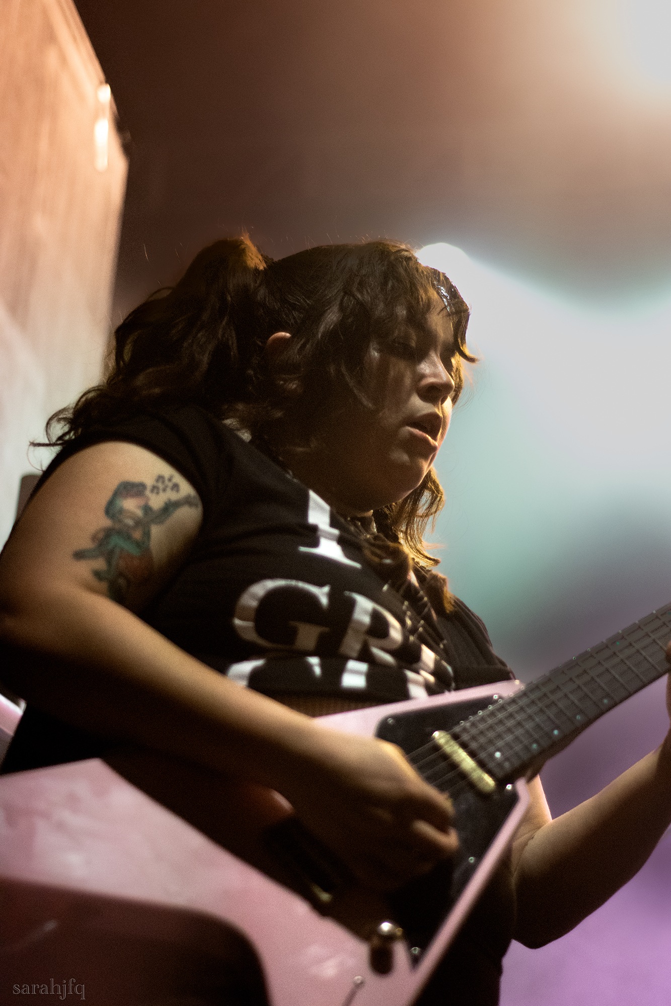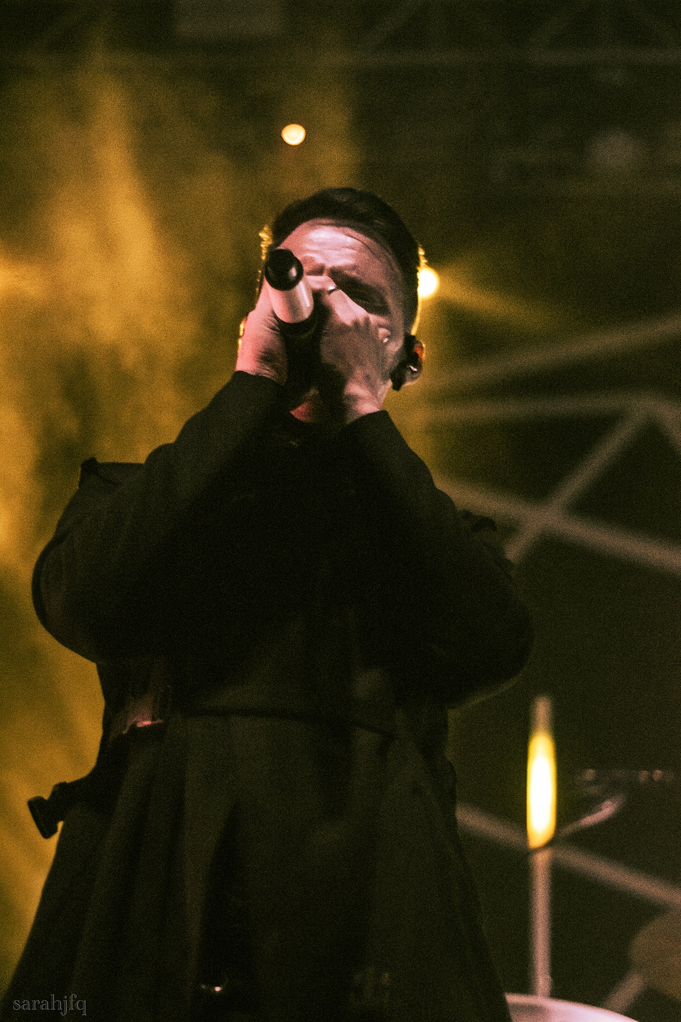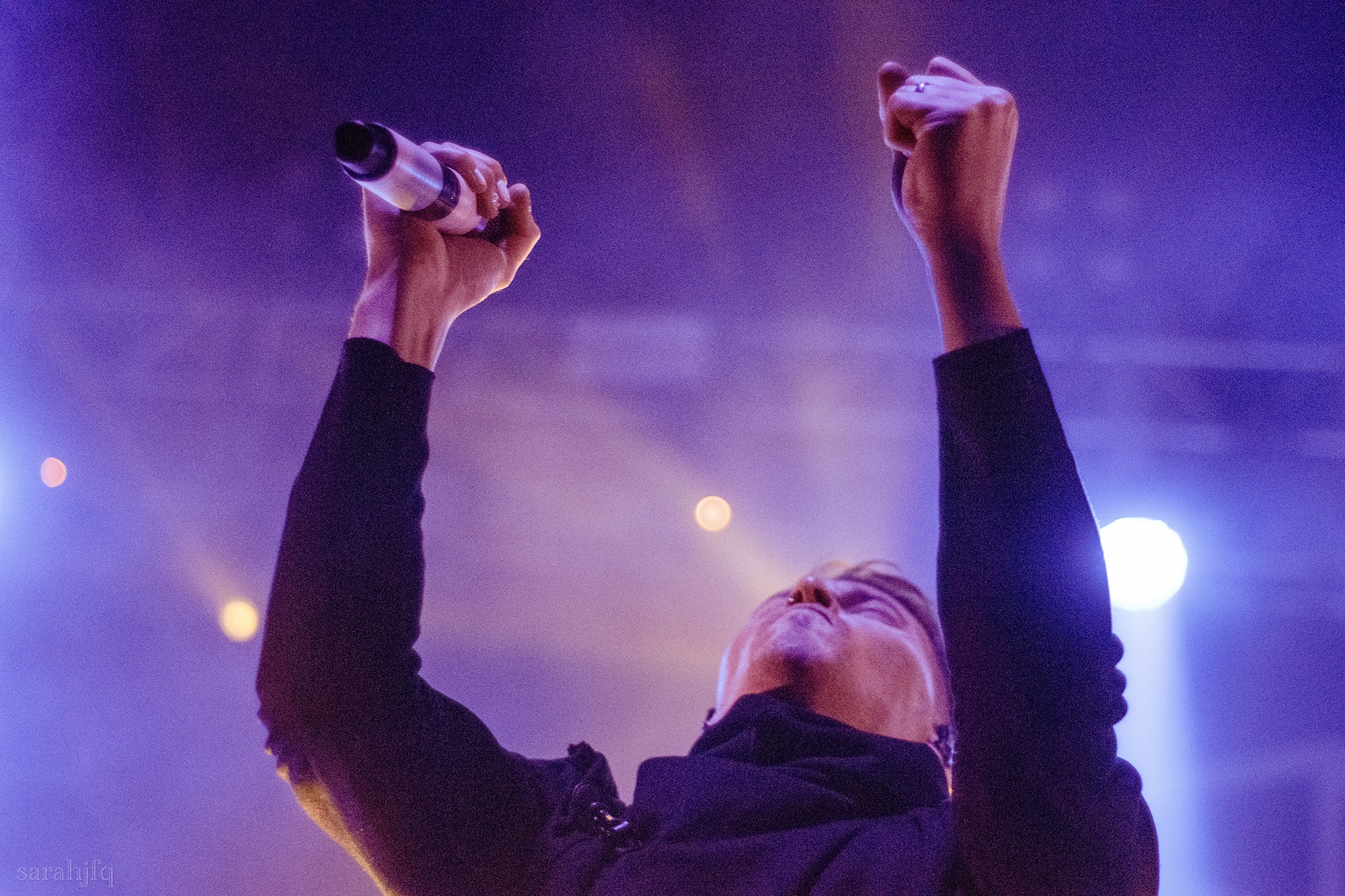 Tompkins movements feel clunky for a moment, almost TikTok dance corny, ever so slightly distracting from the eye catching performance that TESSERACT put on from the get go. Momentarily, angelic backing vocals pierce to the back of the room, and the anthemic chorus kicks in with pyro raining from above, showering the stage in glistening light. There’s moments during the sight that sink into a lull, whether it’s the multiple breaks of darkness that last just a little bit too long or that awkward dancing, but they never fail to grab back attention. Dystopia and Smile stand out when they do exactly that, submitting any wavering eyes of disinterest with their shocking auras.