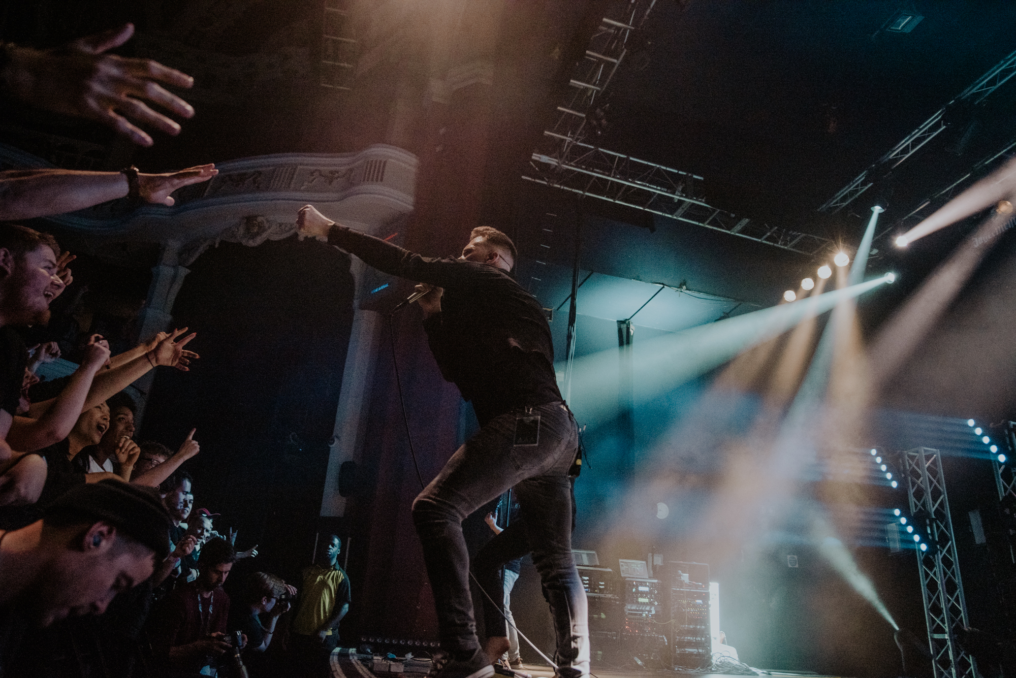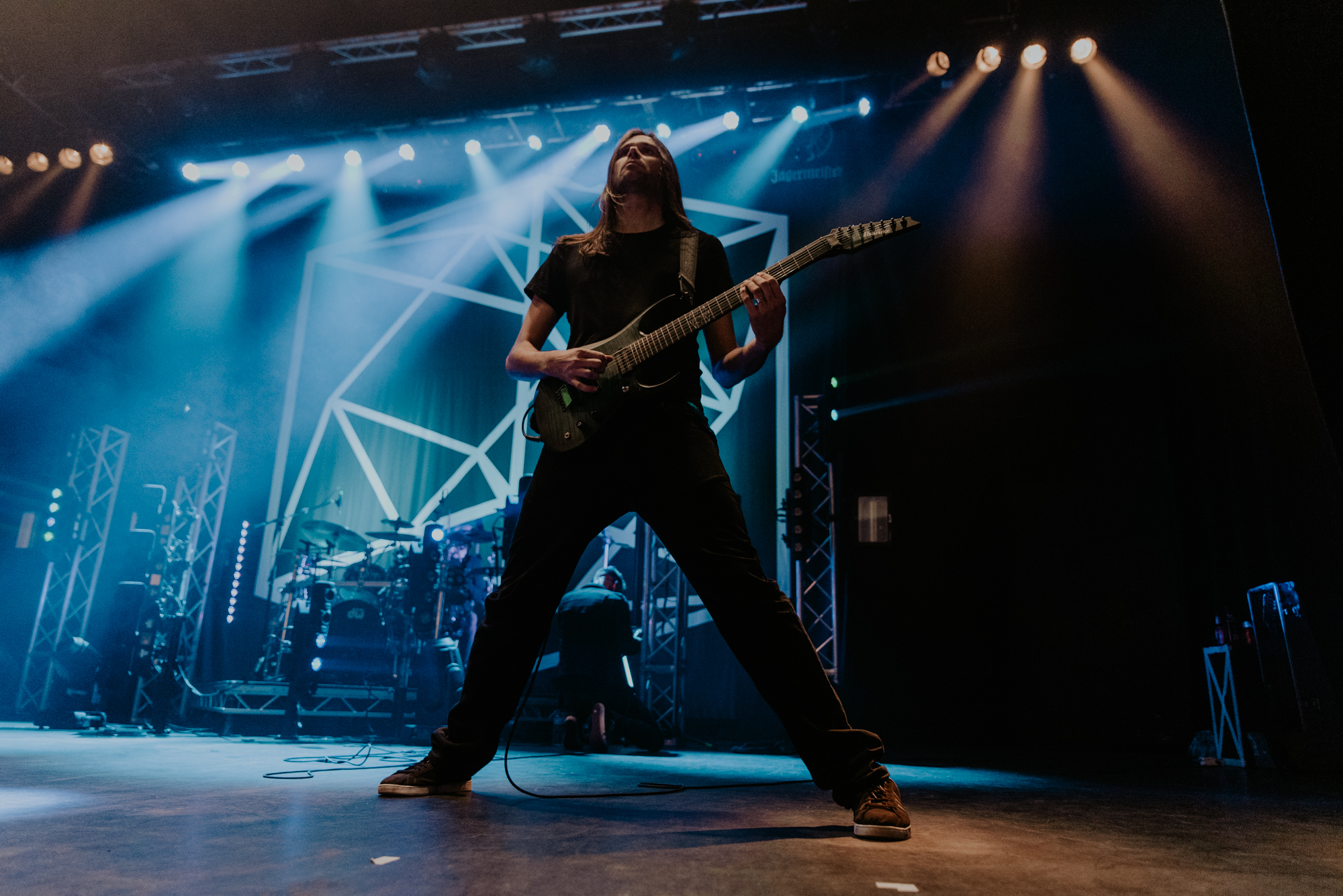 With the lights low, the venue’s stalls and grandiose balconies adorned with eagerly awaiting fans, and the familiar geometry of the TESSERACT logo draped across the stage backdrop, the time had come for the main spectacle. At this point the venue was filled to what felt like way beyond its 2,000 capacity, with barely a square inch of free movement surrounding each person. With the atmosphere truly palpable, the headline act proceeded to hit the stage in style, launching into Sonder‘s opening track Luminary with scarcely any warning, the infectious opening groove sending the crowd into delirium. The crisp, compressed, ‘djenty’ guitar chugging pulsated throughout the room, accompanied by the relentlessly spinal quality of Amos Williams‘ bass grumbling beneath the mix, and the familiarly angelic chimes of Dan Tompkins soaring throughout. This opening track formed a neat microcosm of the set, with a satisfyingly harmonious balance between soft and heavy continuously ebbing and flowing. Mosh pits and singalongs continued to occur in equal measure as the quintet rifled through a delightfully varied set, spanning all four albums, and no doubt satisfying every kind of TESSERACT fan in the room. Complimenting this in unerringly consistent fashion was the remarkably precise and balanced mixing, each component having ample room to shine, and amalgamating to form a truly binaural effect. Above all however, was how abundantly clear it was that both the band and the entire crowd were thoroughly enjoying themselves. Each member on stage barely neglected to display beaming smiles and vigorous enthusiasm throughout, whilst the faithful in the stalls scarcely took a second to breath and cease from moshing, jumping, and singing every word. At several points, the raw power and control of Tompkins‘ vocals was simply drowned out by the sound of the crowd’s own efforts; true testament to the infectious nature of each hook and chorus. During their 80-minute performance, not a foot was put wrong by TESSERACT, to no one’s surprise. Arguably more poignant however, was the sheer explosiveness of the crowd throughout, and the grandiosity of the entire event. This was very much a symbol of TESSERACT coming full-circle; this, give or take a few miles, is where they began, and this was the placed they returned to, to sell out the Shepherd’s Bush Empire for what they later described as the “best show we’ve ever played.” A blinding performance from the prog giants, and a truly special night for all involved.