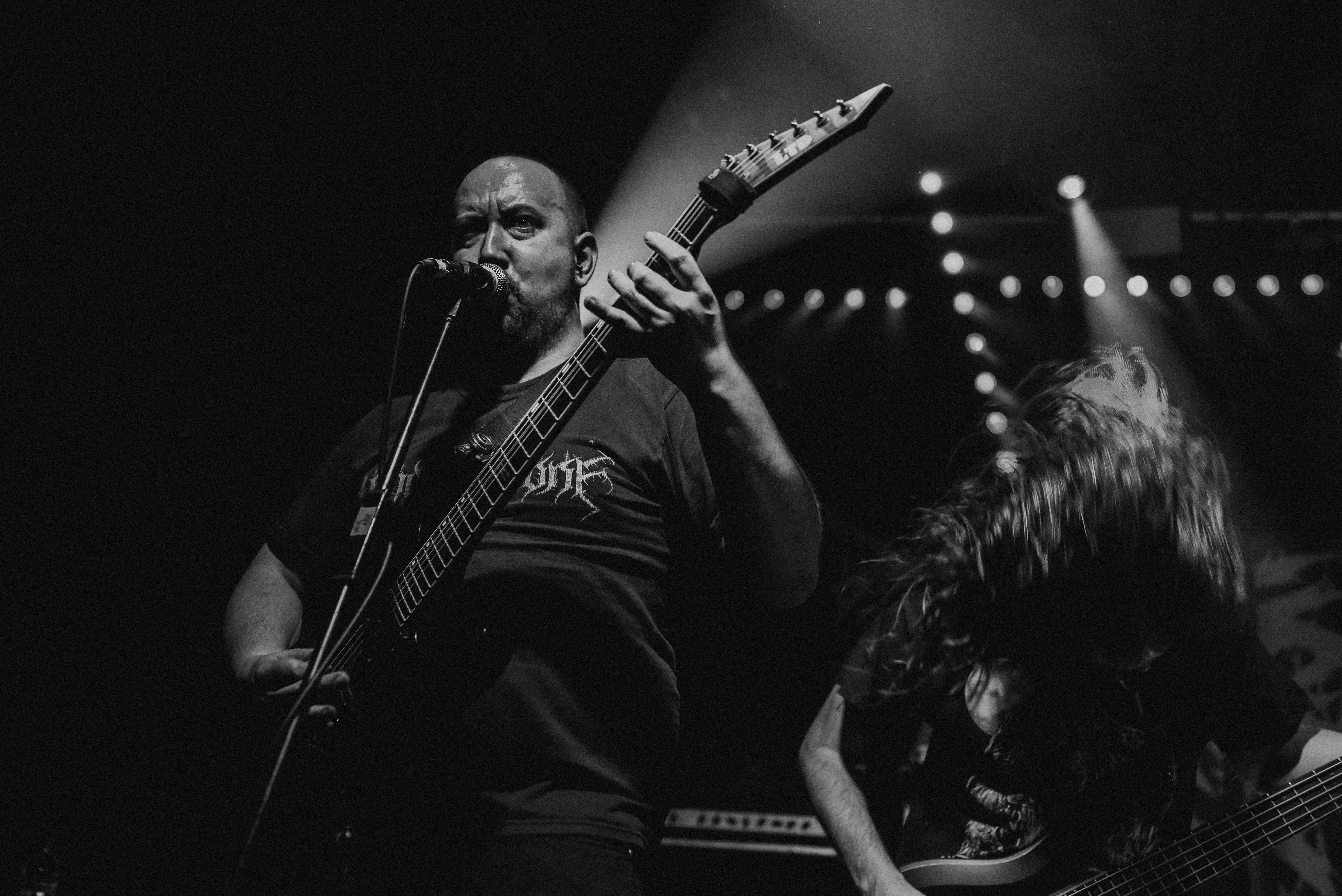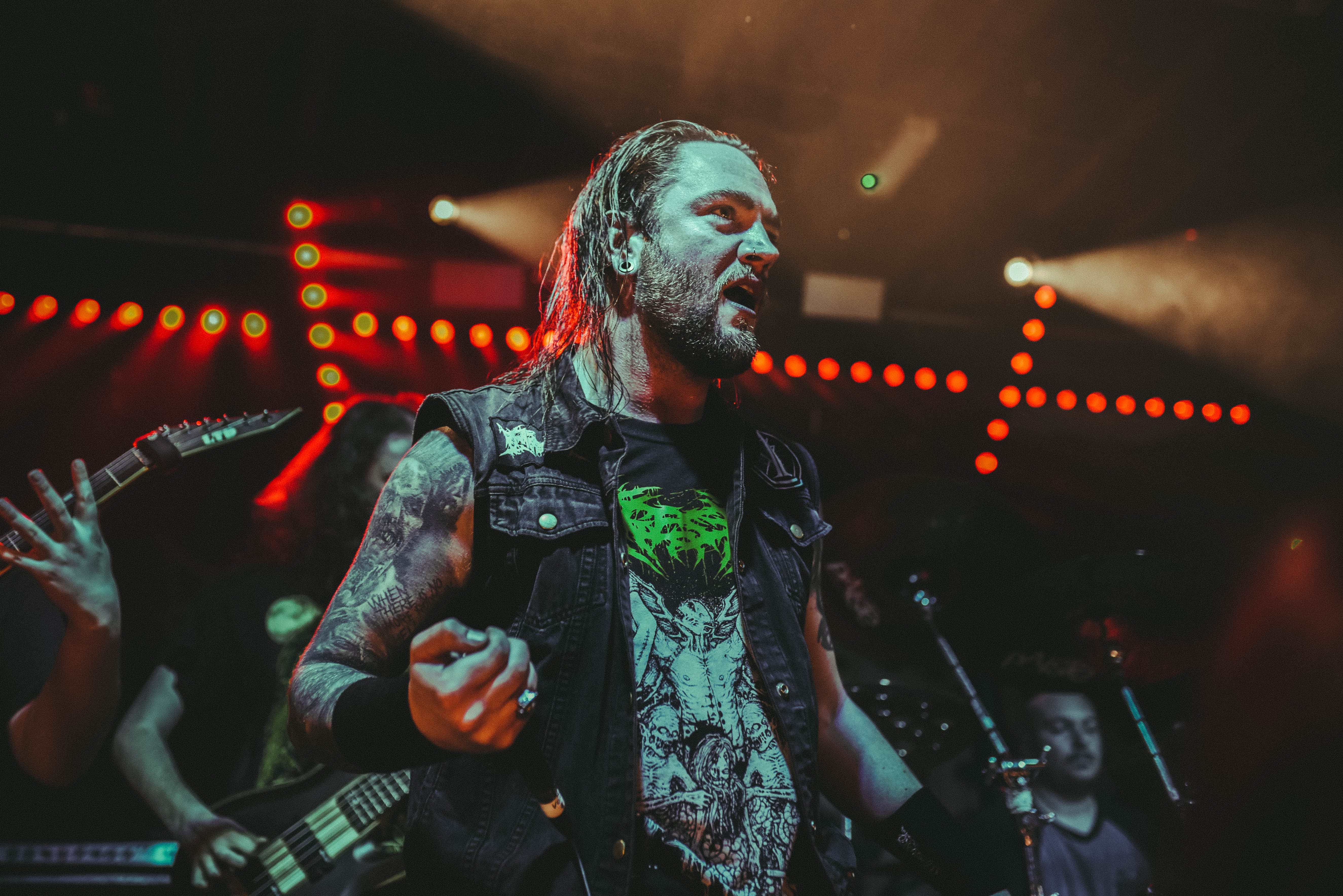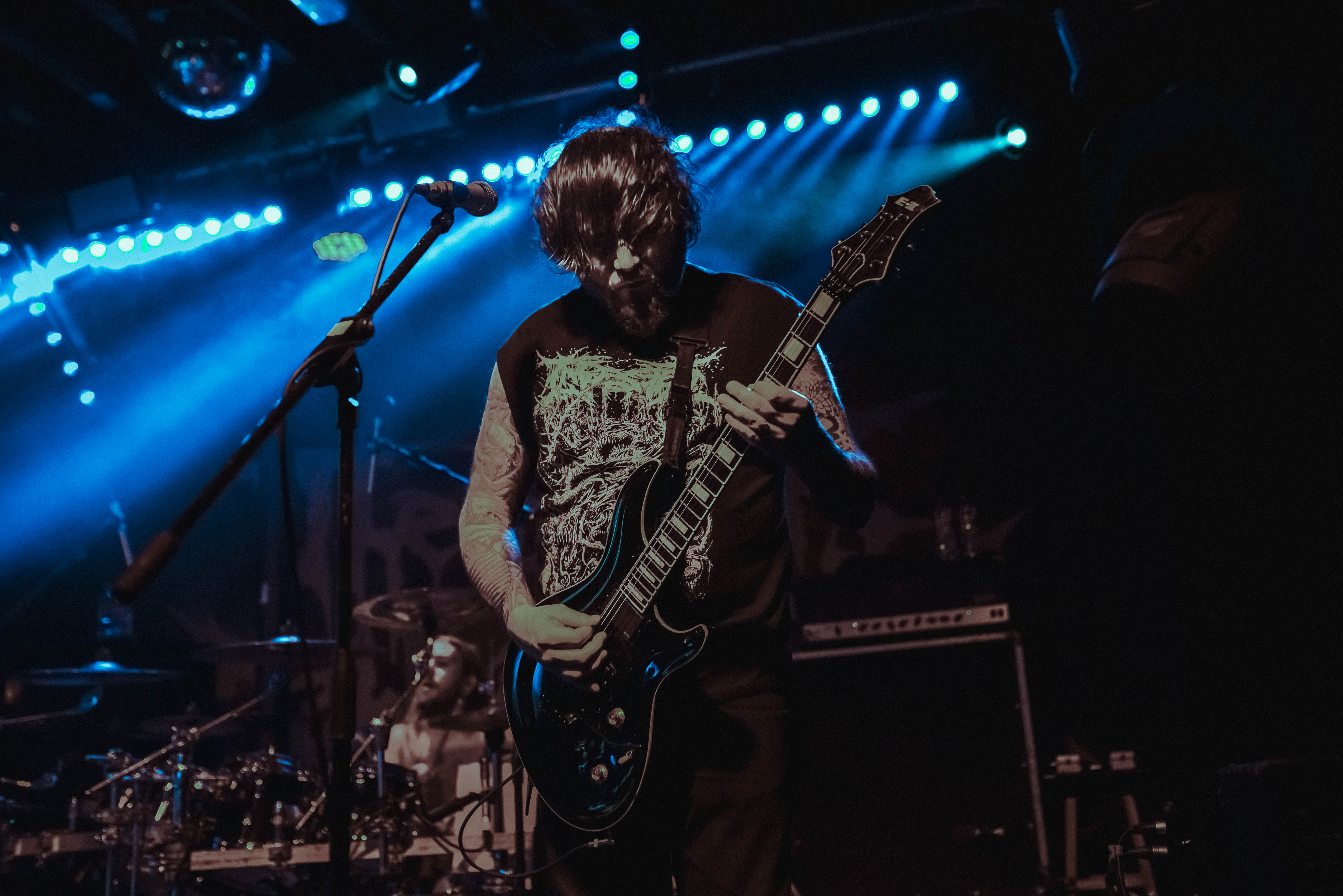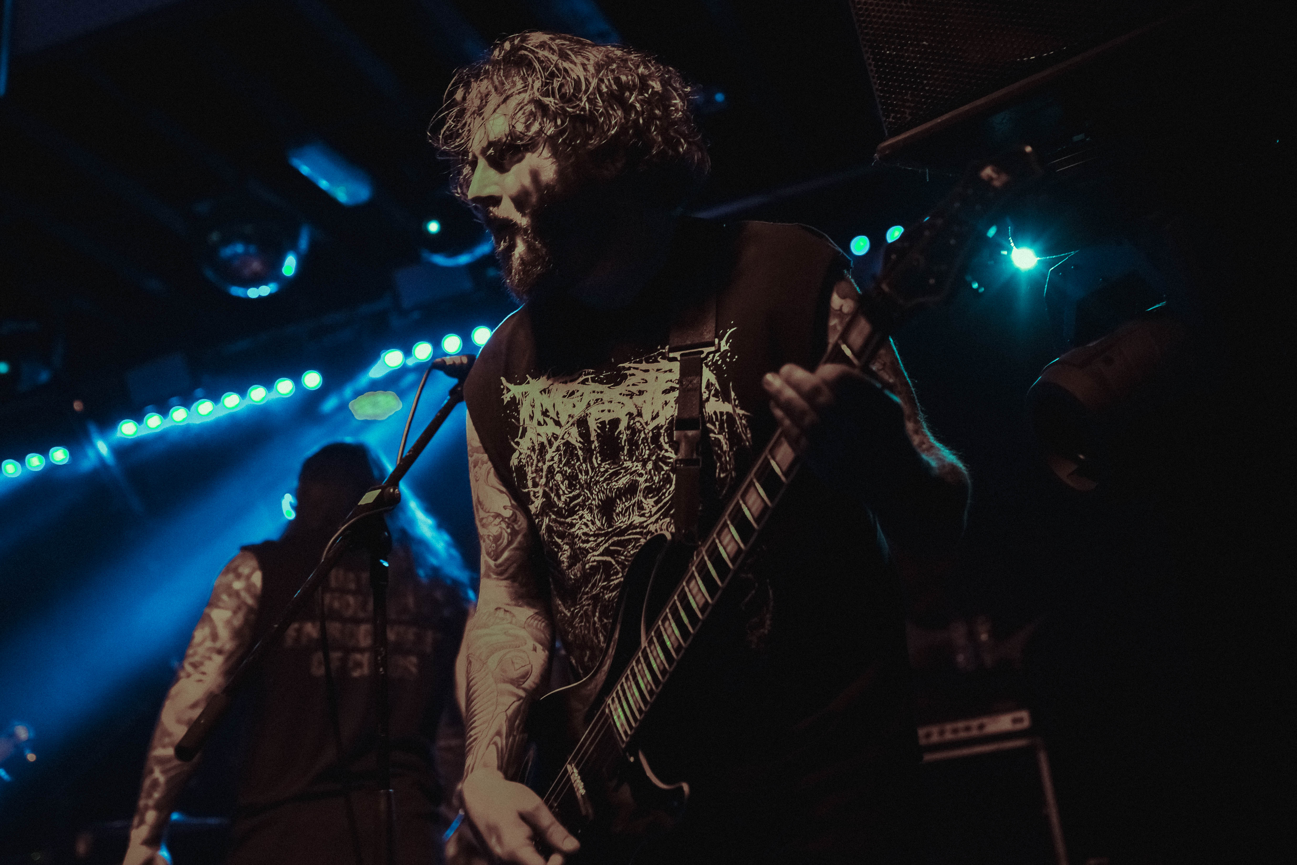 Bristol’s resident brutal death metal group, EMBODIMENT, have been building their stock within the scene over the years, and this tour sees them most at home on a line up. They are inarguably tight, as their drummer keeps everyone in line as they progress through their technical passages of death metal wizardry. As tight as they are though, EMBODIMENT suffer through a weak sound that drowns out the vocals in replacement for overwhelming drums and guitars coming through the front of house. Thankfully, the unit are clearly on form tonight, inspired by the pedigree of the lineup perhaps, but the band still come at the filling room with intent.