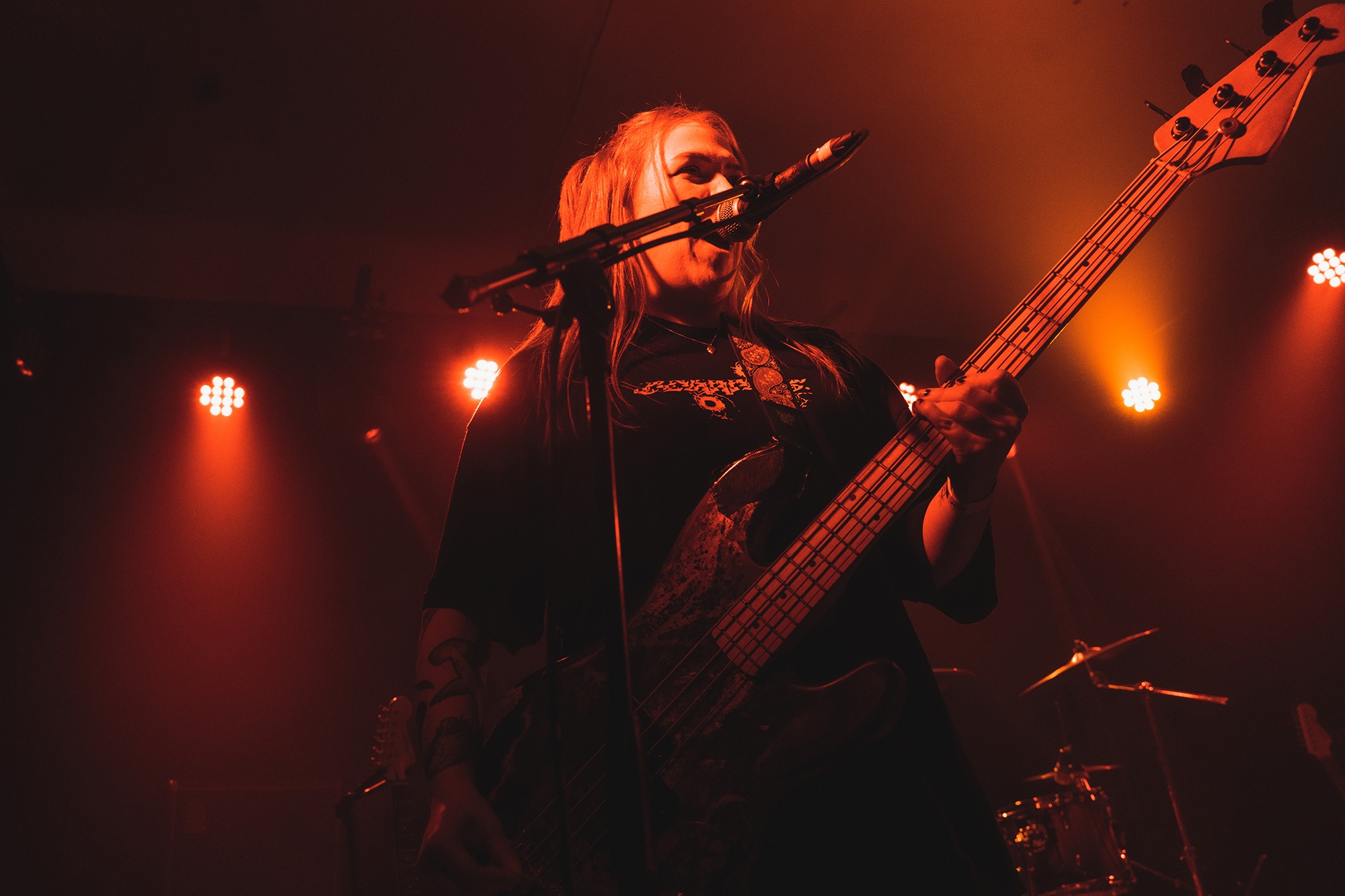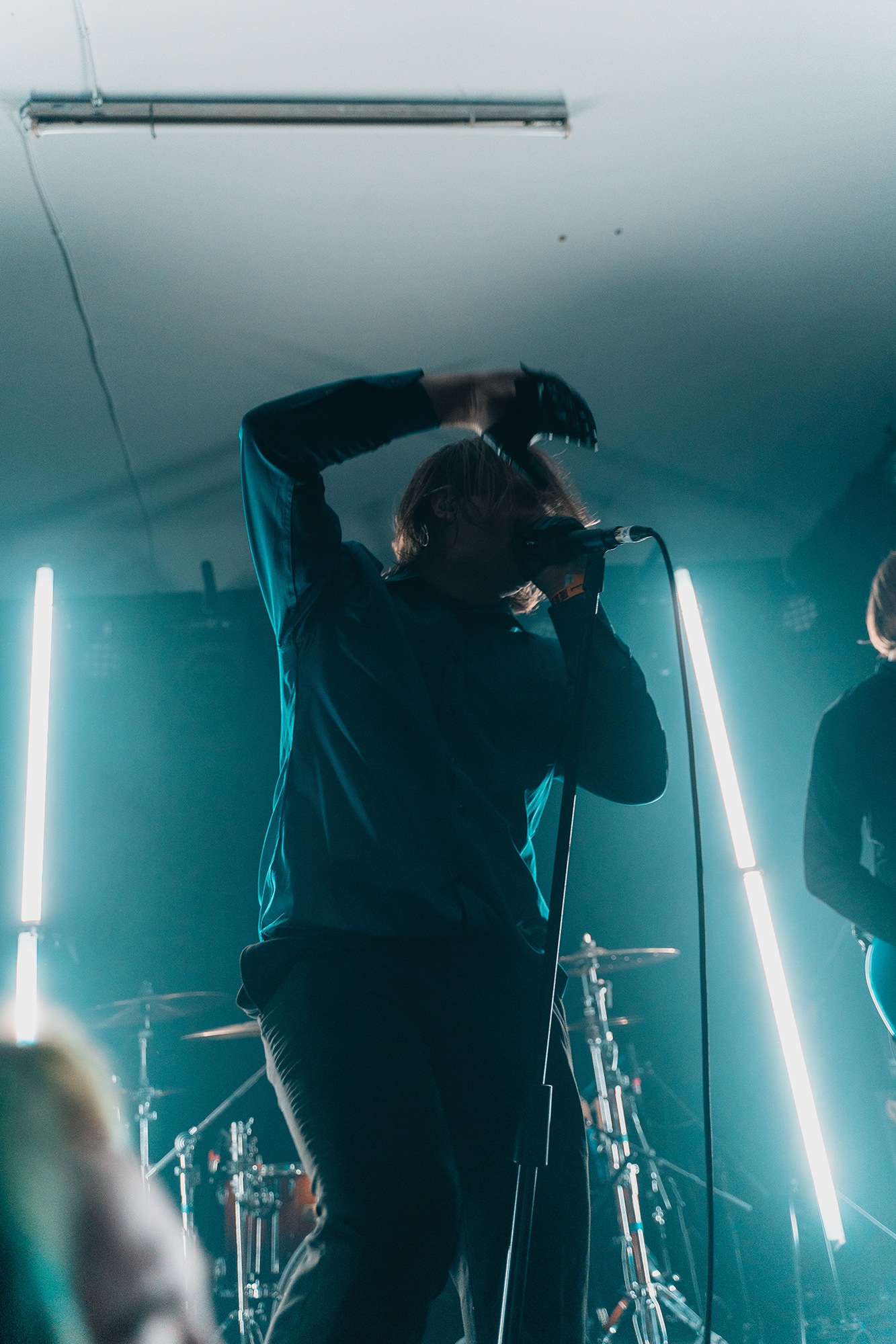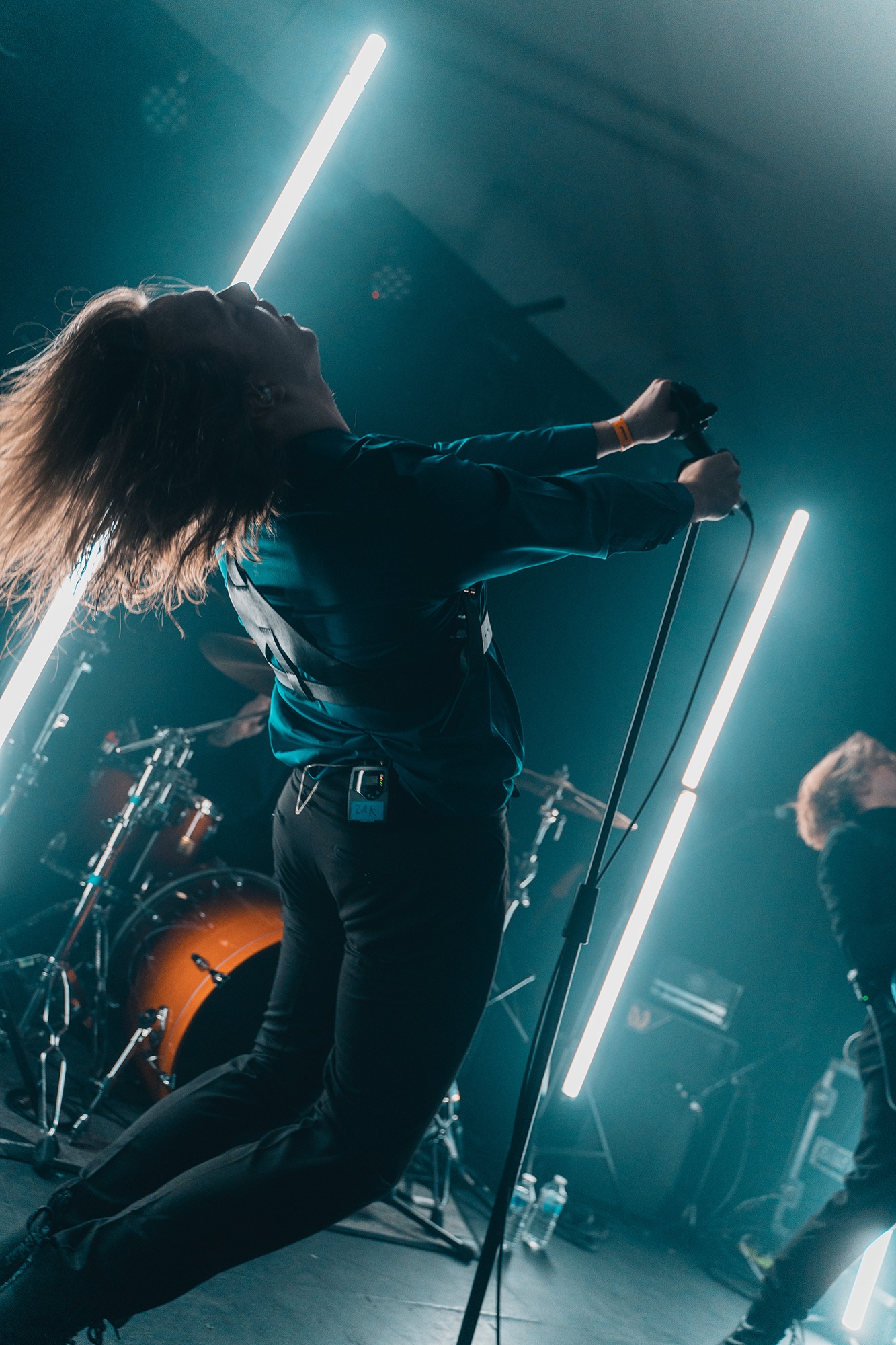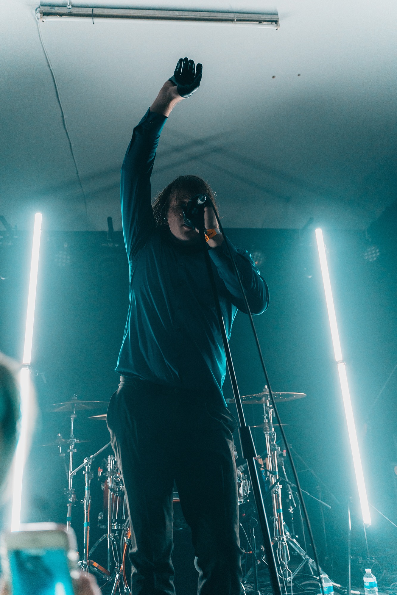 It’s a tough act to follow, and UK outfit MODERN ERROR have their work cut out for them. Fusing electronics with metalcore is nothing new, but the band have their own particular take on it that brings in tinges of emo and post-hardcore. Synths pulse atop electronic drums, interspersing the heavier moments where the trio dial up the aggression. The biggest problem tonight isn’t with their music but the sound; where most trios have members doing lead vocal duty along with something else, MODERN ERROR have a lone vocalist in Zak Pinchin. That means they lack a live bassist, unfortunately undermining their songs in some parts where it could be most impactful. Despite this, they still portray their own vision for their live shows, tube lights flanking the stage that alternate between various block colours or flashes and Pinchin‘s own relentless energy. Fortunately their towering choruses aren’t robbed of their emotional punch and they still deliver a solid performance in spite of the occasionally thin sound.