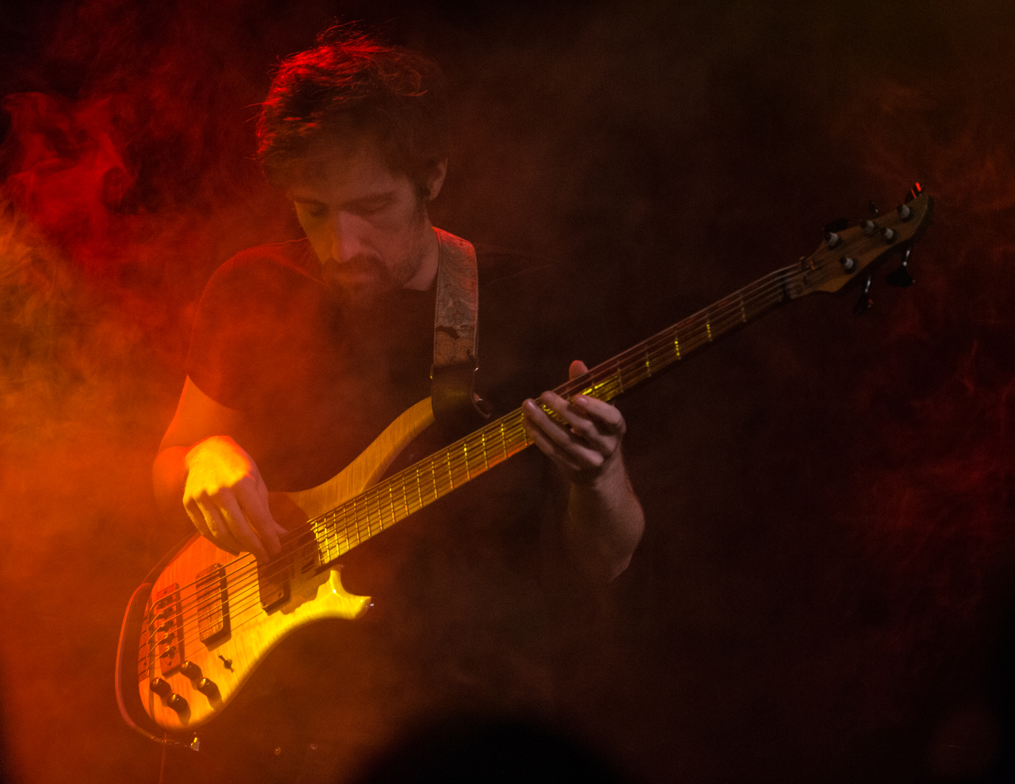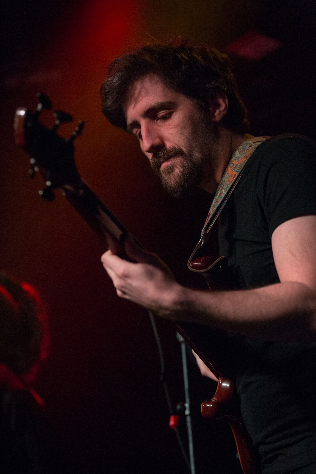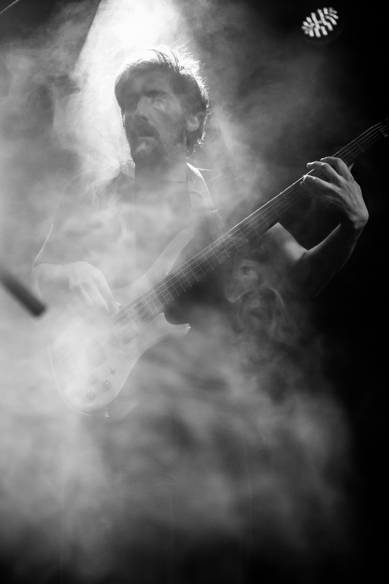 The use of a keyboard, an eight-string guitar and a six-string bass are testament to the expansive ground the band wanders. The last song welcomes a baritone saxophonist to pollinate the music with yet another dimension. The crowd is clearly unfamiliar with LIVGONE but is rapidly won over, offering ardent applause that grows with each track. What a magnificent act. This trio deserves so much more recognition in a world of vapid clones and shameless trend-chasing.