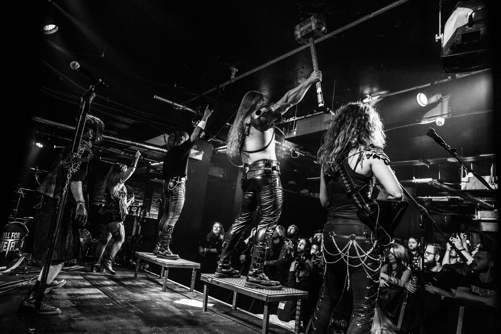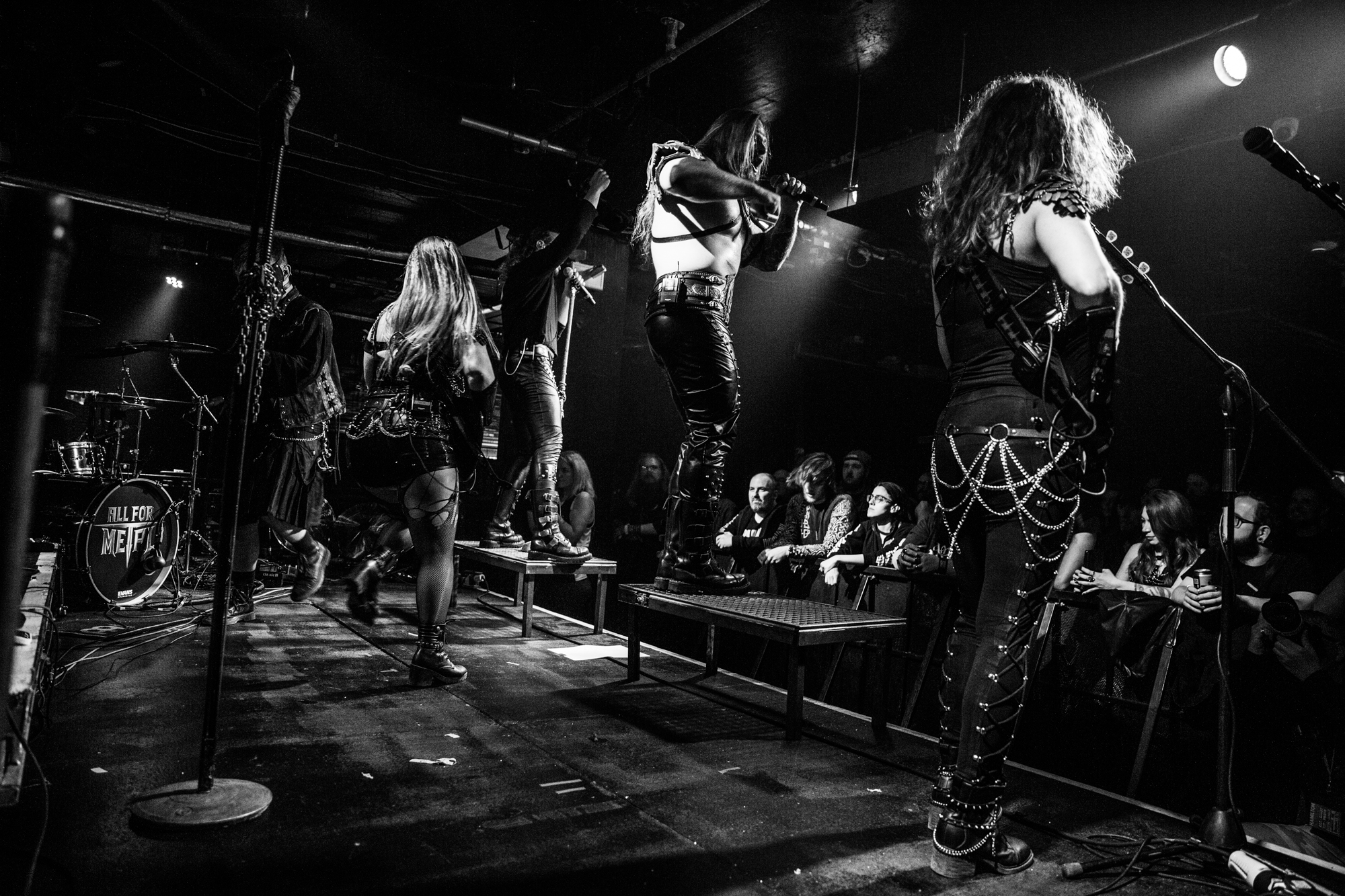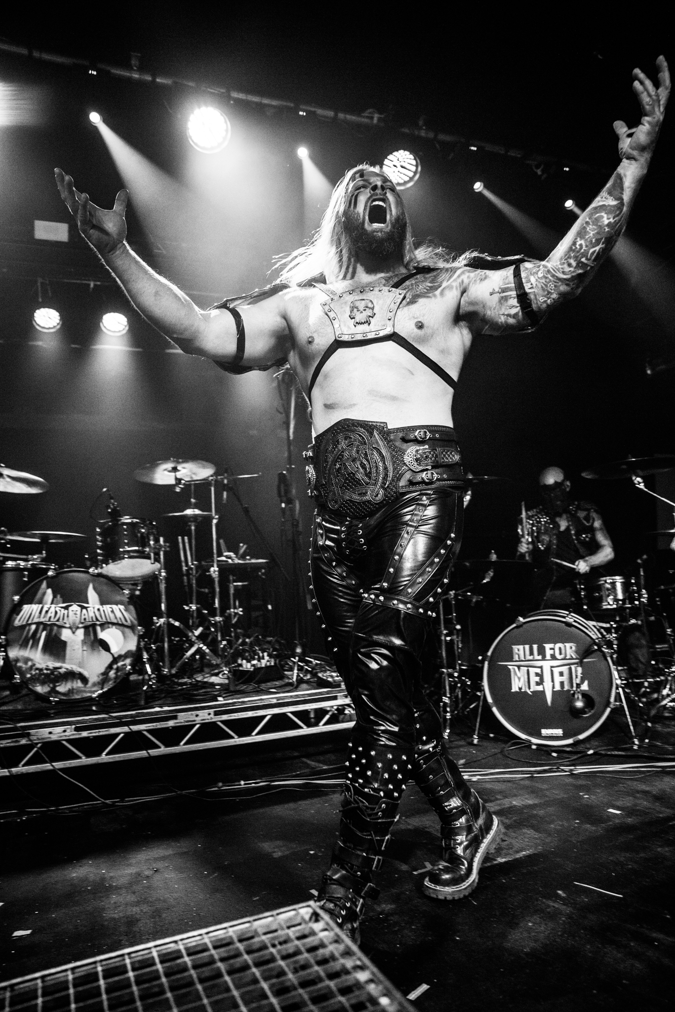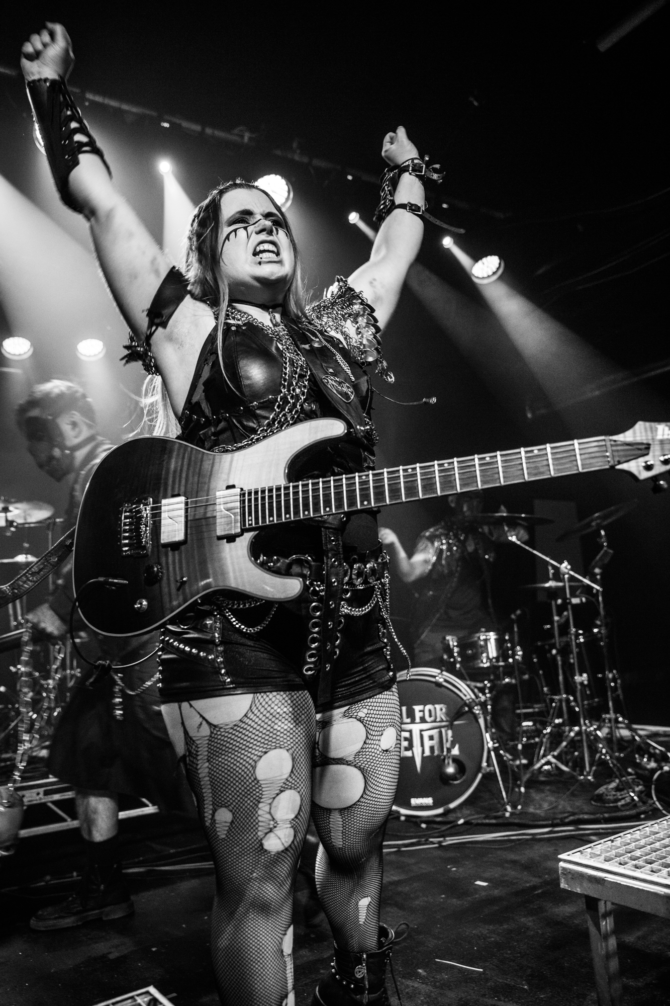 The Glasgow show takes place on a Tuesday, and Slay is absolutely crammed with bodies. The room is so rammed that there’s a security person who’s sole job seems to be to get people to shuffle forward away from the exit to allow more attendees to squeeze in. The only support tonight is ALL FOR METAL, a power metal band of dubious origins. There’s an argument to be made that power metal is struggling in the light of bands that dress up and get popular on social media due to their wacky, cartoony looks over musicianship. This German/Italian collective was artificially assembled by the record label AFM (hence their initials), instantly given a huge marketing budget, popular tours and festival slots. Formed in 2022, they already have two albums and approximately 15 music videos.