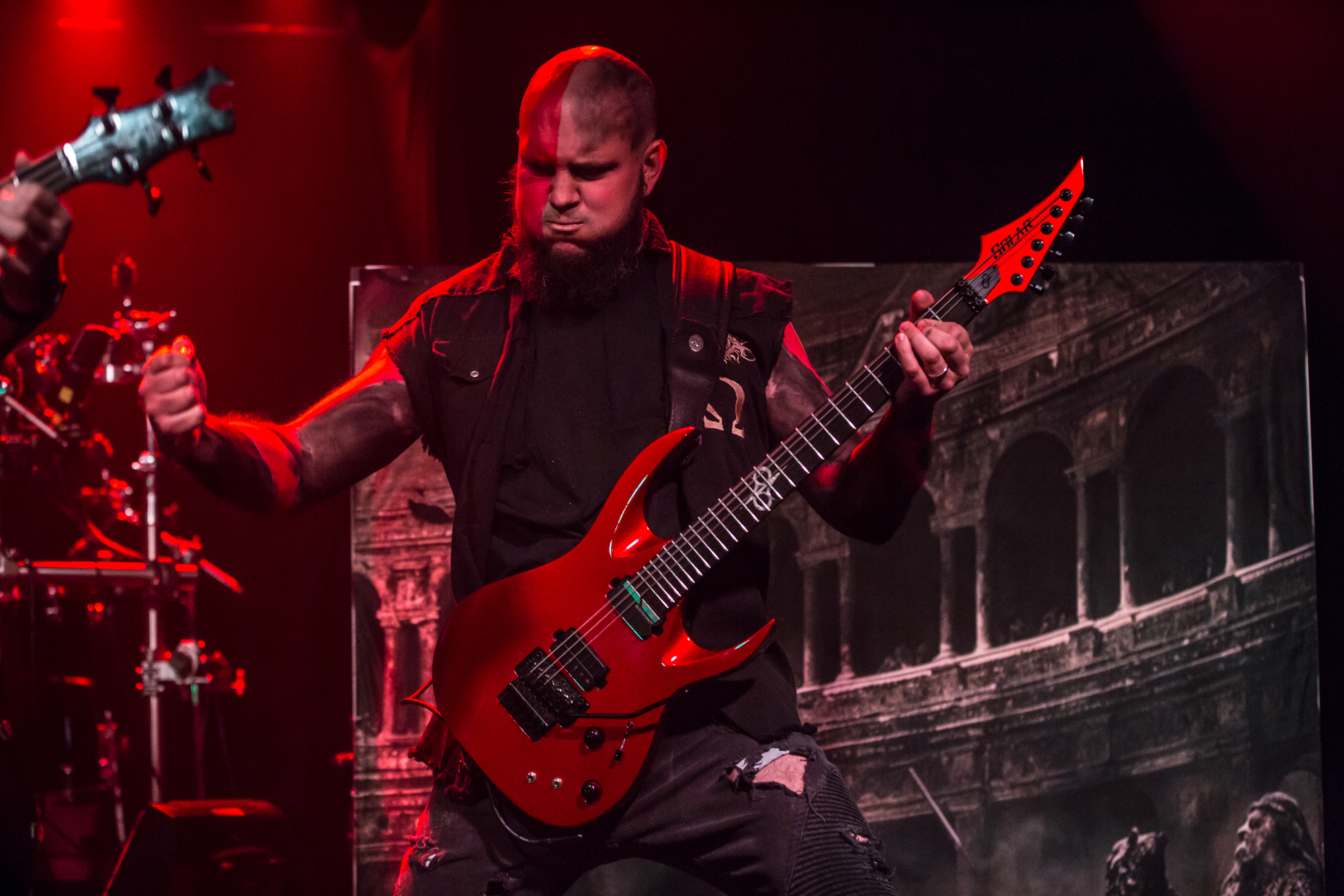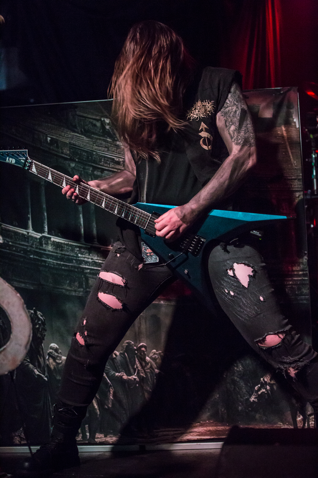VADER hit the ground running with God Is Dead (Hellelujah). Despite the tongue-in-cheek nature of this concert staple, the opener is a lip-smacking blend of lightning tempos and pensive build-ups, storing and then unleashing feral energy. Instantly, a massive mosh pit ignites, accentuated with wily crowd-surfers, serenaded by rugged thrash-hinged death metal. Anyone who has seen these Polish death metal vanguards a few times understands the consistently premium show they always execute. Tonight, it’s business as usual. Guitarist and vocalist Piotr Wiwczarek leads this live assault with a freshly expanded five-piece line up, following the return of long-term guitarist Mauser last year. VADER with three guitars beefs up their tremolo riffs, SLAYER-inspired solos and brutality to devastating effect.
