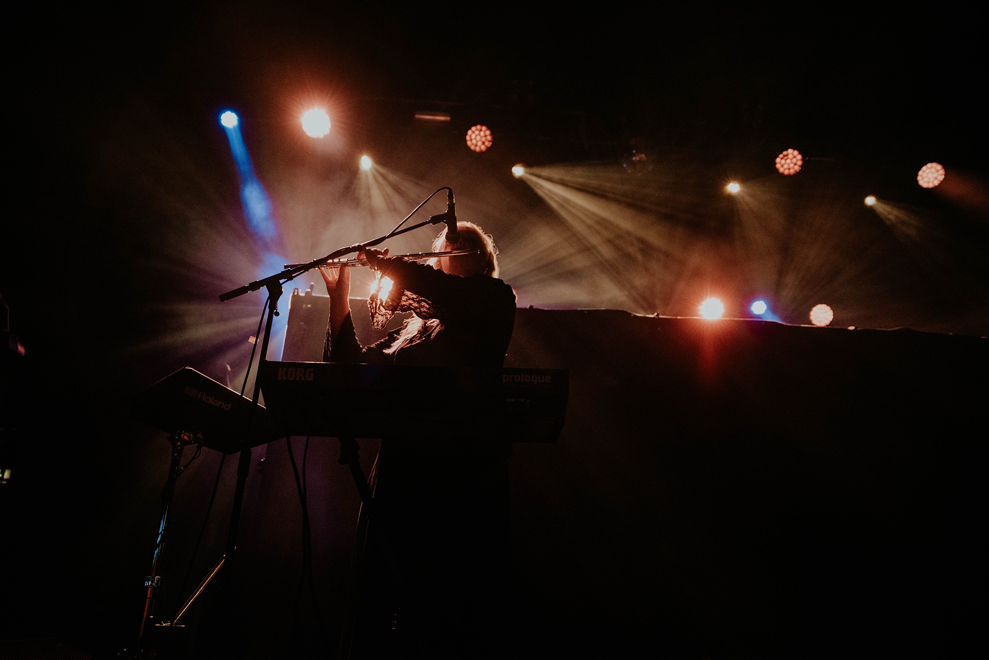 Due to strike action across the Tube network, people are still filing into the o2 Forum Kentish Town when Icelandic KÆLAN MIKLA takes to the stage. The lights drop leaving a hazy stain of purple and orange across the front central section of the stage. Silhouettes of three women stride onto the stage to a buzz of cheers.