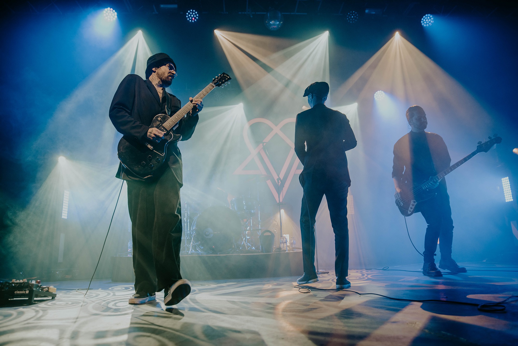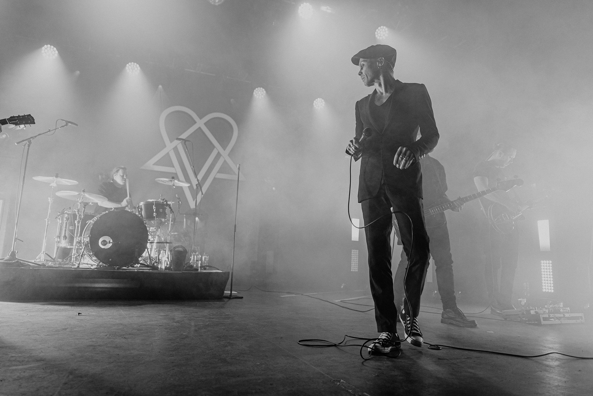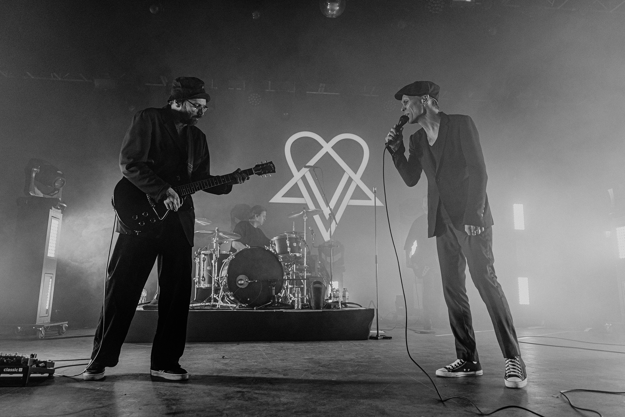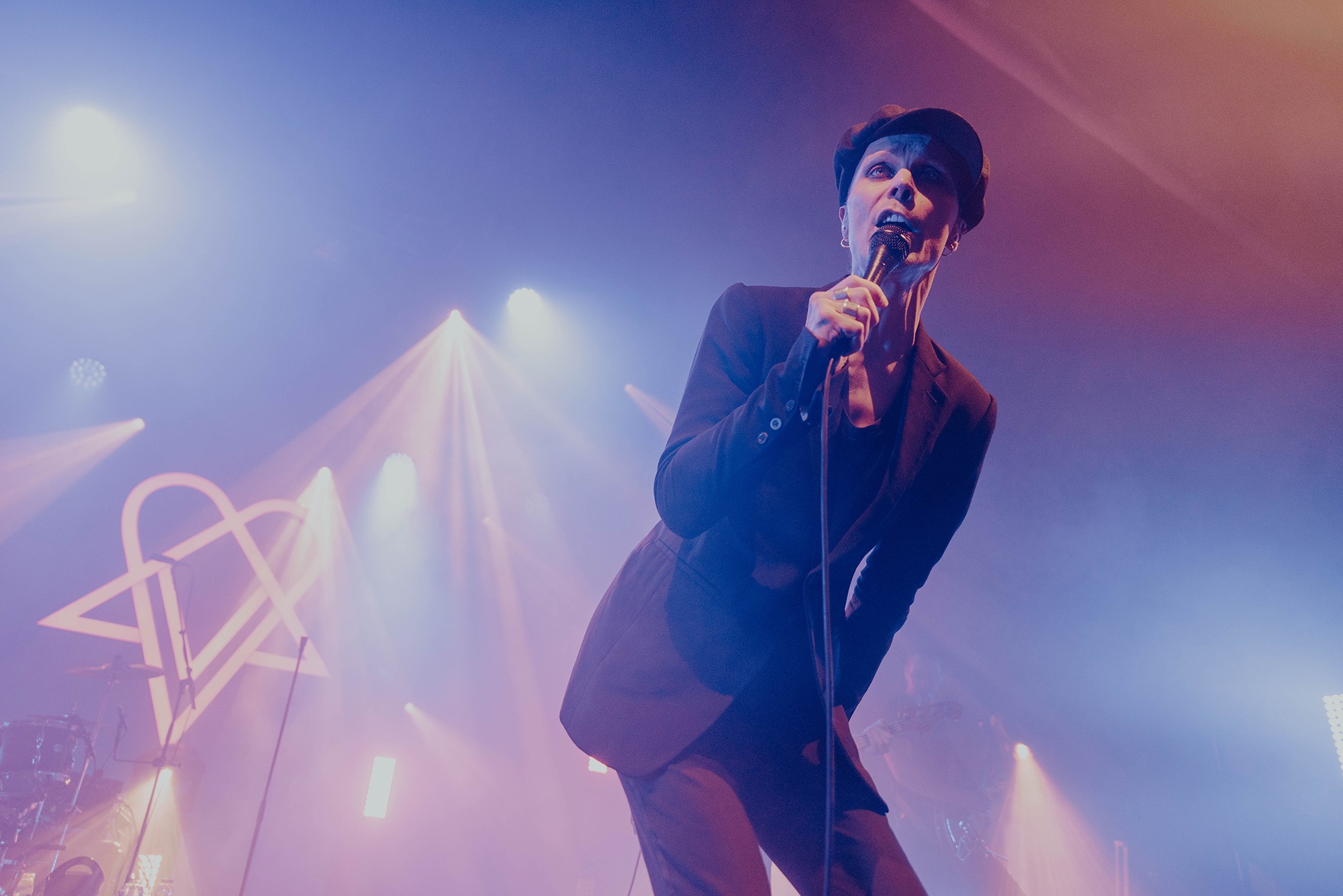 The man of the hour strides onto the stage in an all black ensemble and takes his place front and centre. VILLE VALO casts a nod to his backing band and the intro of single Echolocate Your Love dominates the room. Lifting the microphone to his lips, the crooner leans forward and addresses his adoring fans who “howl heartsick lupine lullabies”, his voice sounding as velveteen as it does on record. We miss the bass in the voice of “pinpoint the poison” at the end of the chorus. However as we’re taken into Neon Noir, the “flash-dance macabre to love’s soliloquy” is in full swing. Fans sing every word back to VILLE VALO and the show feels effortless. The stand up Heartagram at the back of the stage flushes tones of pinks and blues adding to the sensation we are simply bathing within our love eternal.