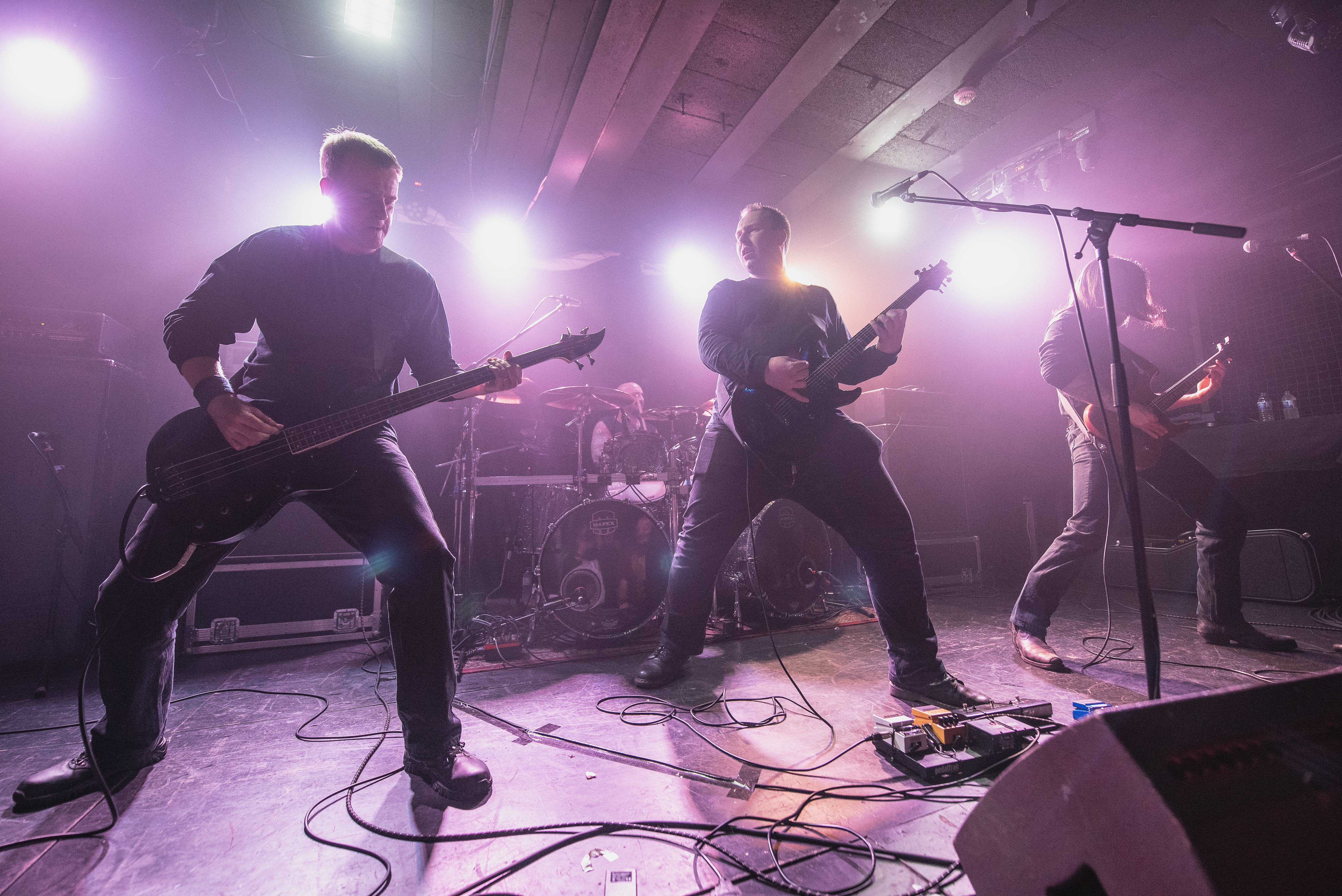 “We’re WINTERFYLLETH and we’re from…here”, a good a statement as any to kick of a homecoming show. Humorous nature aside, there is nothing amusing about the band’s brand of black metal and the execution of their material was approached in the most serious manner, leading to a performance of glistening quality. The Divination of Antiquity kicks off proceedings and right from the get-go, it’s clear that the band are on scorching form as Dan Capp and Chris Naughton‘s dual riffing react organically to the sustained rhythms of Simon Lucas‘ drumming and NickWallwork‘s basslines. Naughton‘s vocals are spot on throughout the set, delivering every scream and howl to solid effect and his harmonised chanting with his bandmates on The Swart Raven is simply chilling.