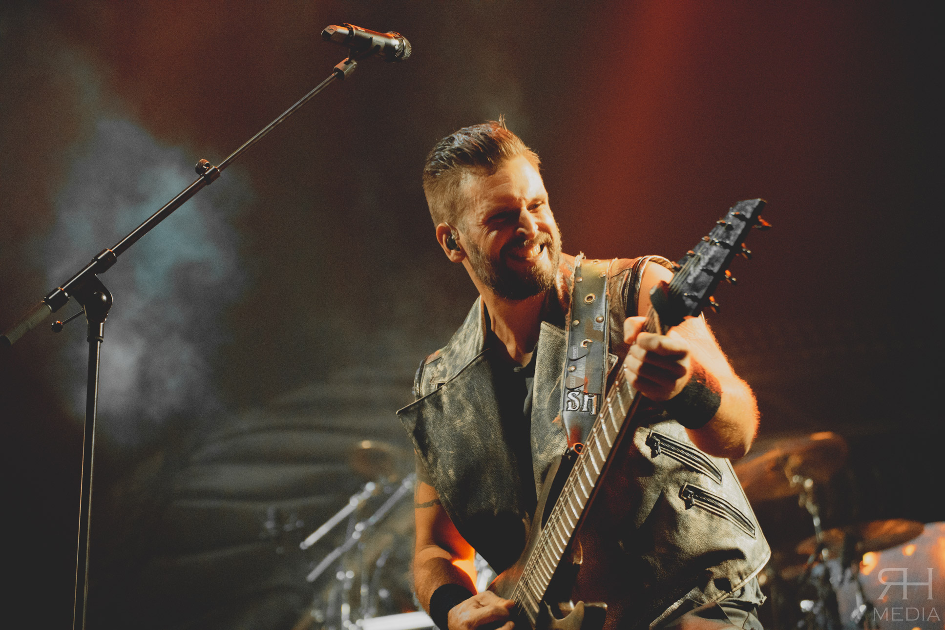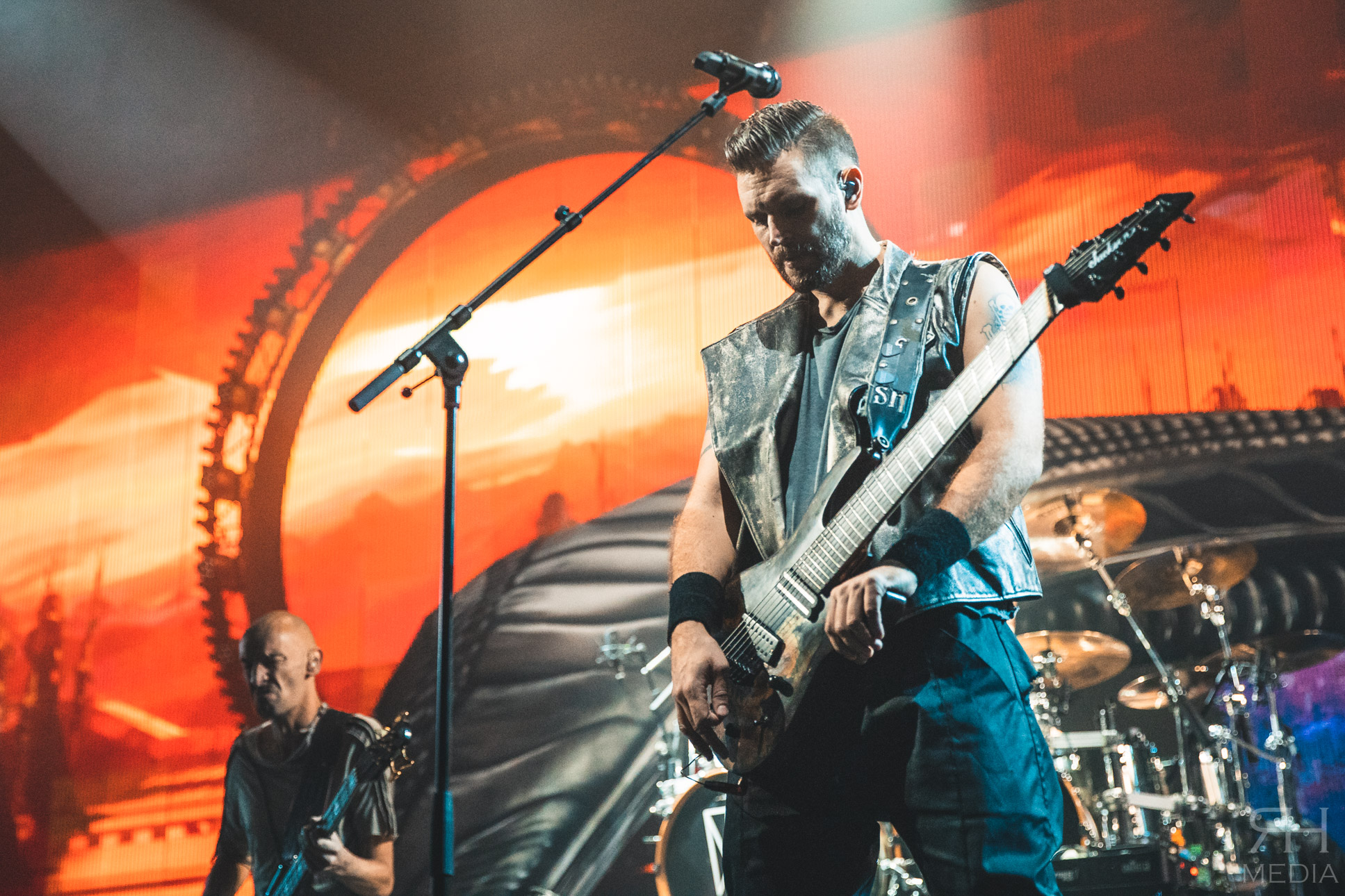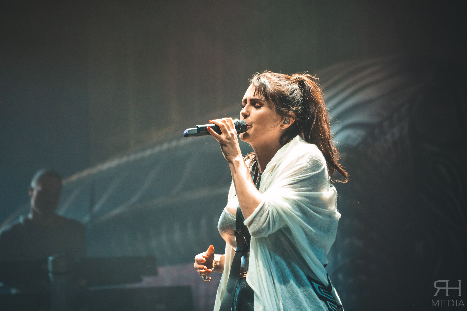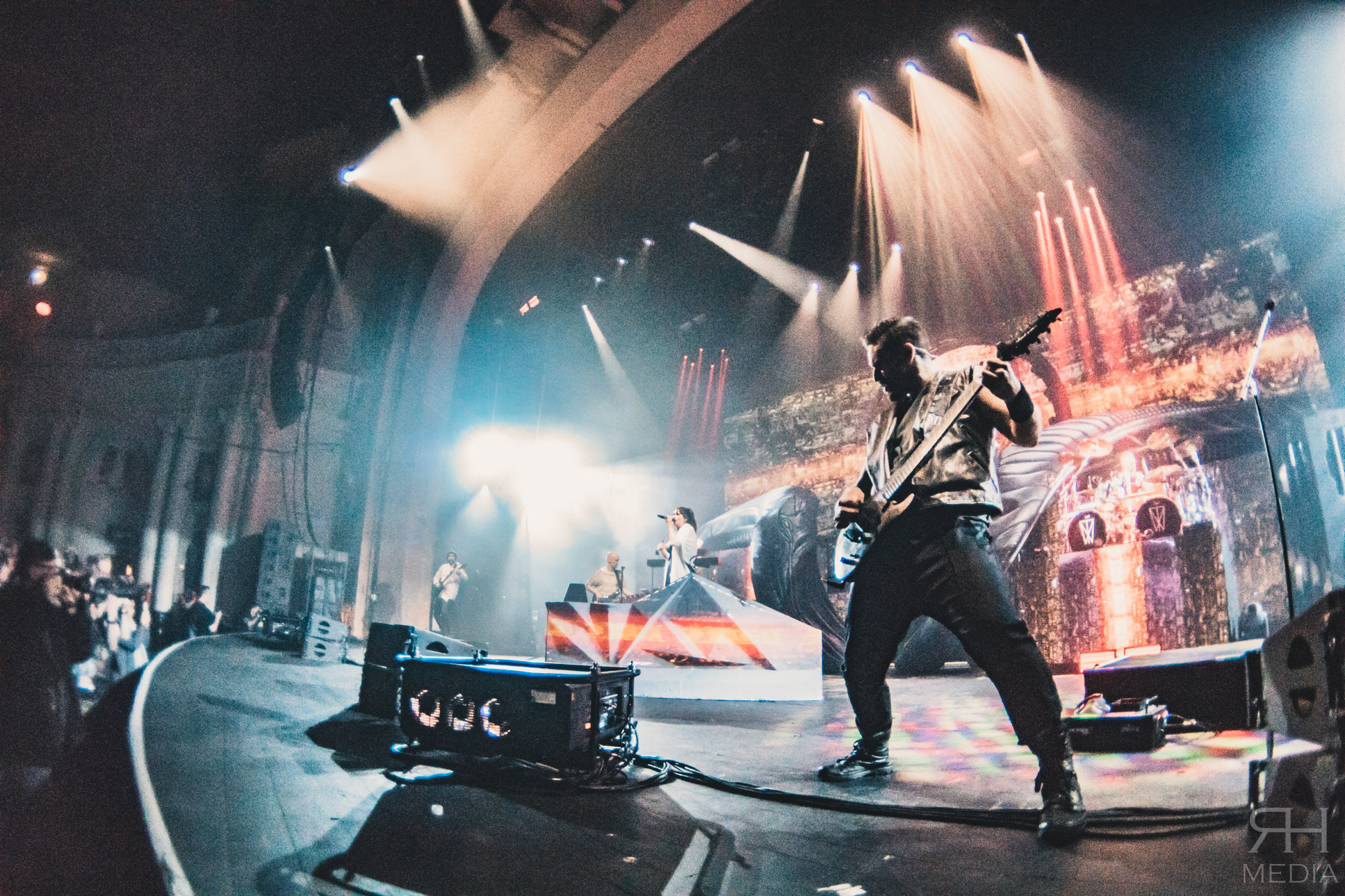The headliners suffer from no such ills. From the moment the house lights go down and the impressive stage lights come on the very foundations of the venue are in danger of crumbling from the sheer volume of the crowd. The band’s world class frontwoman Sharon den Adel grasps a white flag and swings it around her head as the band power through the opener Raise Your Banner before casting it aside as they follow it up with their brand new single The Reckoning with guitarist Ruud Jolie taking the place of Jacoby Shaddix on vocals. The WITHIN TEMPTATION back catalogue is littered with superb metal songs and the band showcase that perfectly with the one-two combination of Stand My Ground from the band’s classic third album The Silent Force and All I Need from 2007’s The Heart Of Everything respectively, which would be the peak of the set list for most bands but WITHIN TEMPTATION at this point are only just getting going.