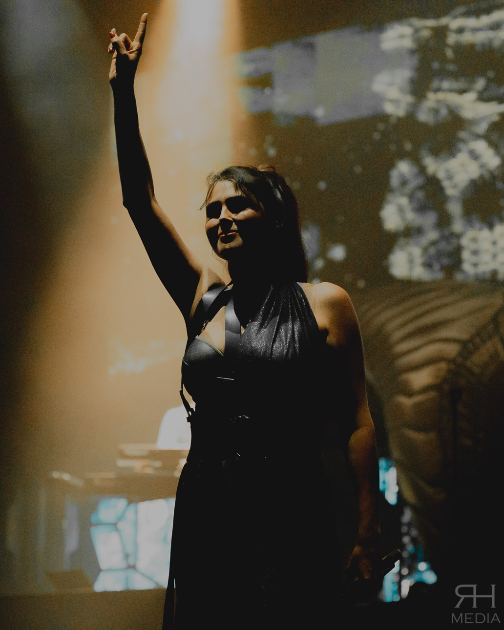 In the latter stages of the set the band get into the song Paradise (What About Us?) from their previous album Hydra which features a cameo from another titan of the genre, Tarja Turunen, (albeit from one of the giant screens at the back of the stage and a backing track) which gets one of the biggest crowd participation moments of the night and also gives den Adel a chance to really open up her vocal chords and tackle the beautiful operatic section in the bridge part of the song. A testament to the vocal ability and effortless showmanship that this woman possesses. A sublime version of the ballad Forgiven sees den Adel and keyboardist Martjin Spierenburg lit up by nothing but the screens around the stage displaying starlight which really adds to the occasion and pageantry of the WITHIN TEMPTATION experience.