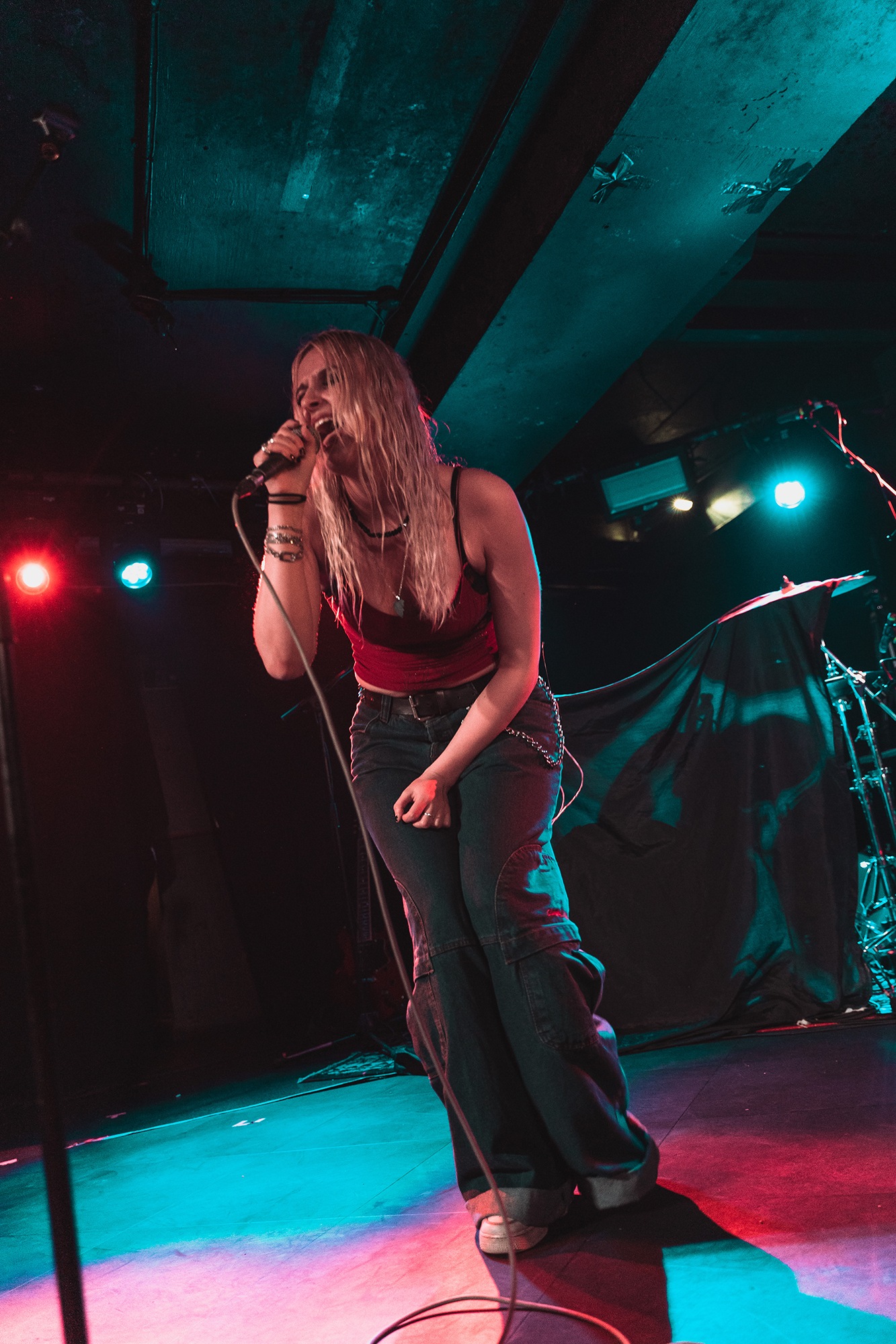 First though, it’s the turn of LIZZY FARRALL to stake her claim as a force to be reckoned with in the UK’s alternative scene. Though she’s on later than advertised, it at least does give the initially thin on the ground crowd time to gradually swell to a more respectable size. When she does take the stage with her band she treats those here early enough to saccharine pop rock that’s shot through with a dark undercurrent such as with her opening song’s imagery of knives in eyes. Yellow Paint fuses atmospheric synths with reverb-soaked guitars, and Gas Lighting is a slower, heartfelt indictment of the shitty behaviour that is the song’s namesake. FARRALL herself has an easy, magnetic charisma, whether she’s dancing across the stage or belting out a powerful refrain. A new song is introduced with a knowing “this one goes out to anyone that really dislikes their ex,” before its dancefloor ready rhythm kicks in and it gets people moving swiftly. A powerful statement of intent from an artist who could easily headline here one day, too.