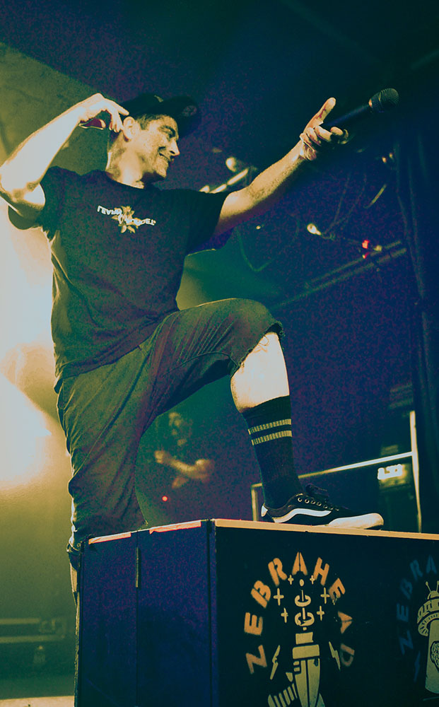 With the support act failing to kick-start the evening with a bang, ZEBRAHEAD were essentially taking to the stage in front of a cold room. As soon as the intro tape started (“America, fuck yeah” from Team America: World Police) and the band took to the stage, everything leading up to this moment was erased and the atmosphere shifted into a state of pure excitement. Kicking their set off with All My Friends Are Nobodies from their latest album, the room suddenly erupted with everyone expelling their pent up excitement in a fervent display of pure joy.